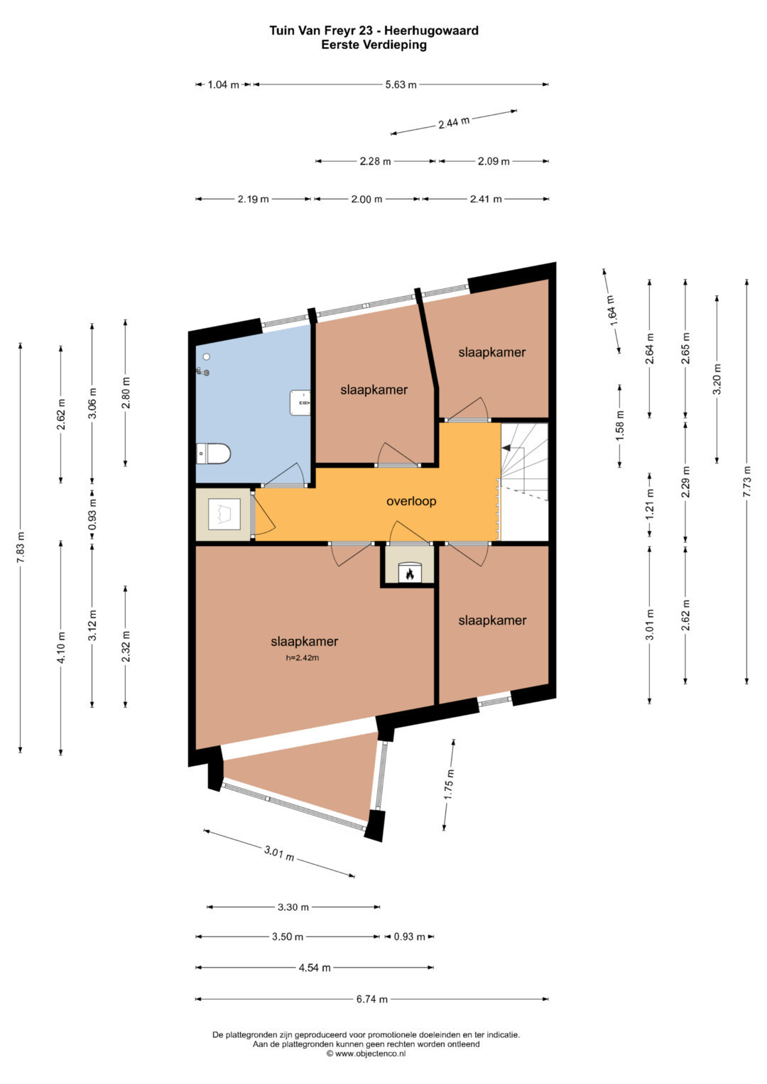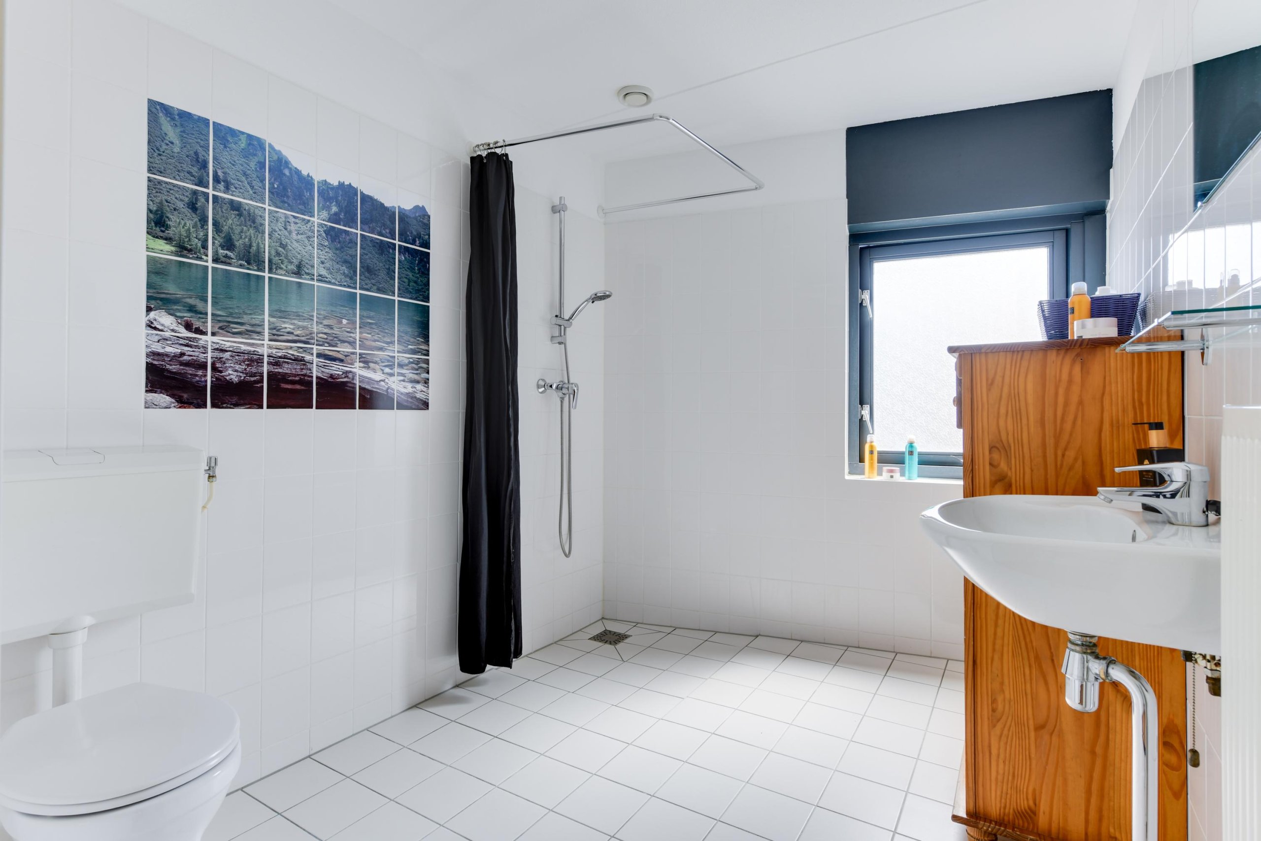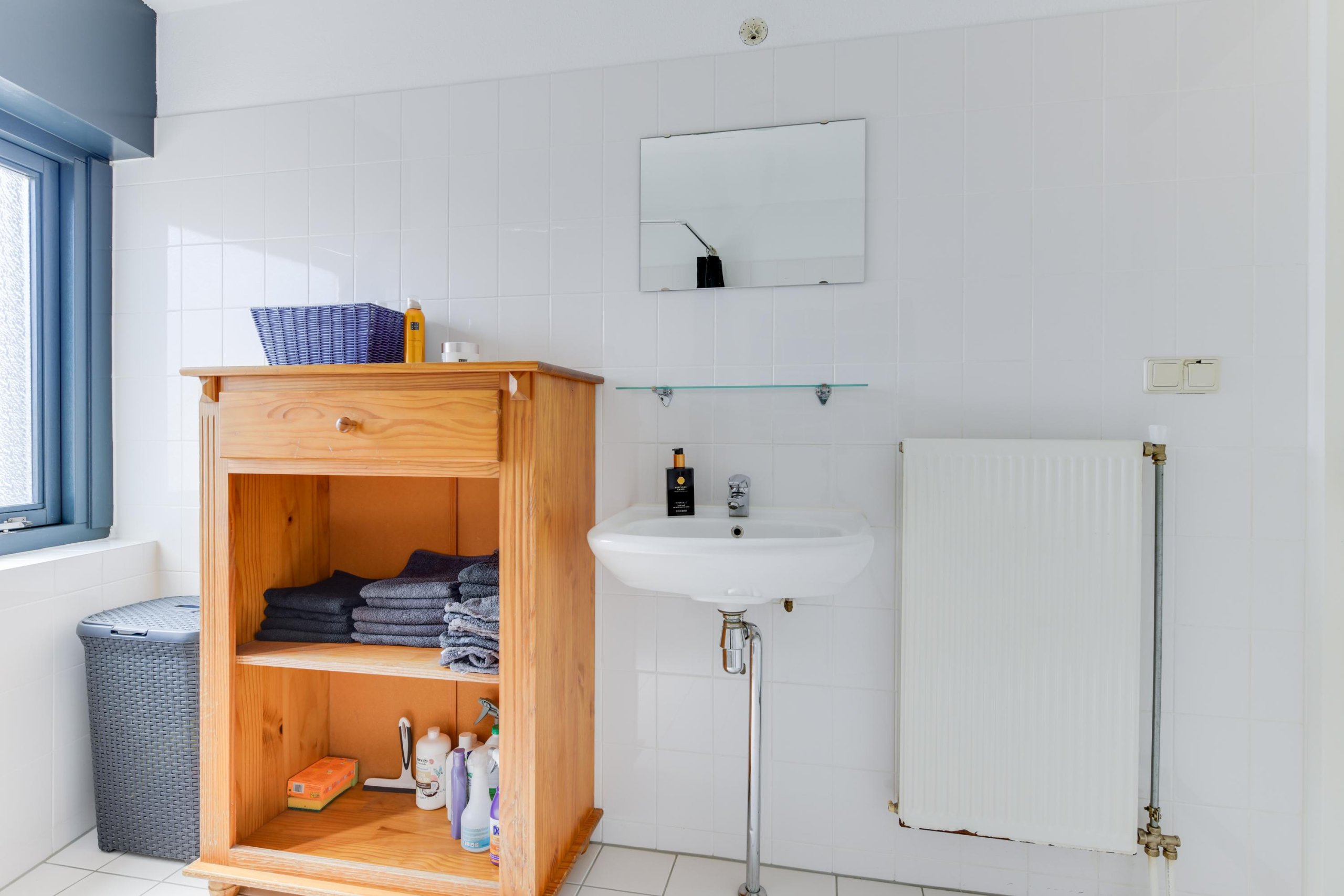 Overloop met toegang tot vier slaapkamers en een badkamer met inloopdouche, wastafelmeubel en een tweede toilet. Aparte bergruimte met witgoedaansluiting en bergkast met opstelling CV ketel.