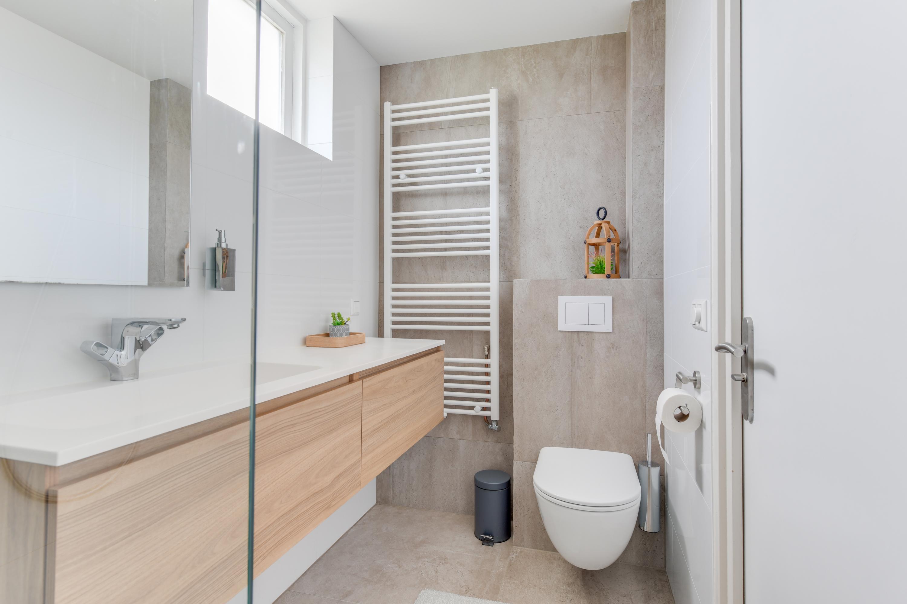 De moderne badkamer is voorzien van een ruime inloopdouche, wastafel met meubel, toilet, een designradiator én een infraroodpaneel – comfortabel en stijlvol tegelijk.