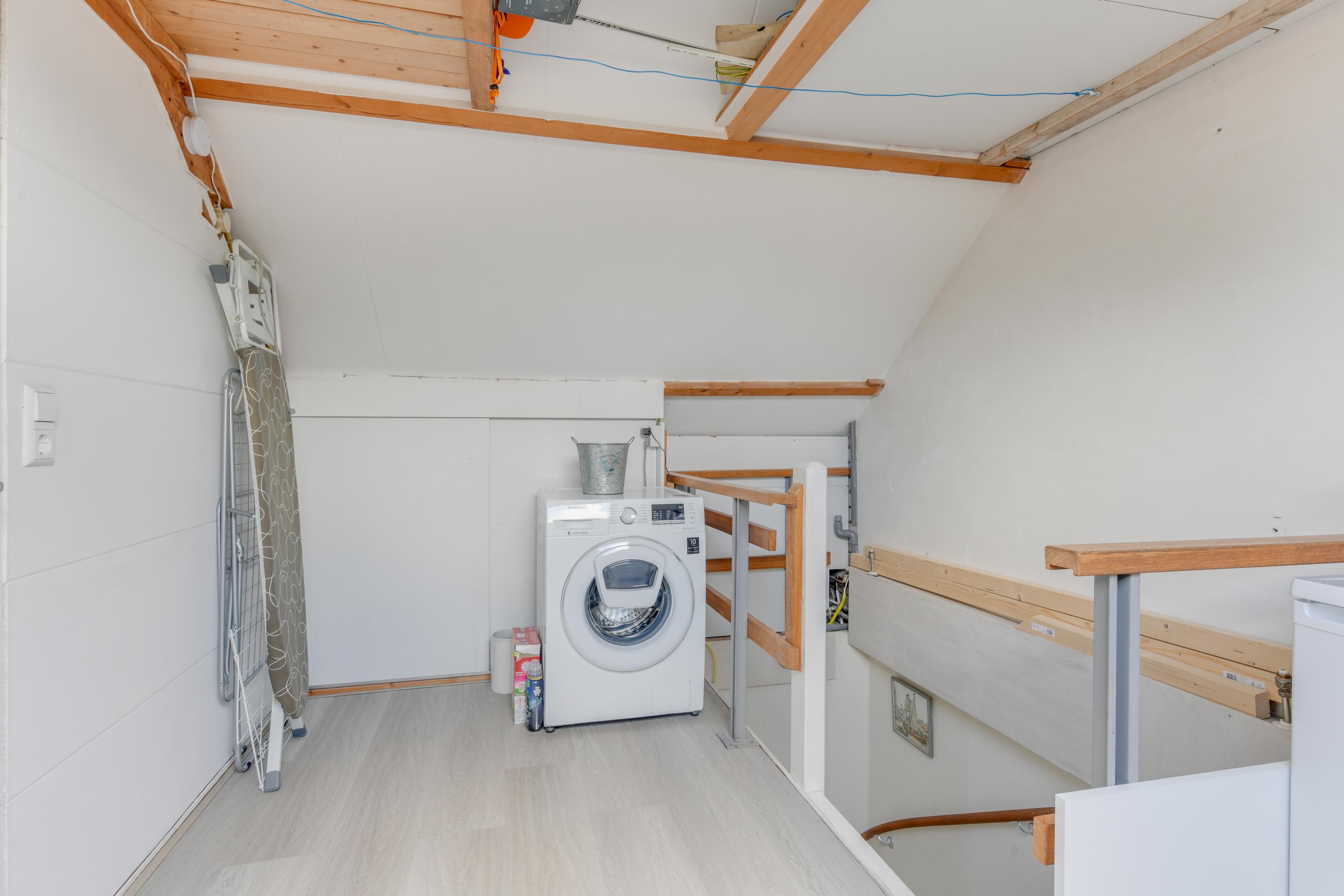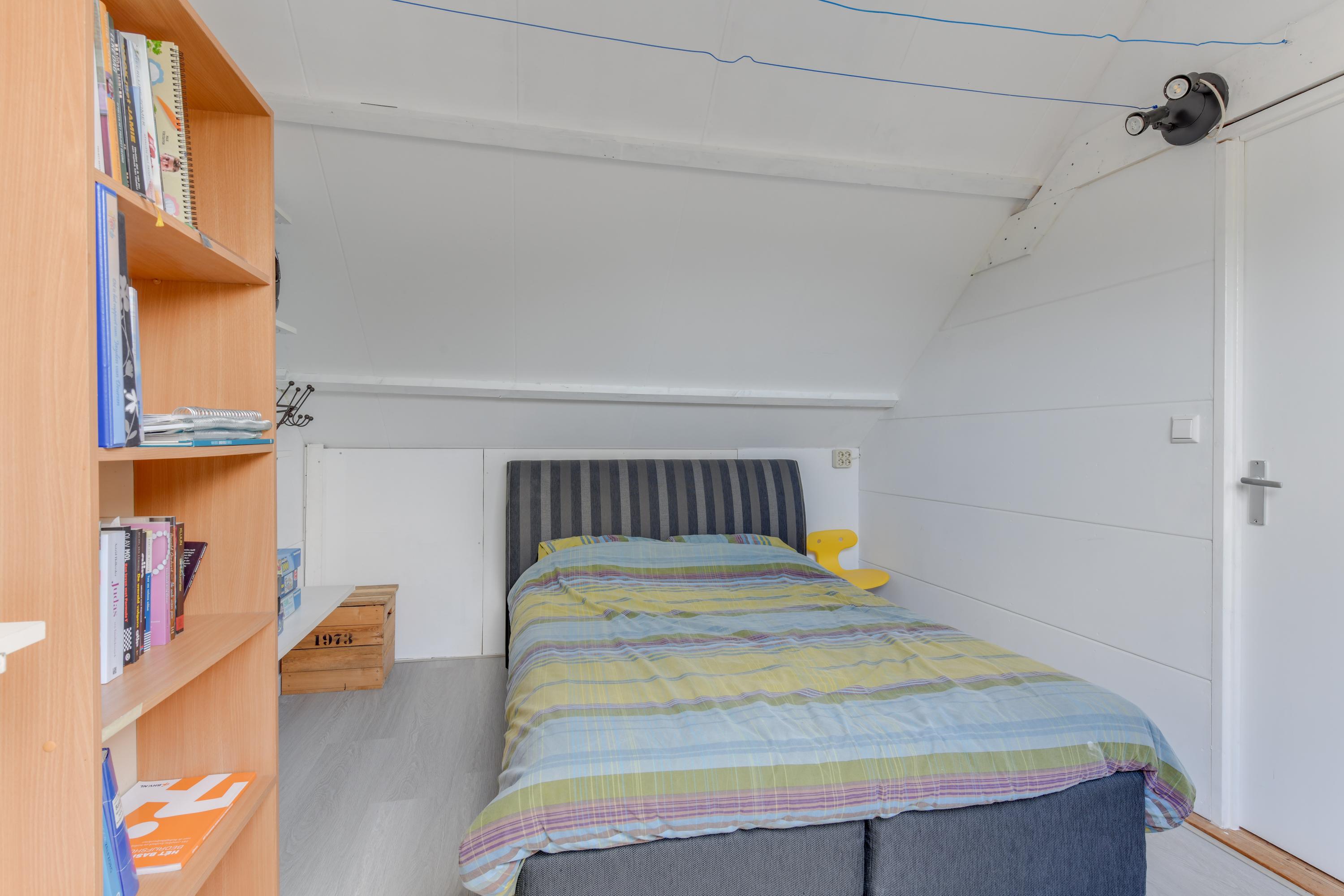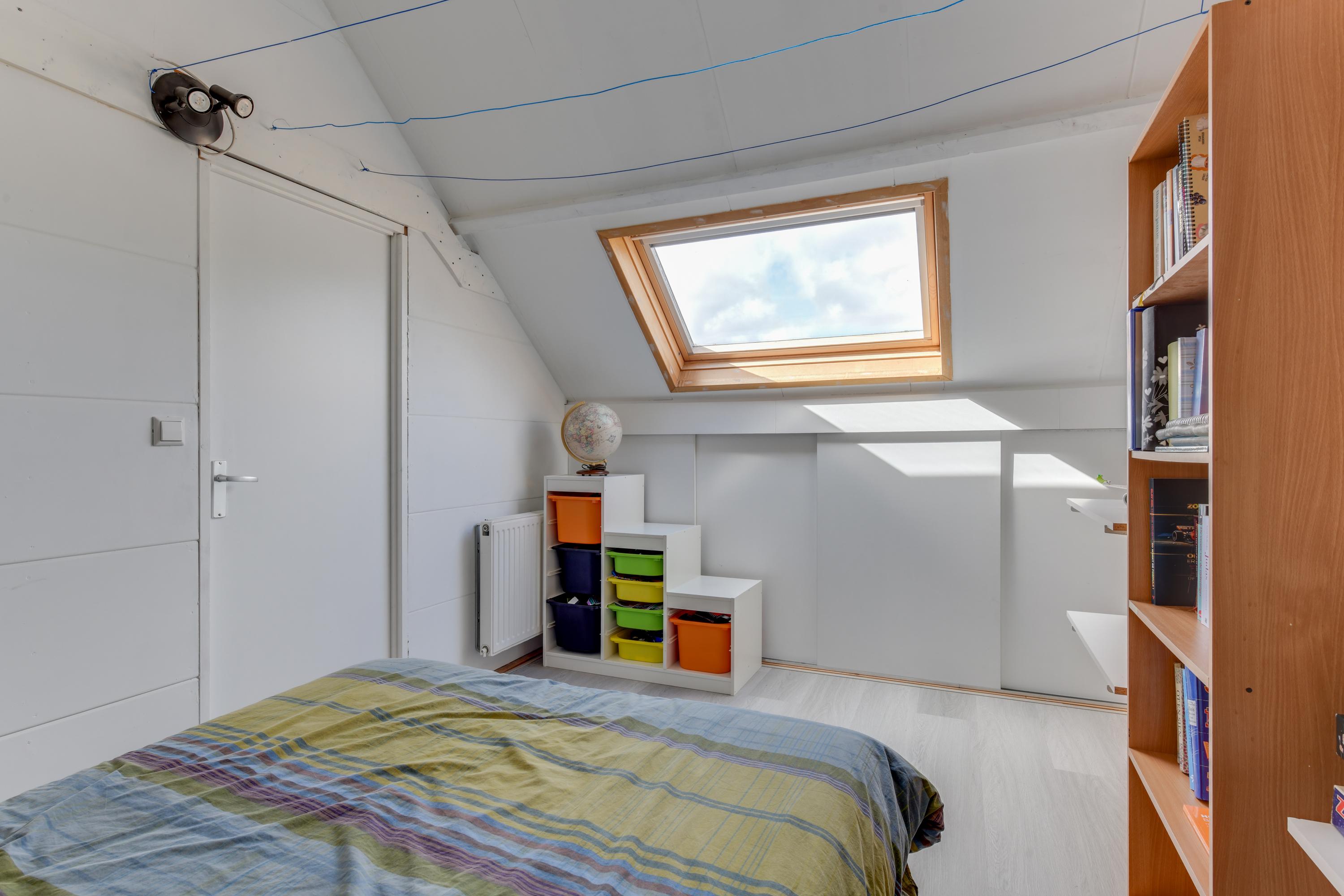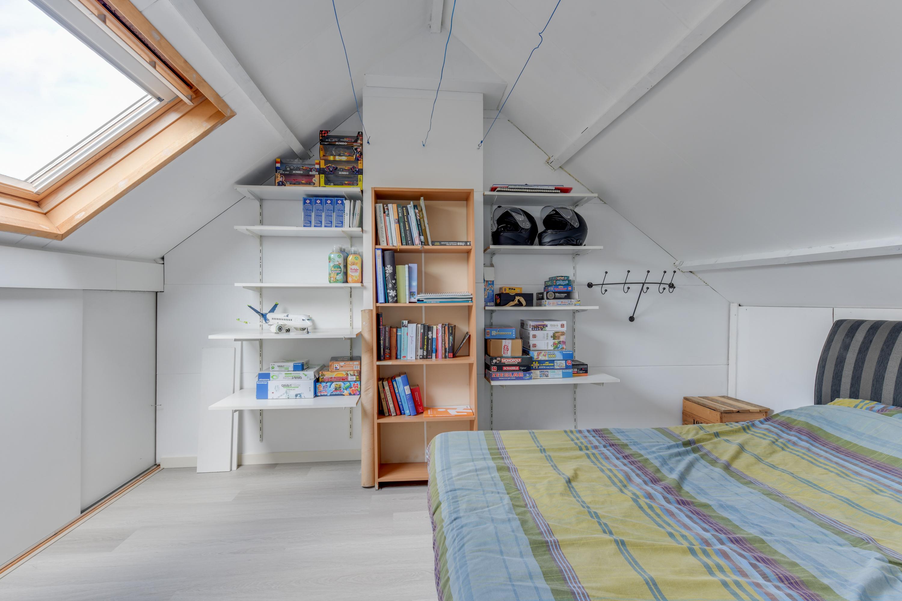 Via een vaste trap bereik je de voorzolder, waar zich de opstelling van de cv-ketel, de wasmachineaansluiting en een dakraam bevinden. De zolderkamer is goed geïsoleerd met PIR-platen en deels extra na-geïsoleerd. Hier is een fijne vierde slaapkamer gerealiseerd met veel bergruimte en twee dakramen. Een echte plus!