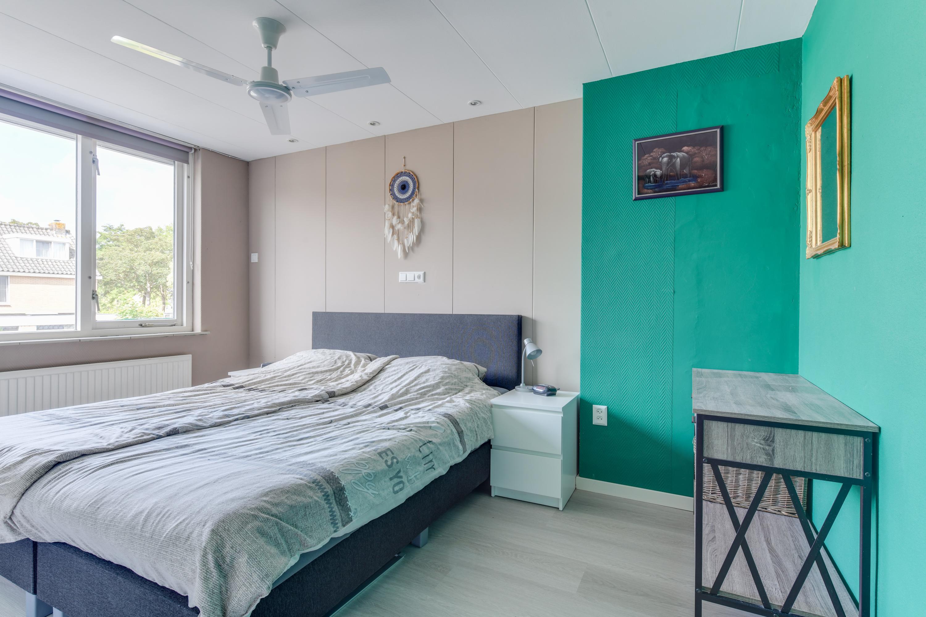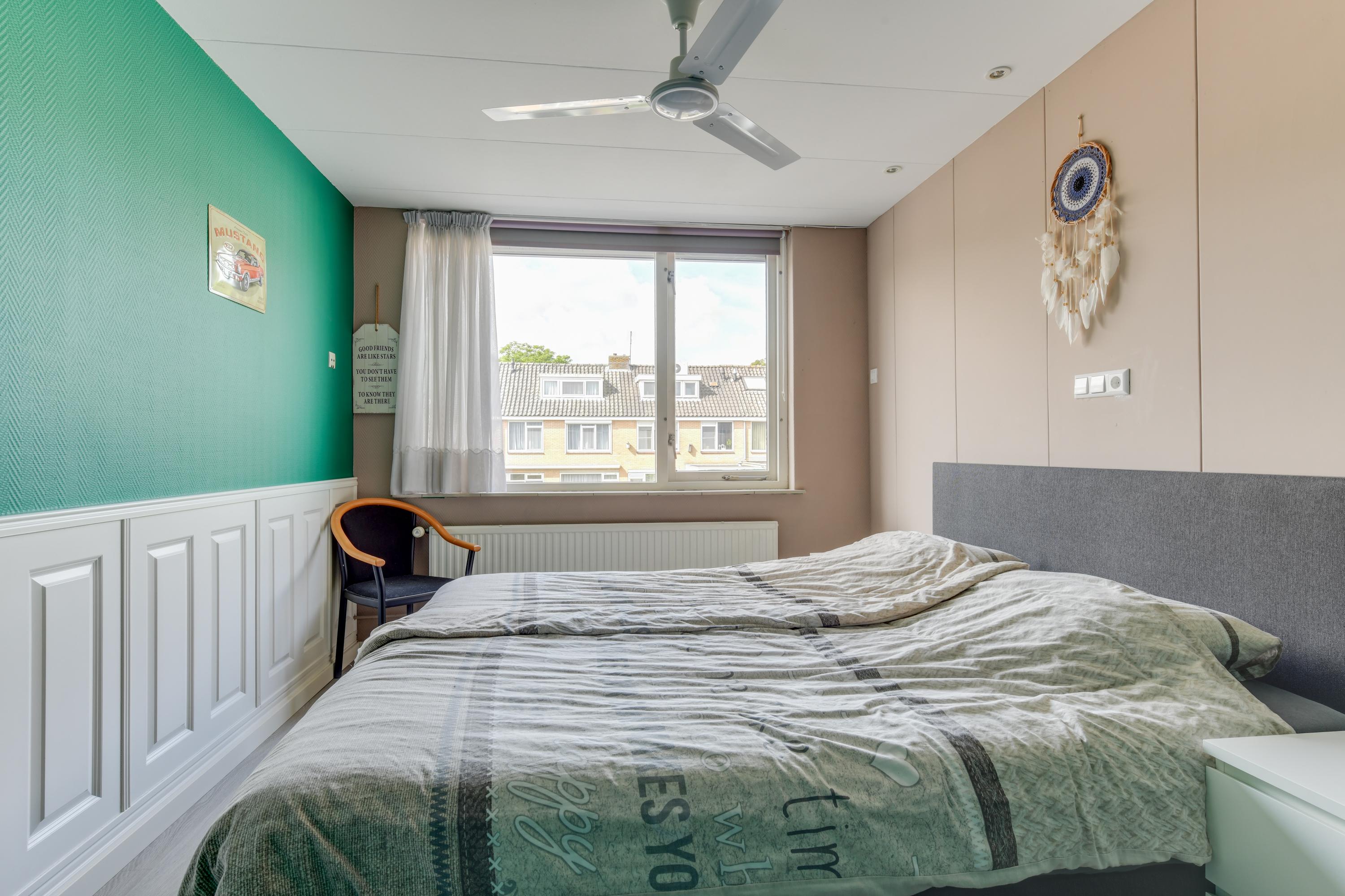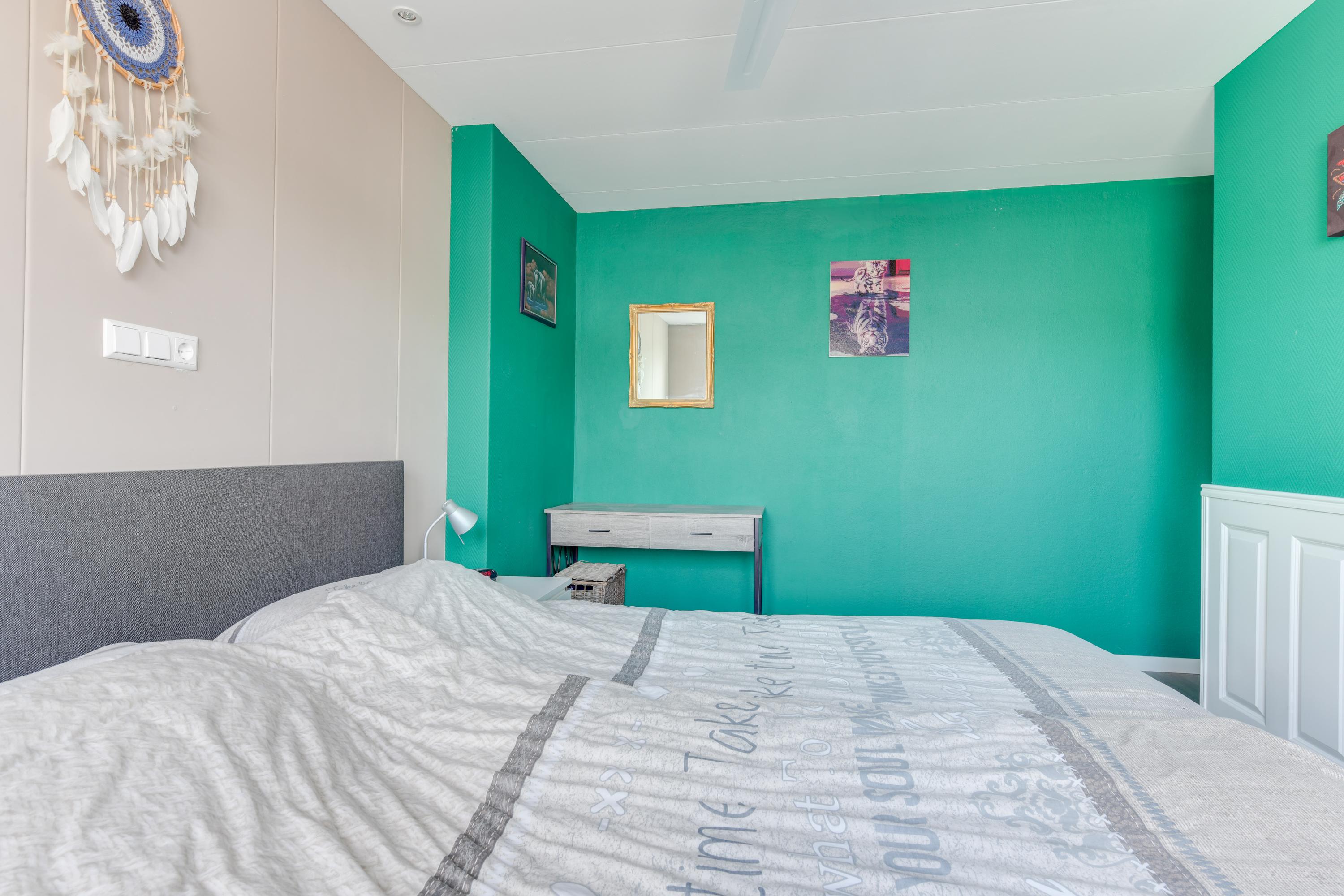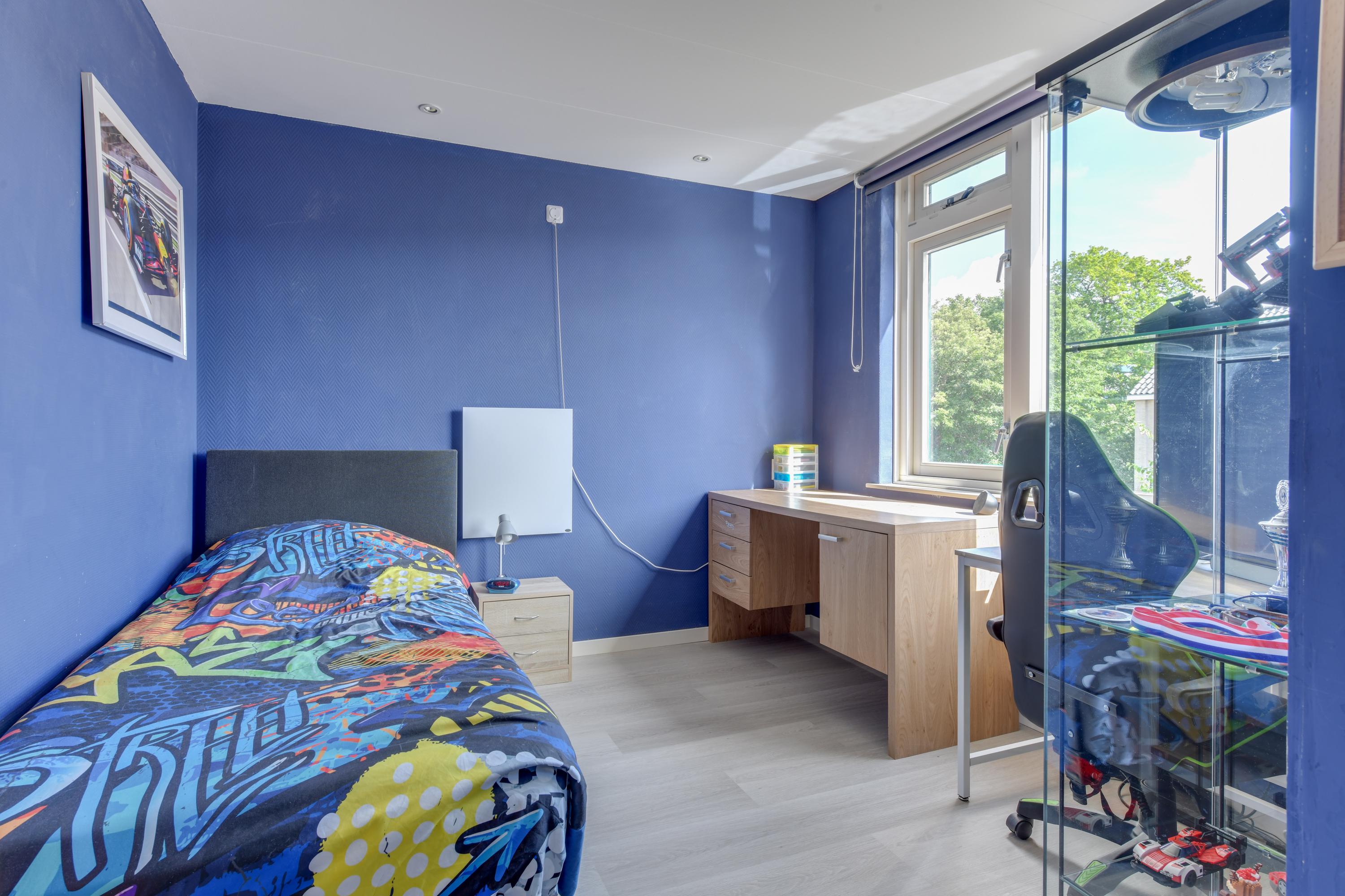 Via een vaste trap bereik je de voorzolder, waar zich de opstelling van de cv-ketel, de wasmachineaansluiting en een dakraam bevinden. De zolderkamer is goed geïsoleerd met PIR-platen en deels extra na-geïsoleerd. Hier is een fijne vierde slaapkamer gerealiseerd met veel bergruimte en twee dakramen. Een echte plus!