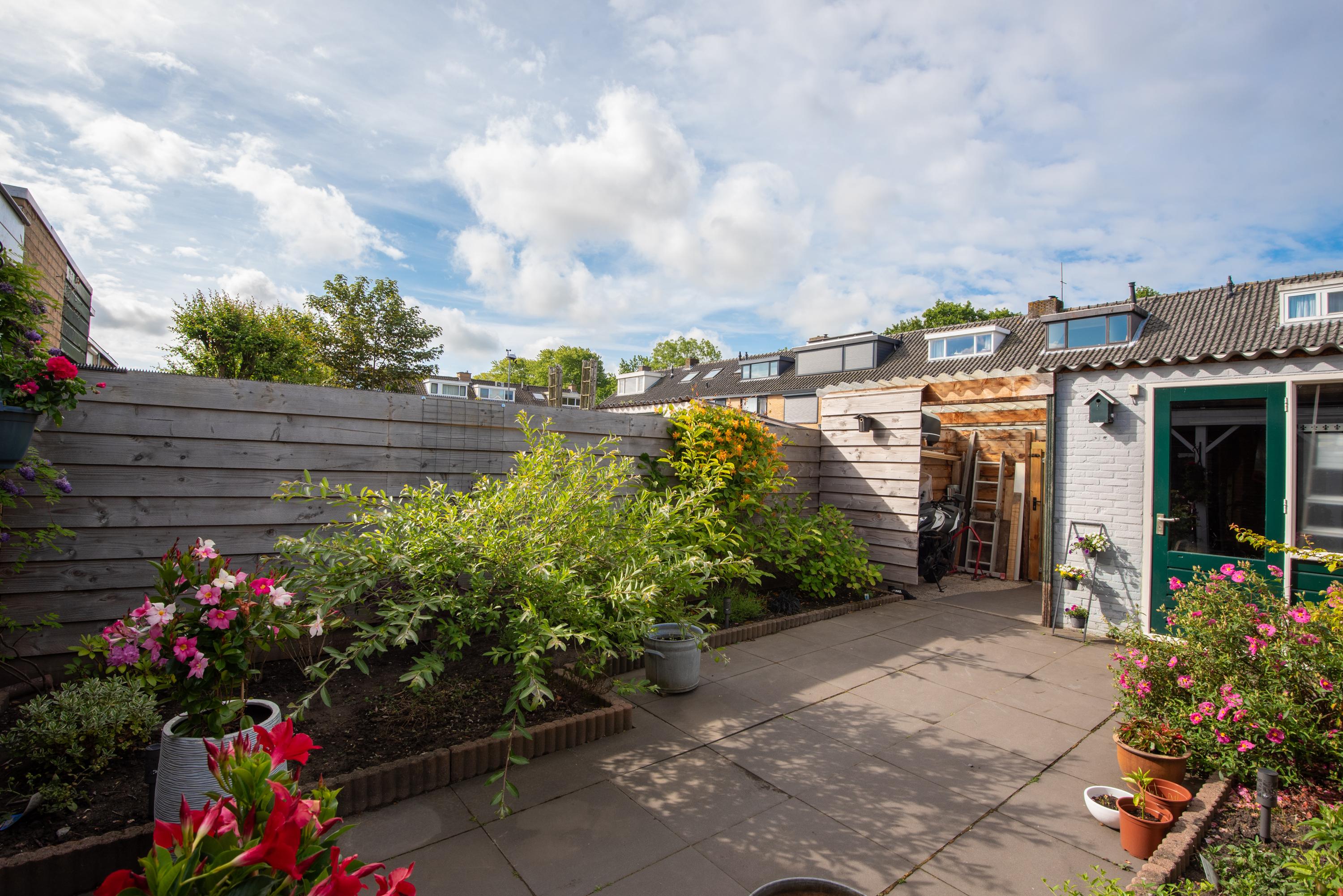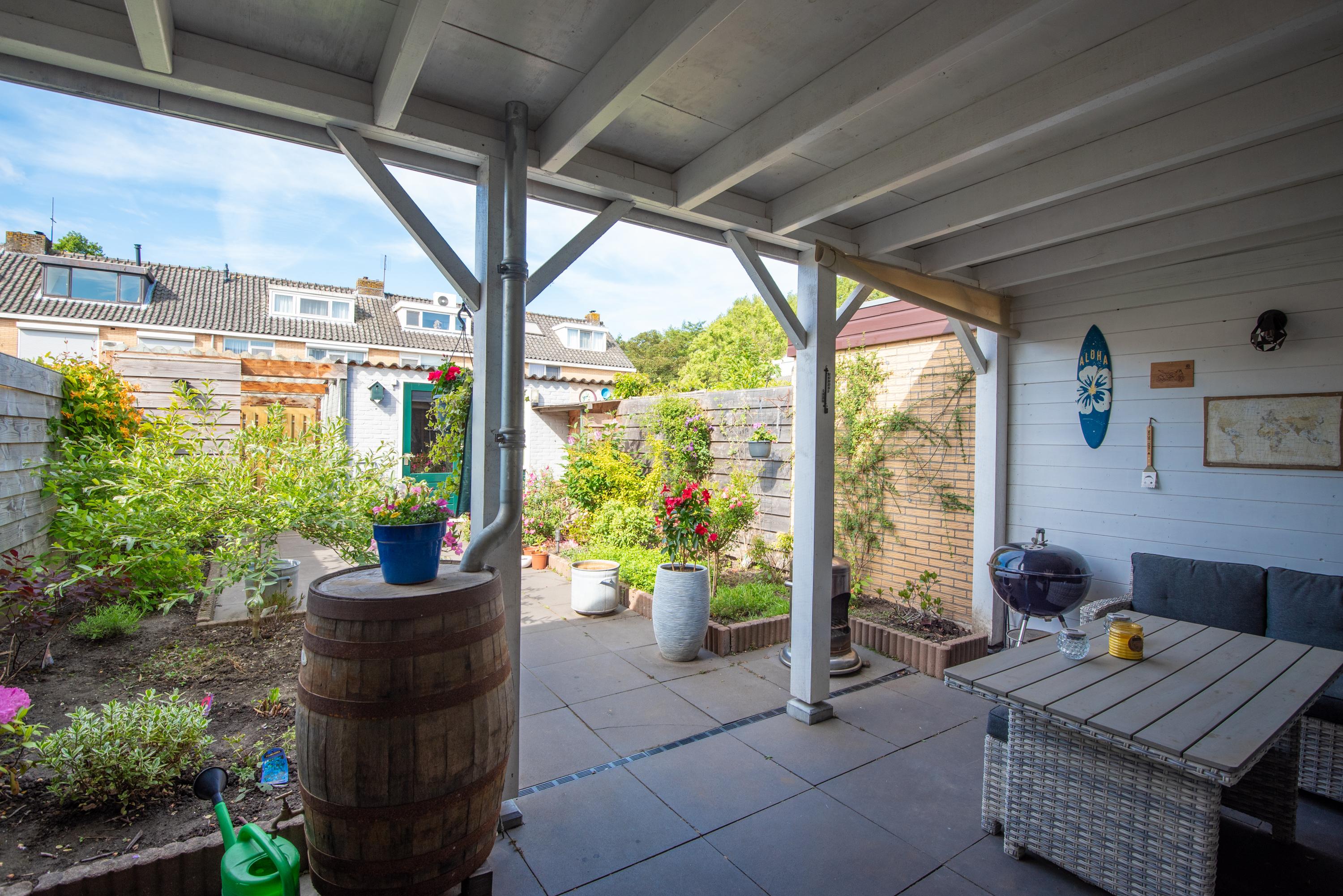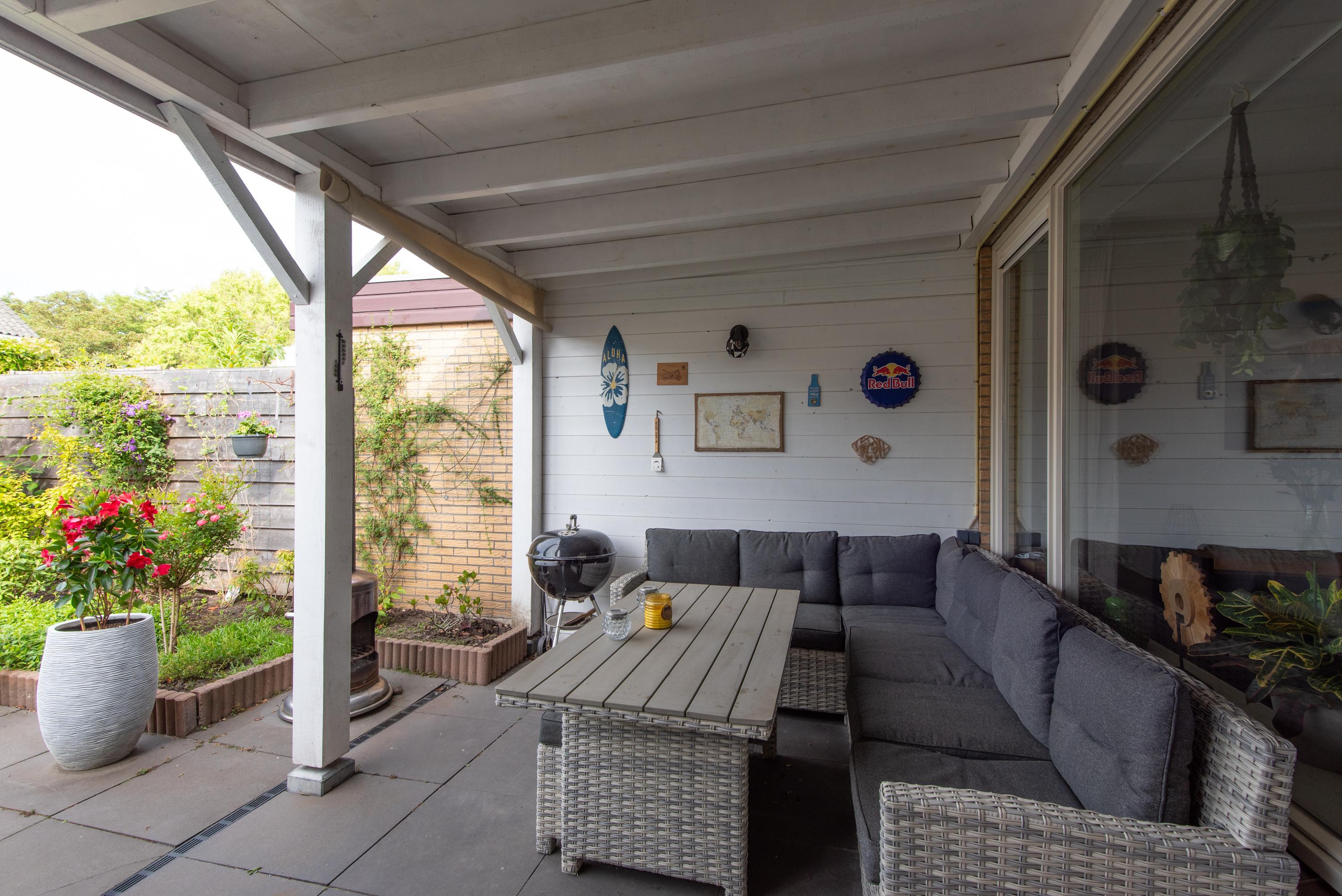 De achtertuin is opnieuw aangelegd en deels bestraat. Je vindt hier een sfeervolle veranda, een royale stenen schuur met een brede poort én een overkapping eraan vast – ideaal voor fietsen, opslag of als loungehoek. De tuin is keurig verzorgd en gelegen op het zuidwesten, wat zorgt voor fijne middag- en avondzon.