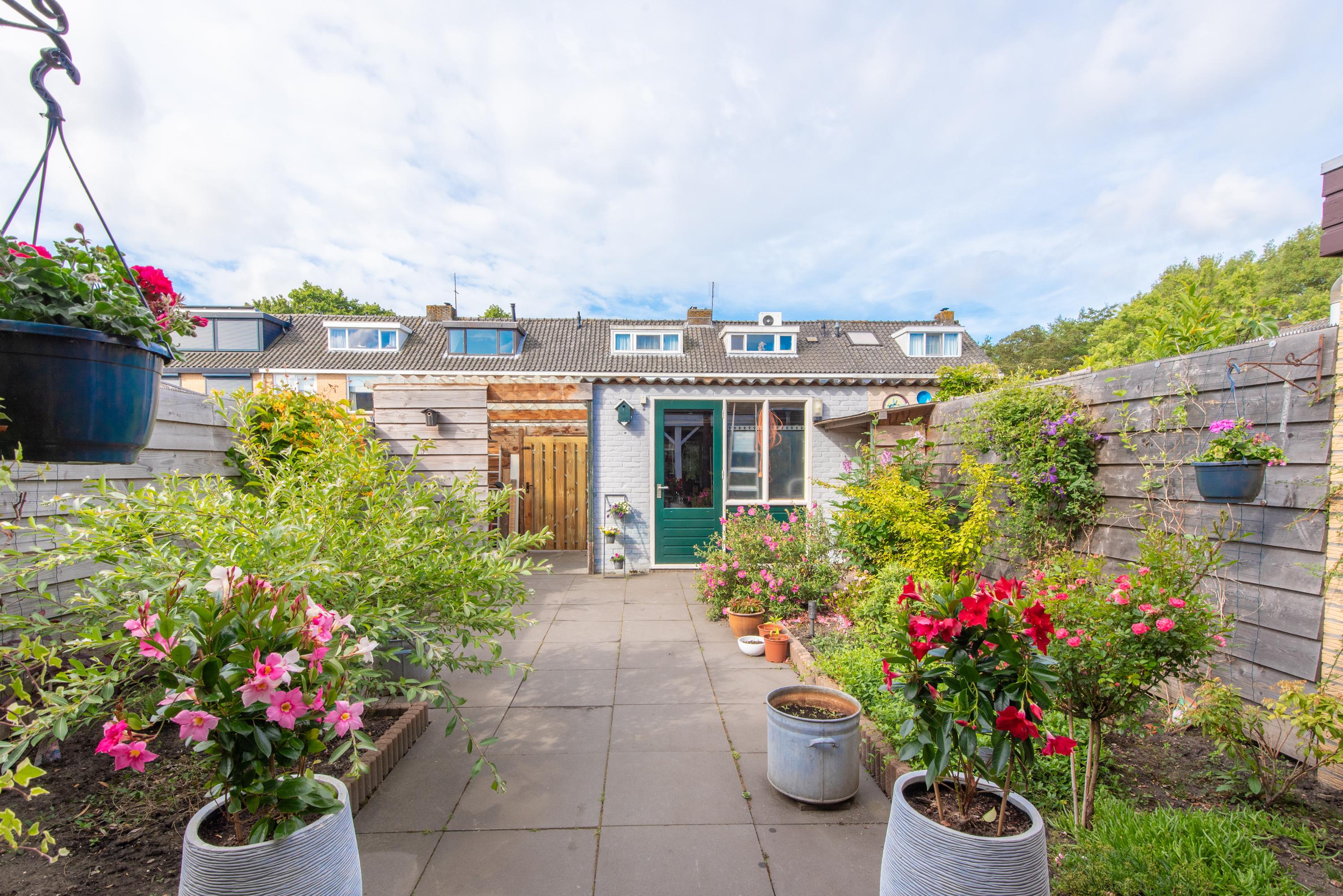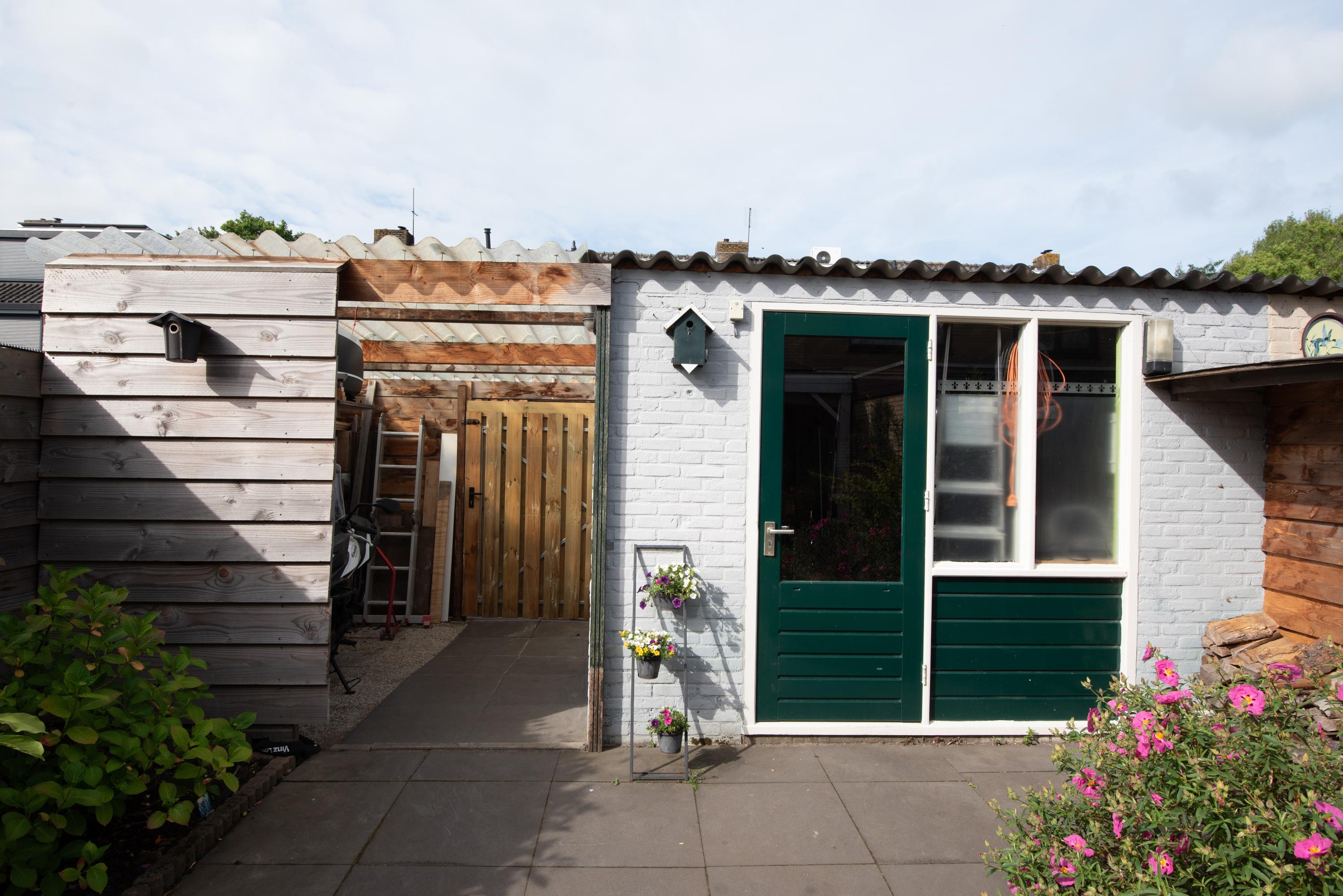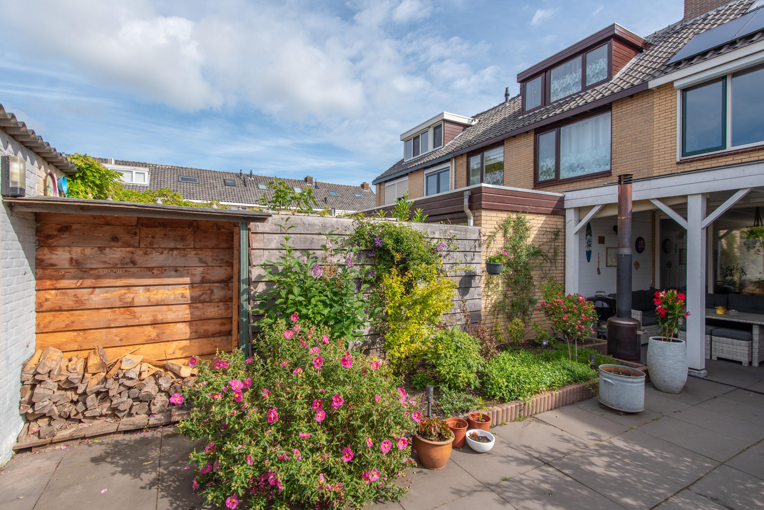 De achtertuin is opnieuw aangelegd en deels bestraat. Je vindt hier een sfeervolle veranda, een royale stenen schuur met een brede poort én een overkapping eraan vast – ideaal voor fietsen, opslag of als loungehoek. De tuin is keurig verzorgd en gelegen op het zuidwesten, wat zorgt voor fijne middag- en avondzon.