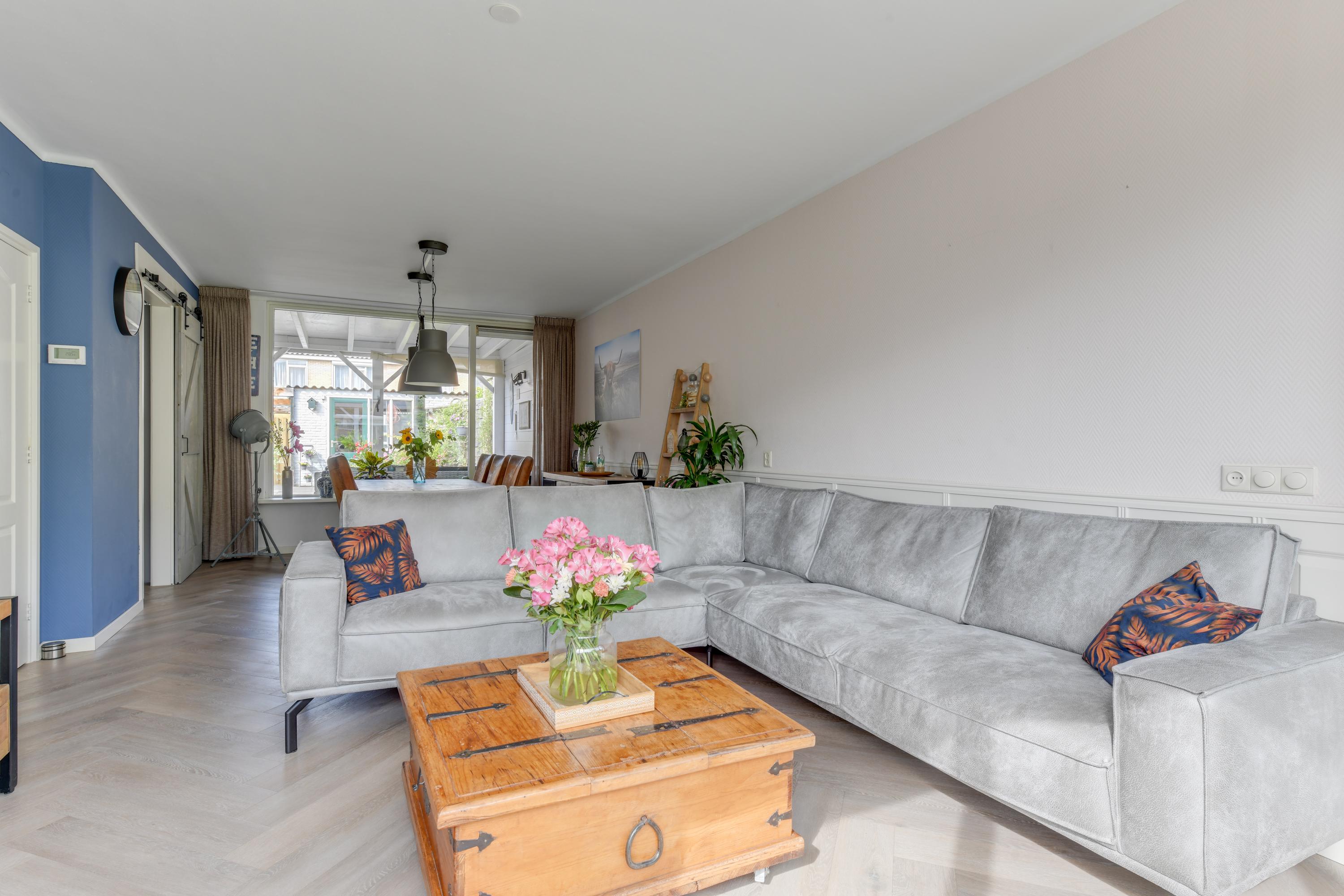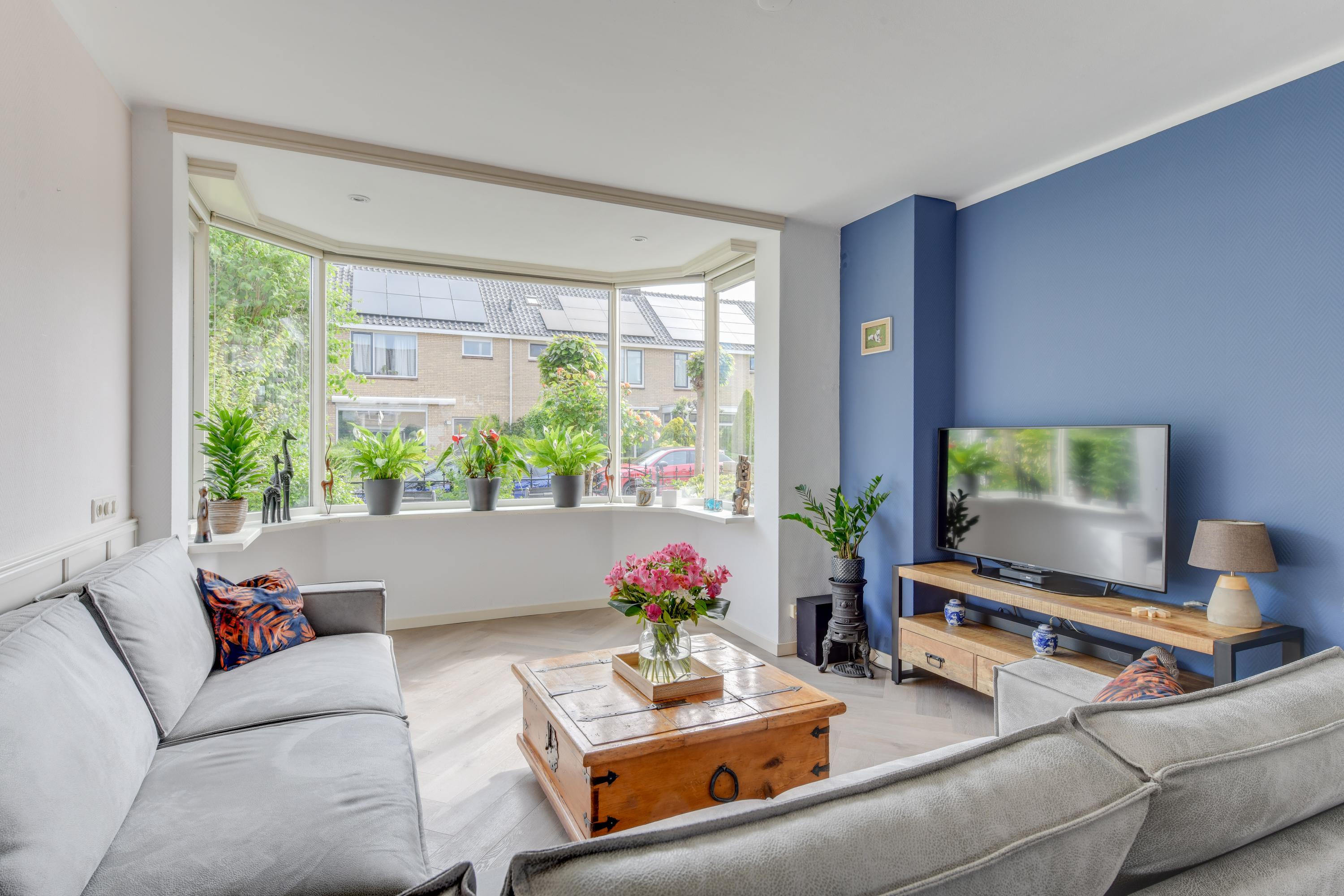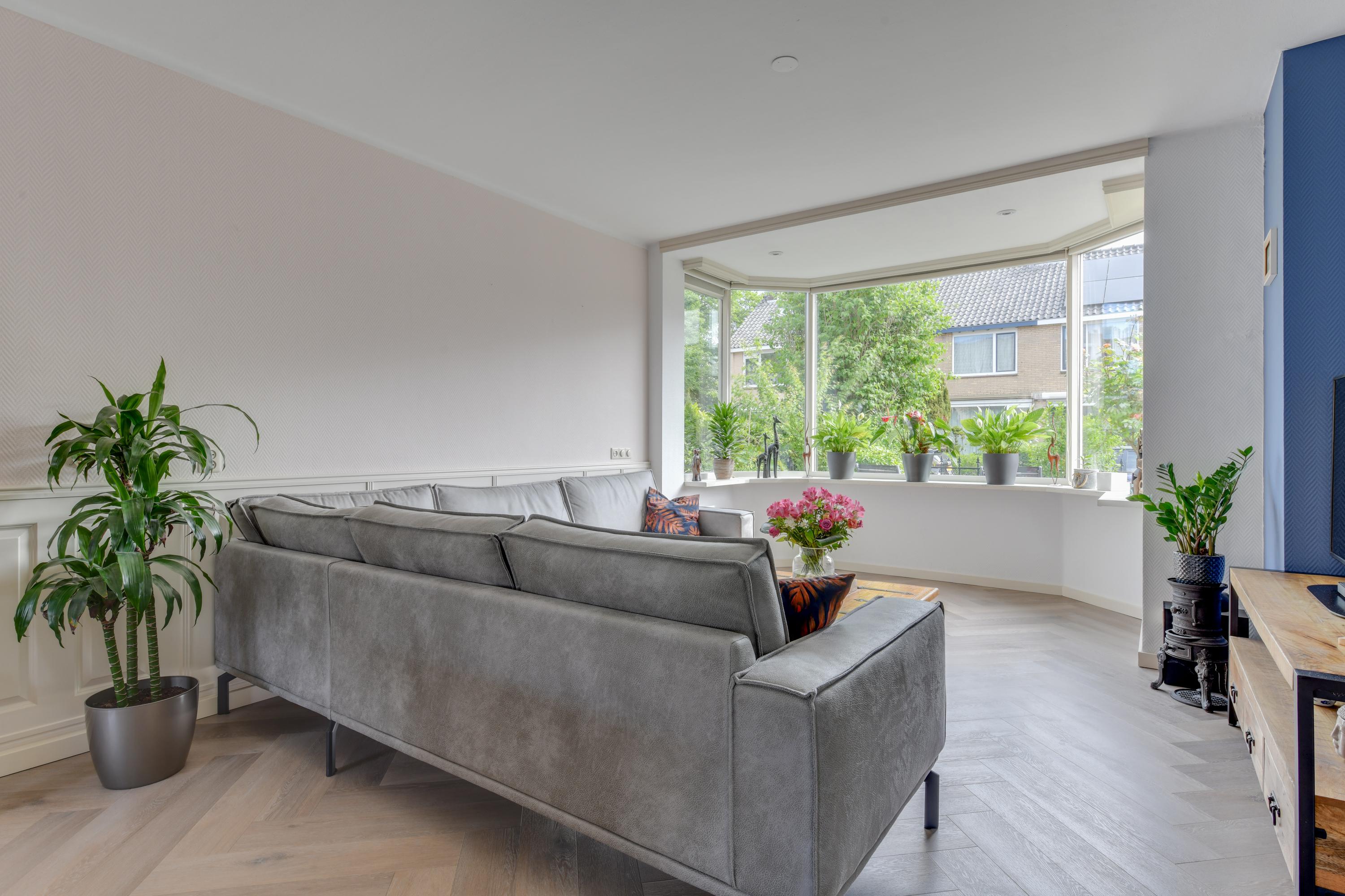 Via de voortuin en de charmante erker aan de voorzijde bereik je de entree van de woning. In de hal vind je het moderne toilet en de vernieuwde meterkast. De woonkamer is licht en ruim, met een strak gestuukt plafond, behang op de muren en een schuifdeur naar de keuken. De vloer is voorzien van vloerverwarming en PVC.