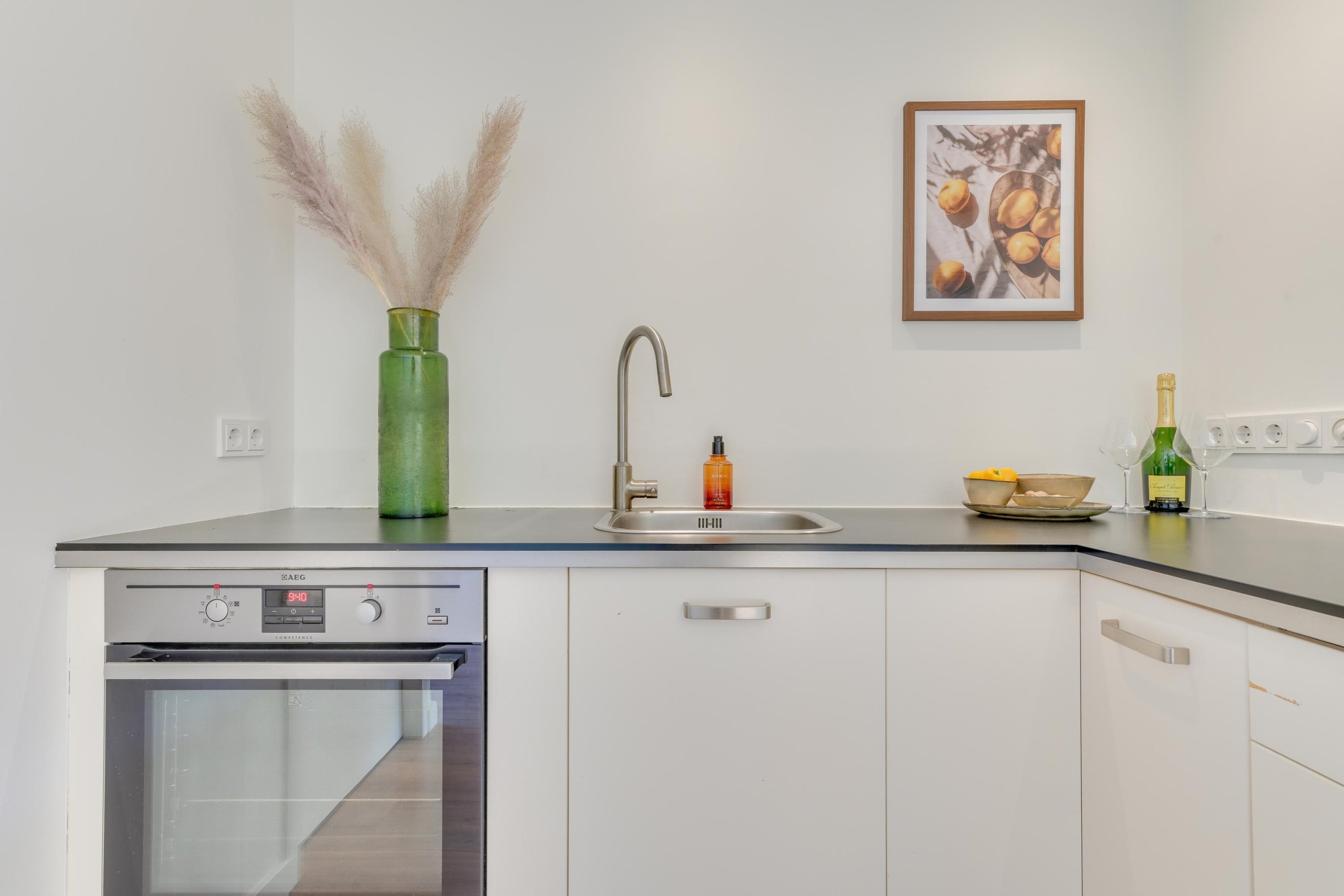 De moderne, luxe L-vormige keuken is voorzien van diverse in-opbouwapparatuur, waaronder een oven, koel- en vrieskast, gaskookplaat en vaatwasser.