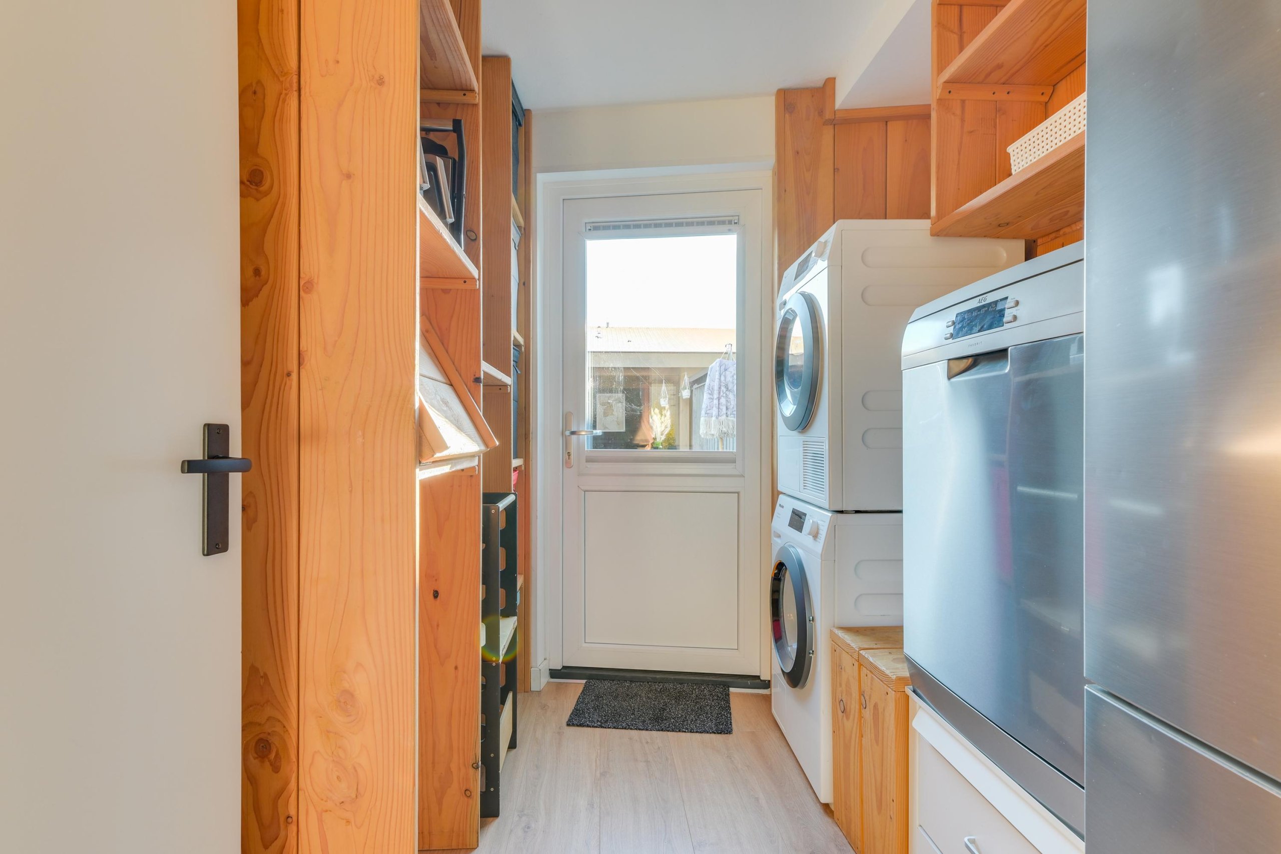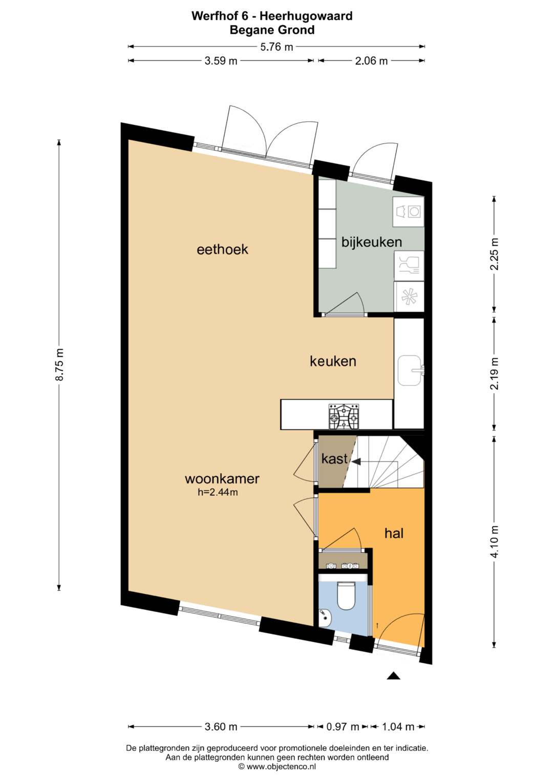 Begane grond: Ruime hal, meterkast en toiletruimte. Toegang tot de lichte woonkamer met openslaande deuren naar de achtertuin. Centraal in het woongedeelte bevindt zich de luxe keuken met inbouwapparatuur. Vanuit de keuken is er toegang tot de bijkeuken, voorzien van witgoedaansluiting en eveneens toegang tot de achtertuin. Vrijwel de gehele begane grond is voorzien van een laminaatvloer.