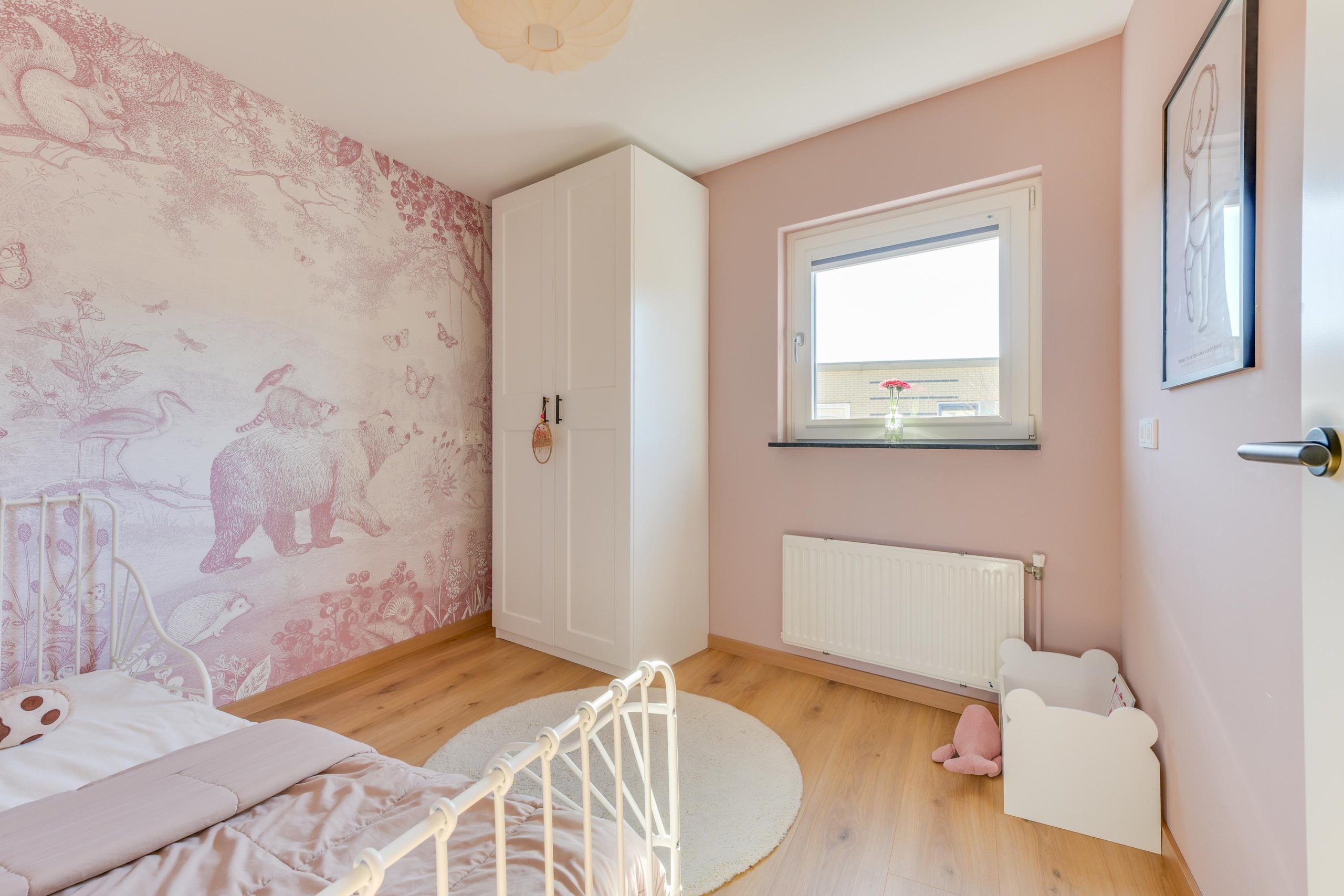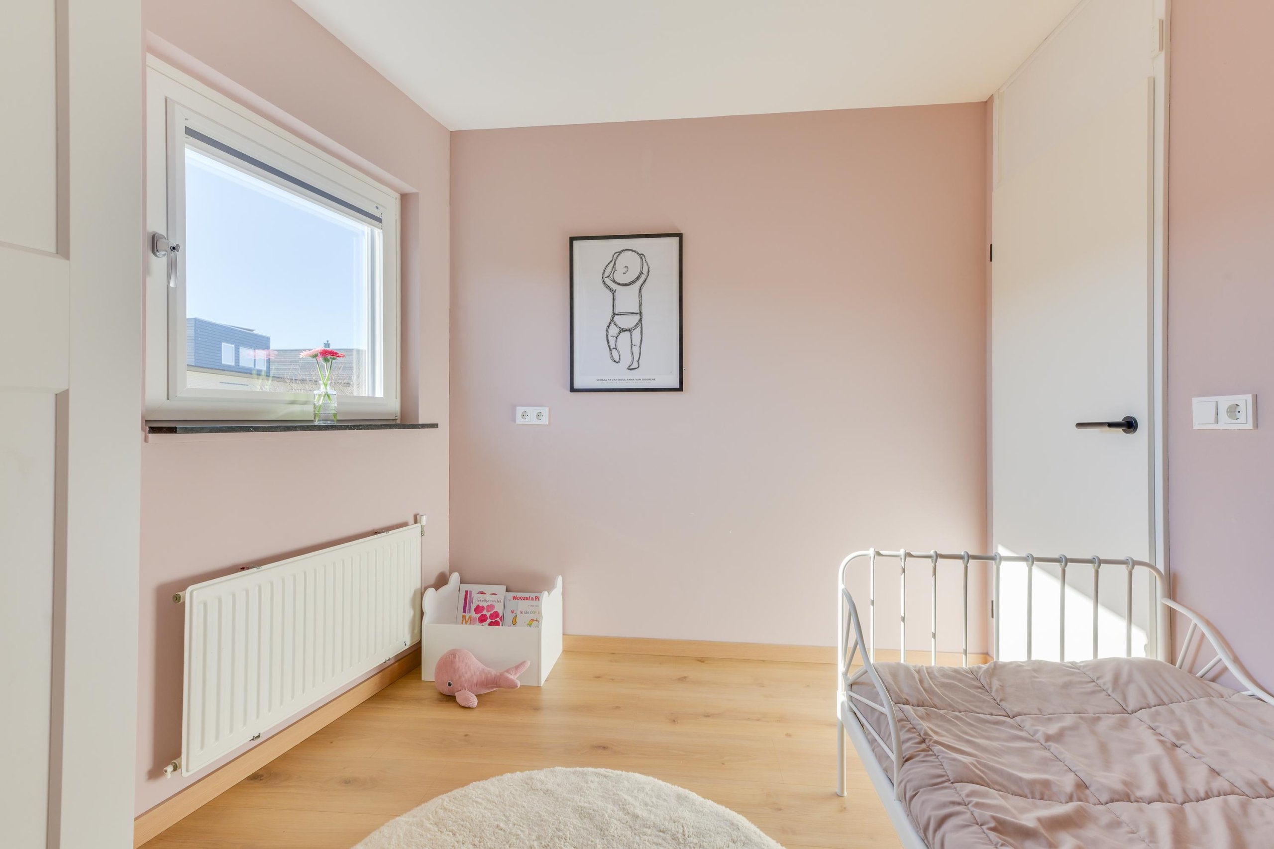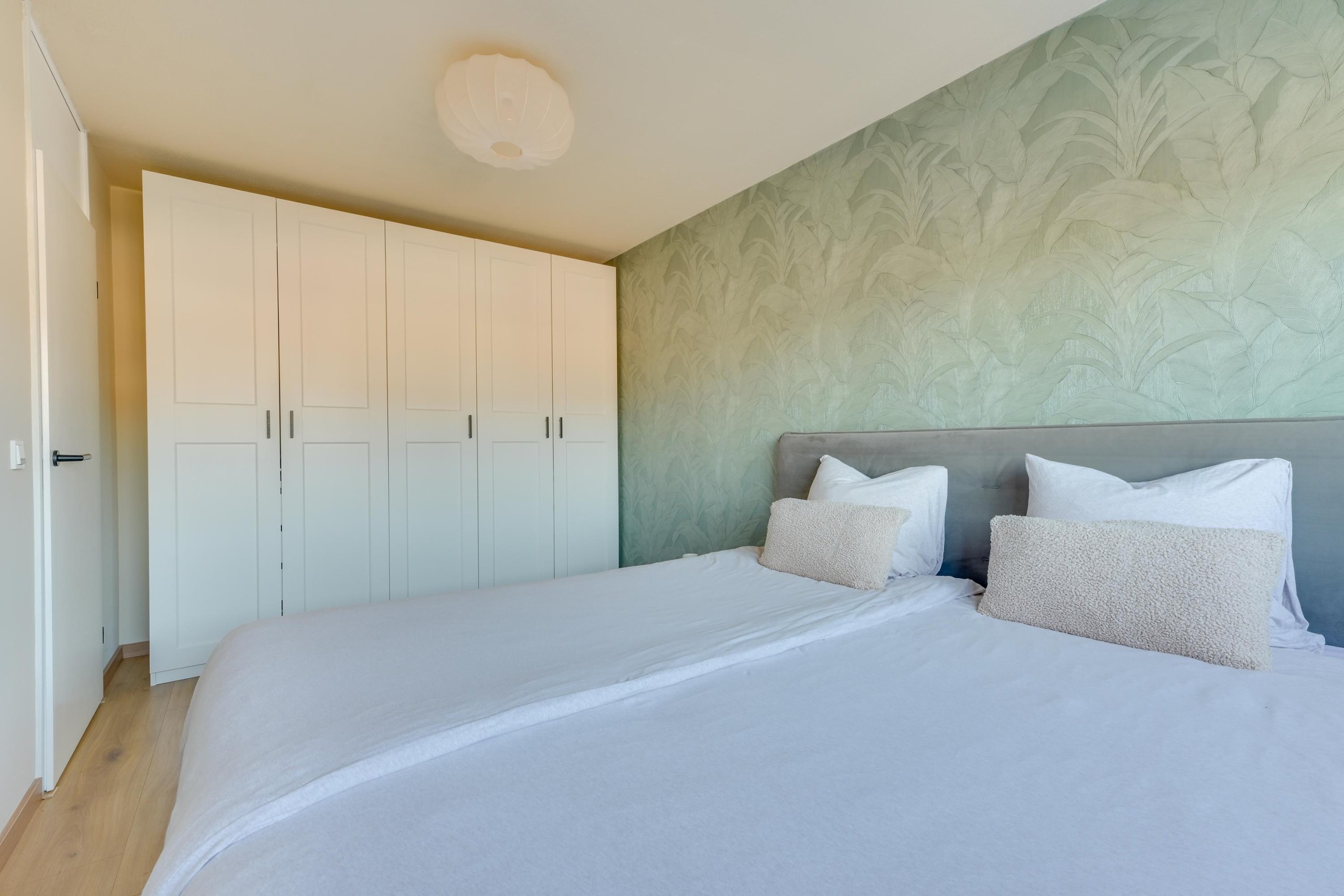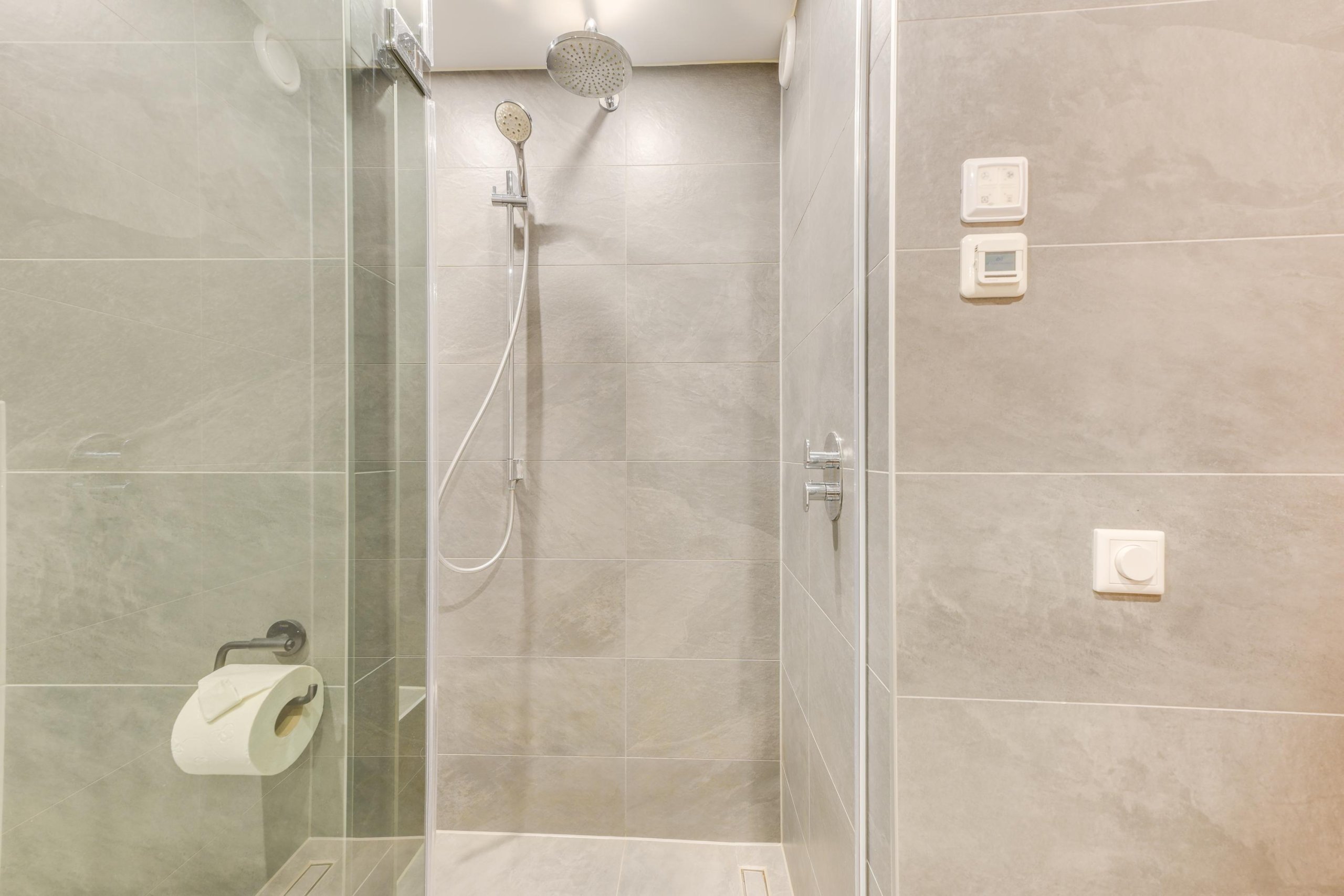 Overloop, vier goed bemeten slaapkamers en een moderne badkamer (2021) met inloopdouche, wastafel en tweede toilet.