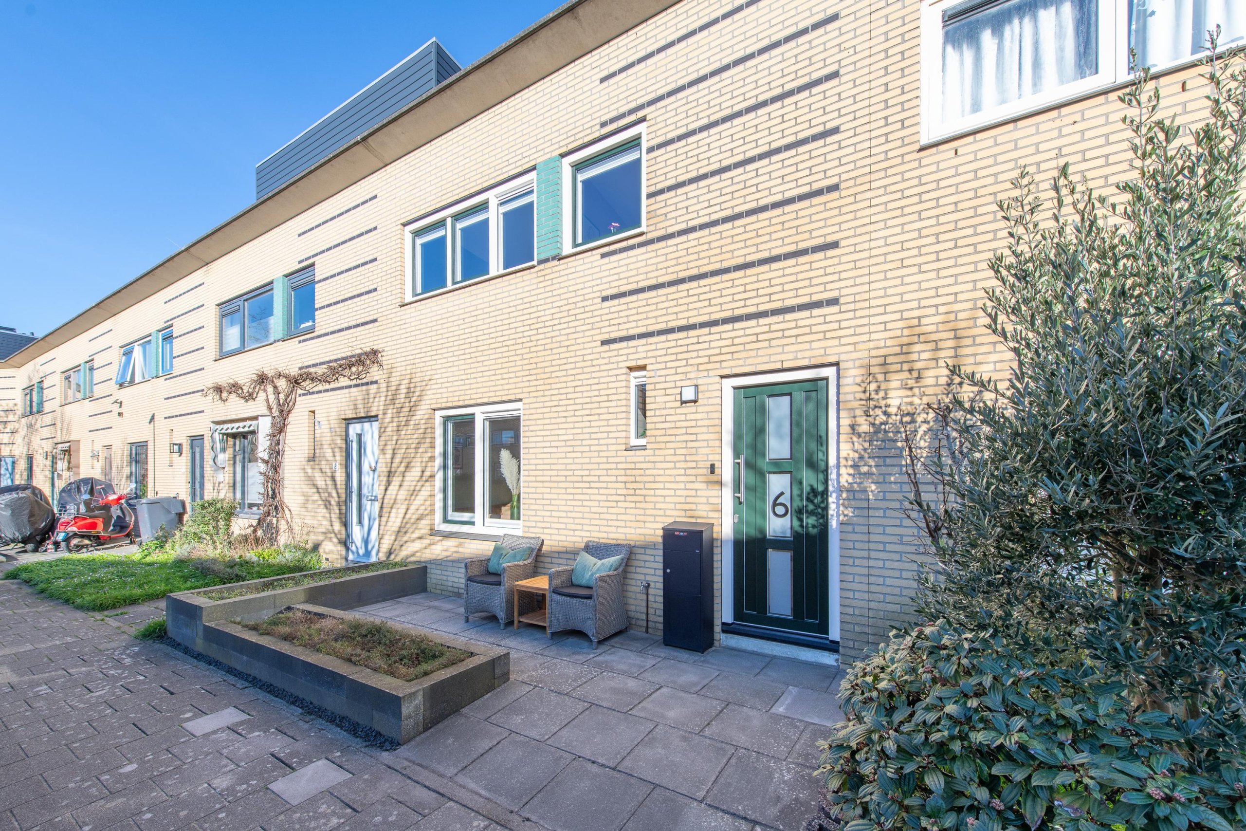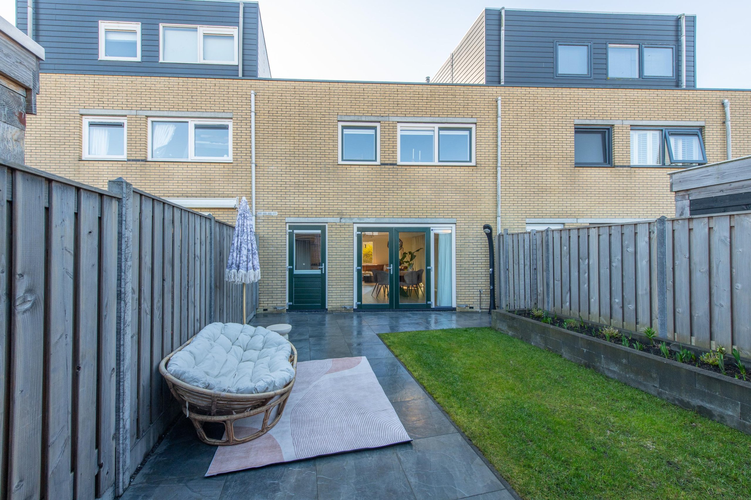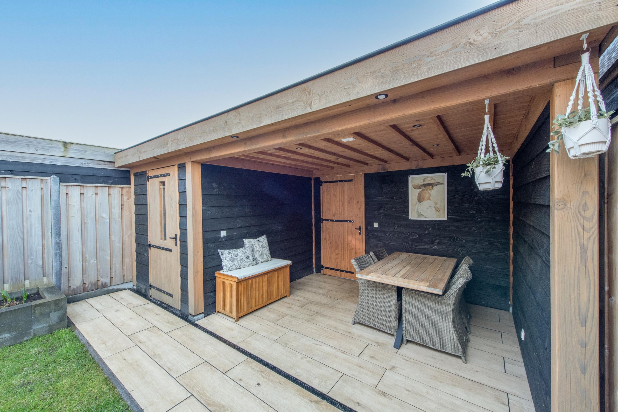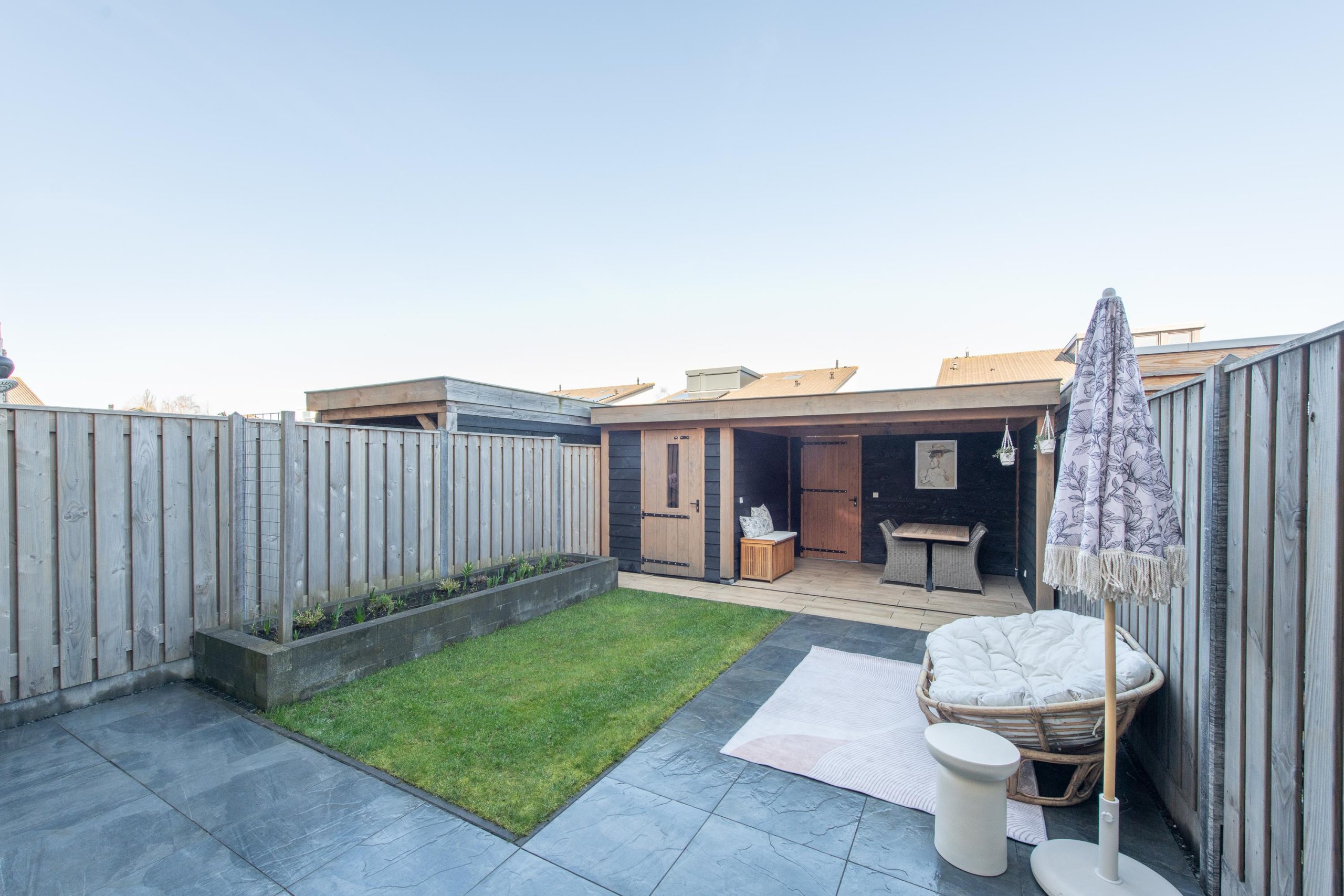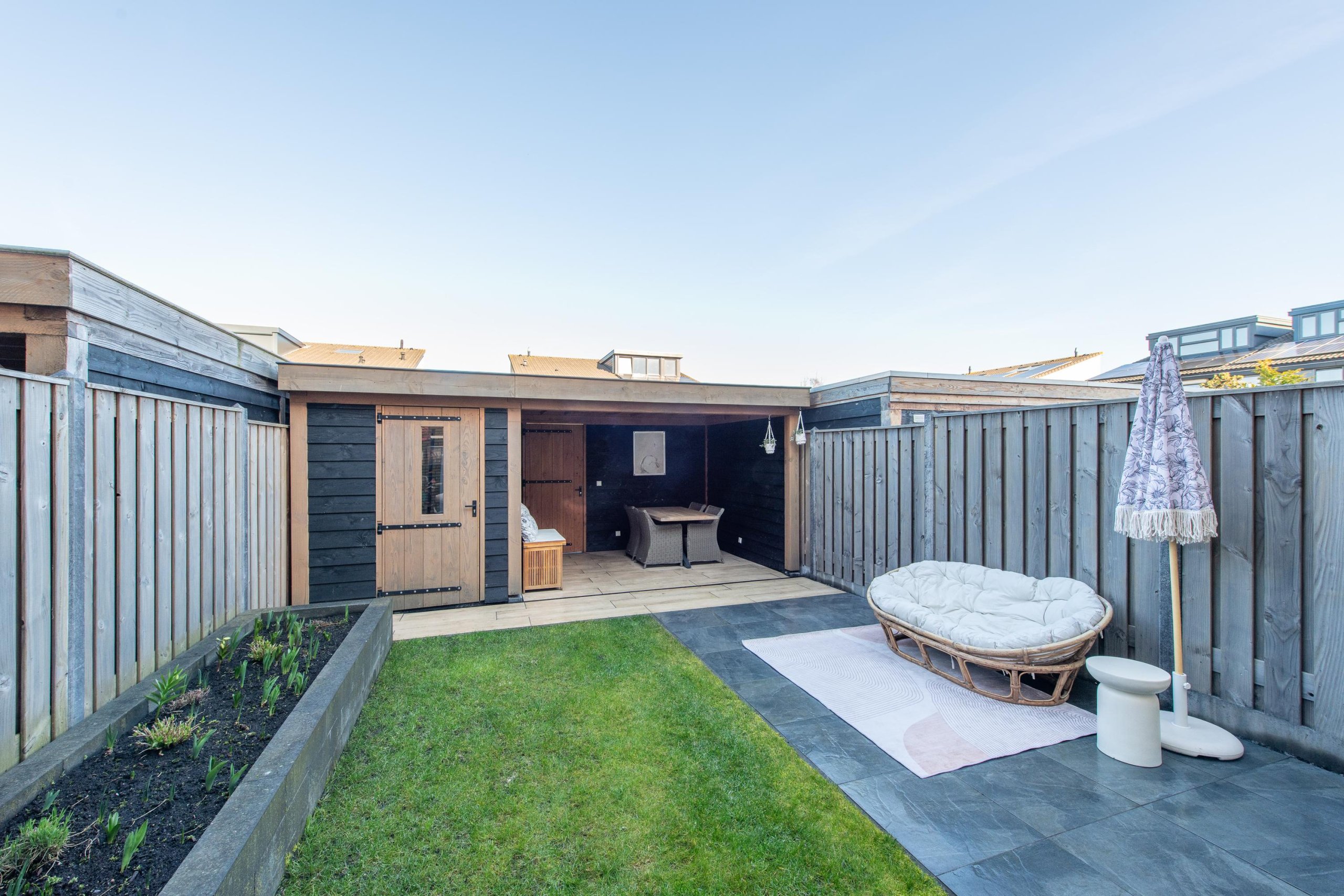 De diepe en brede tuin is fraai aangelegd (2020) door een hovenier en voorzien van een veranda en een houten schuur.
