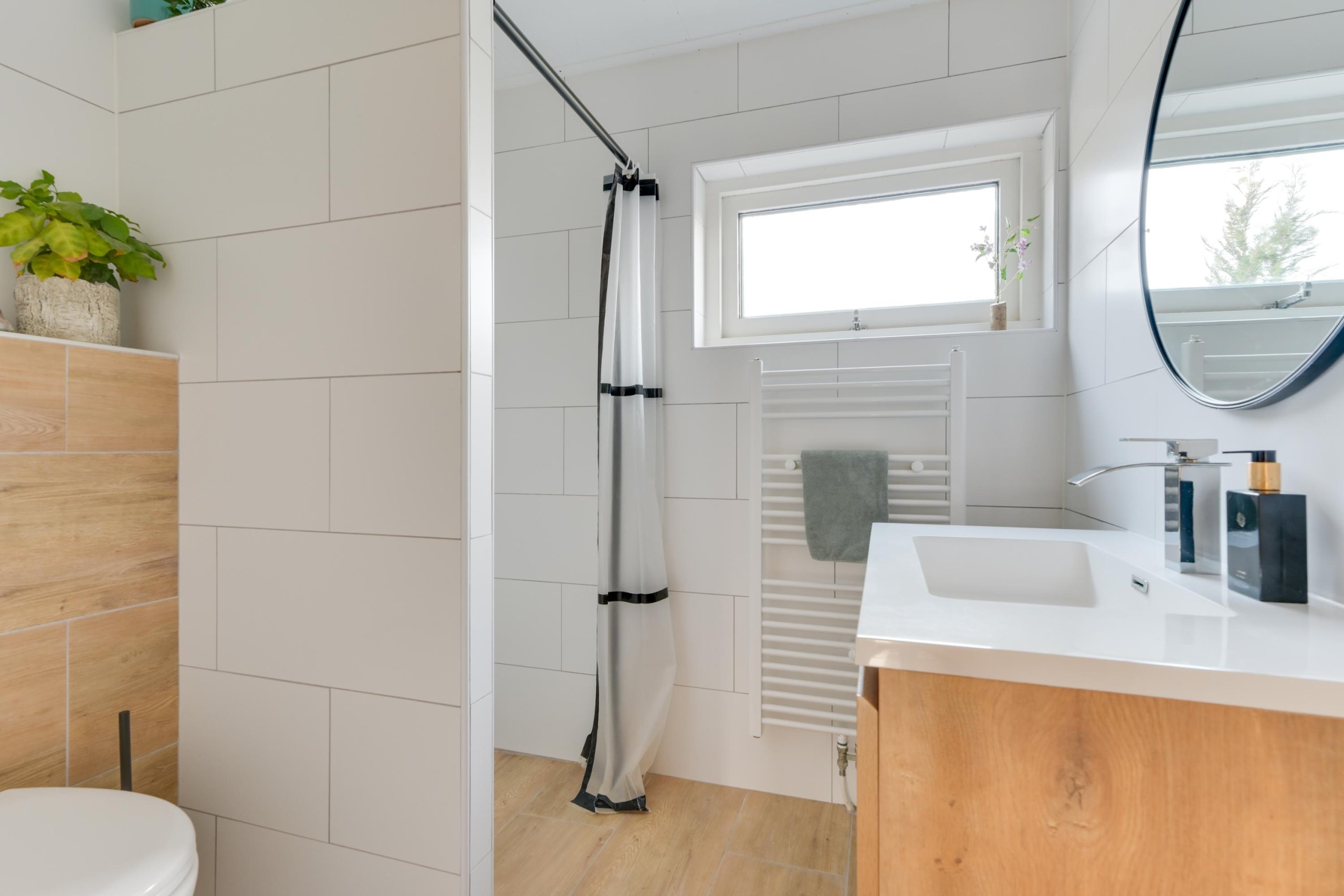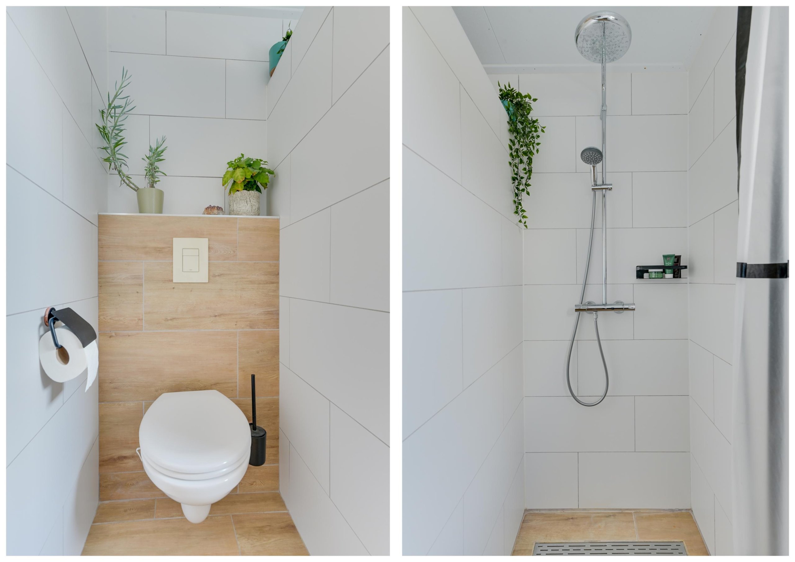 De badkamer is netjes uitgevoerd en voorzien van een douche, toilet en wastafel.