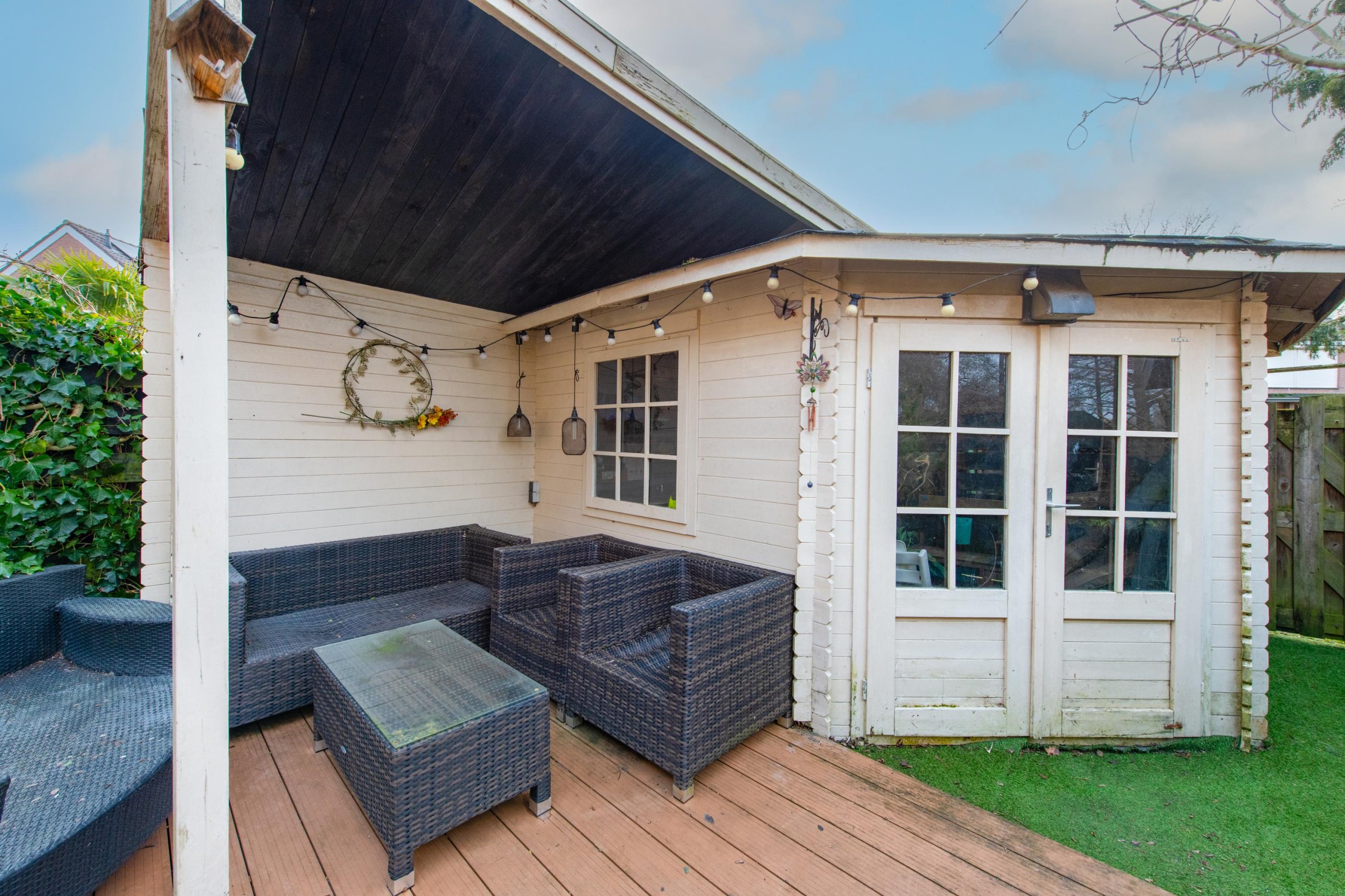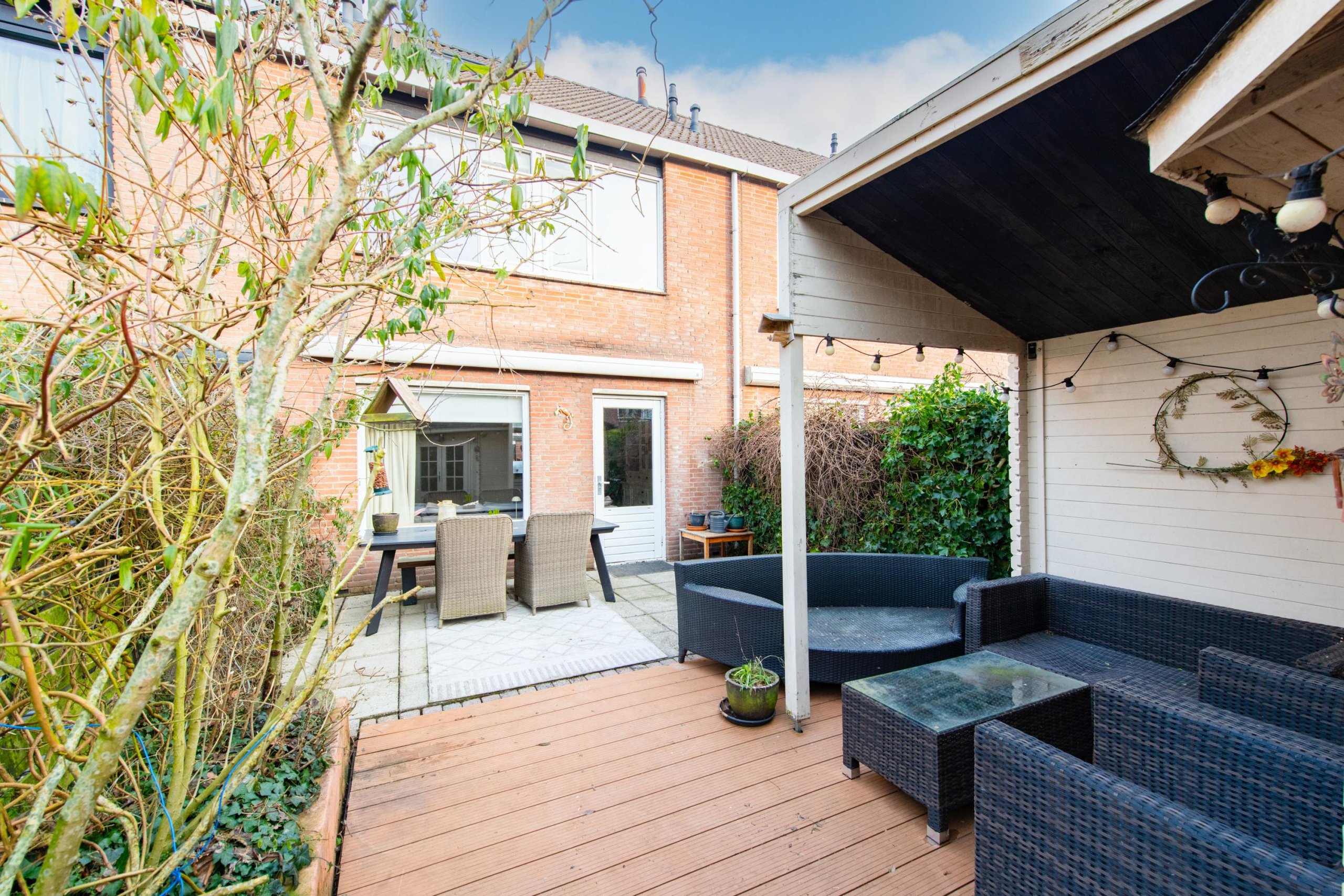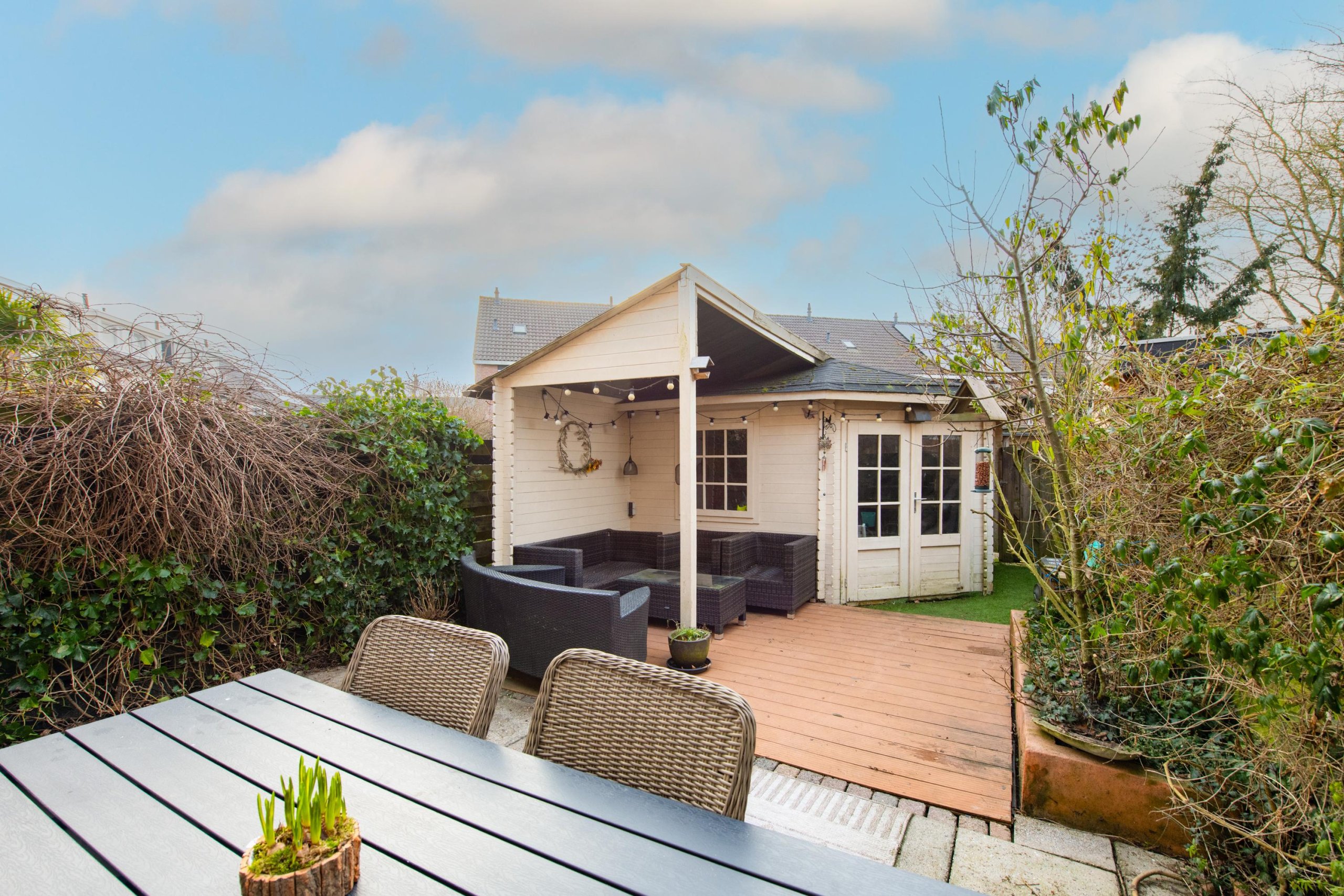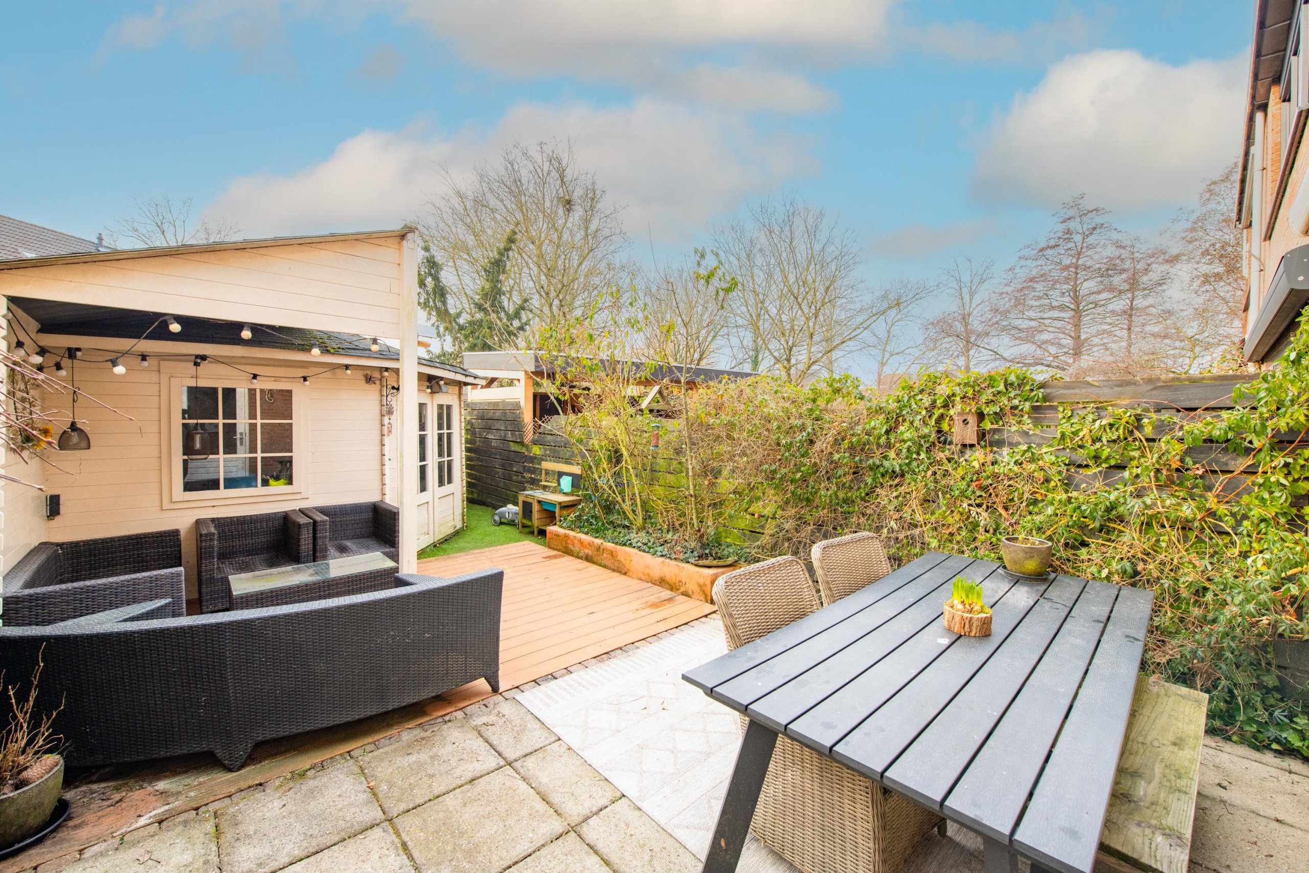 De achtertuin beschikt over een houten tuinschuur en een praktische achterom. Dankzij de extra deur in de schuur zet je bijvoorbeeld een bakfiets eenvoudig en snel binnen.