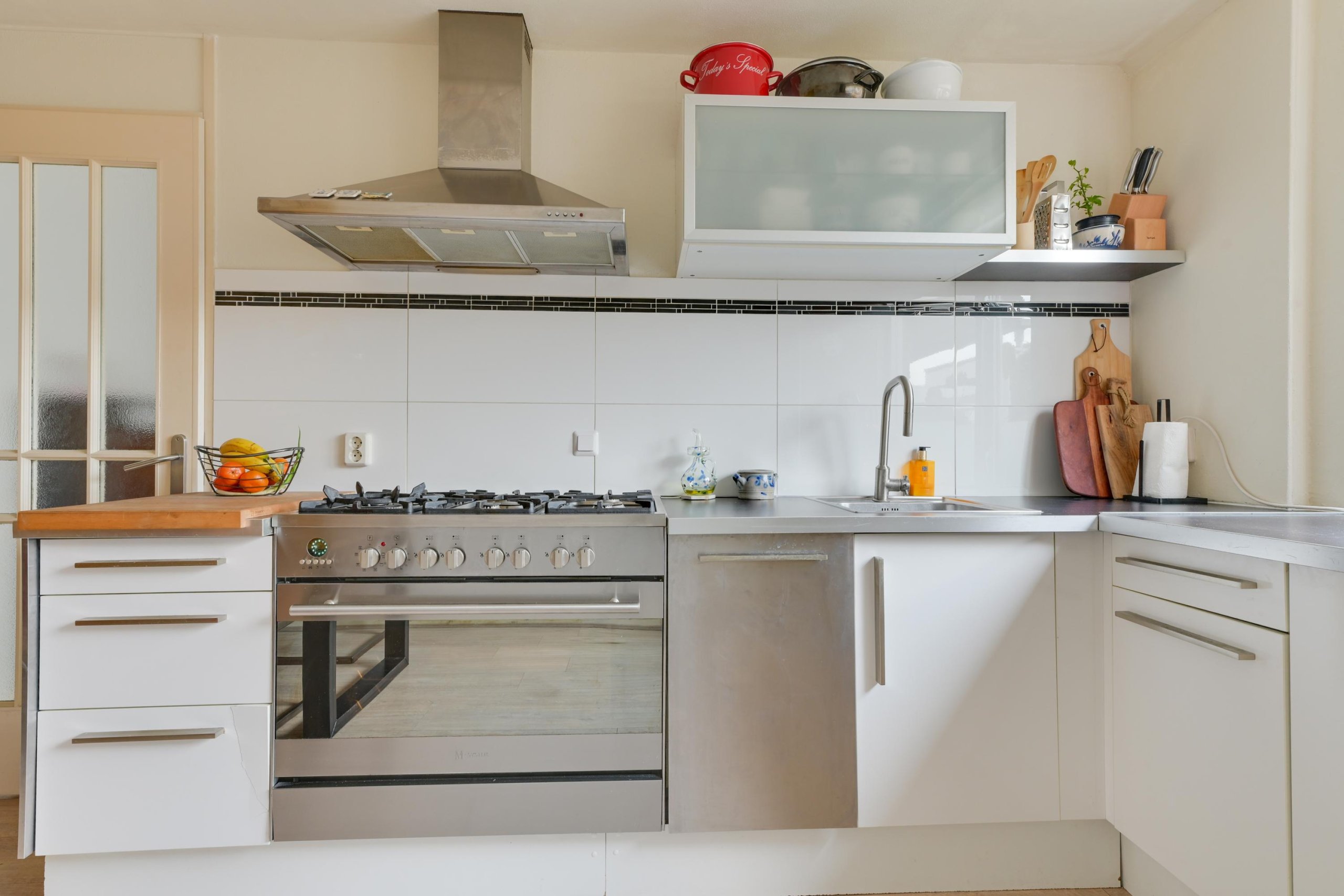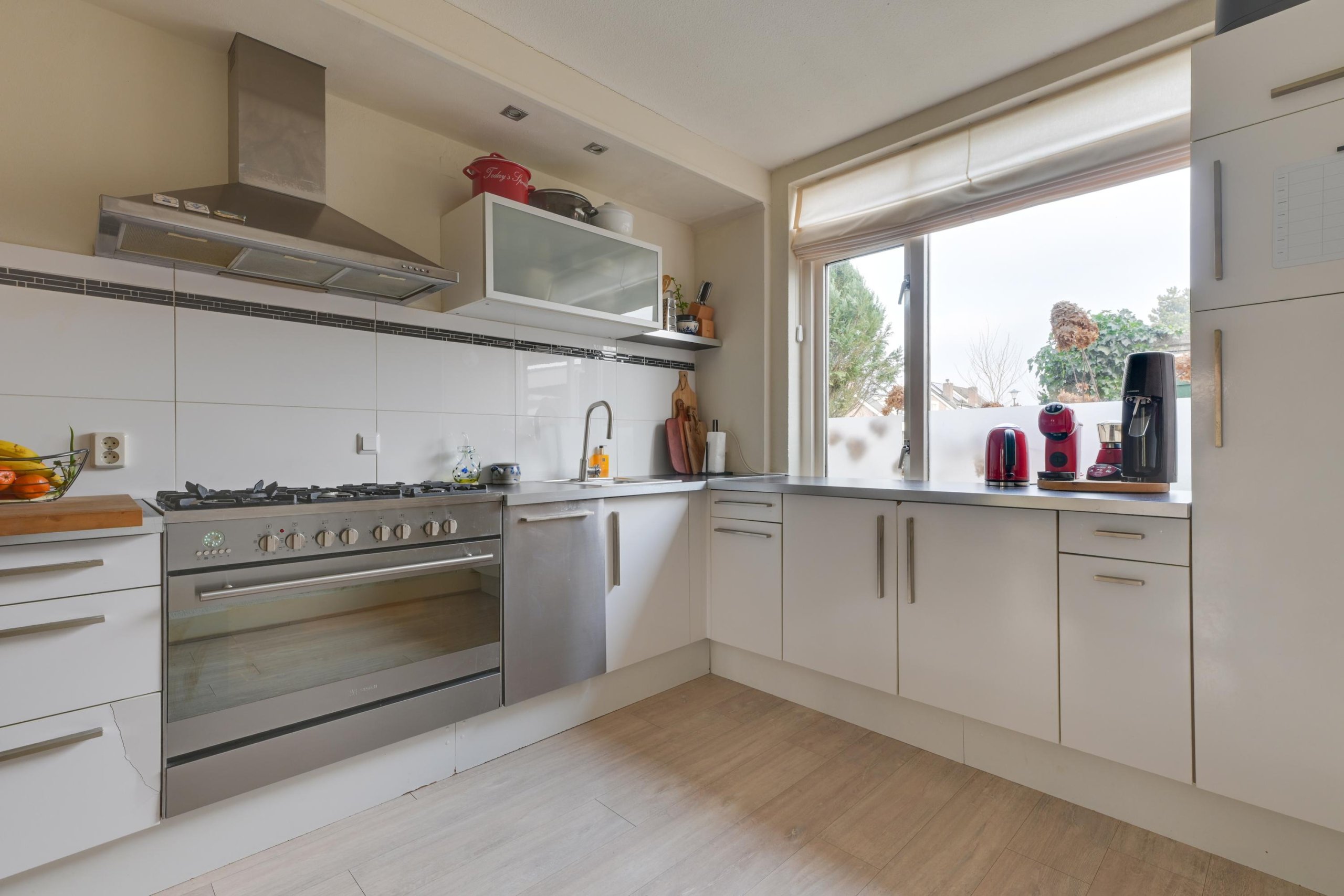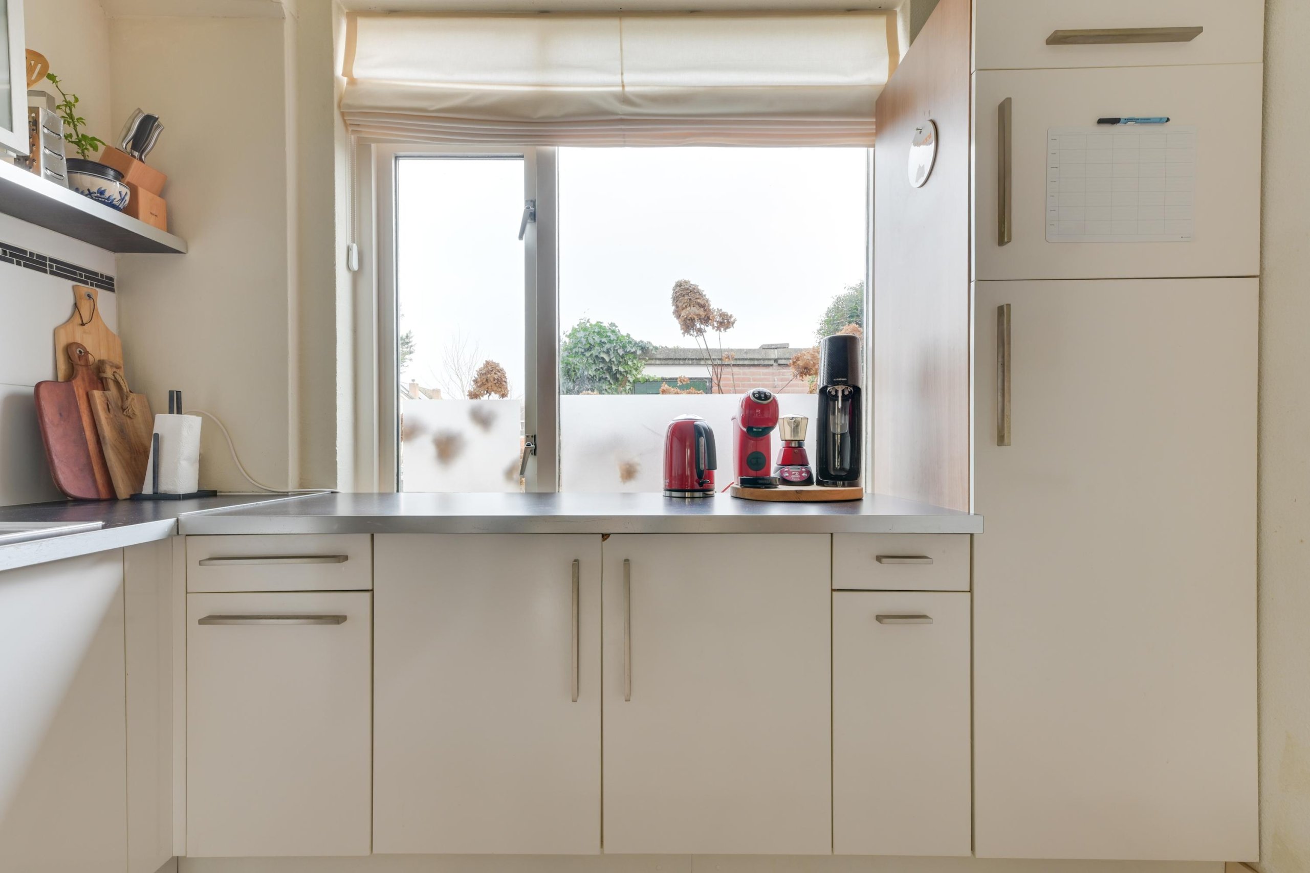 De keuken bevindt zich aan de voorzijde van de woning en is uitgevoerd in een lichte kleurstelling, voorzien van diverse inbouwapparatuur.