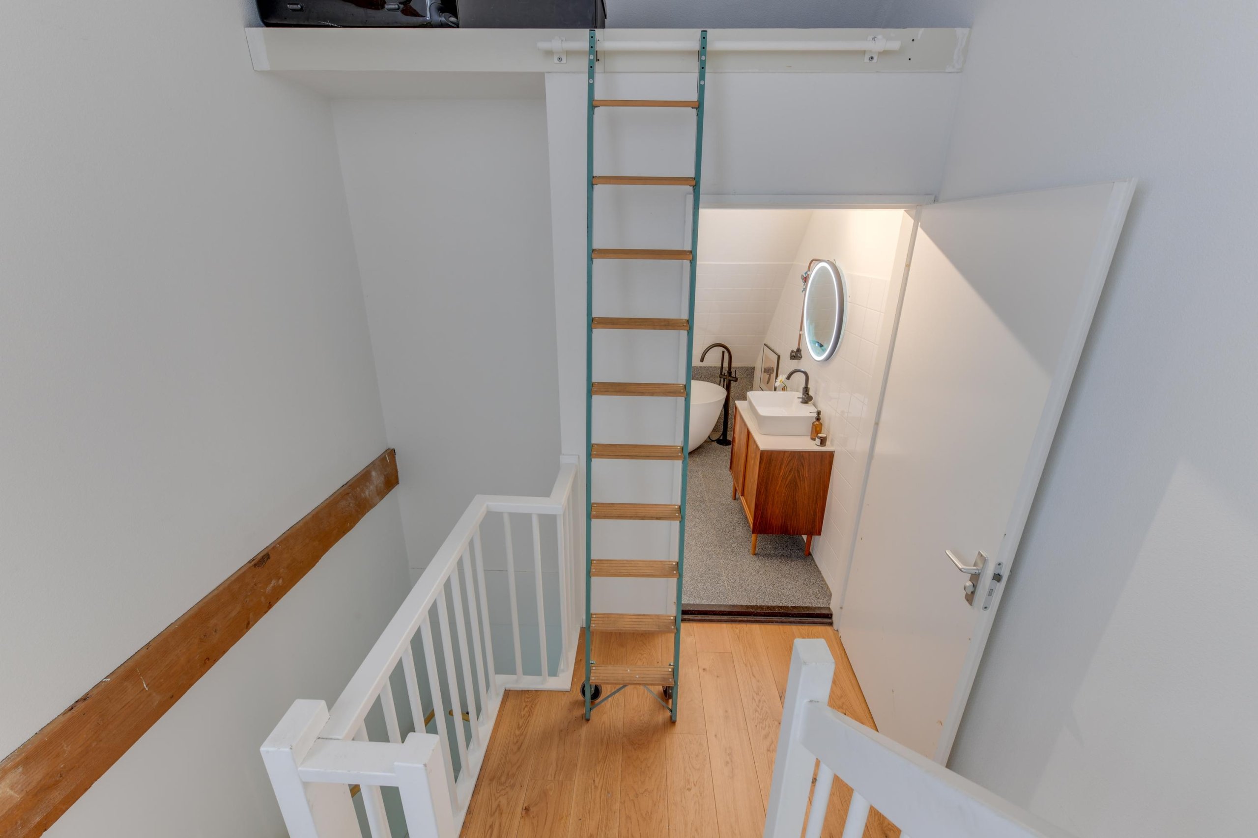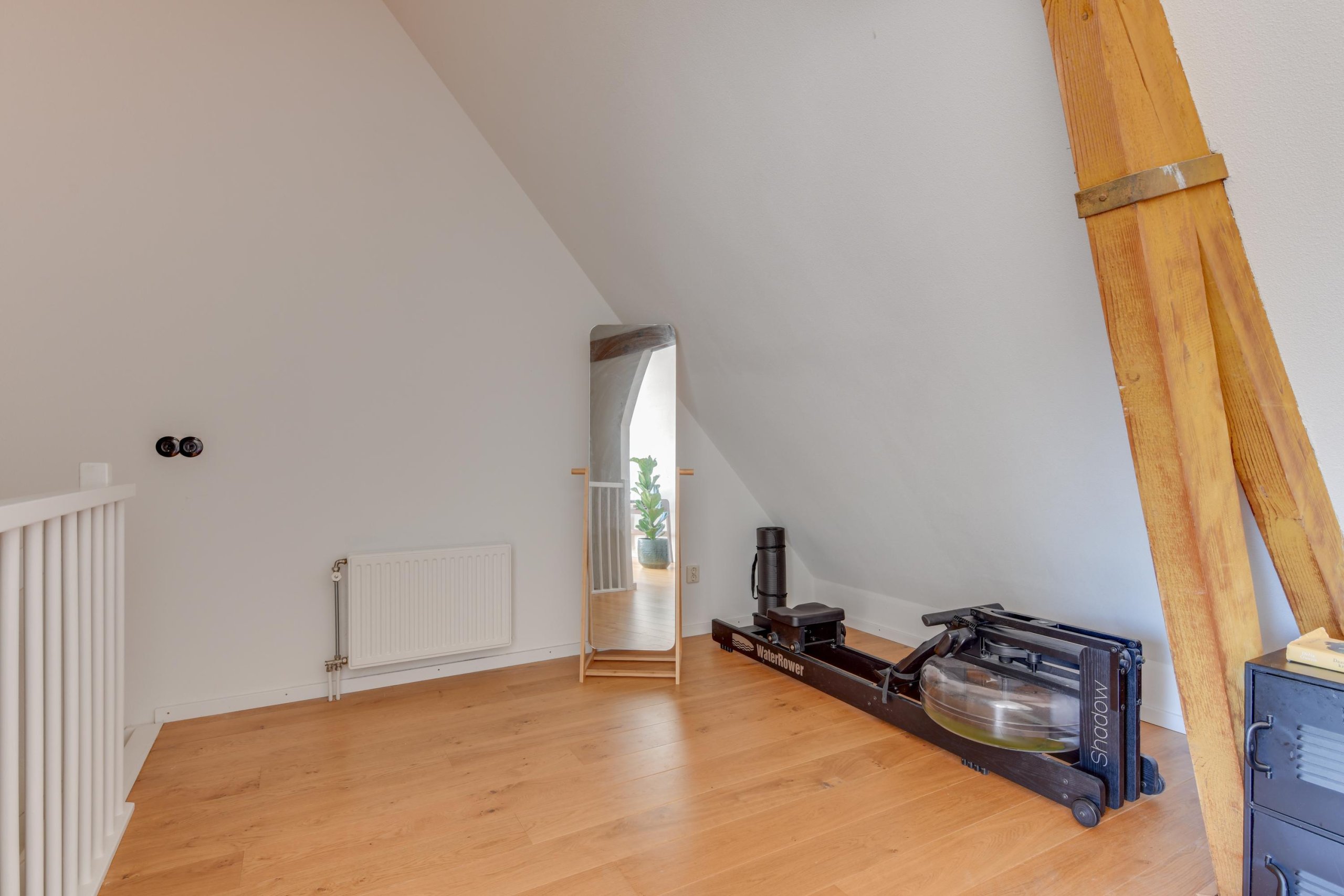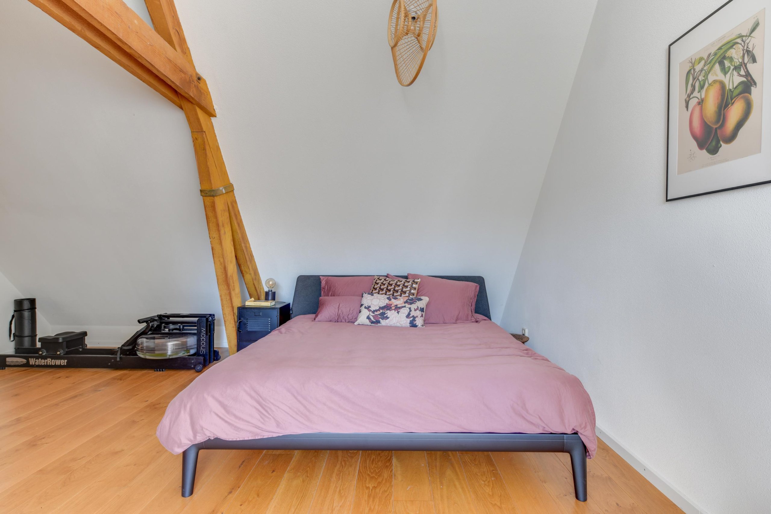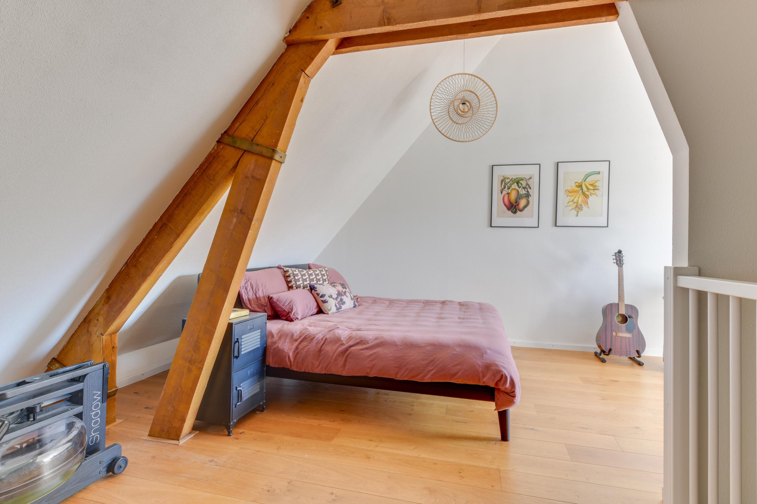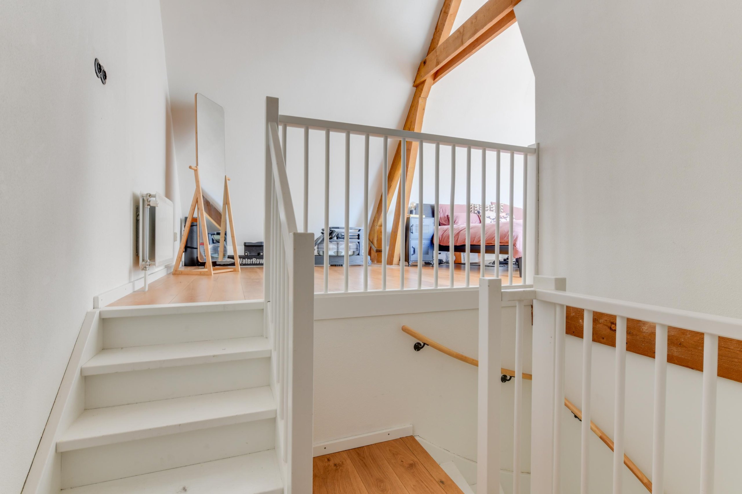 Bovenverdieping: Een klein aantal treden hoger vind je de open slaap-/werkverdieping met een prachtige balkenconstructie. De ruimte heeft een heerlijk loftgevoel en biedt volop mogelijkheden voor slapen, werken en opbergen.