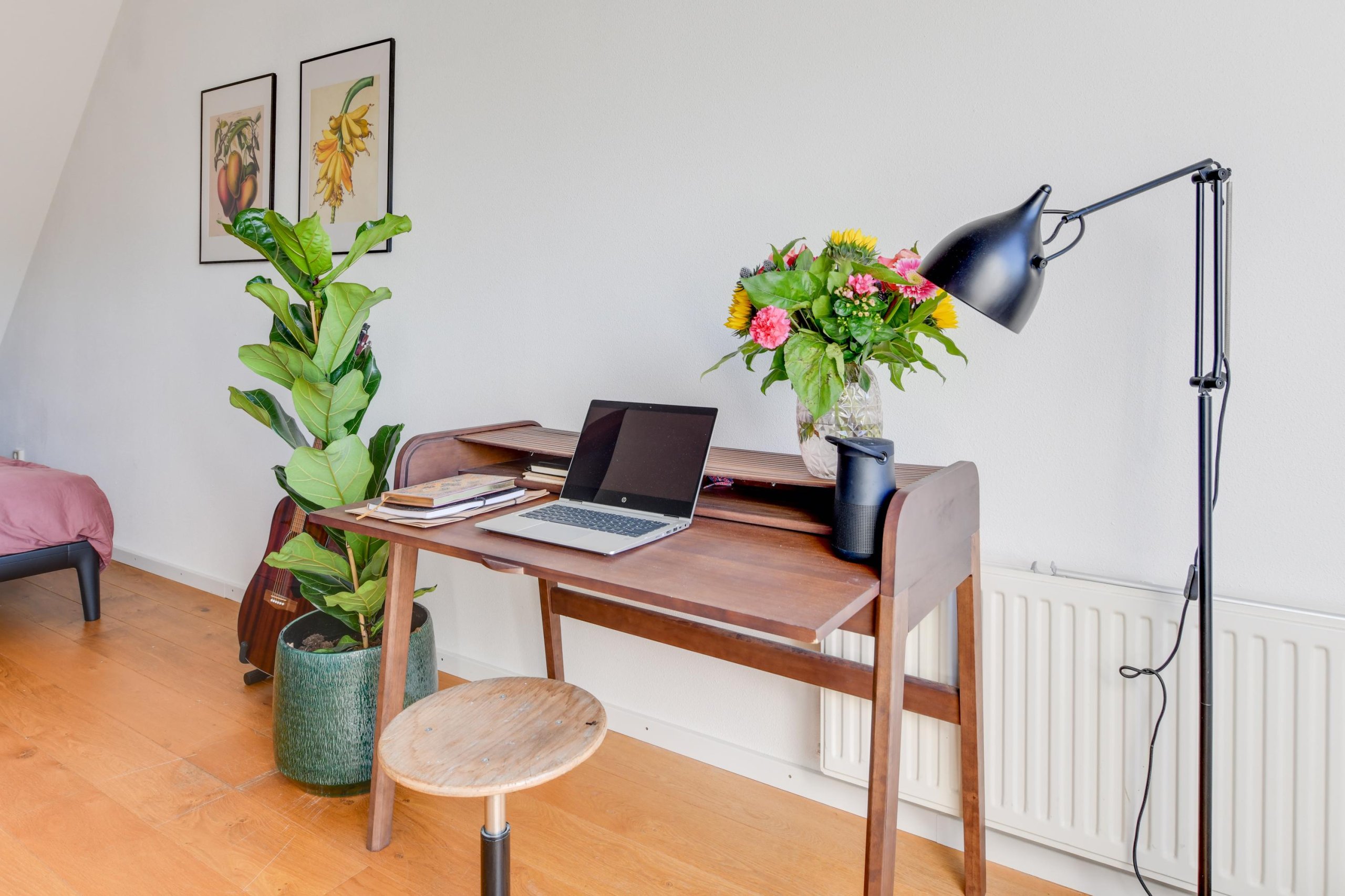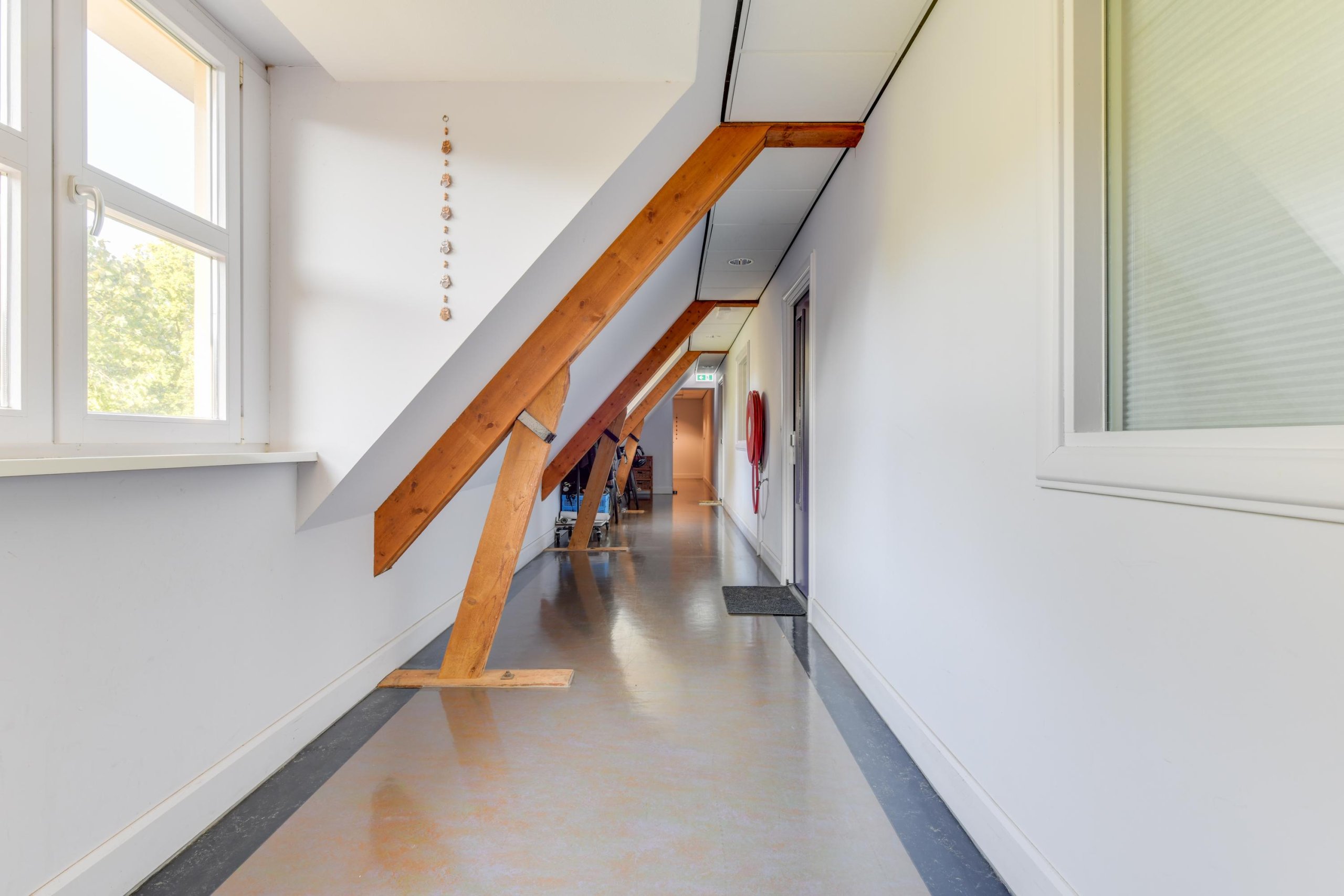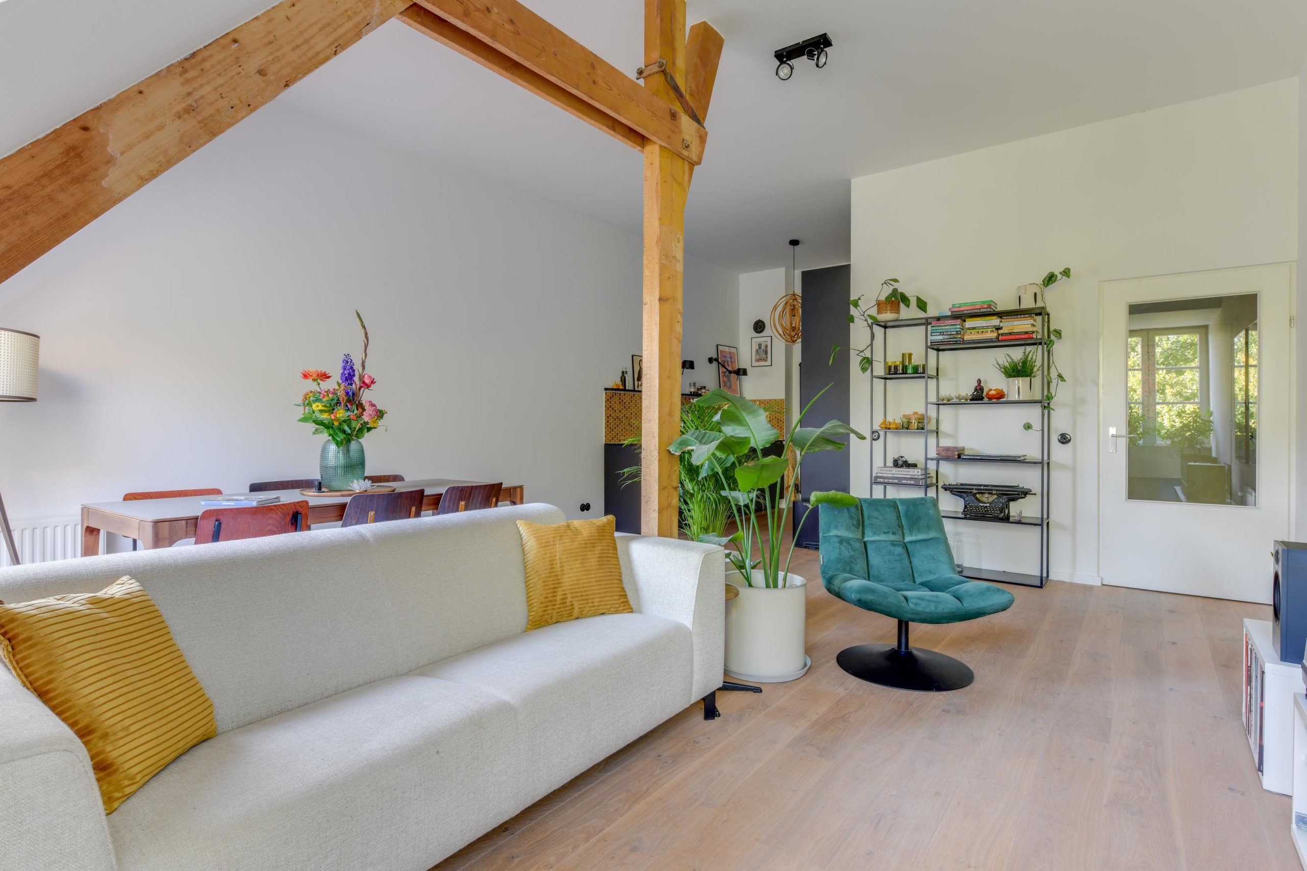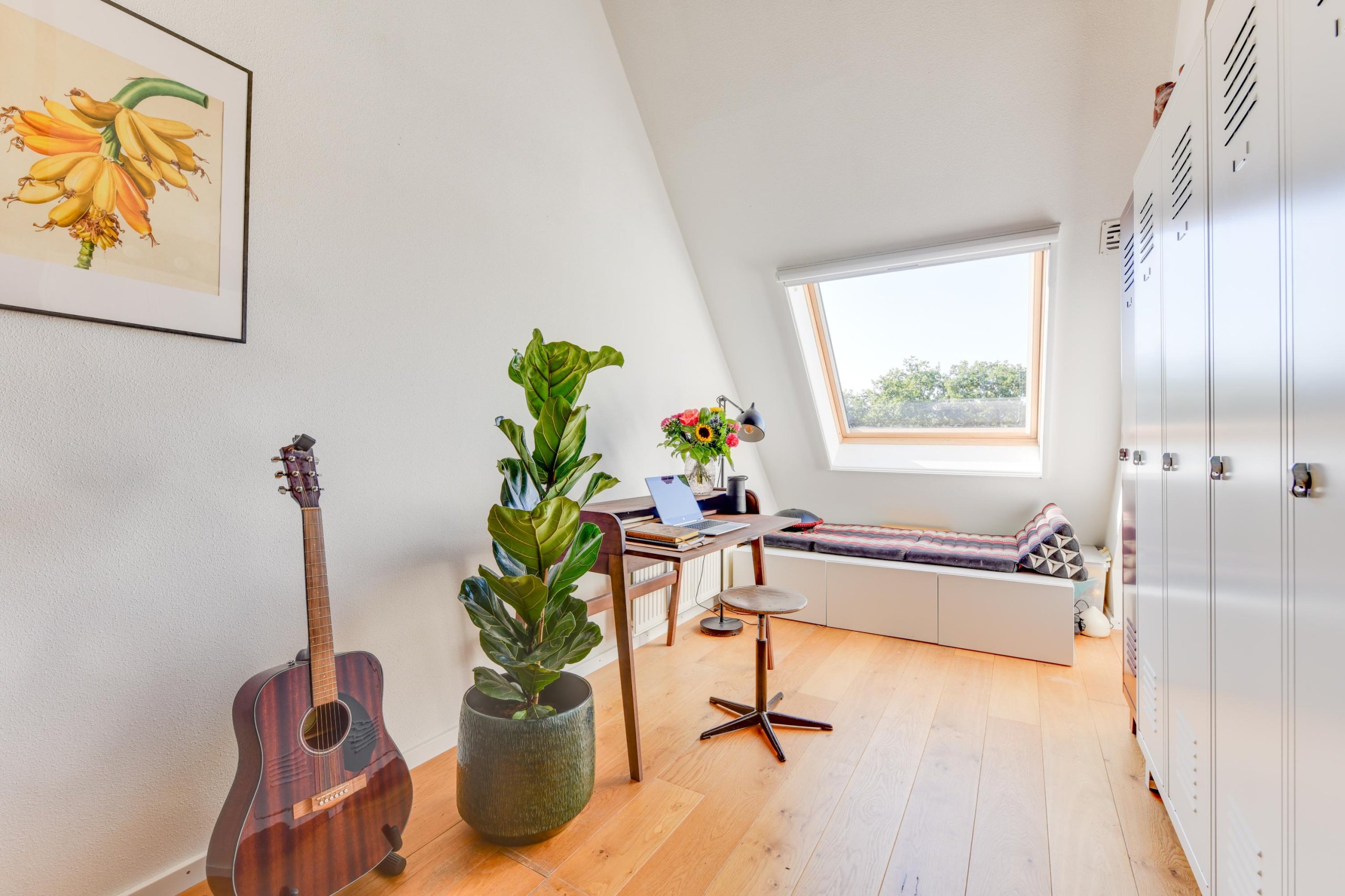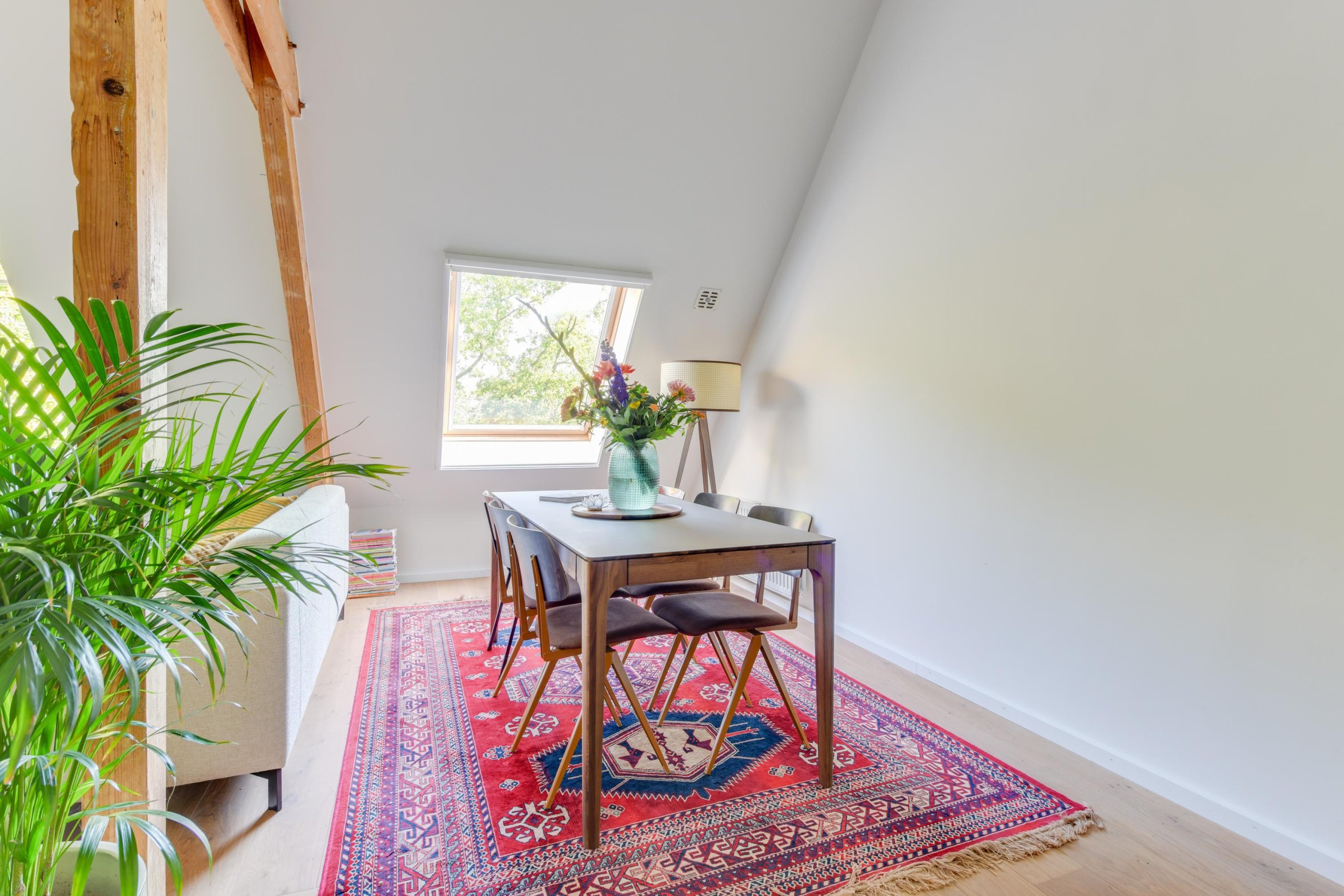 Bovenverdieping: Een klein aantal treden hoger vind je de open slaap-/werkverdieping met een prachtige balkenconstructie. De ruimte heeft een heerlijk loftgevoel en biedt volop mogelijkheden voor slapen, werken en opbergen.