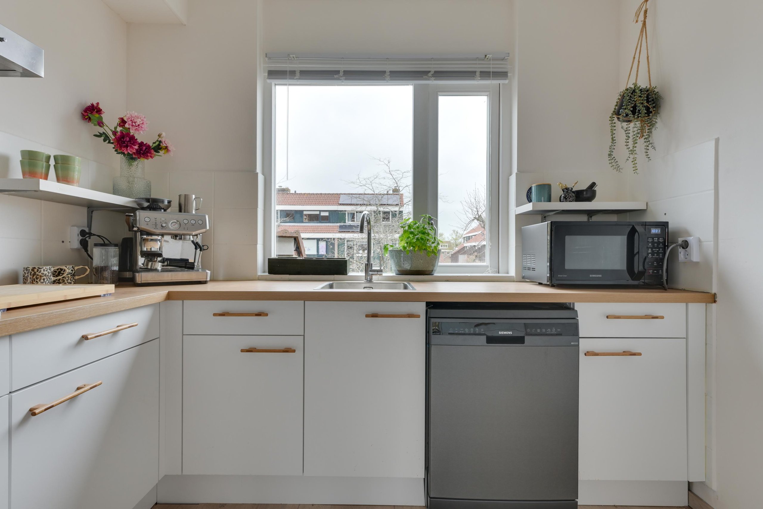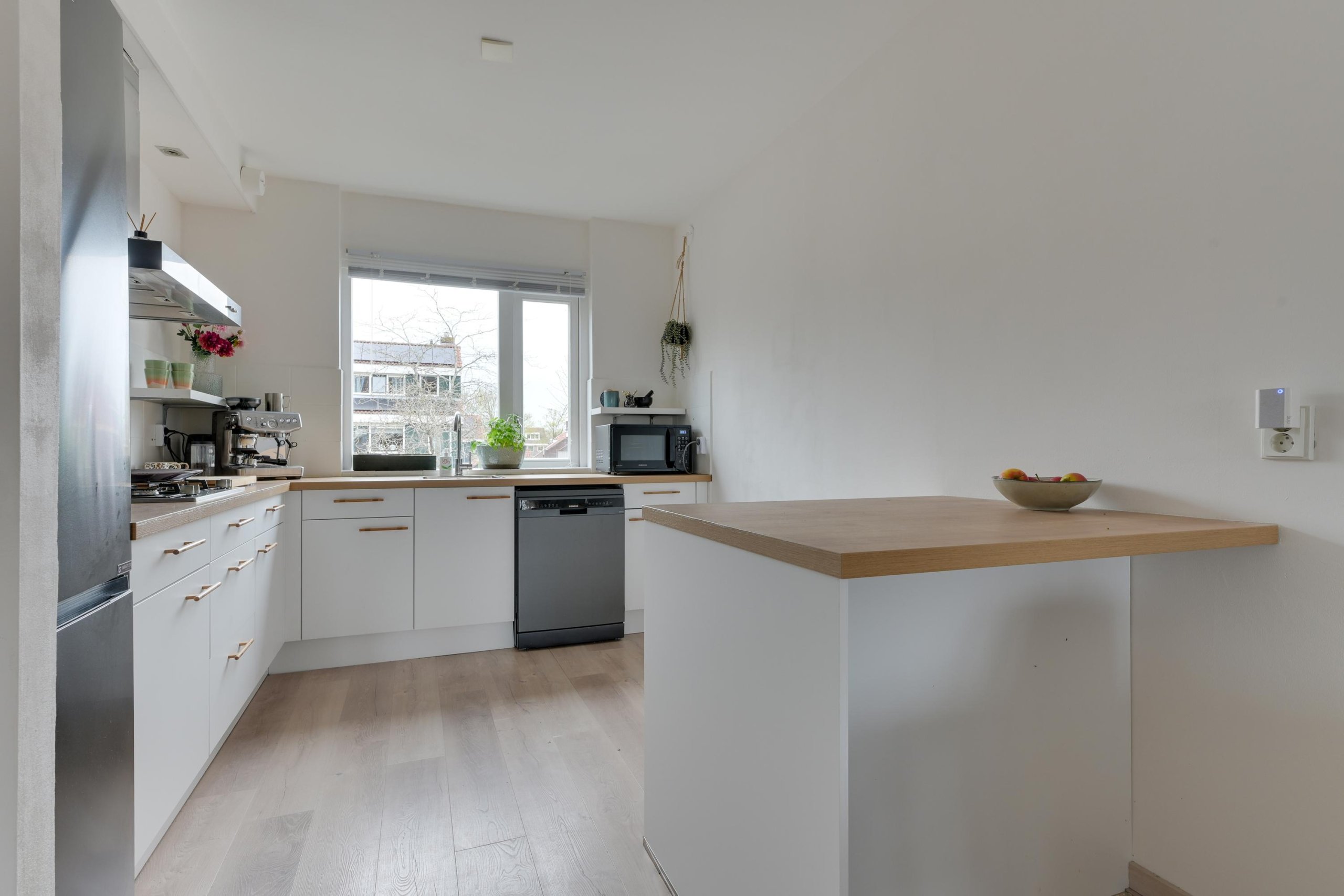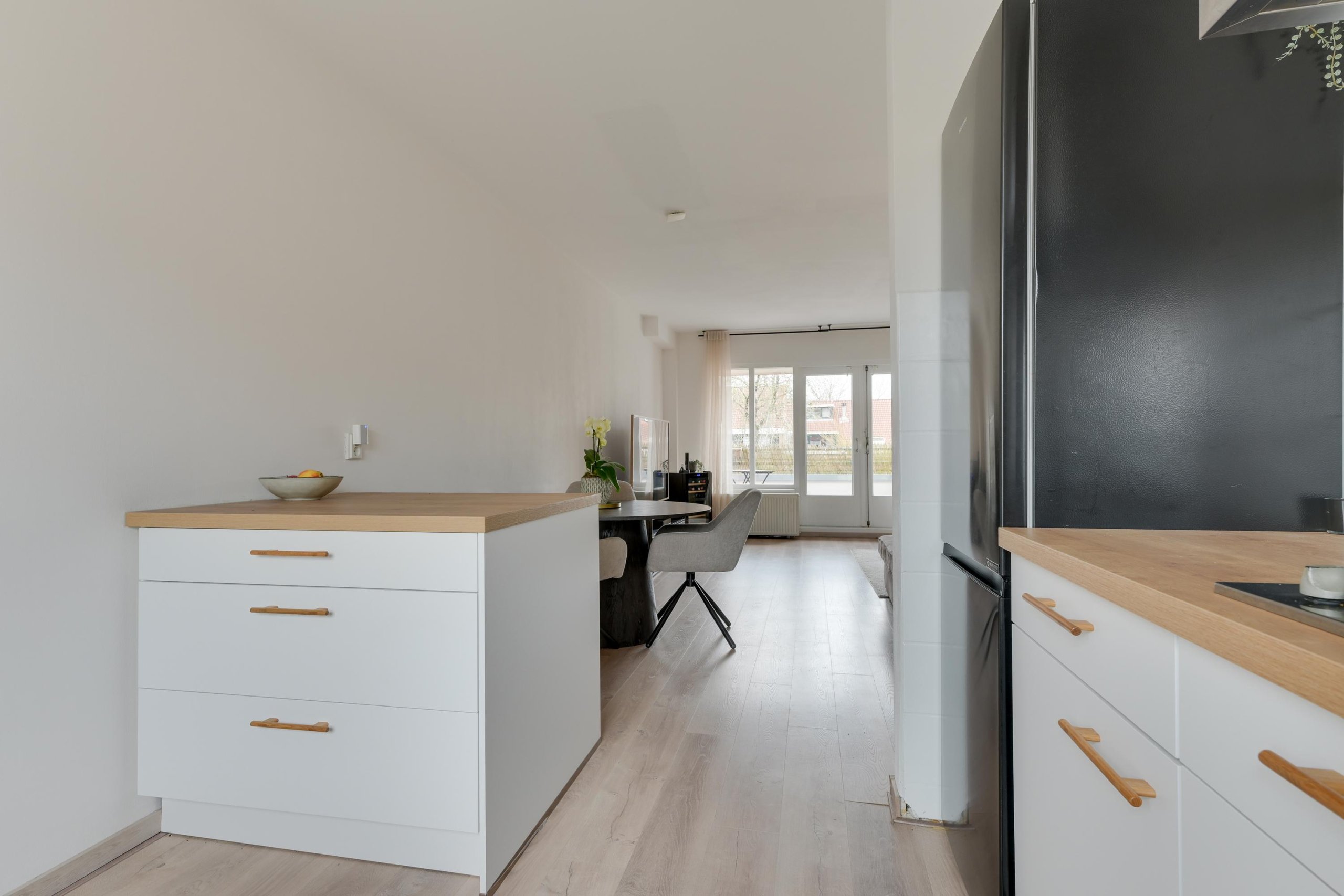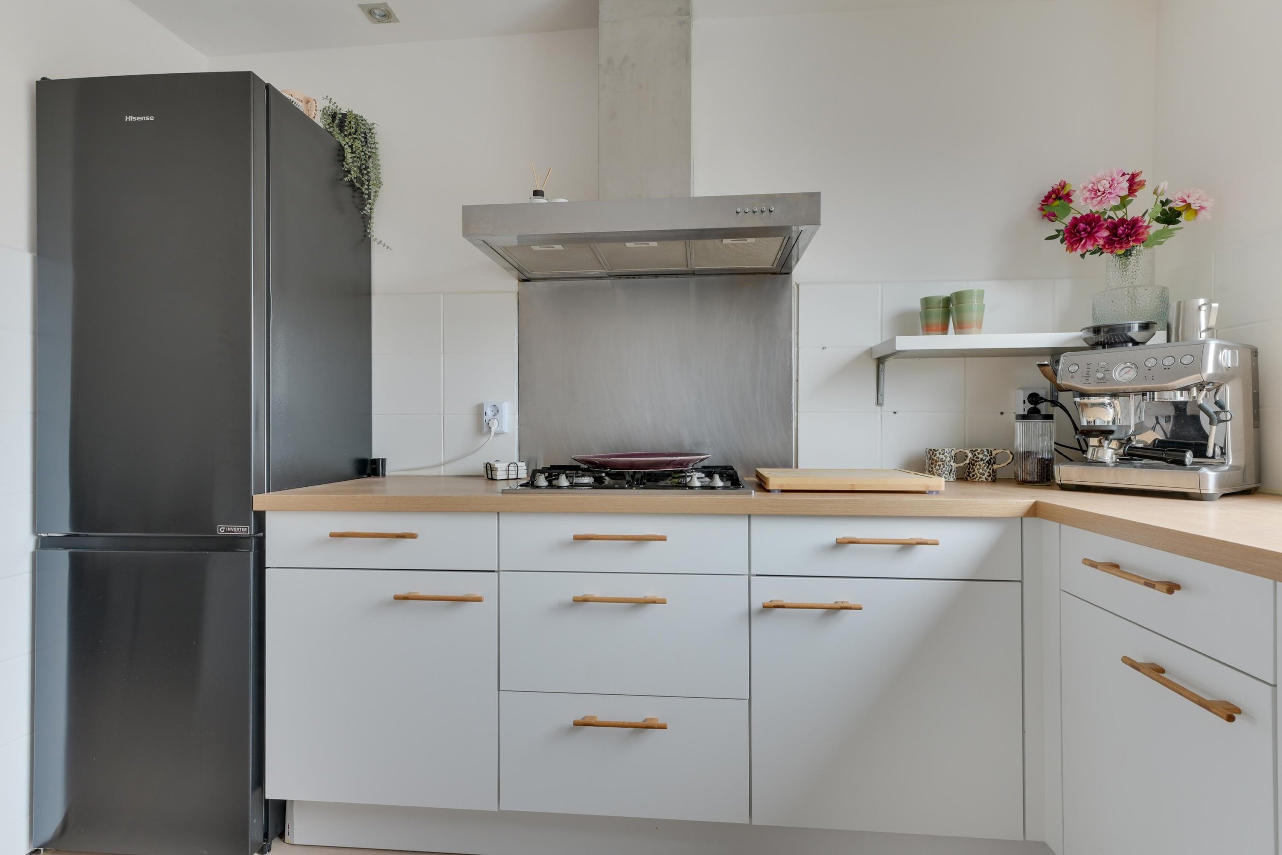 Aan de voorzijde bevindt zich de moderne open keuken in hoekopstelling (2025), voorzien van een gasfornuis, afzuigkap en volop bergruimte.