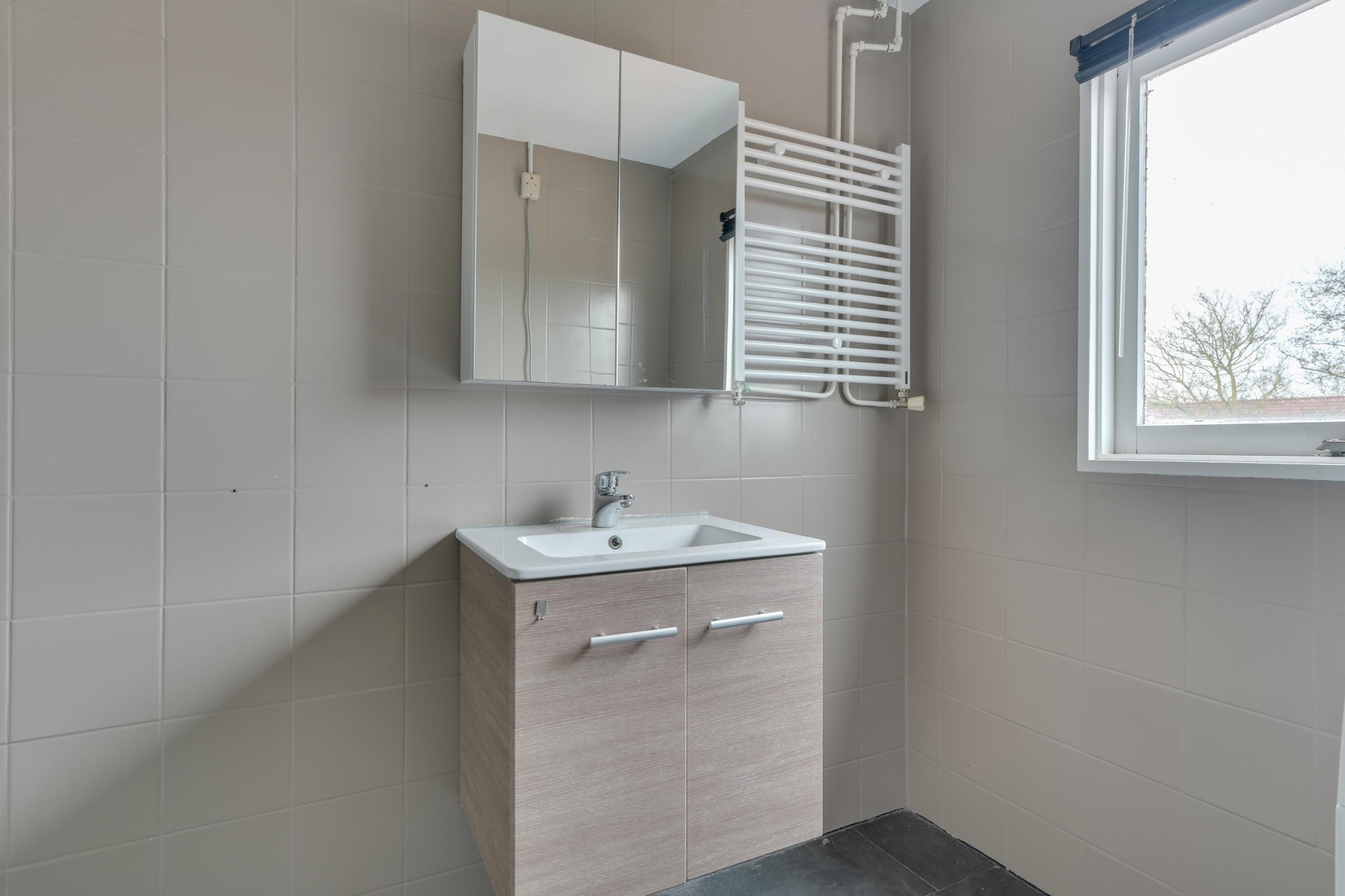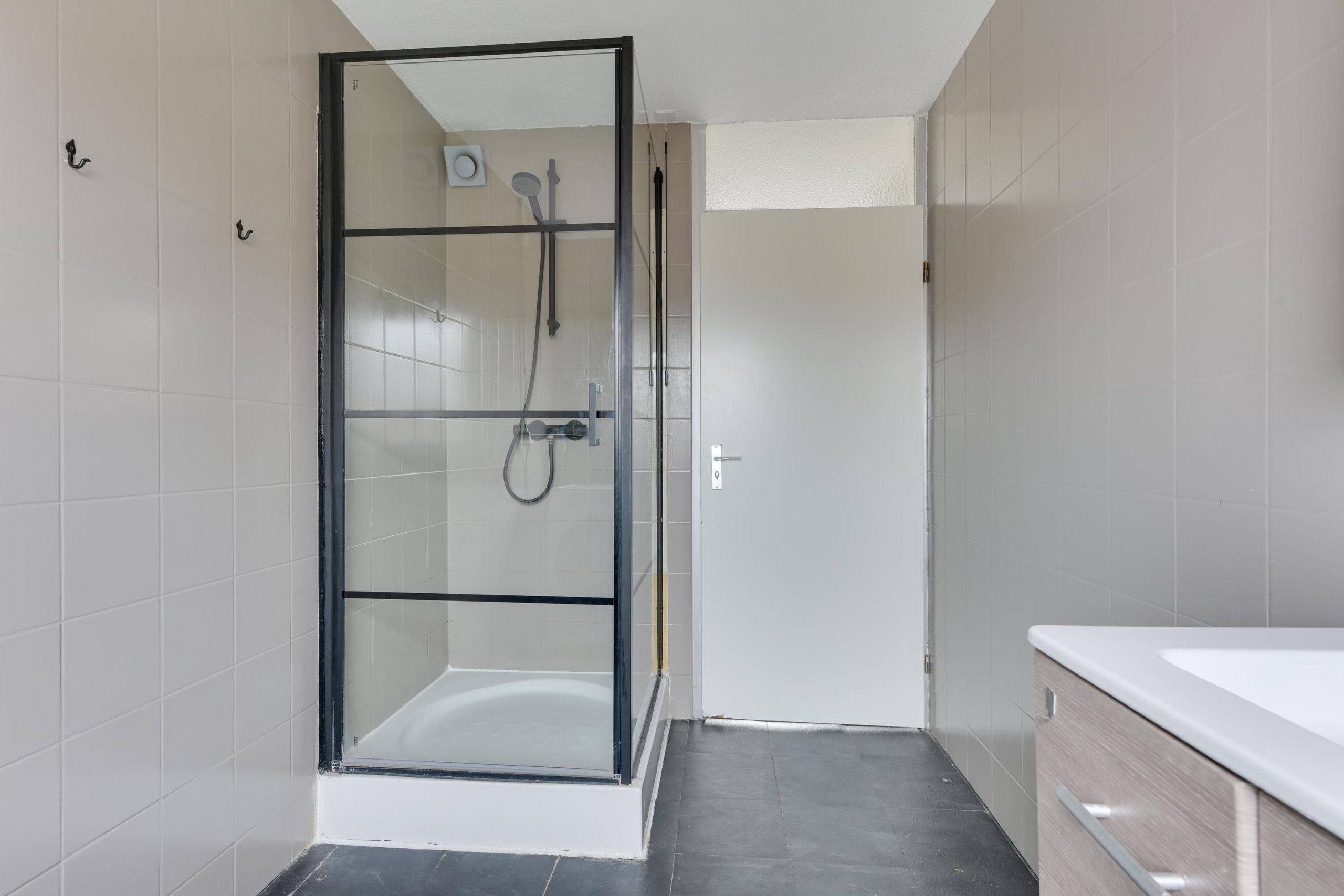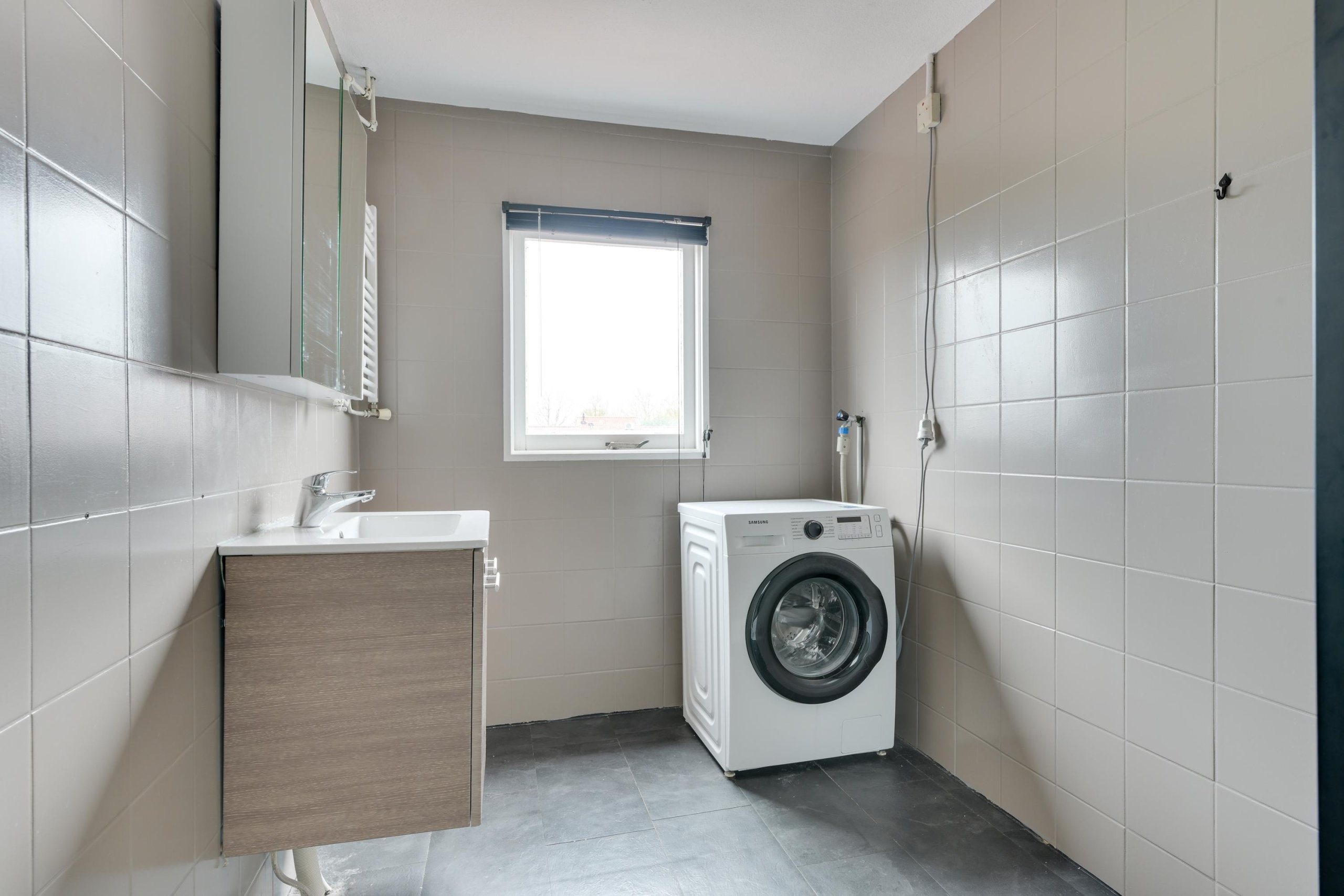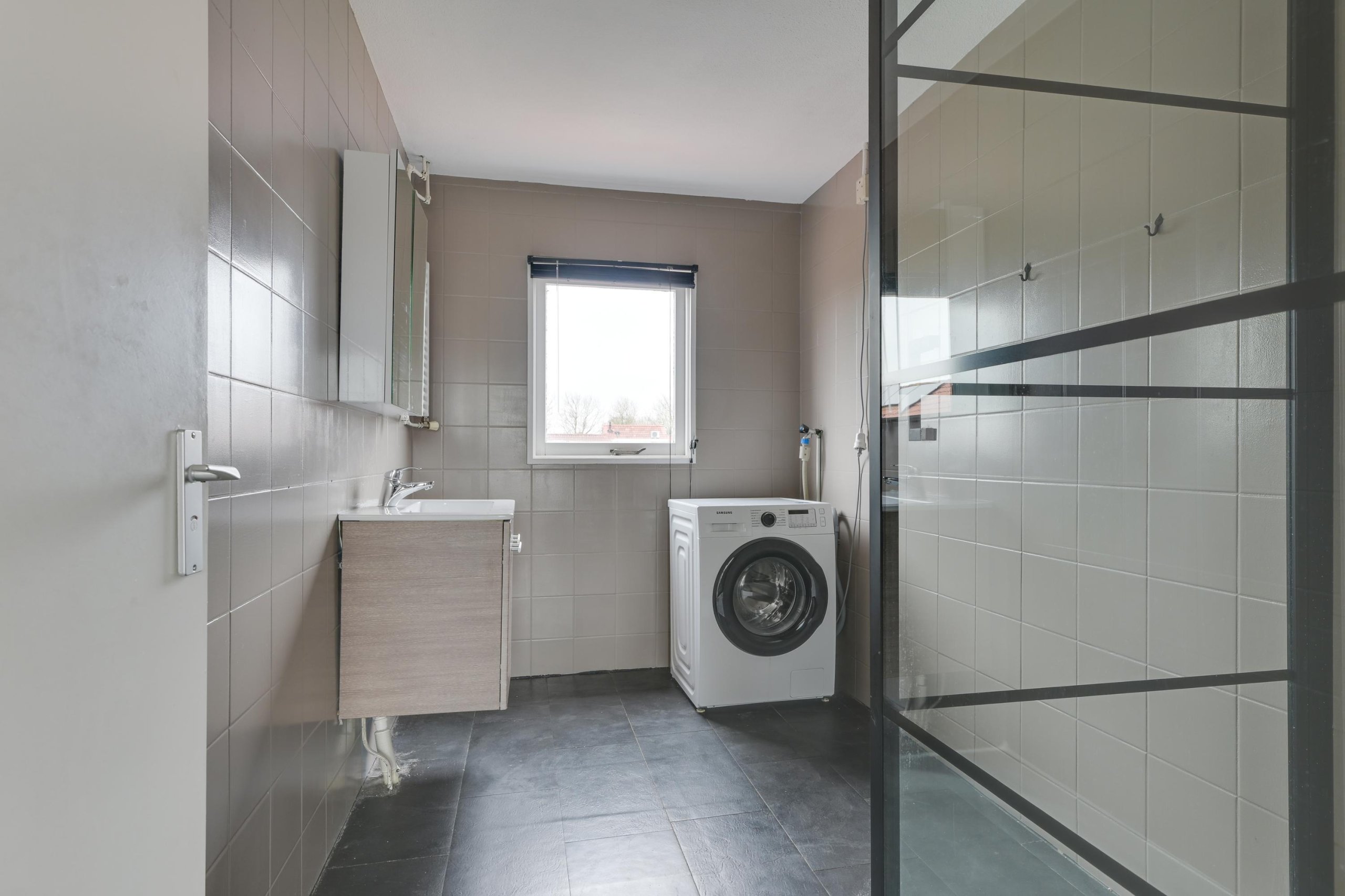 De badkamer is praktisch ingericht en voorzien van een douche, wastafelmeubel en aansluiting voor de wasmachine.