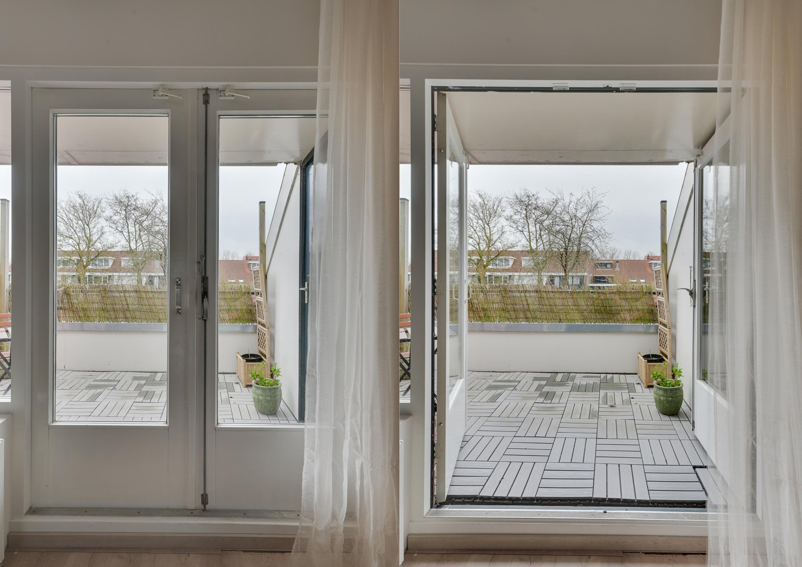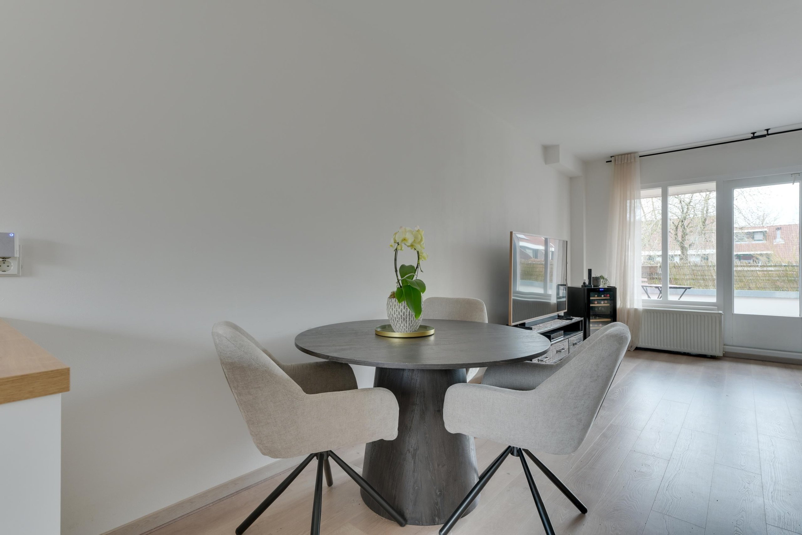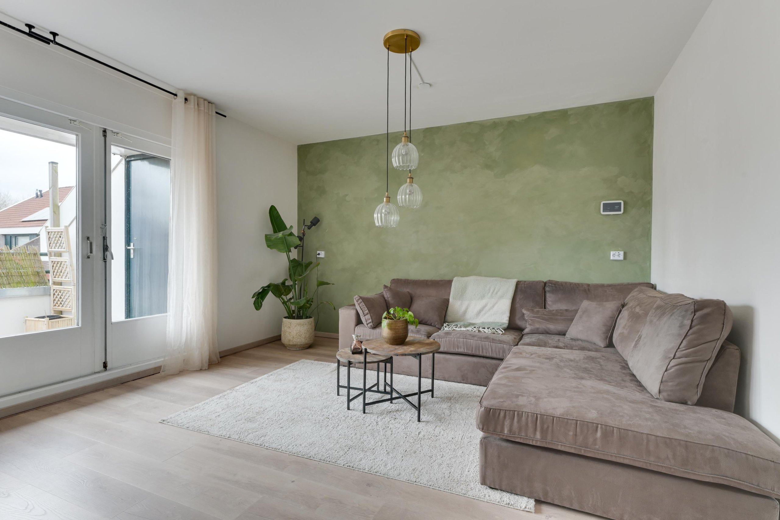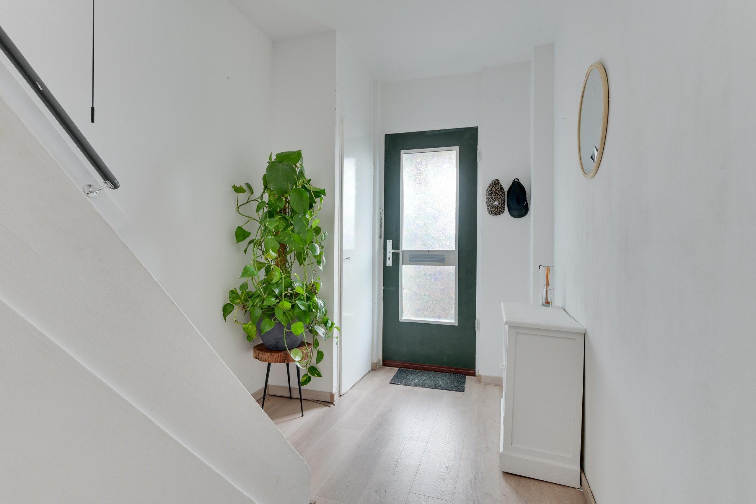 Entree, hal met meterkast, trapopgang, trapkast en toilet. Vanuit de hal heb je toegang tot de ruime en lichte woonkamer. Dankzij de openslaande deuren naar het balkon op het zuidoosten geniet je hier van veel lichtinval en een fijne buitenruimte op de ochtendzon.