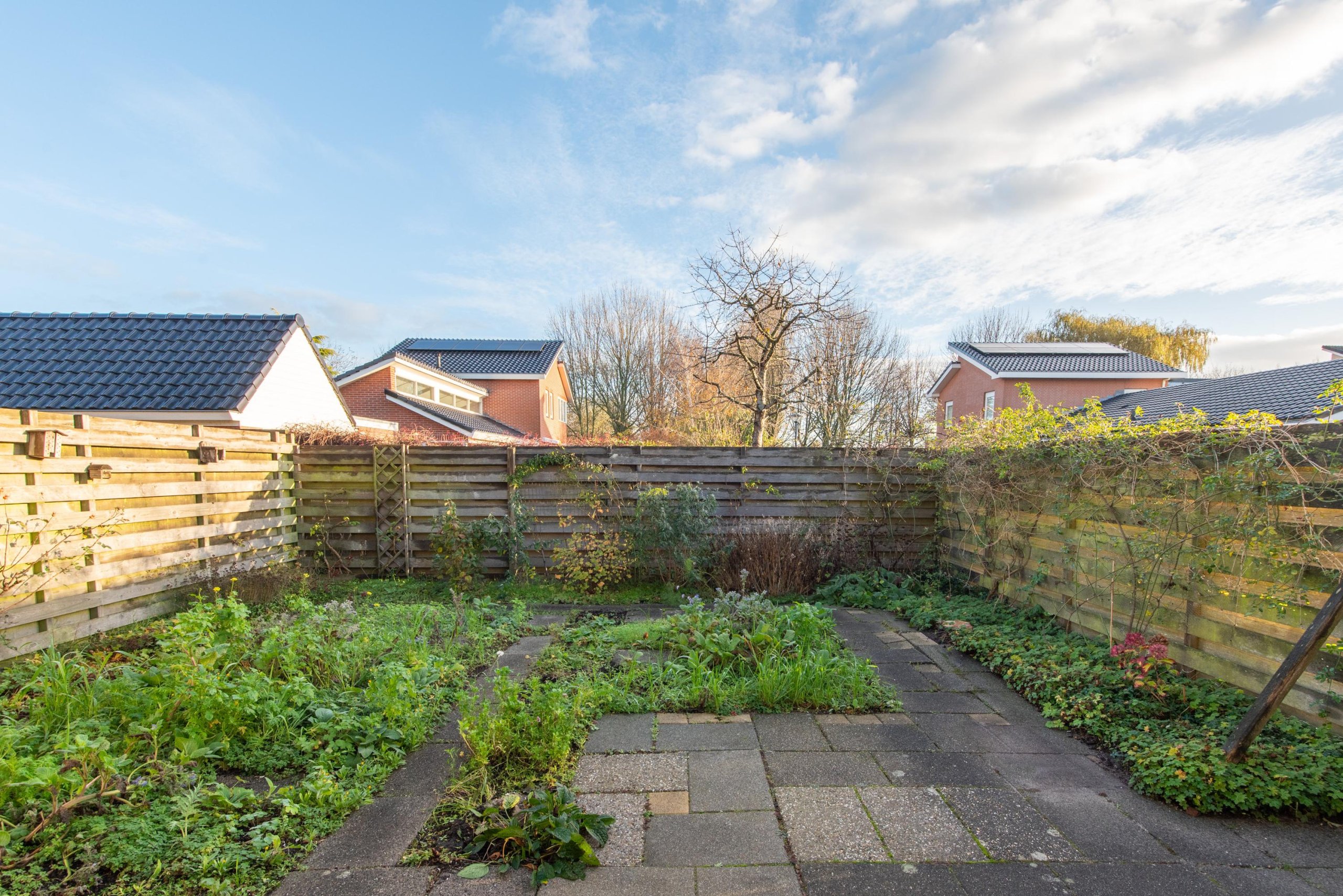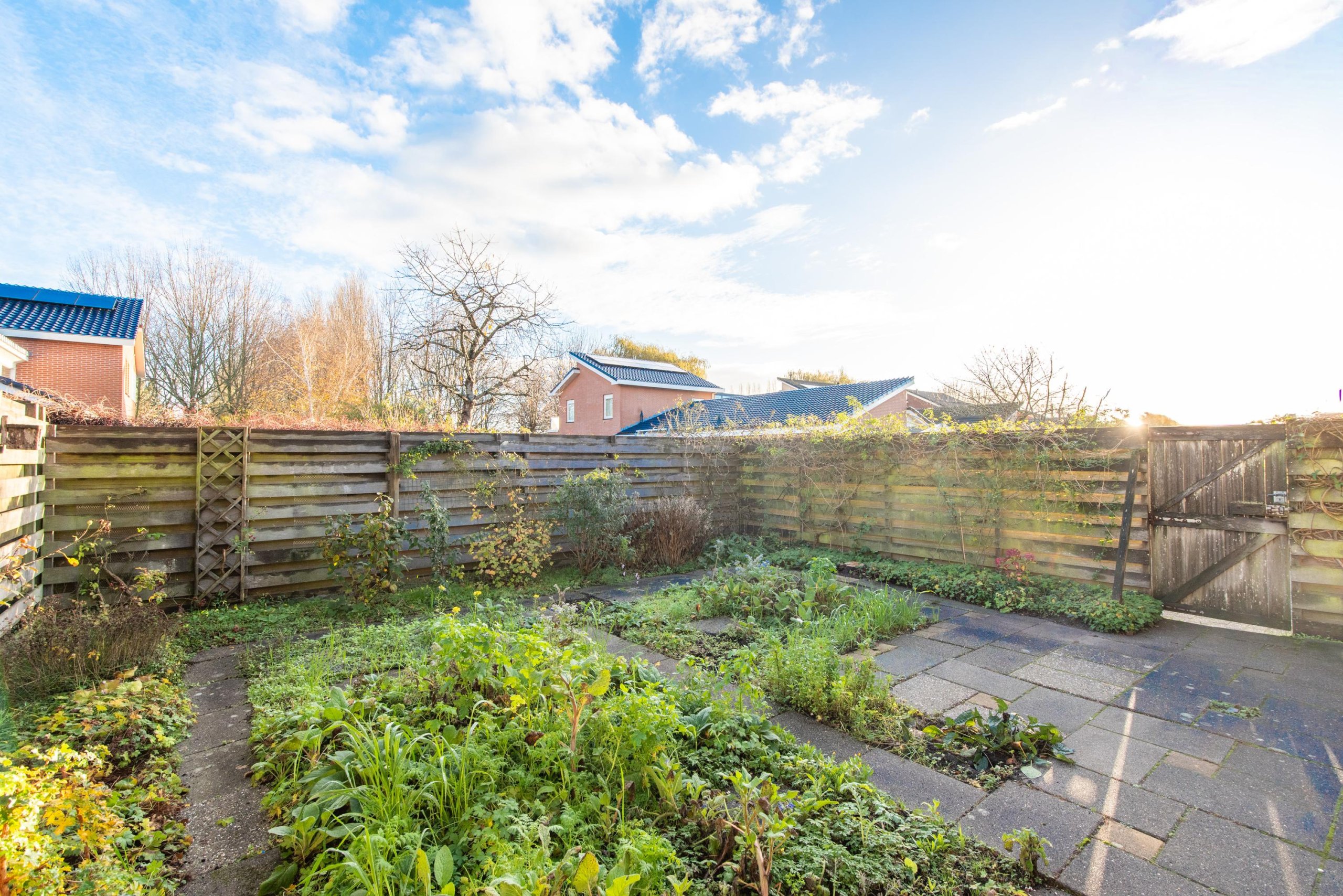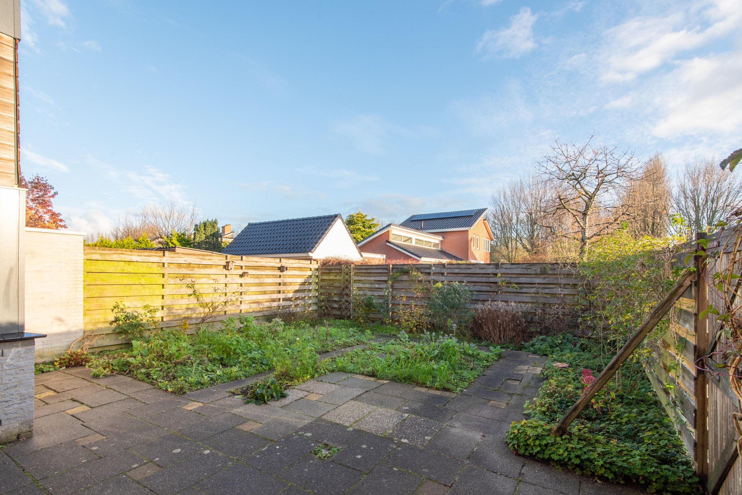 De achtertuin is gelegen op het noordoosten en biedt voldoende ruimte voor een fijne zitplek, speelgelegenheid en groen. De diepte van de tuin zorgt ervoor dat je hier van flink wat zonuren kunt genieten.
