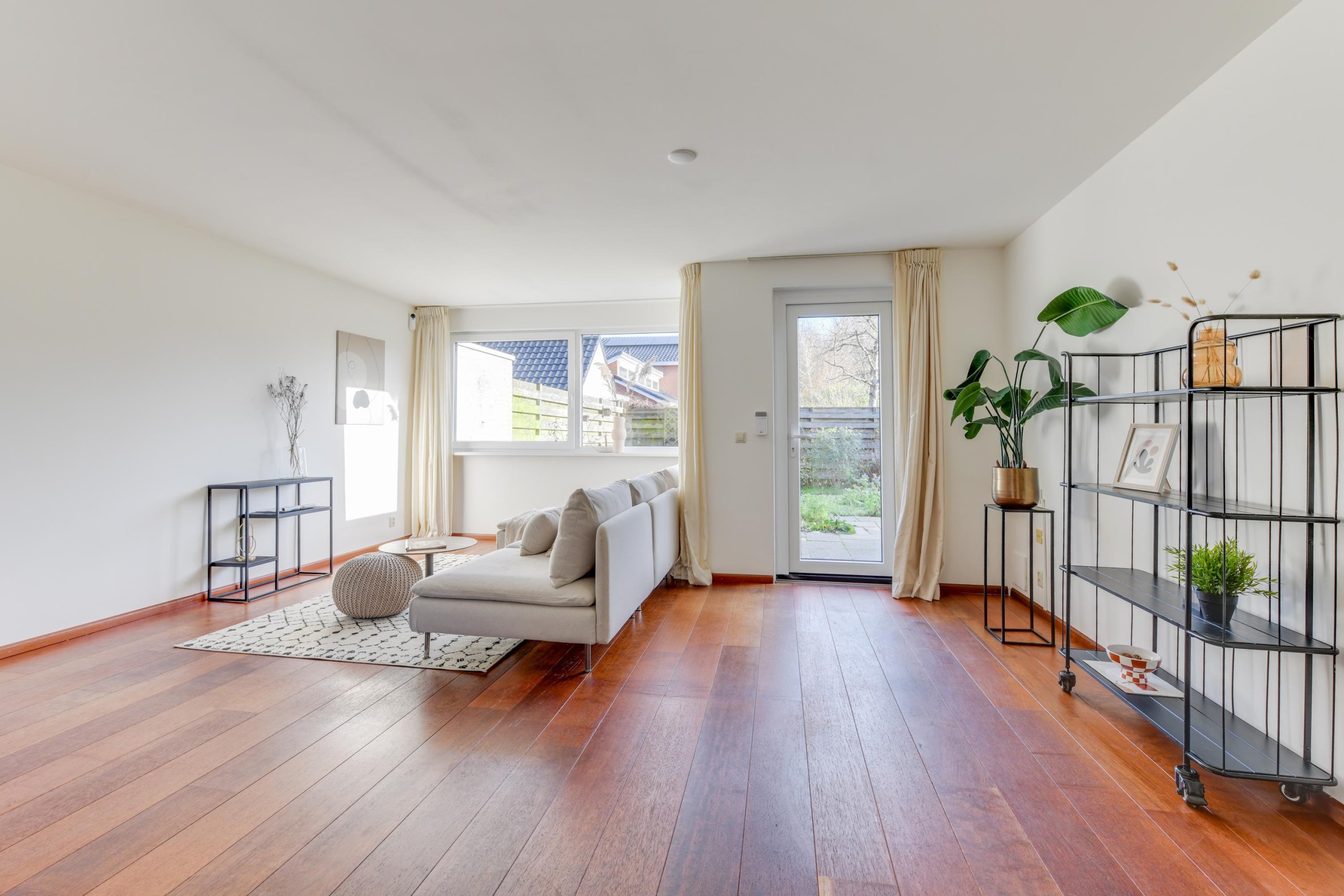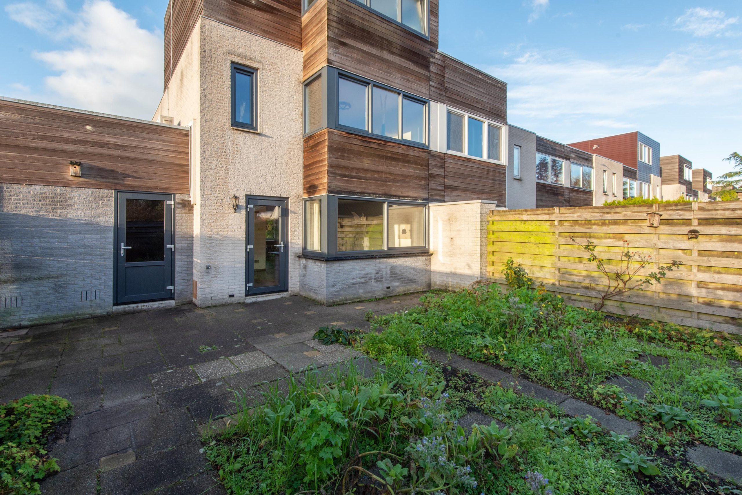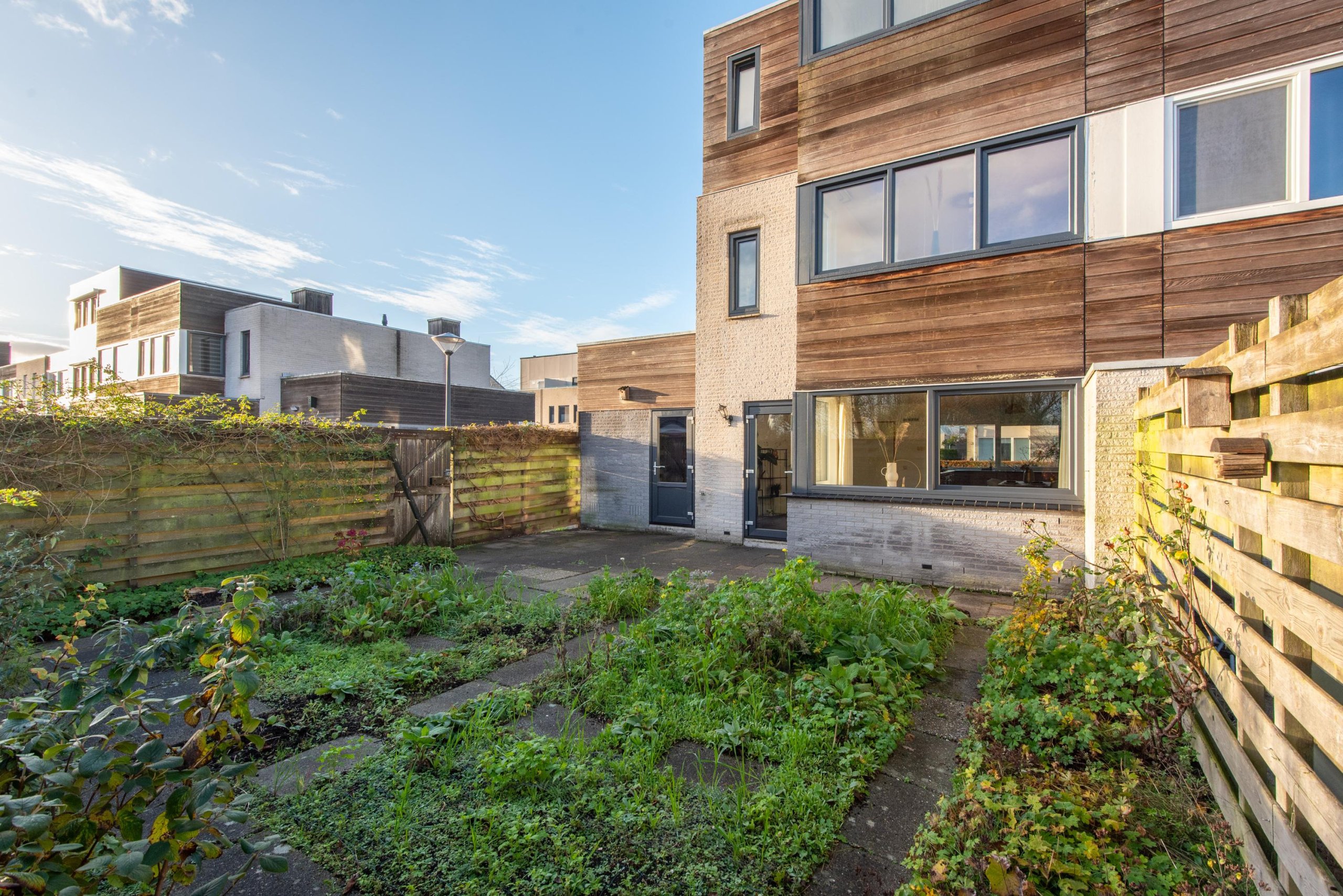 De achtertuin is gelegen op het noordoosten en biedt voldoende ruimte voor een fijne zitplek, speelgelegenheid en groen. De diepte van de tuin zorgt ervoor dat je hier van flink wat zonuren kunt genieten.