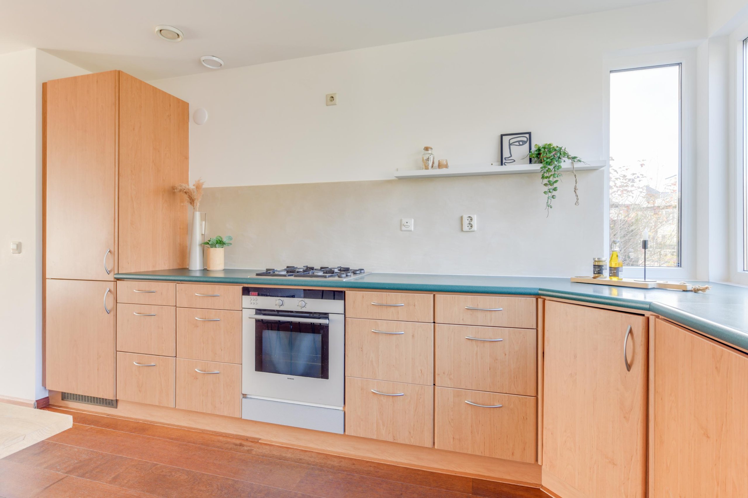 Via de entree bereik je de hal met meterkast en het toilet. De tuingerichte woonkamer is voorzien van een massief houten vloer en een kleine trapkast. De indeling biedt volop mogelijkheden voor een ruime zithoek én een grote eettafel. De keuken bevindt zich aan de voorzijde en is uitgerust met de nodige apparatuur, met direct zicht op de straat.
