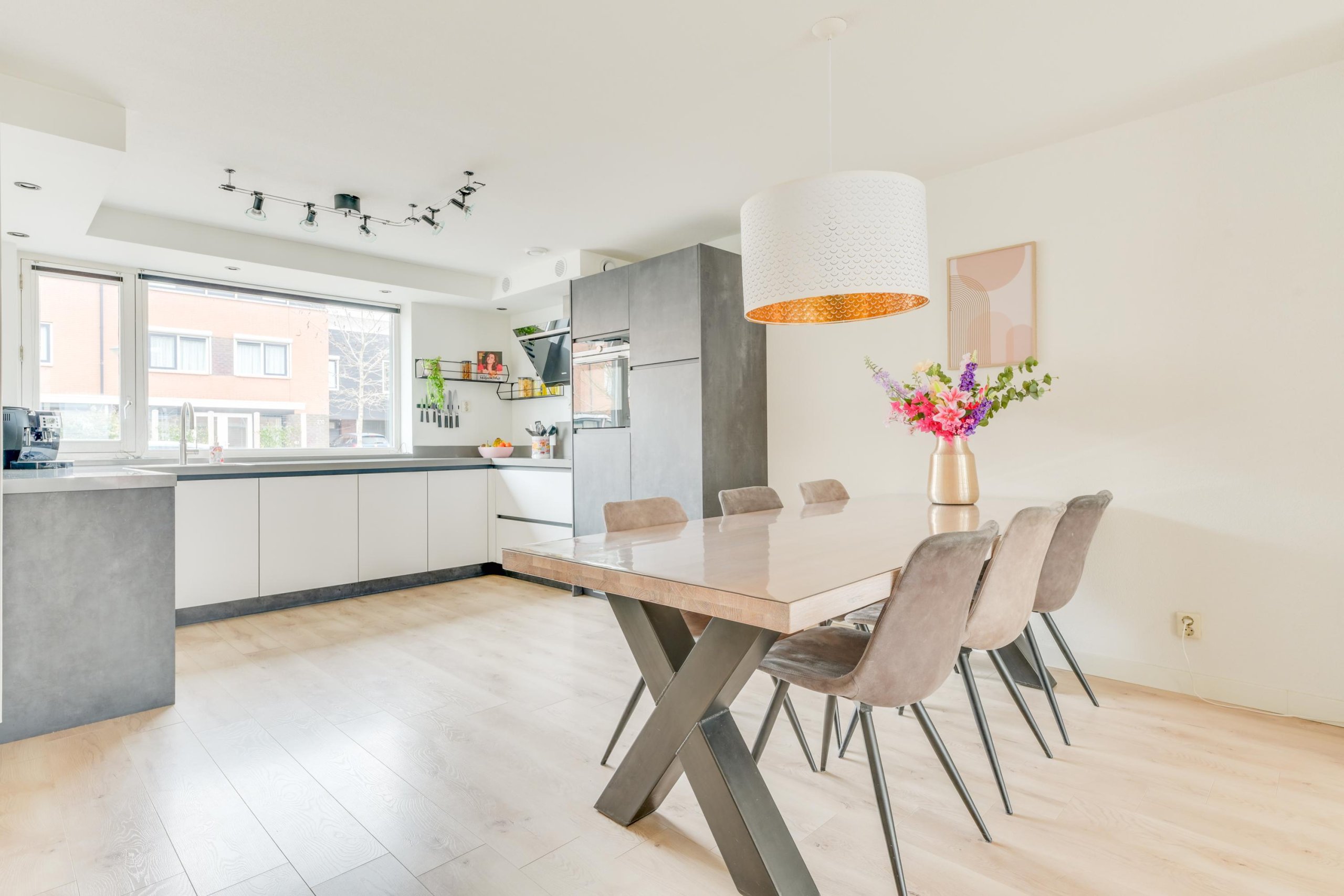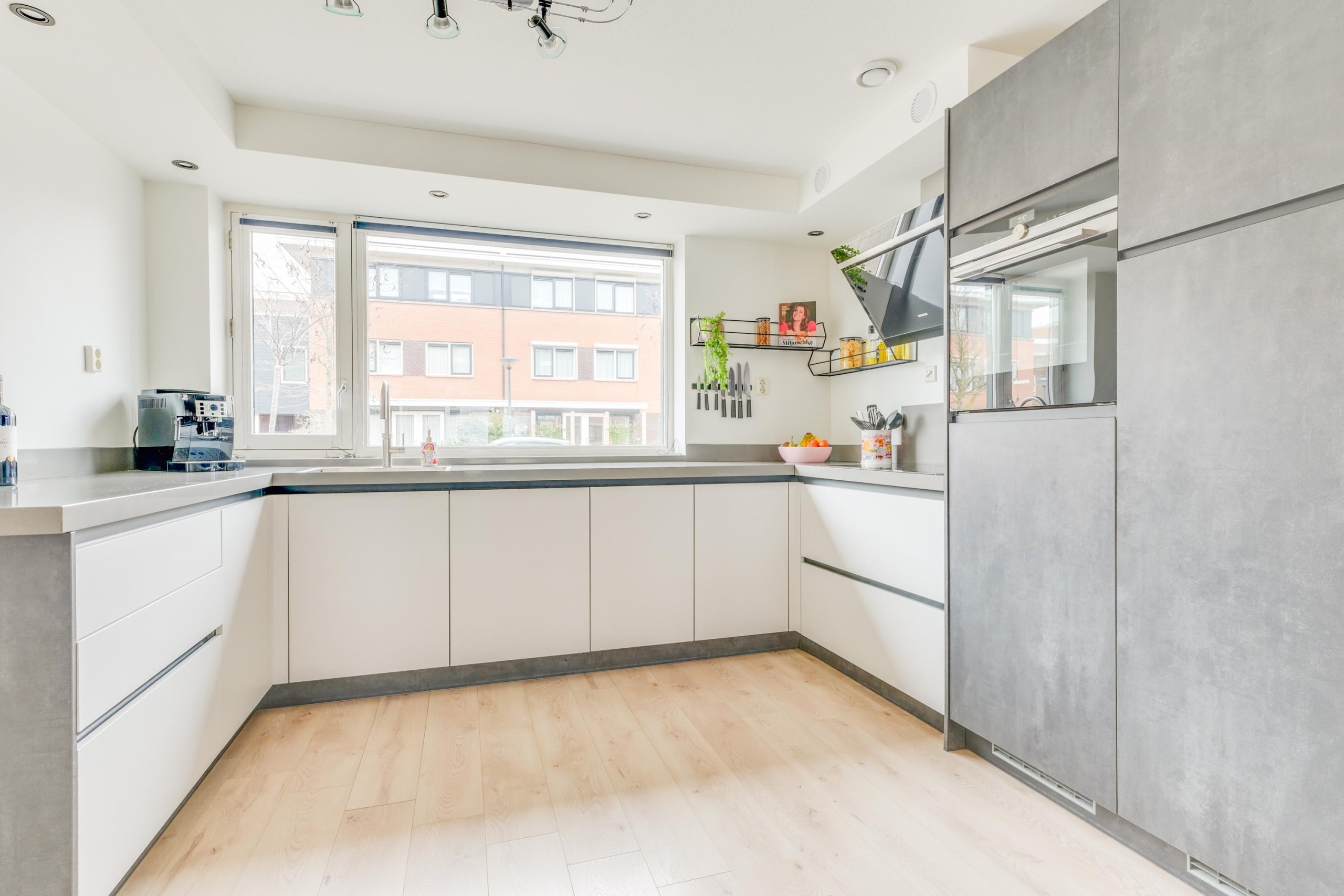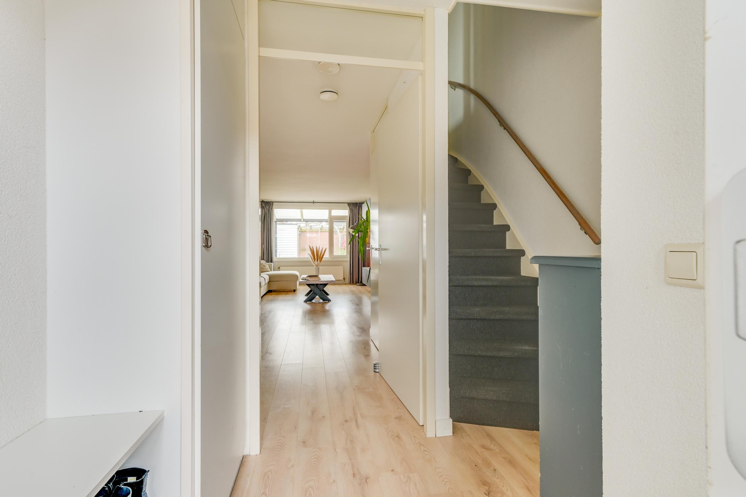 Je komt binnen in de hal met meterkast en een modern afgewerkt toilet. Vanuit hier heb je toegang tot de keuken, de woonkamer en de trapopgang. De begane grond is afgewerkt met een nette en lichte laminaatvloer en gestucte wanden en plafond. De keuken aan de voorzijde is geplaatst in 2020 en uitgevoerd in een moderne en tijdloze stijl. Deze is voorzien van een composiet werkblad, Quooker, inductiekookplaat met 5 zones (waarvan één flexibel inzetbaar voor grillplaat of als twee zones), afzuigkap met plasmafilter, vaatwasser, vriezer en koelkast met HyperFresh 0-gradenzone. Daarnaast zijn er een oven, combi-oven met stoomfunctie en een handige trapkast voor extra bergruimte. De woonkamer is een echte eyecatcher: uitzonderlijk breed en uitgebouwd, waardoor er een zee aan ruimte ontstaat. Dankzij de grote raampartijen en de zuidwestelijke ligging is de lichtinval uitstekend en is dit een heerlijke plek. Via de woonkamer loop je zo de zonnige achtertuin in.