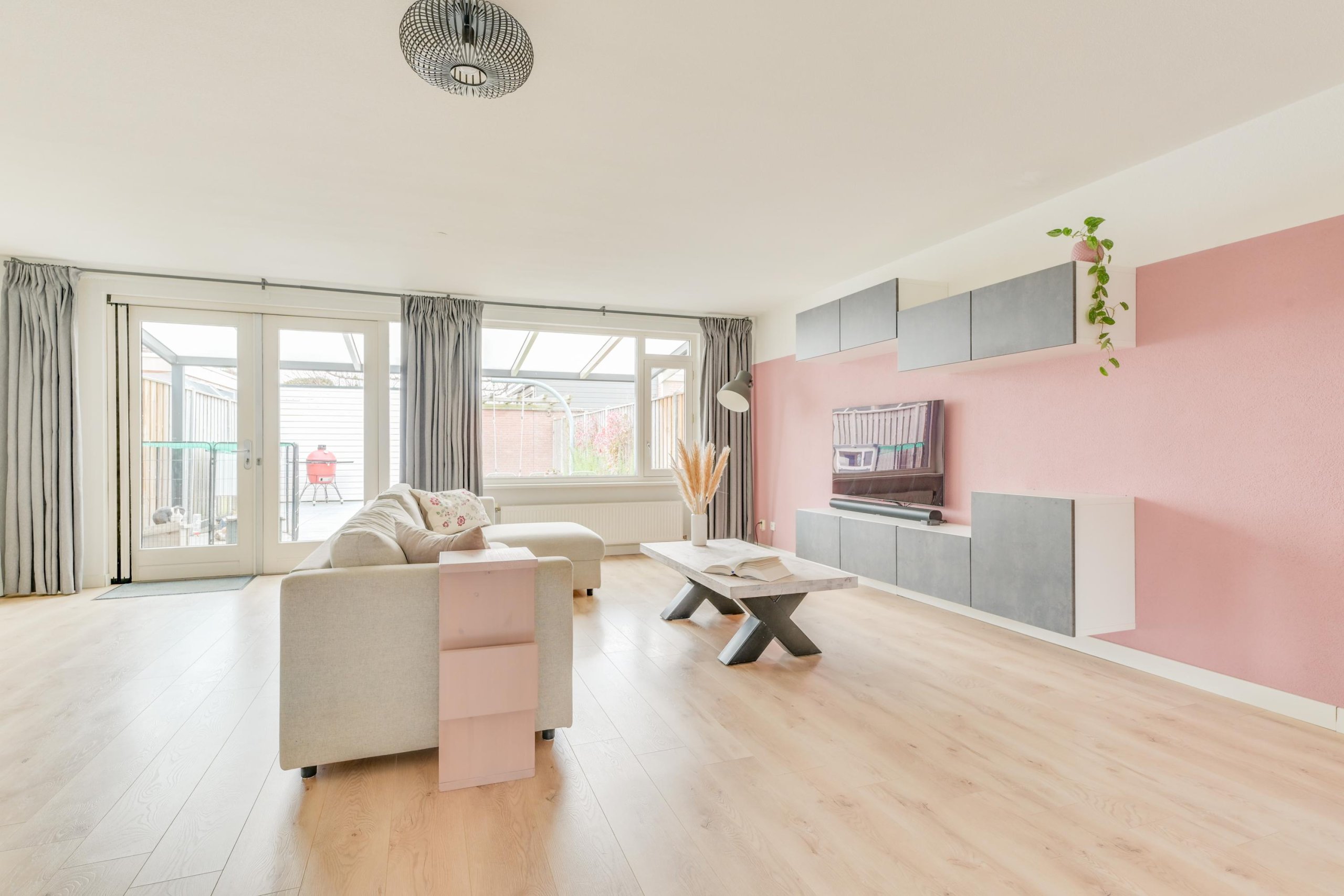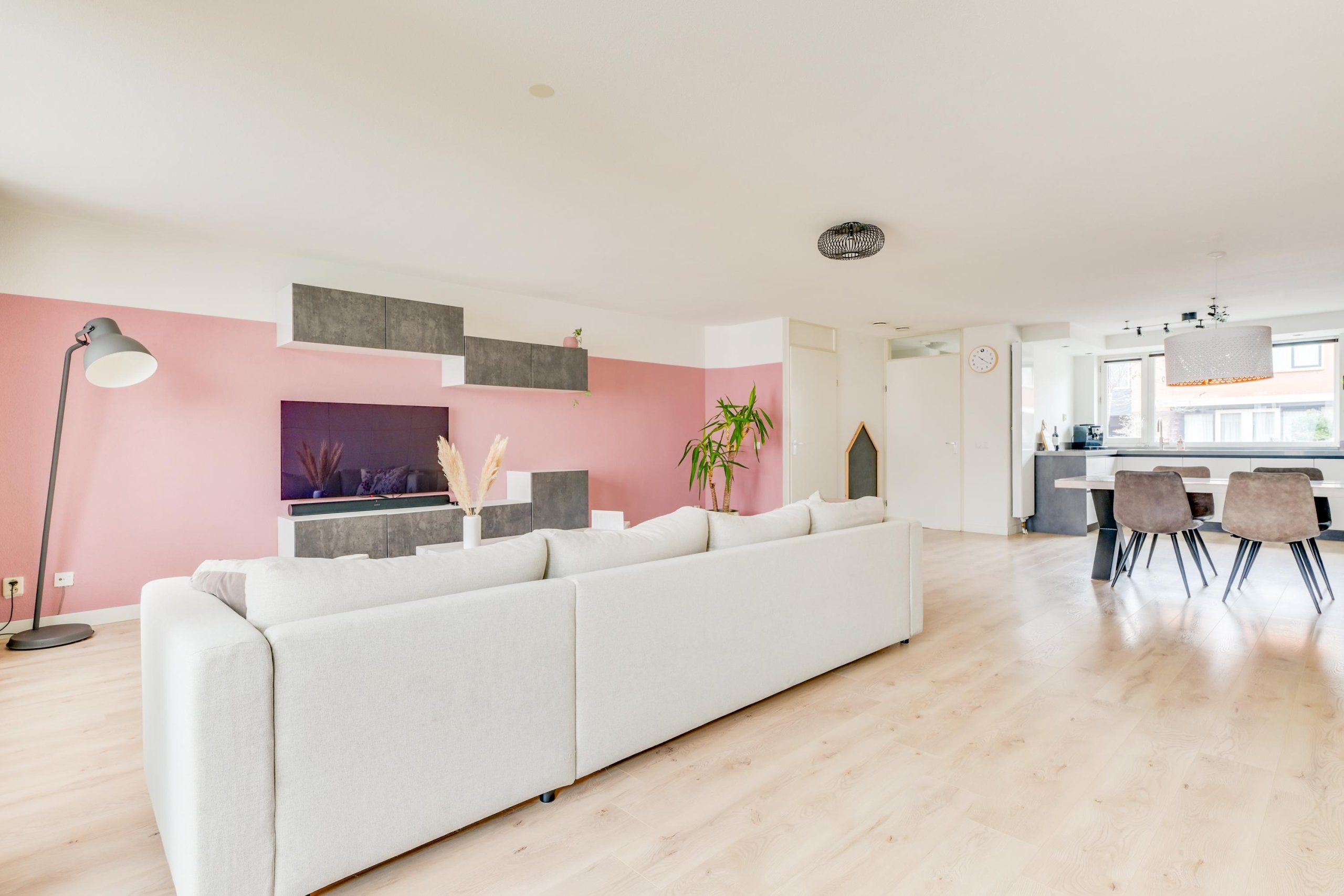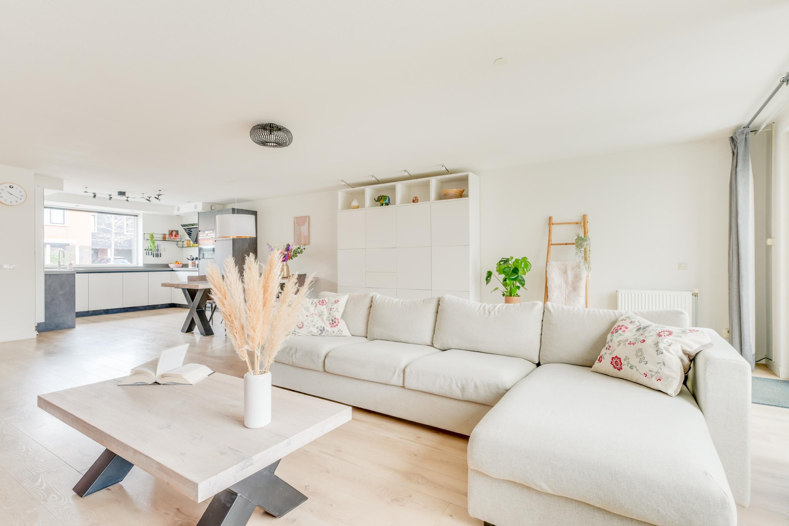 Je komt binnen in de hal met meterkast en een modern afgewerkt toilet. Vanuit hier heb je toegang tot de keuken, de woonkamer en de trapopgang. De begane grond is afgewerkt met een nette en lichte laminaatvloer en gestucte wanden en plafond. De keuken aan de voorzijde is geplaatst in 2020 en uitgevoerd in een moderne en tijdloze stijl. Deze is voorzien van een composiet werkblad, Quooker, inductiekookplaat met 5 zones (waarvan één flexibel inzetbaar voor grillplaat of als twee zones), afzuigkap met plasmafilter, vaatwasser, vriezer en koelkast met HyperFresh 0-gradenzone. Daarnaast zijn er een oven, combi-oven met stoomfunctie en een handige trapkast voor extra bergruimte. De woonkamer is een echte eyecatcher: uitzonderlijk breed en uitgebouwd, waardoor er een zee aan ruimte ontstaat. Dankzij de grote raampartijen en de zuidwestelijke ligging is de lichtinval uitstekend en is dit een heerlijke plek. Via de woonkamer loop je zo de zonnige achtertuin in.