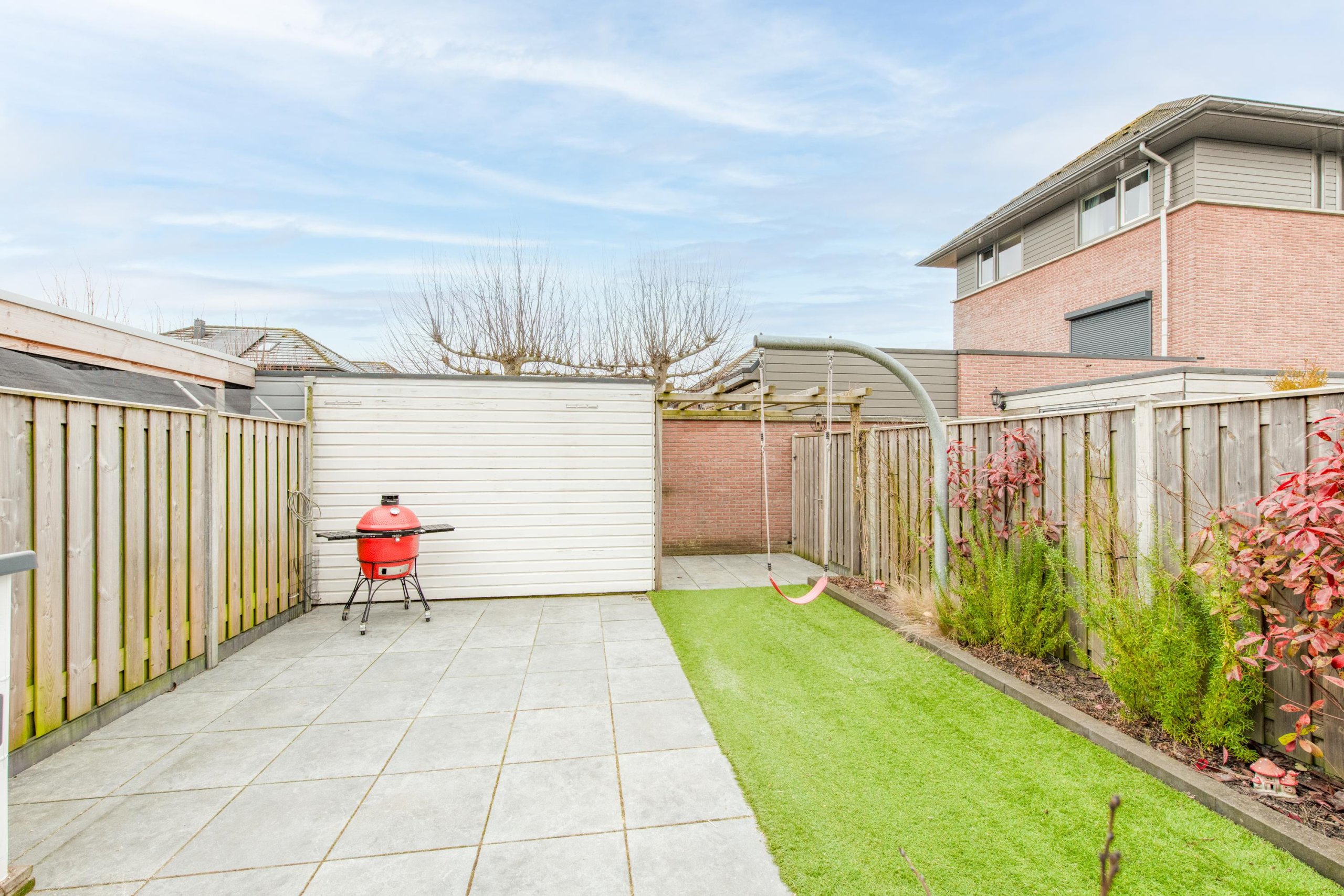 De tuin ligt op het zuidwesten, is in 2022 vernieuwd en beschikt over strak gelegde en gevoegde tegels, een veranda en een houten berging met elektra. De tuin is via achterom bereikbaar.