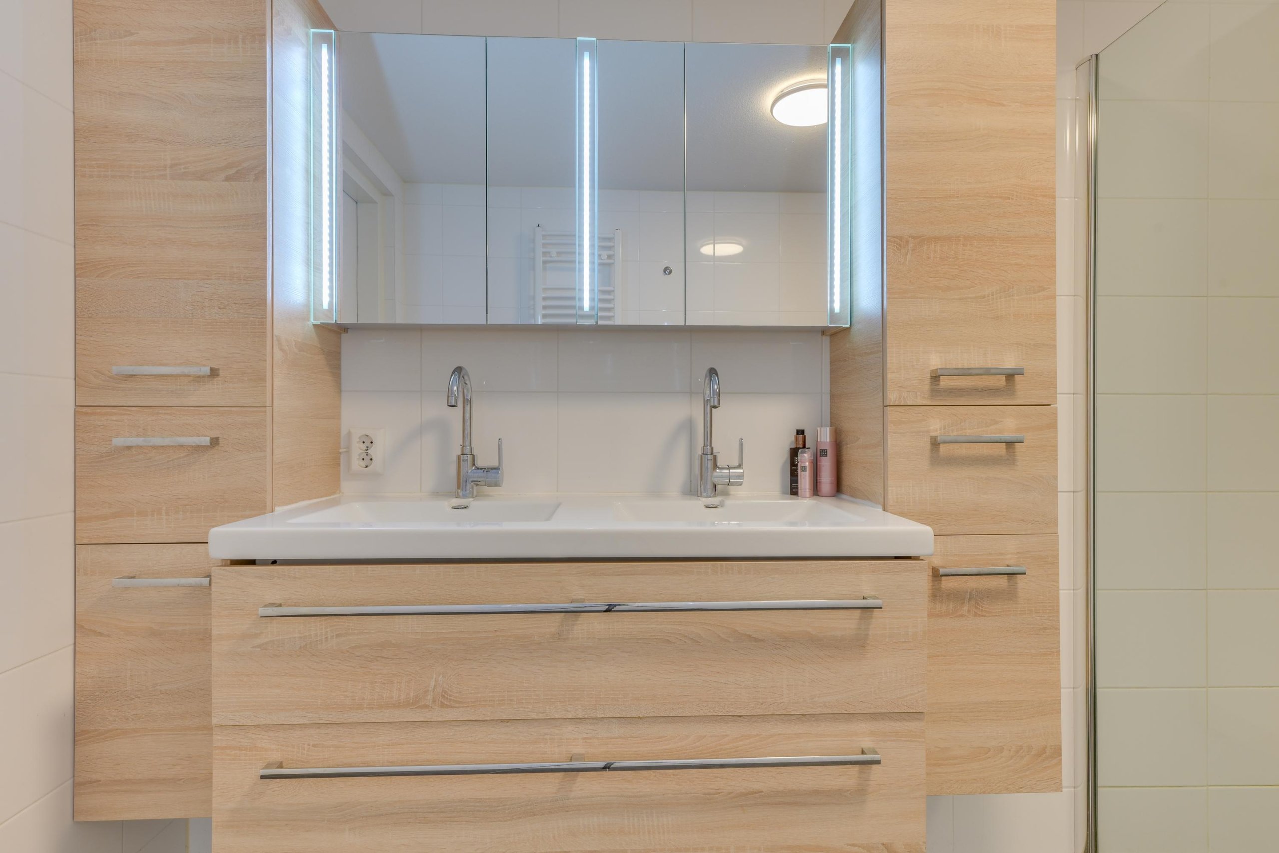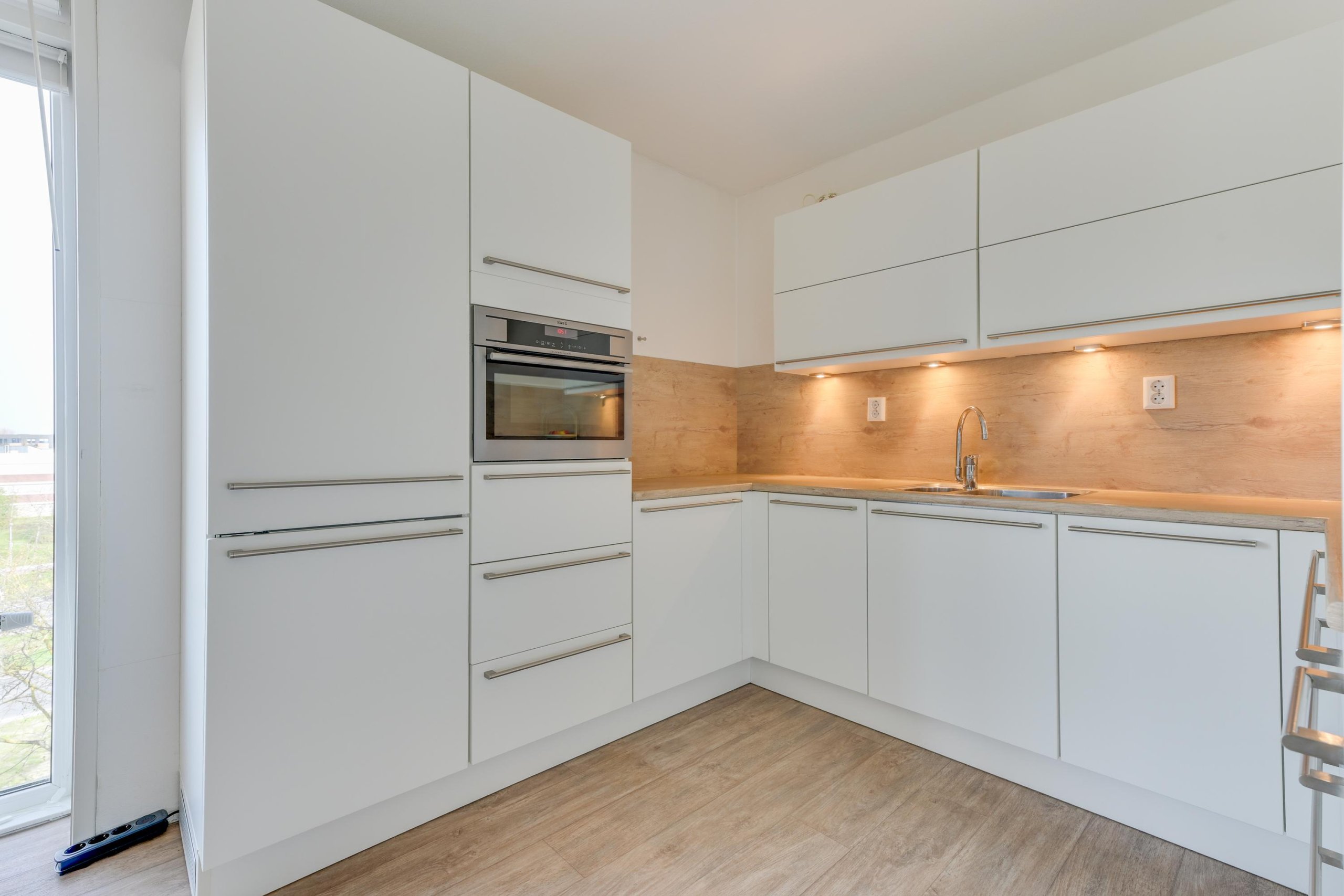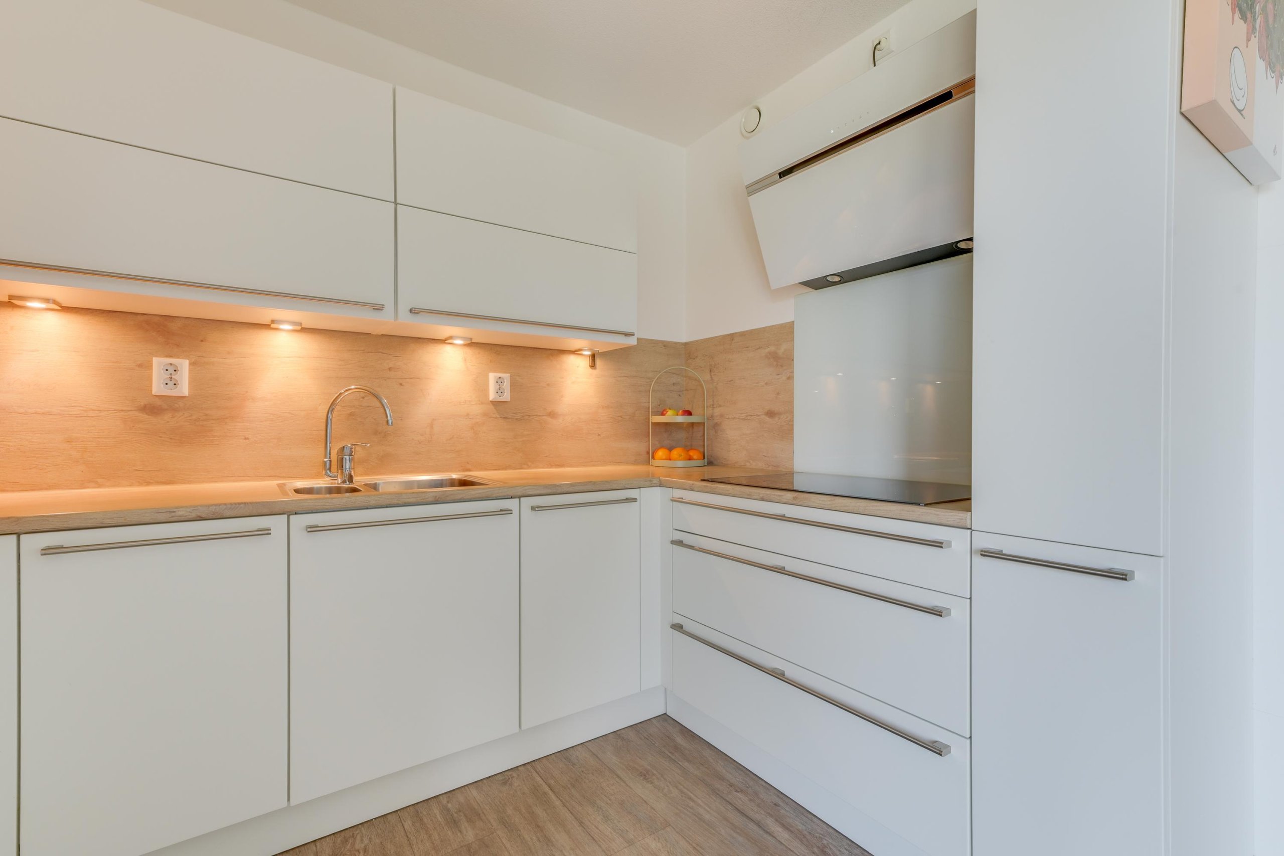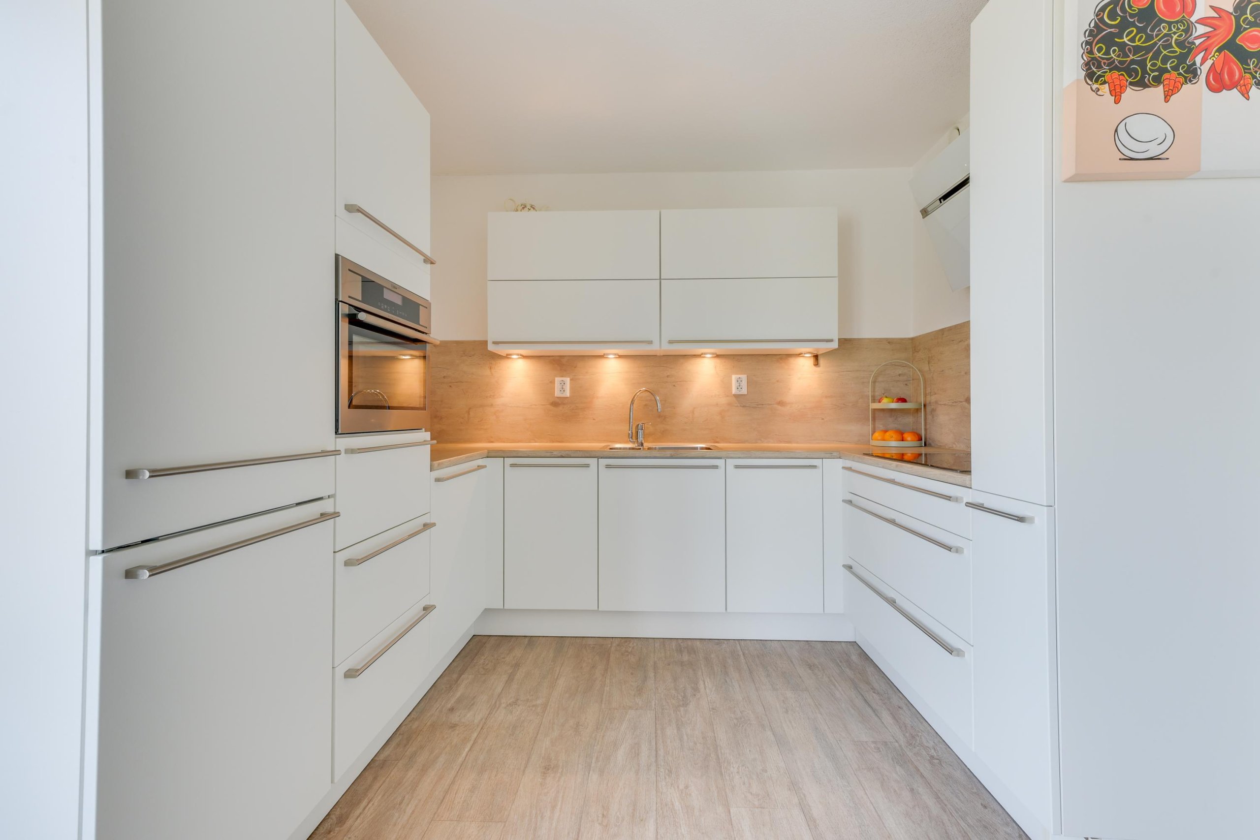De keukenruimte is prettig ingedeeld en beschikt over grote raampartijen, een Frans balkon en een praktische provisiekast. De open keuken in U-opstelling is modern en compleet uitgerust met diverse inbouwapparatuur, waaronder een koelkast/vriezer, combi-oven, vaatwasser, inductiekookplaat en een moderne afzuigkap.
