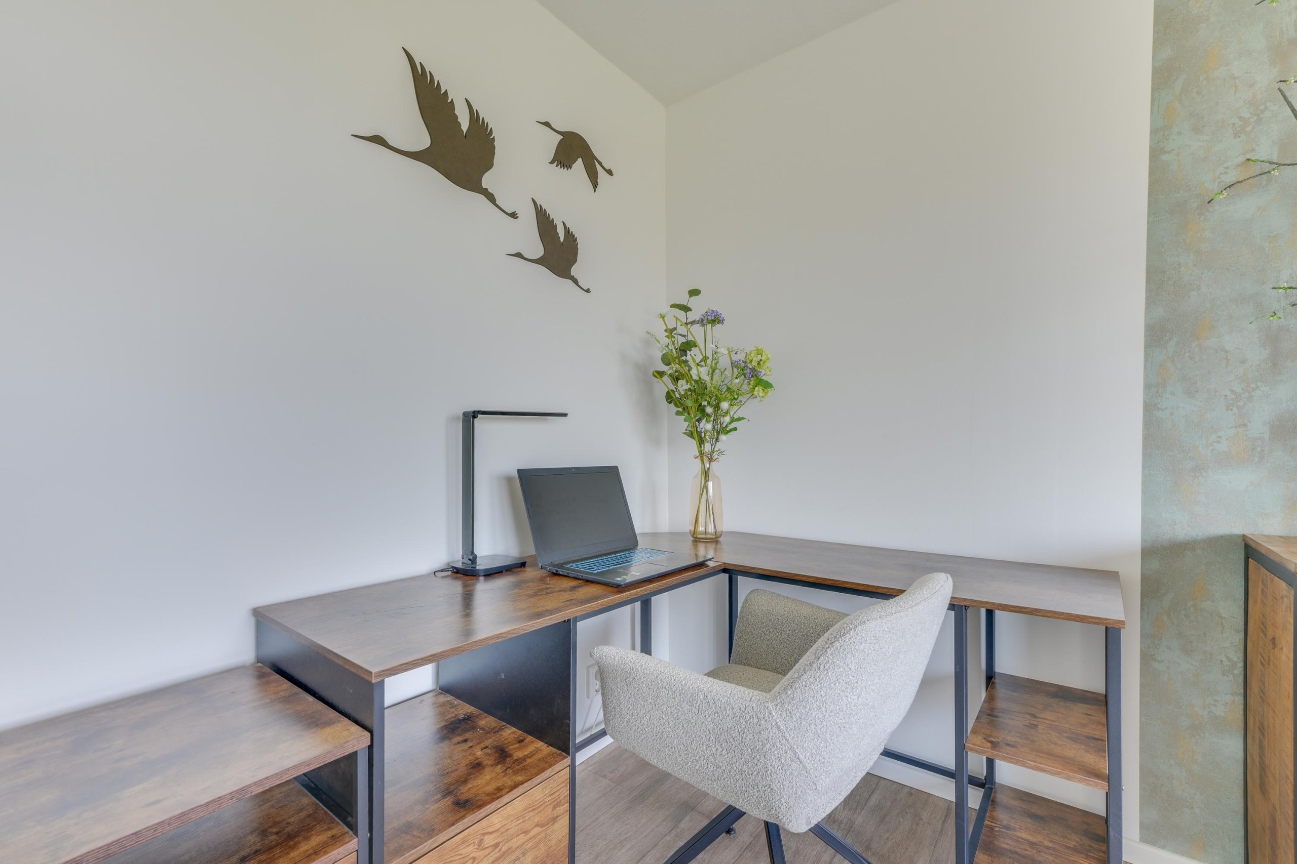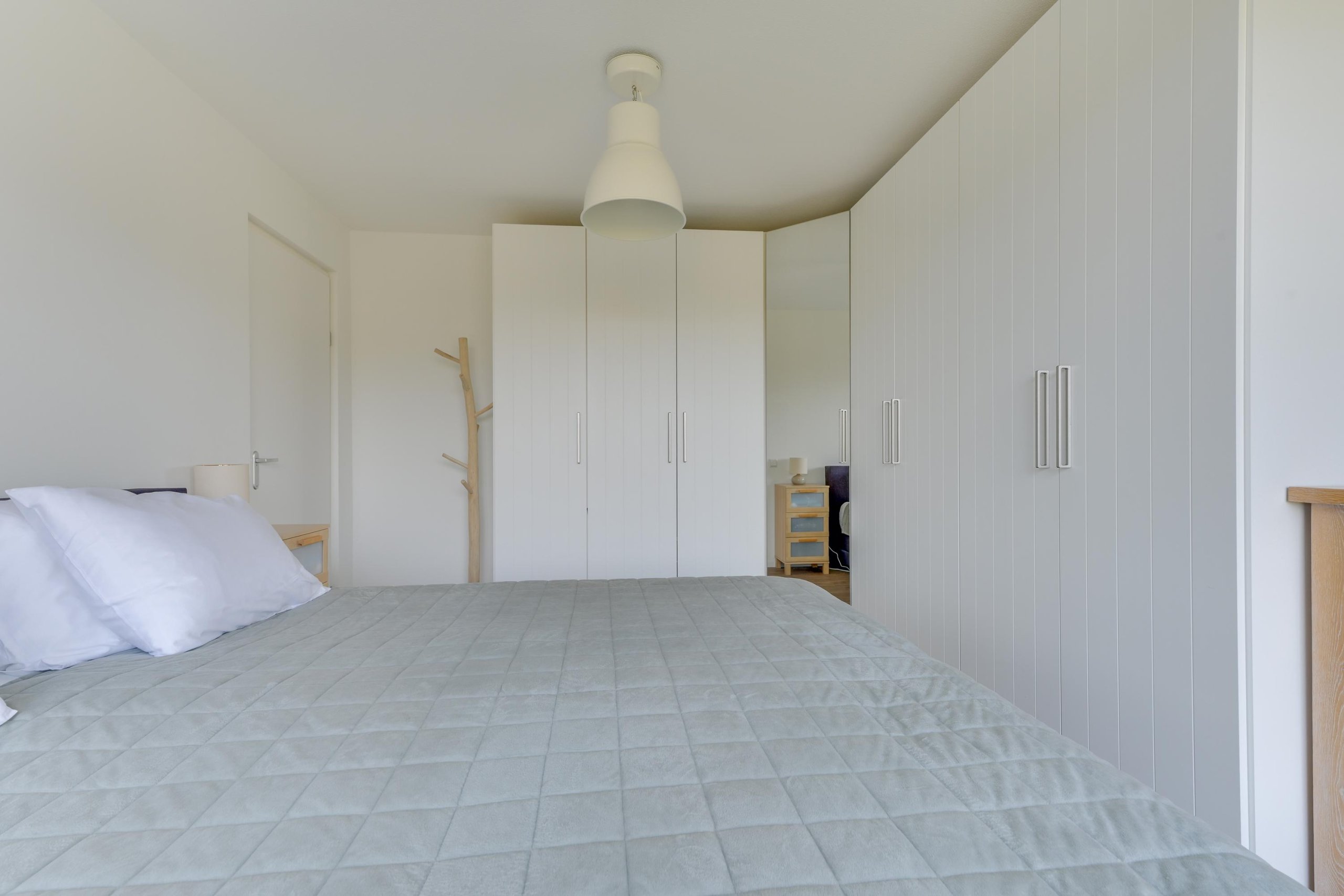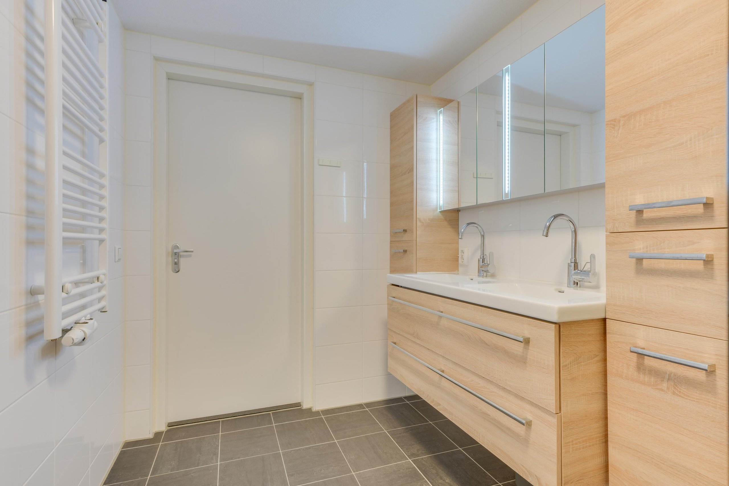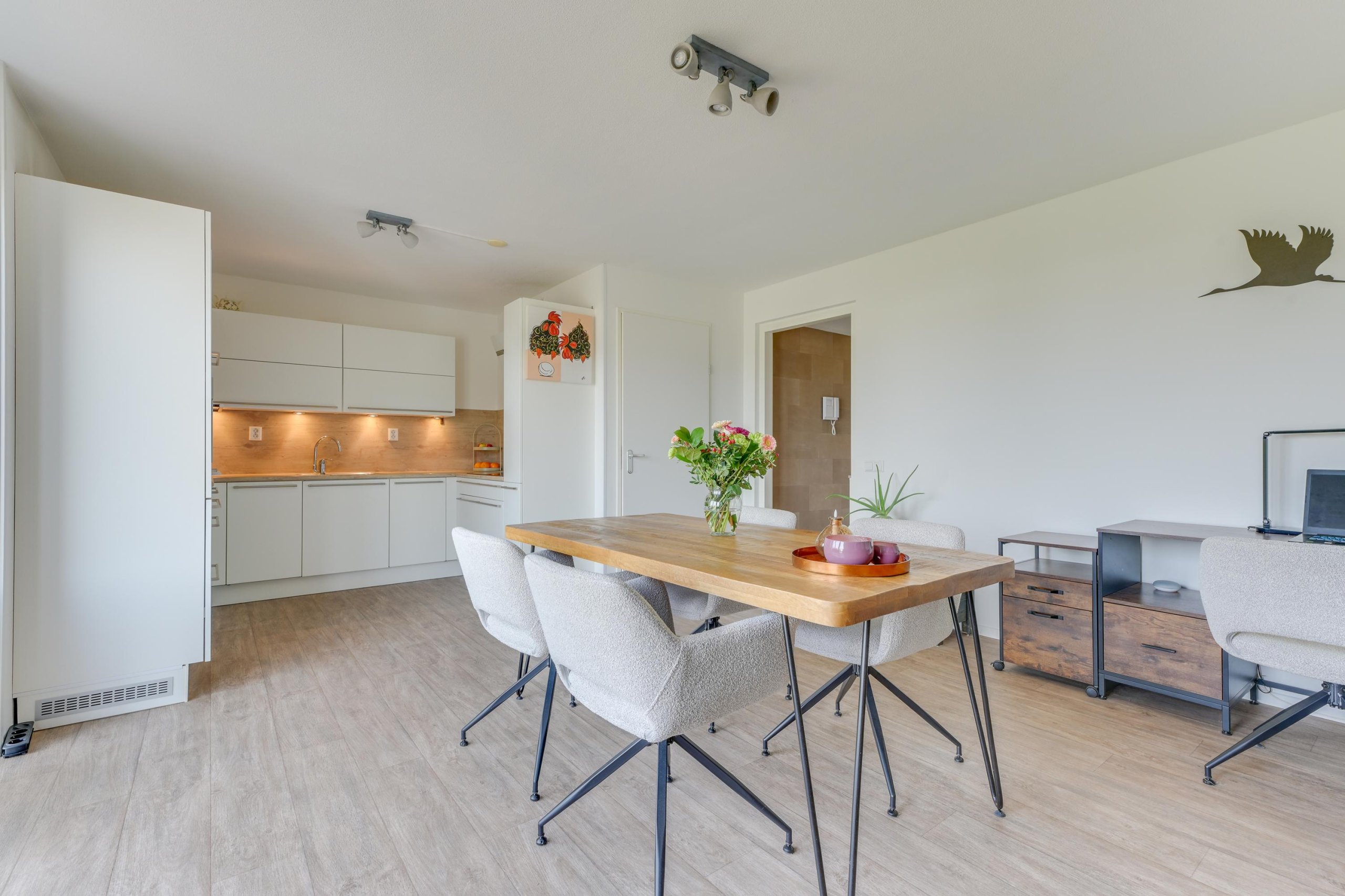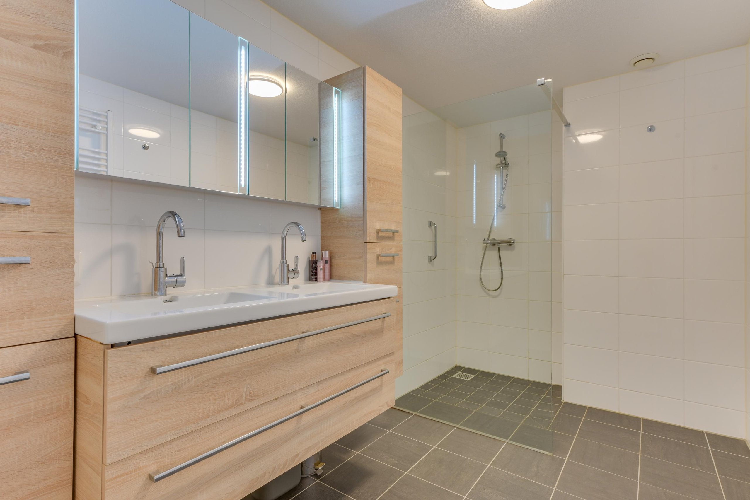 De keukenruimte is prettig ingedeeld en beschikt over grote raampartijen, een Frans balkon en een praktische provisiekast. De open keuken in U-opstelling is modern en compleet uitgerust met diverse inbouwapparatuur, waaronder een koelkast/vriezer, combi-oven, vaatwasser, inductiekookplaat en een moderne afzuigkap.