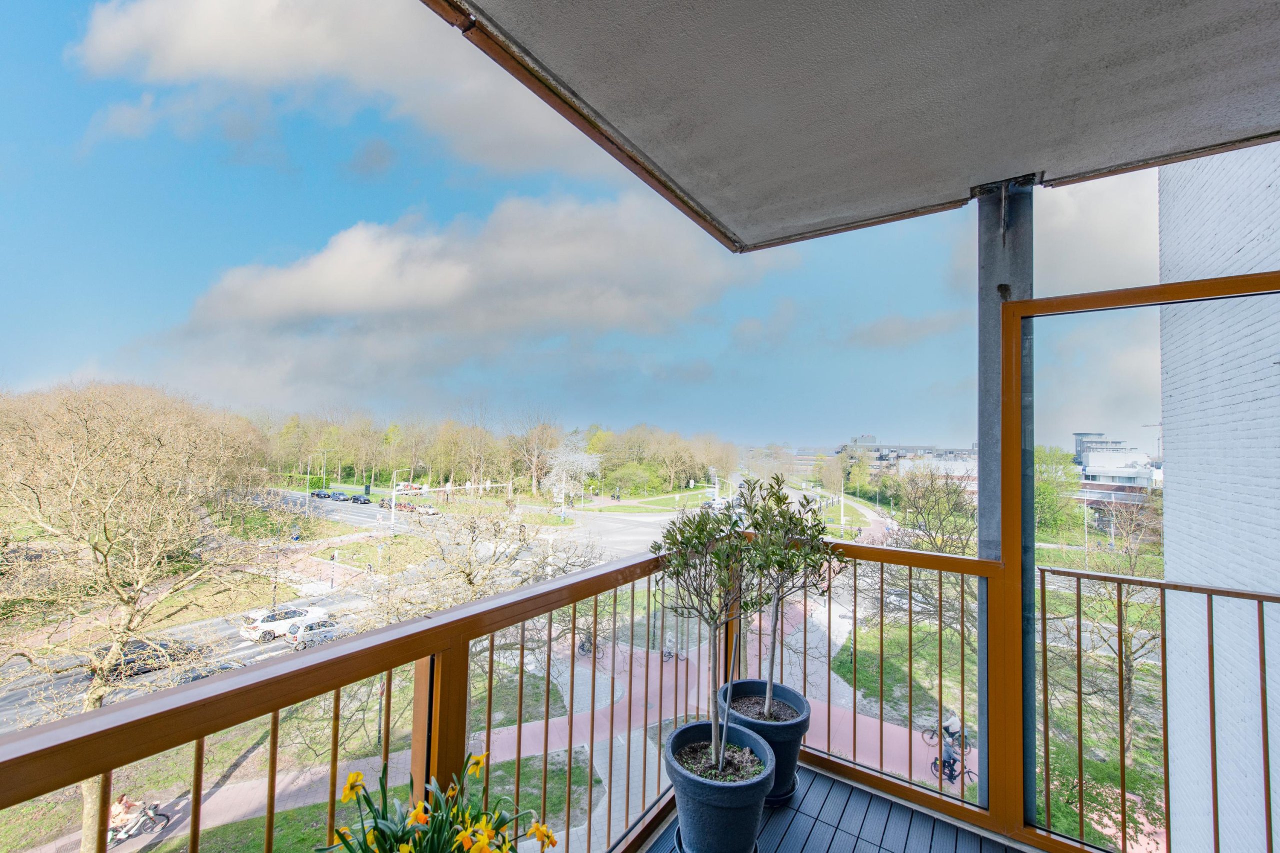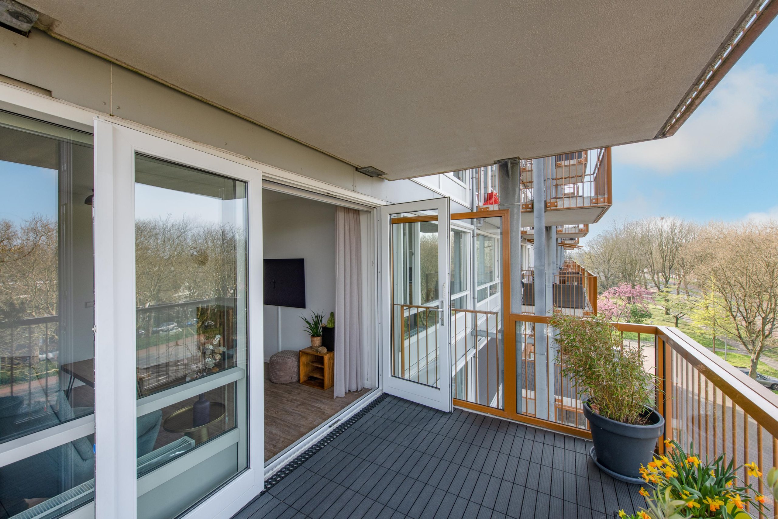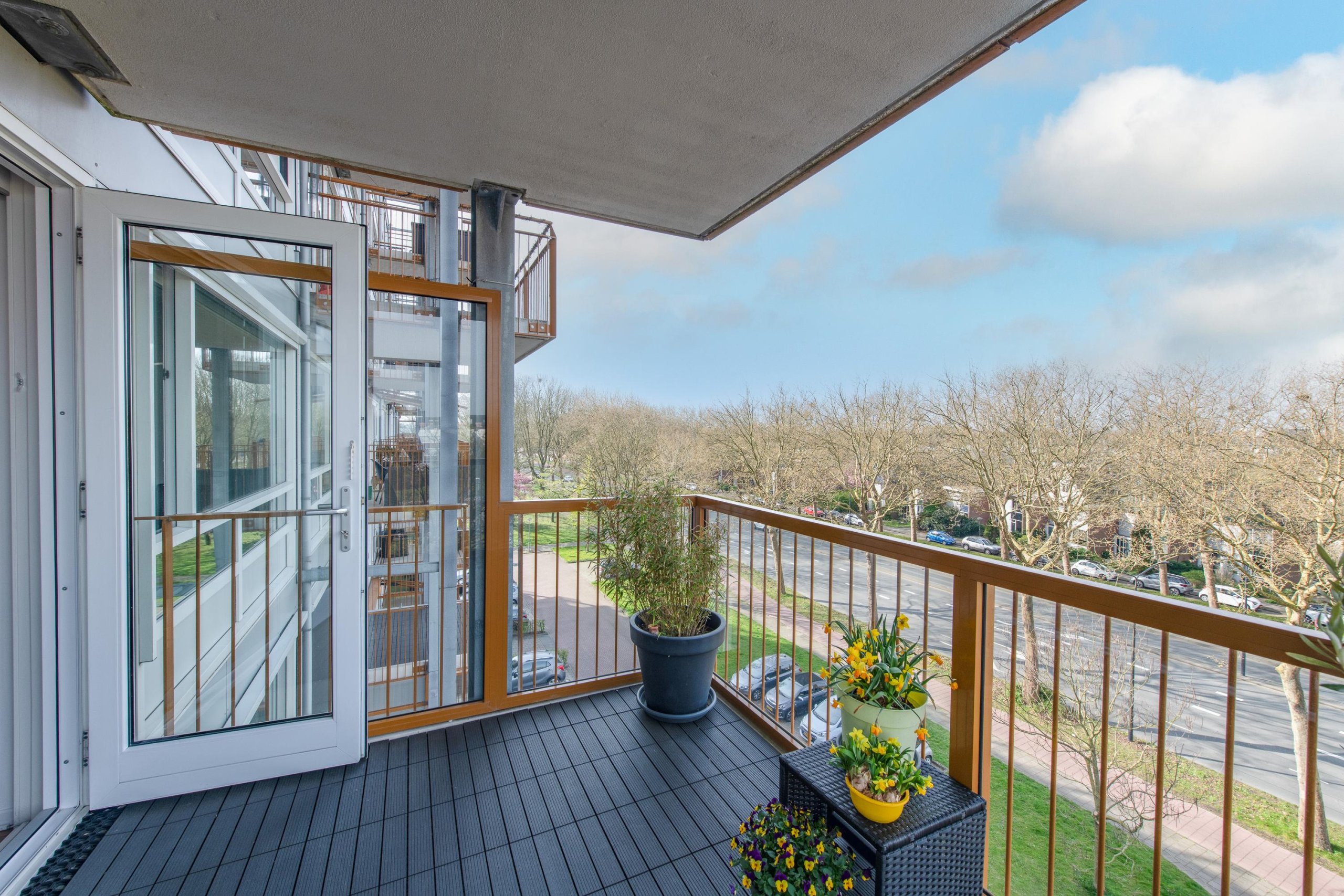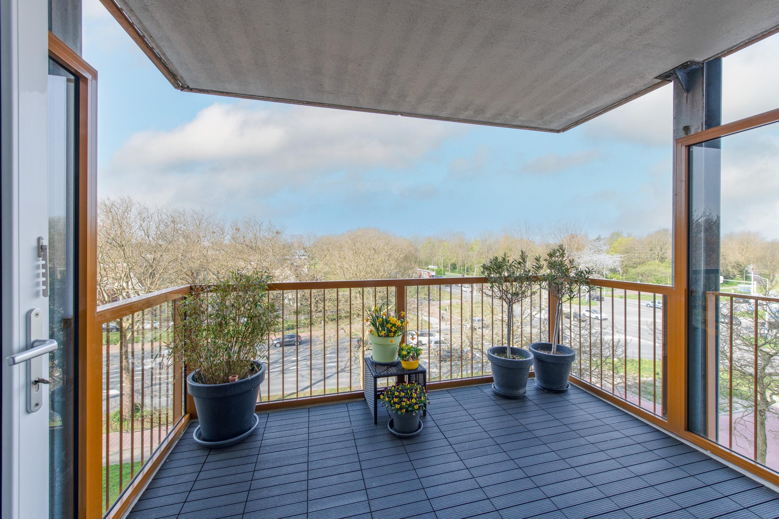 Het ruime balkon (circa 8,5 m²) is gelegen op het zonnige zuidwesten en biedt een fijne plek om van de middag- en avondzon te genieten. Dankzij de hardglazen windkering zit je hier extra beschut, terwijl het vrije uitzicht behouden blijft.