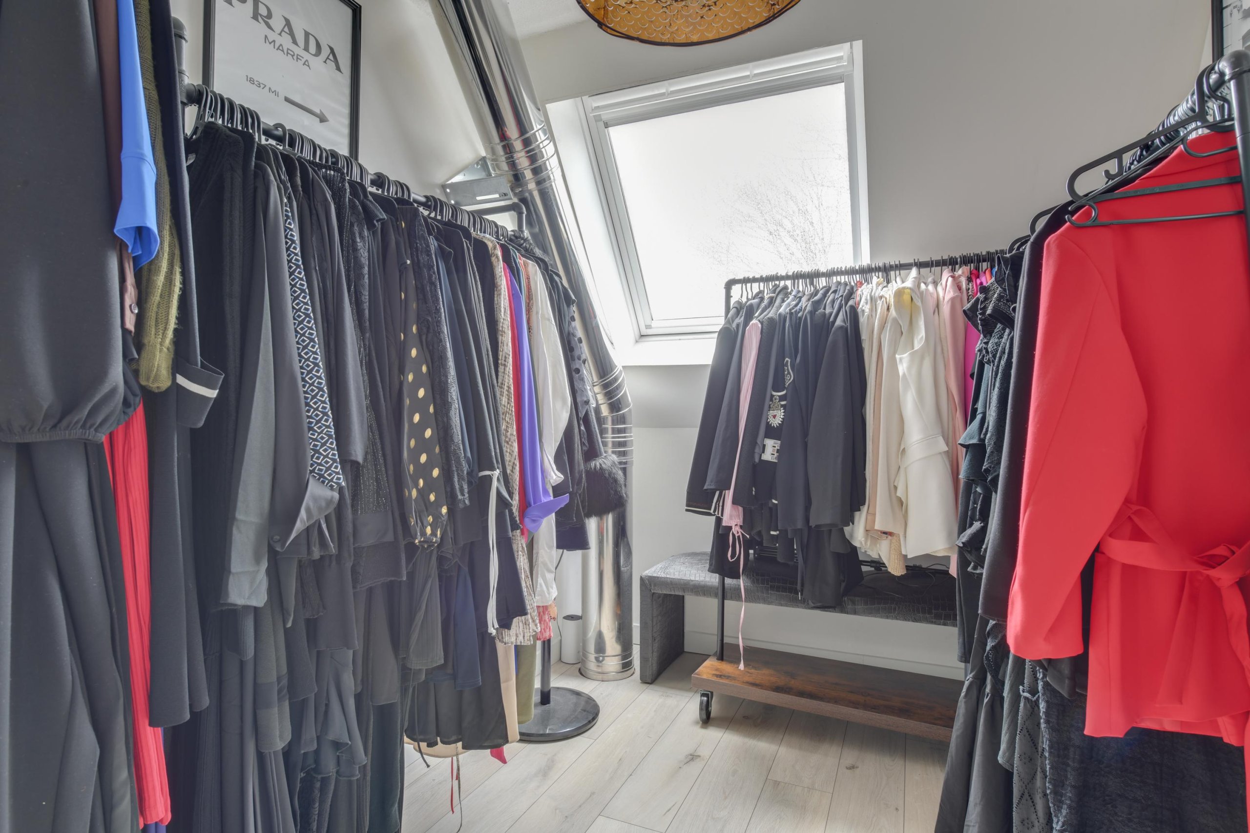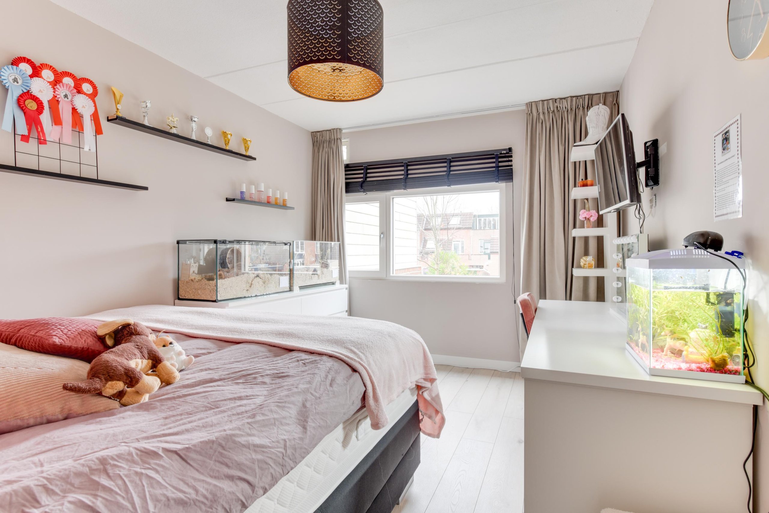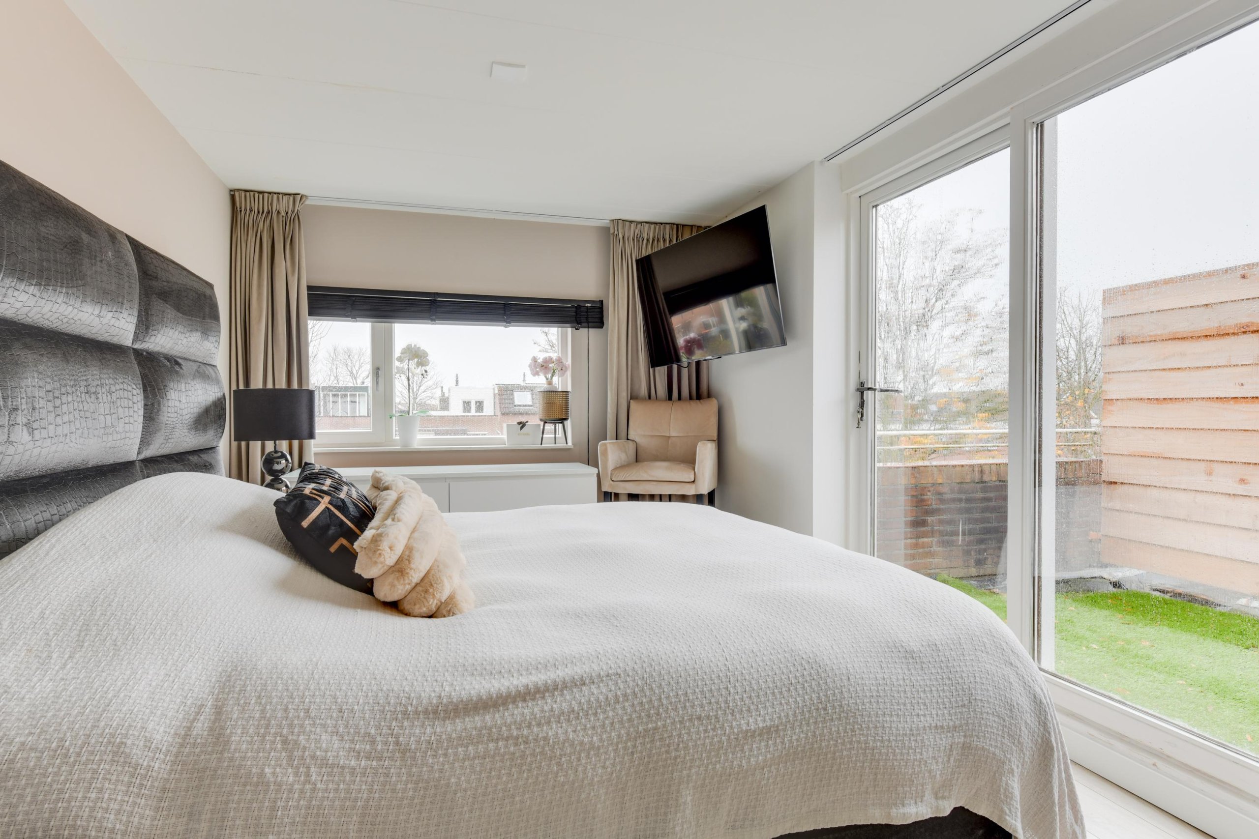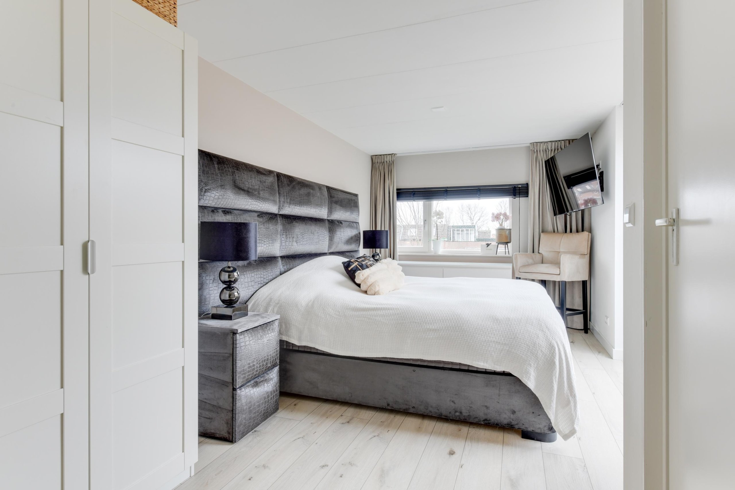 De tweede verdieping biedt een vijfde ruime slaapkamer met een inloopkast en toegang tot het dakterras. Hier bevindt zich ook een aparte ruimte met de cv-installatie en wasmachine- en drogeraansluiting.