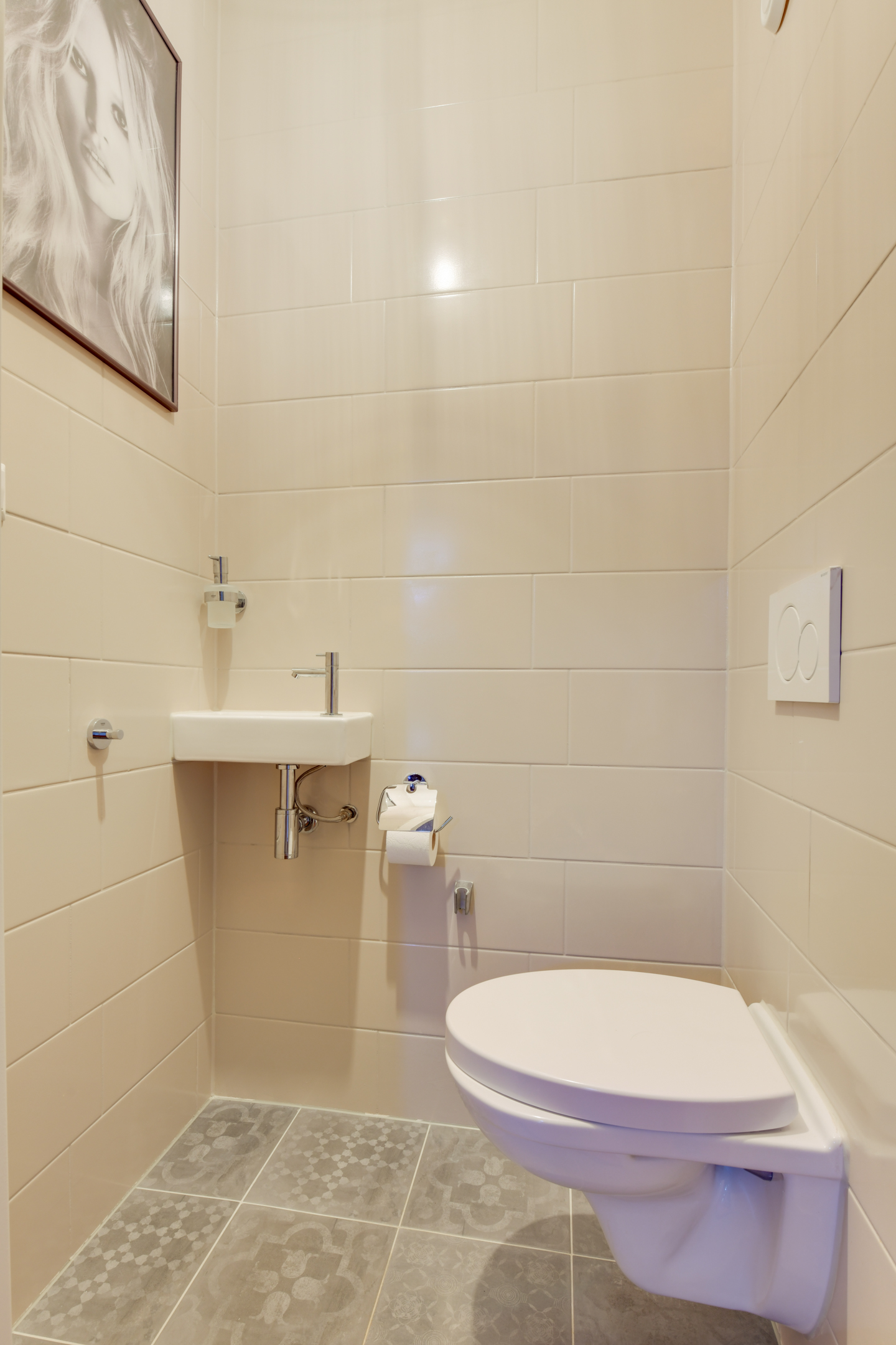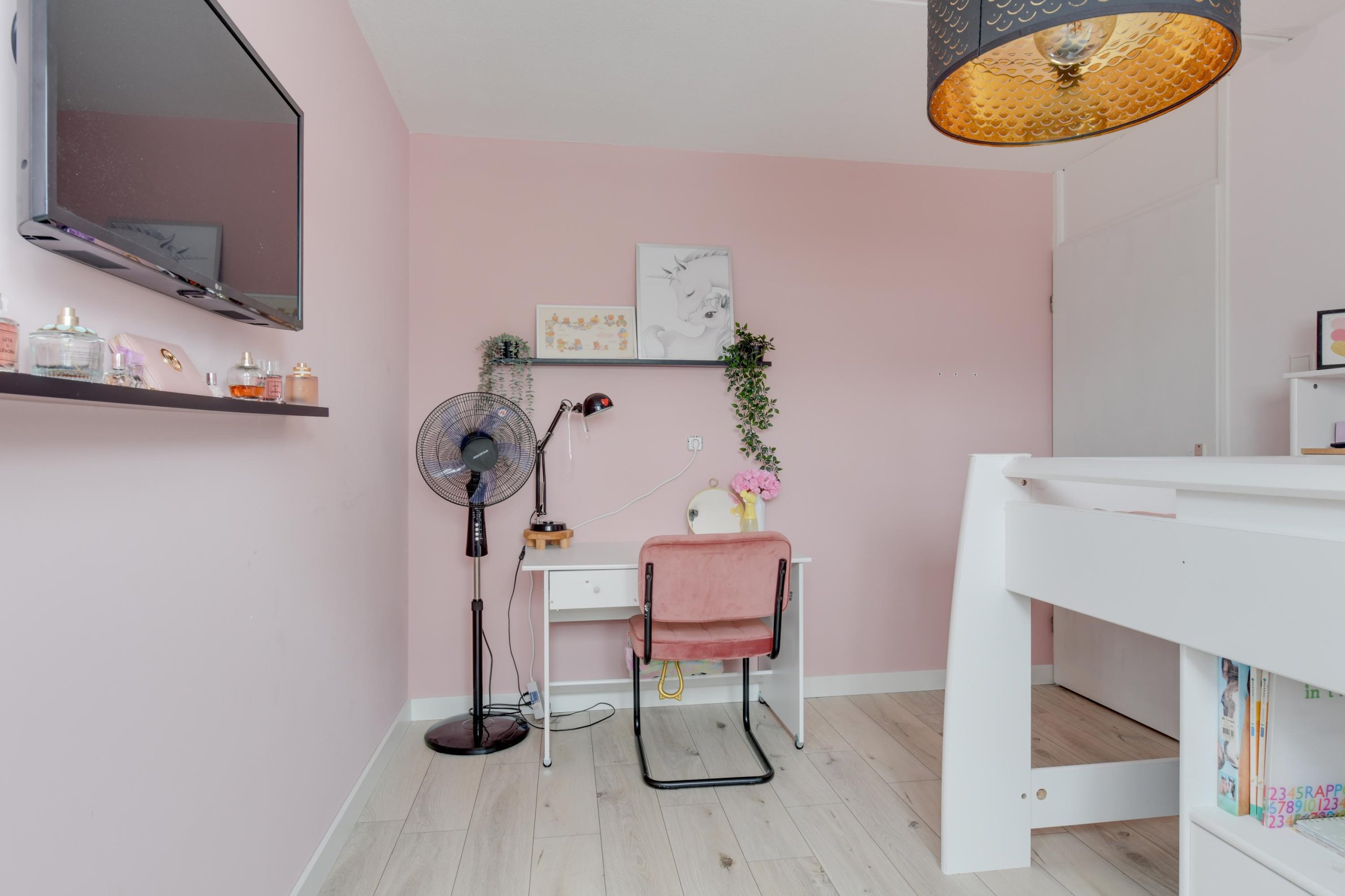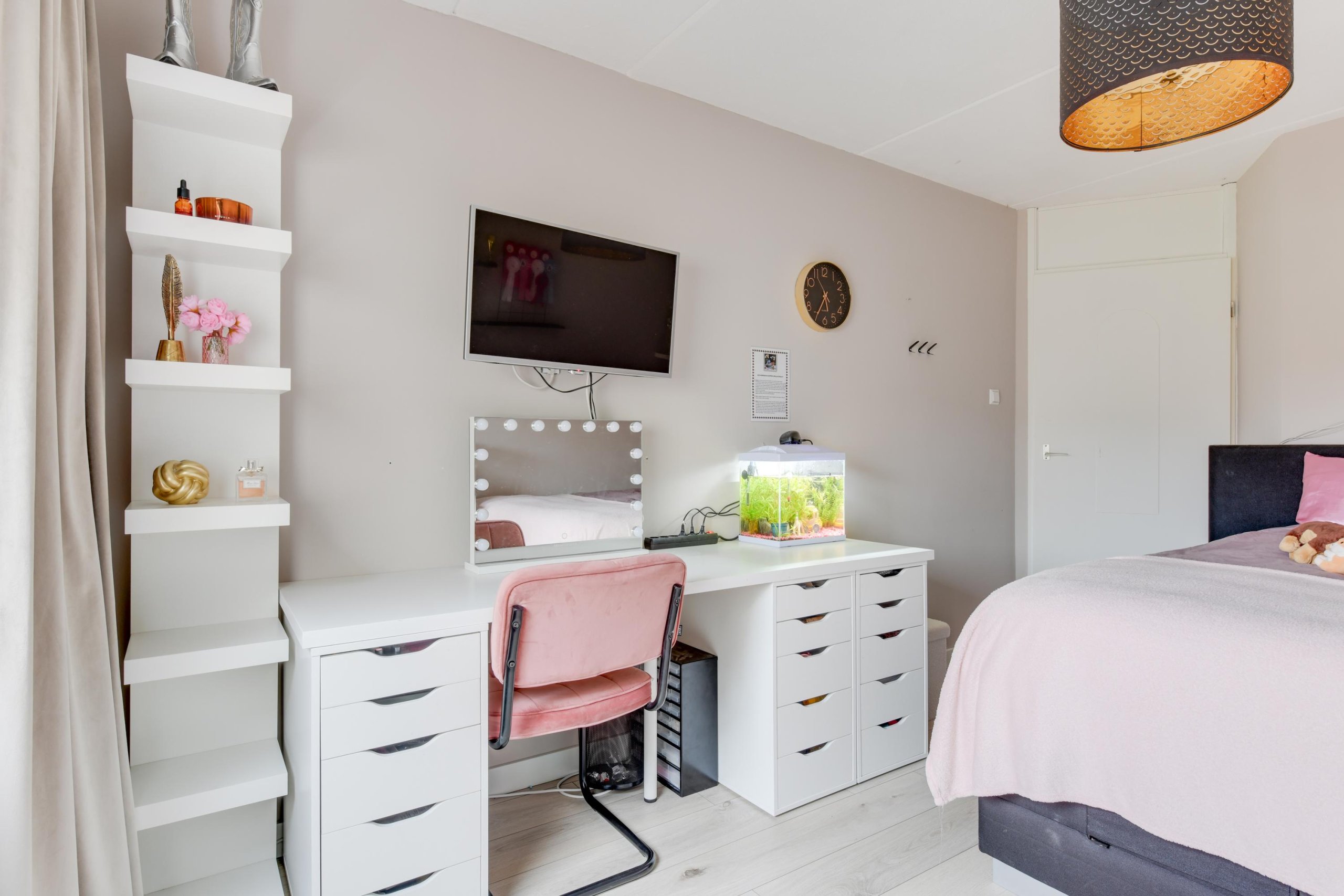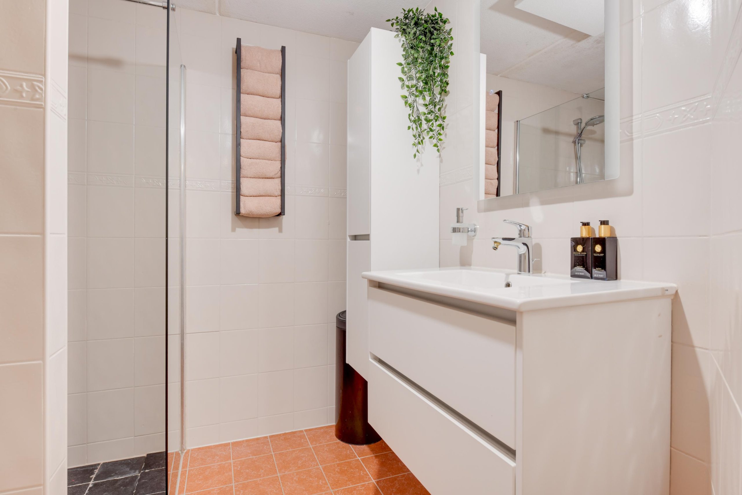 De tweede verdieping biedt een vijfde ruime slaapkamer met een inloopkast en toegang tot het dakterras. Hier bevindt zich ook een aparte ruimte met de cv-installatie en wasmachine- en drogeraansluiting.