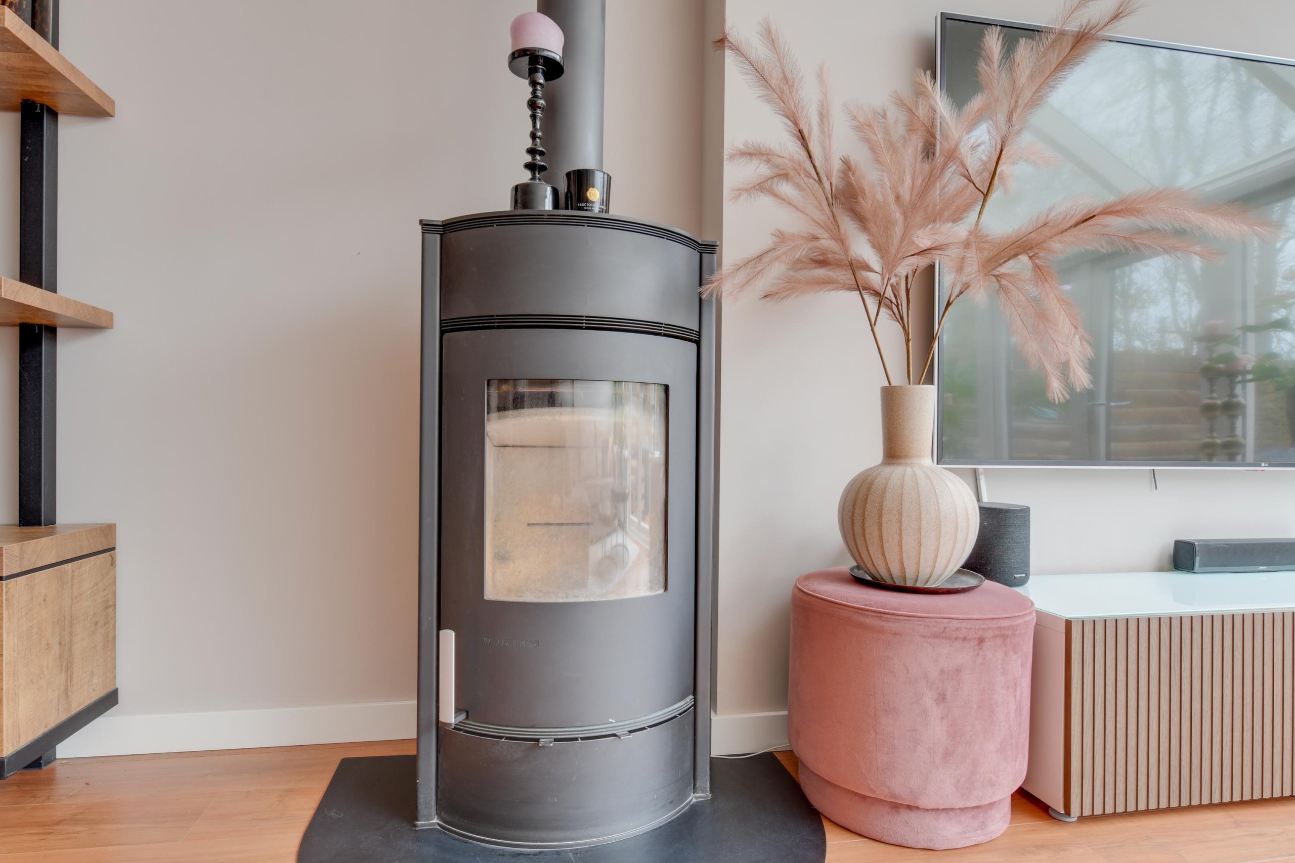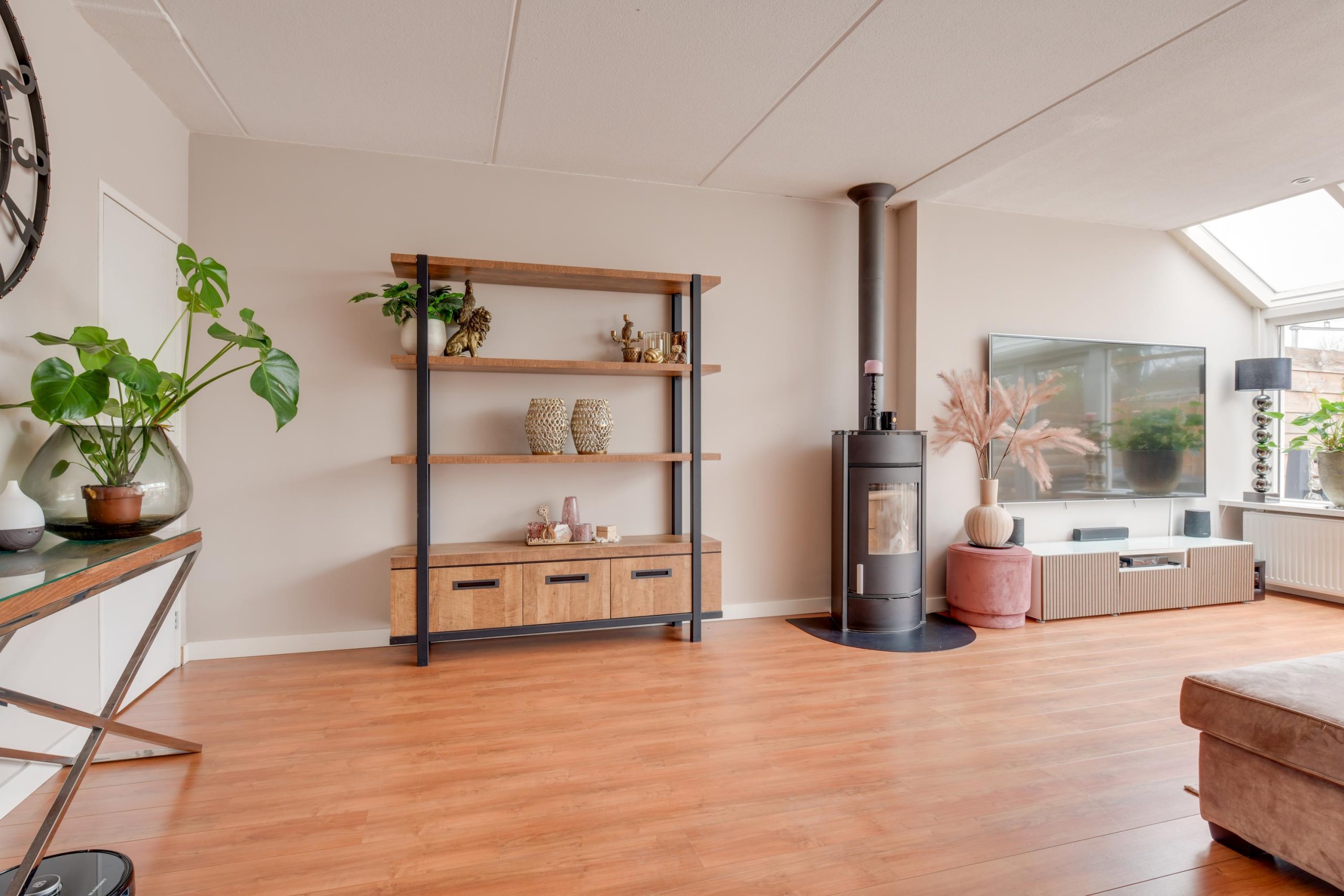 Via de entree met meterkast, toilet en trapopgang, kom je in de royale woonkamer. Deze is licht en sfeervol, voorzien van een praktische trapkast, een houtkachel en een moderne afwerking. Zo ligt er een nette laminaatvloer en zijn de wanden strak gestuct. Via de kunststof pui aan de achterzijde bereik je de zonnige tuin. Aan de voorzijde vind je de keuken, uitgevoerd in lichte kleurstelling. De keuken beschikt over een nieuwe oven en vaatwasser, een 5-pits gaskookplaat, afzuigkap en een koel-vriescombinatie.