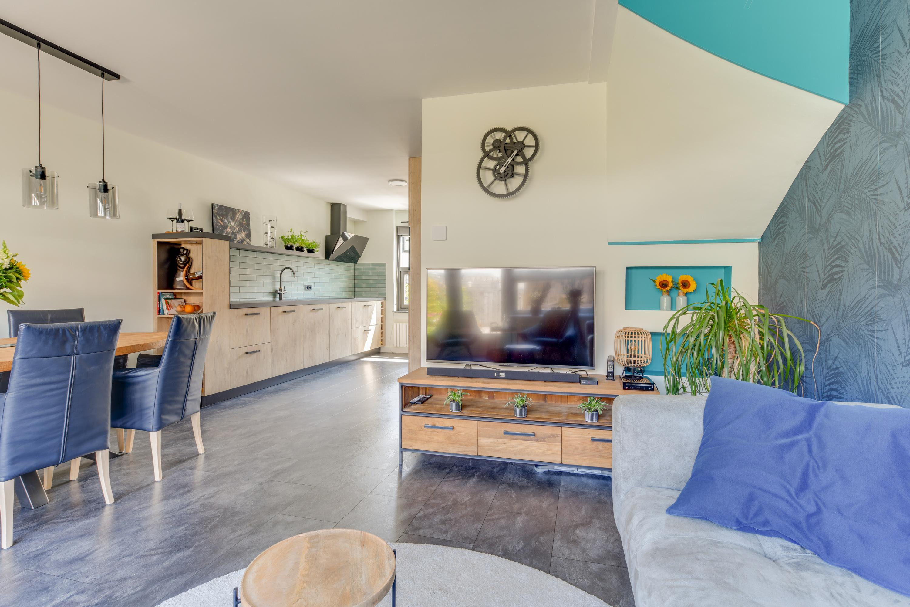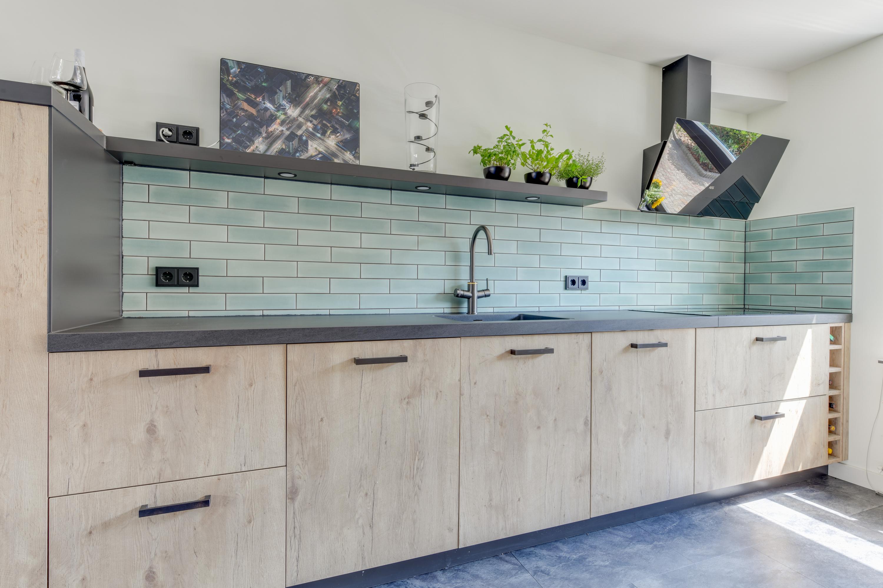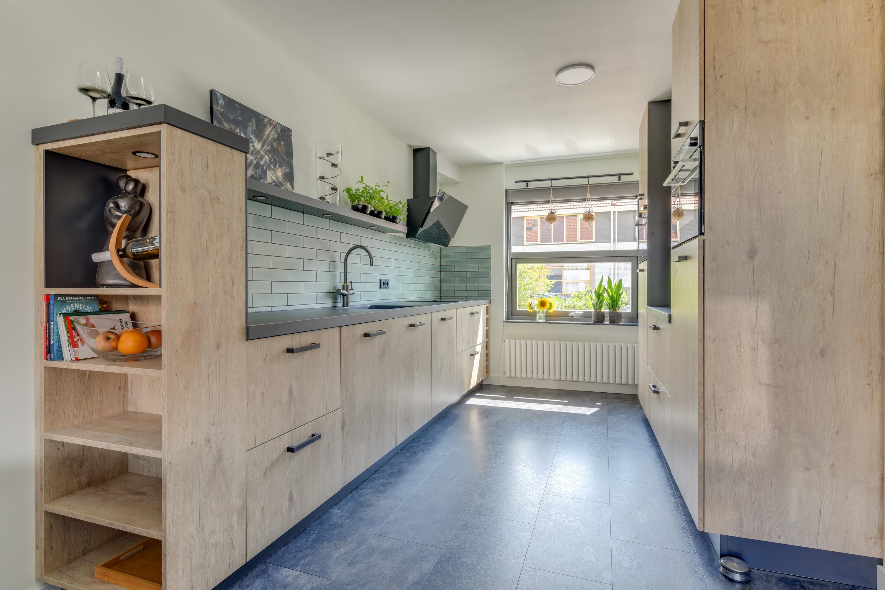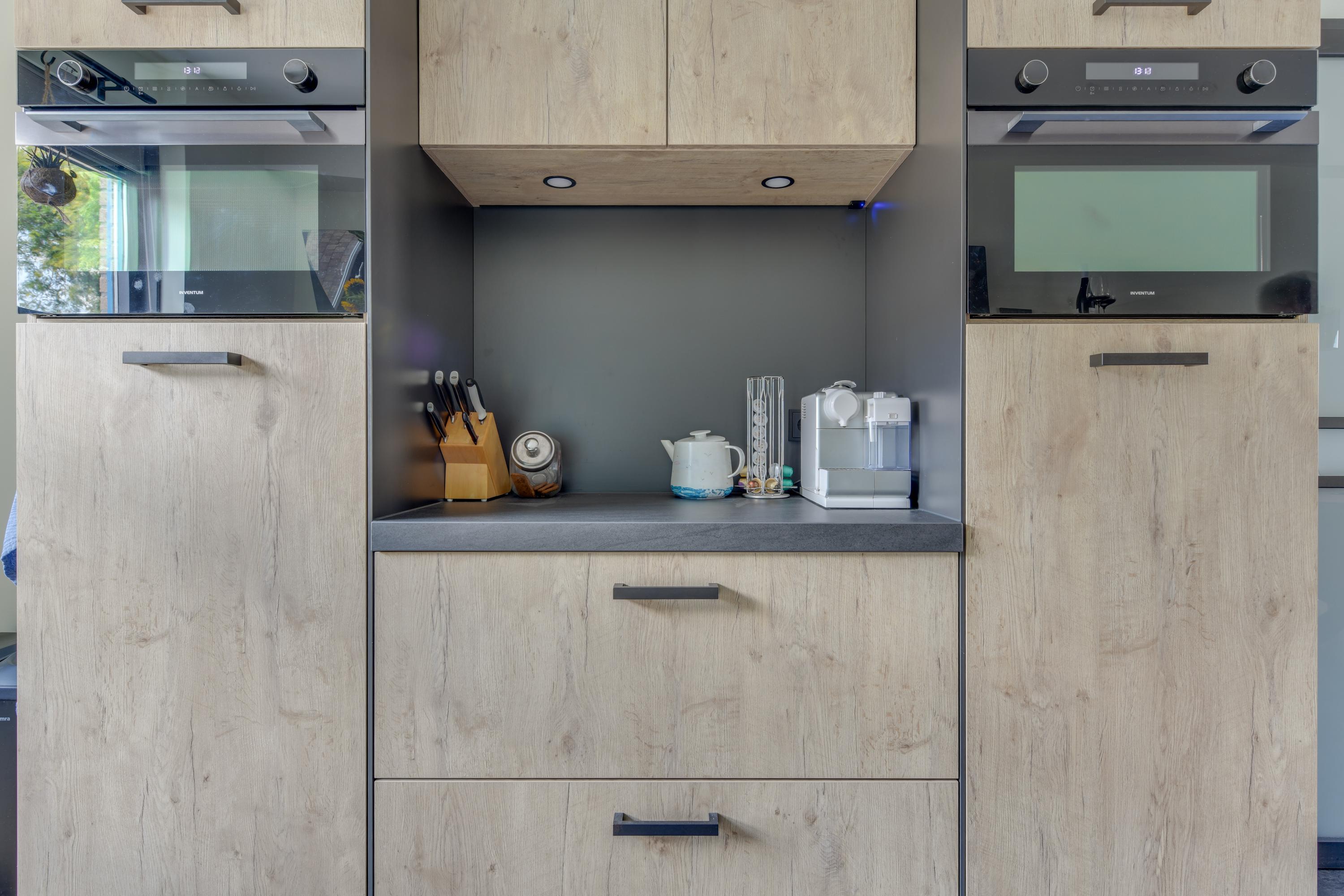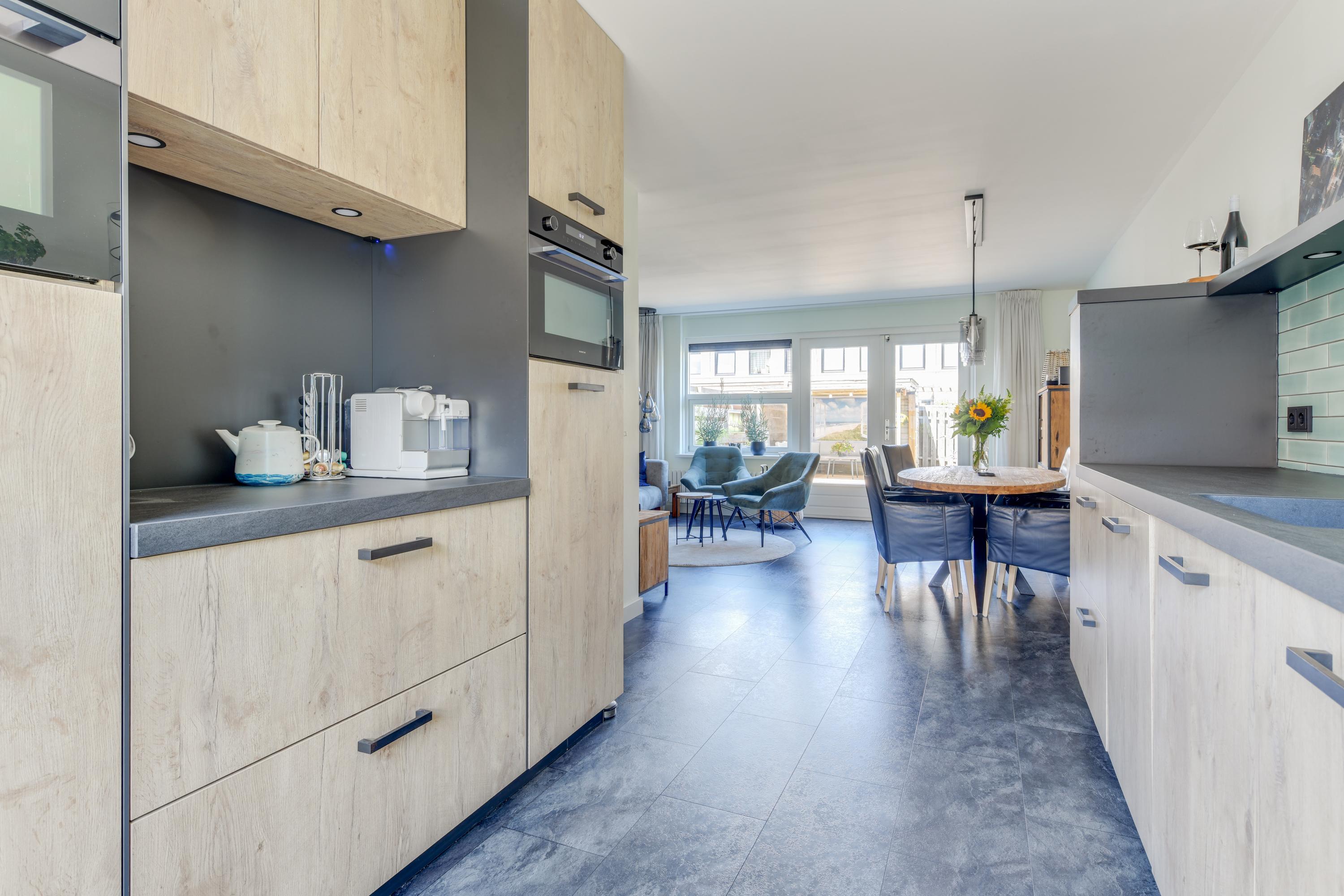 Aan de voorzijde van de woning bevindt zich de luxe keuken (2021) met veel werkruimte en diverse inbouwapparatuur zoals een kokendwaterkraan, inductiekookplaat, afzuigkap, oven, magnetron, koelkast, vriezer en vaatwasser.