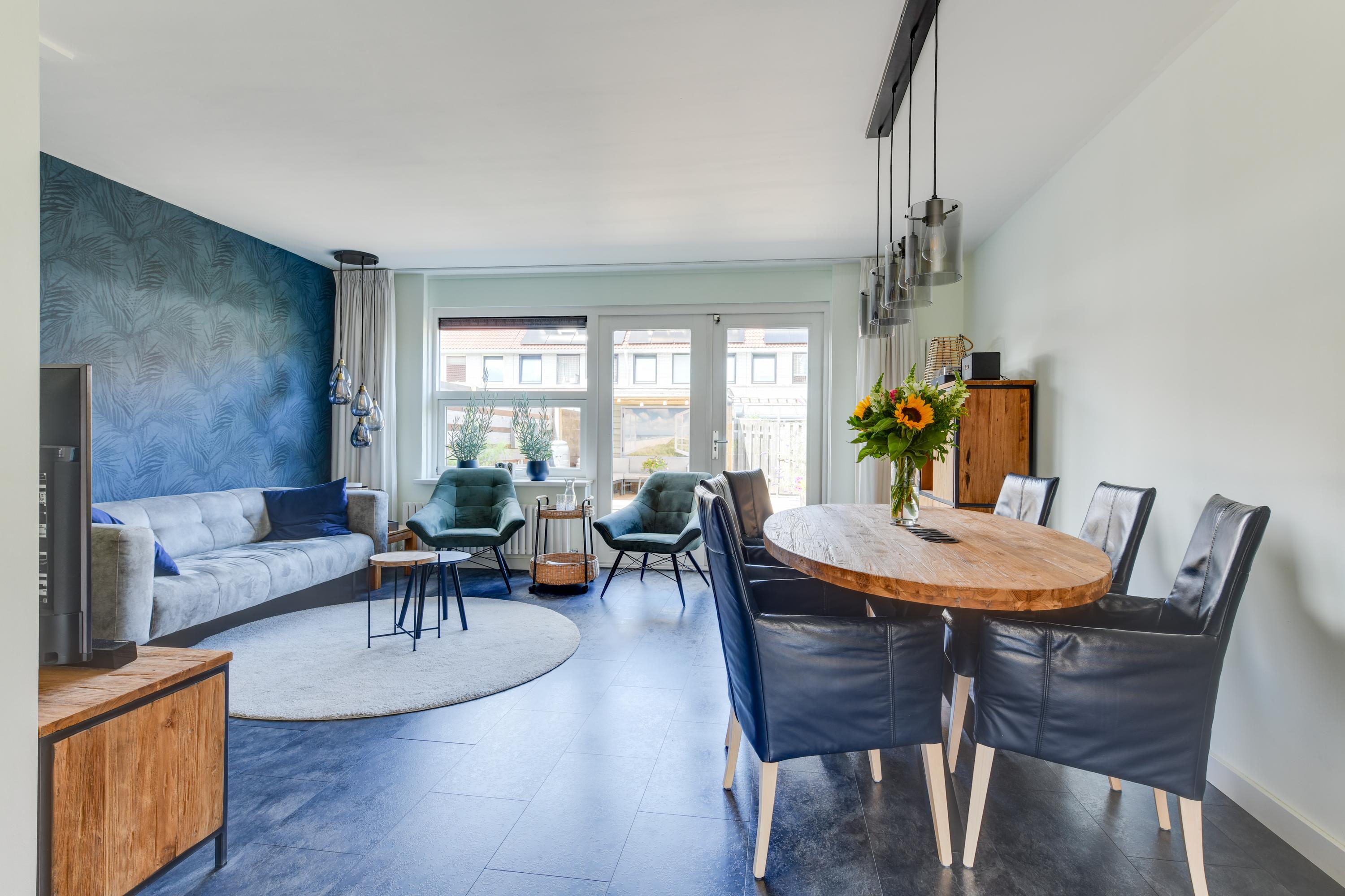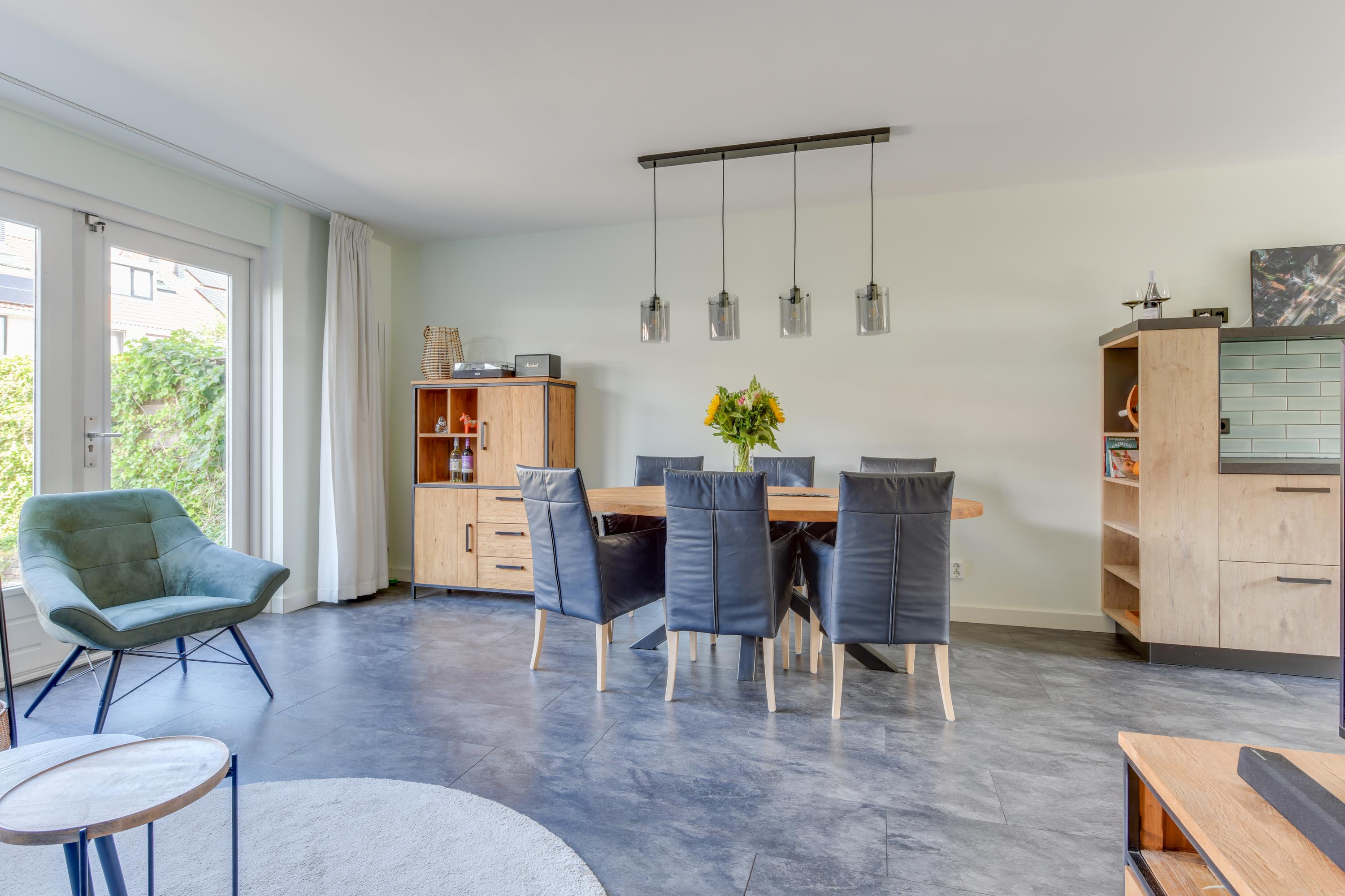 Je komt binnen via de hal met meterkast, toiletruimte en de trapopgang naar de eerste verdieping. Vanuit de hal stap je de ruime en lichte woonkamer binnen, voorzien van een nette laminaat vloer en strak afgewerkte wanden. Dankzij de grote raampartij aan de voorzijde en de openslaande deuren naar de tuin aan de achterzijde, geniet je hier van veel natuurlijk licht.
