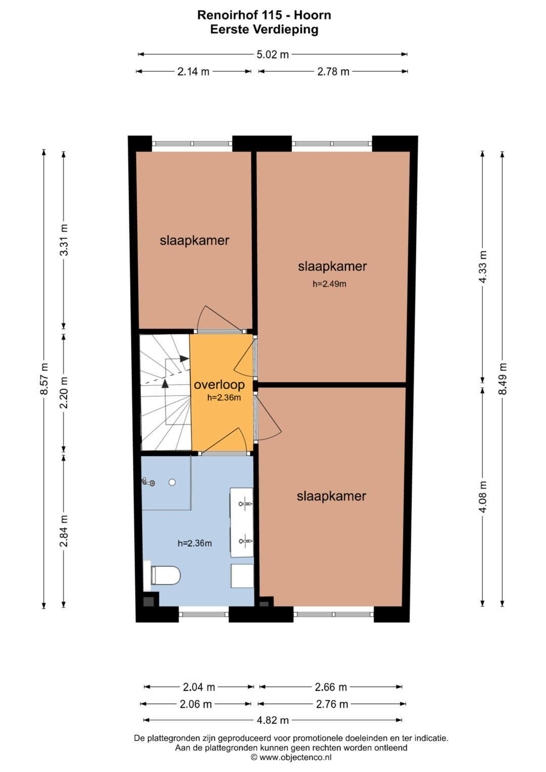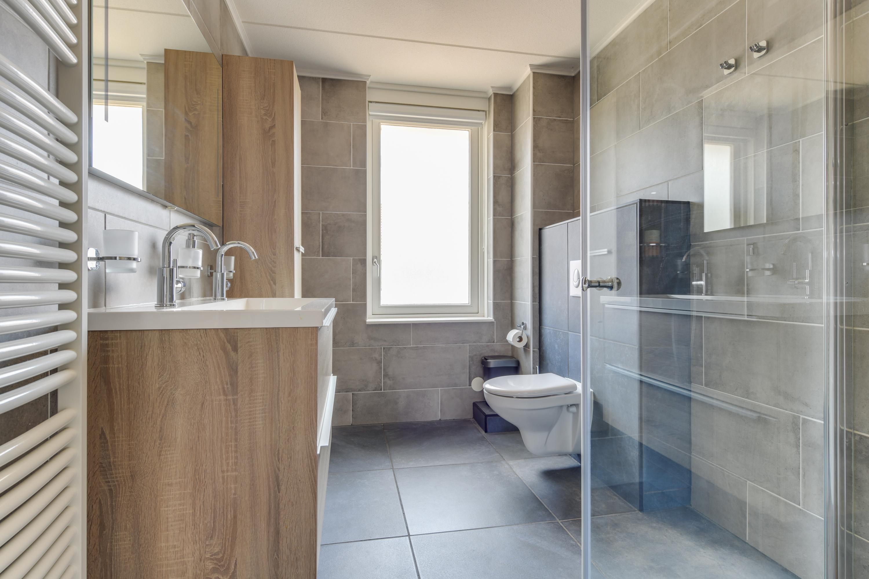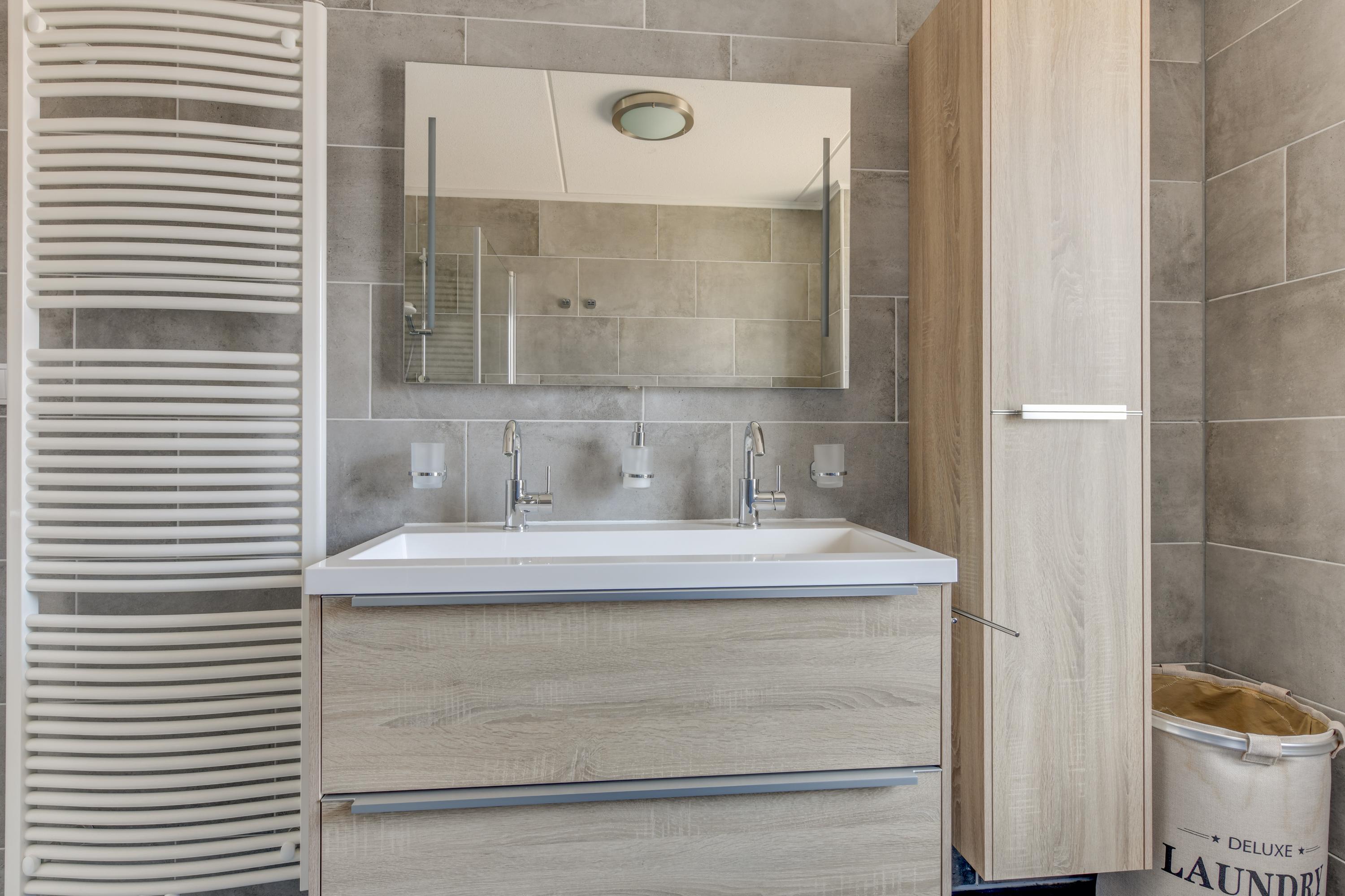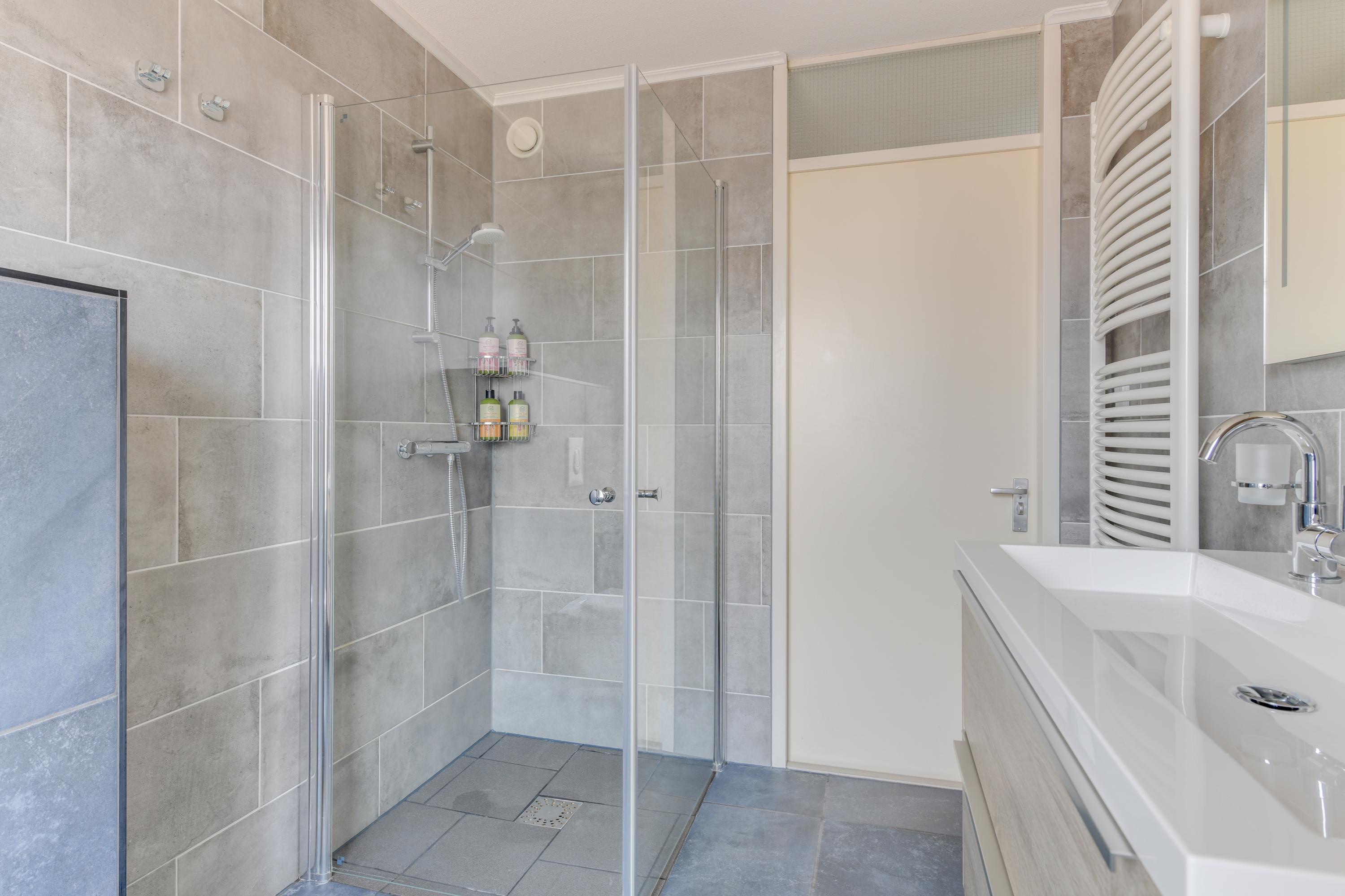 Via een vaste trap bereik je de overloop van de eerste verdieping. De eerste verdieping telt drie slaapkamers en een moderne badkamer uit 2020 met inloopdouche, dubbele wastafel en tweede toilet.