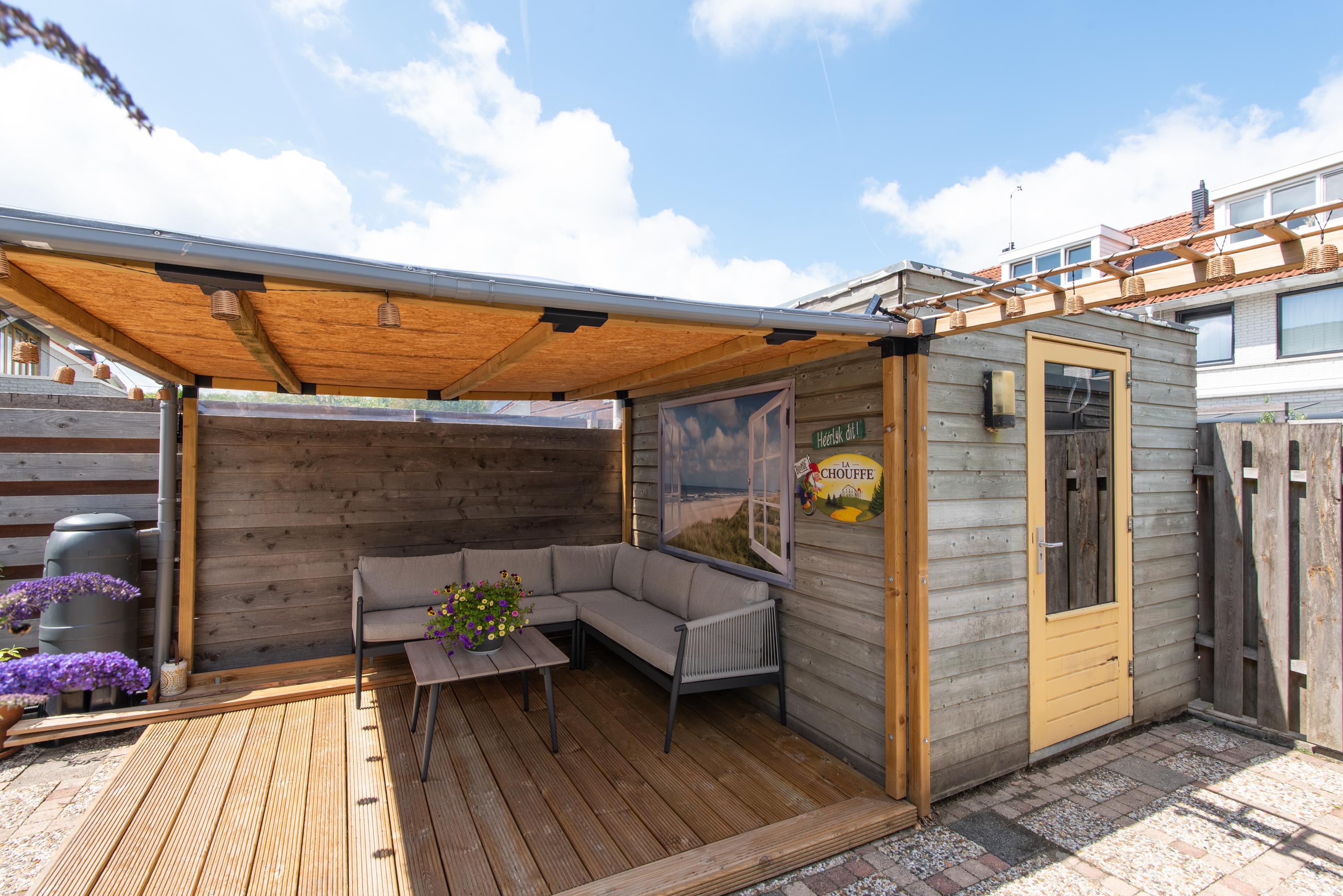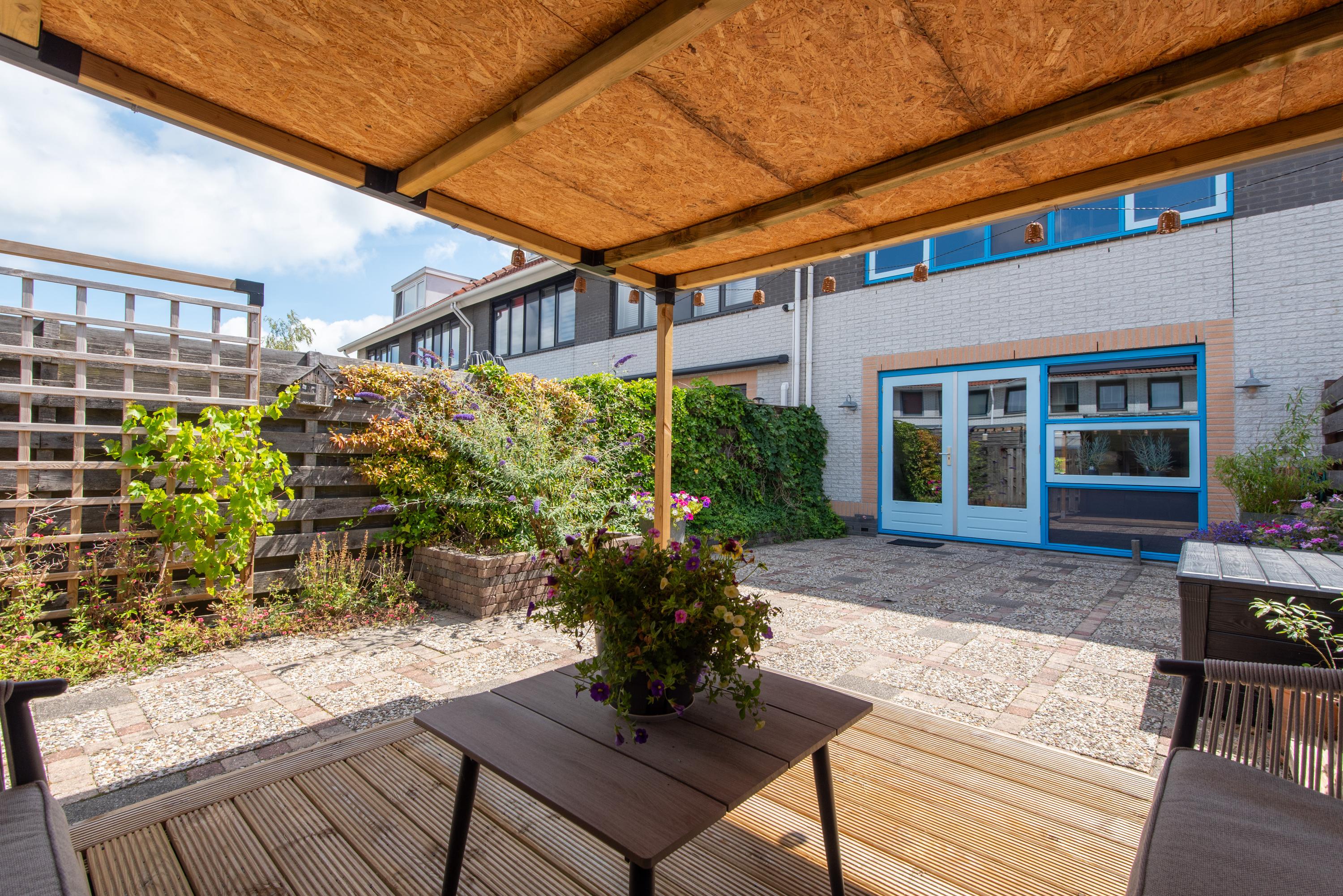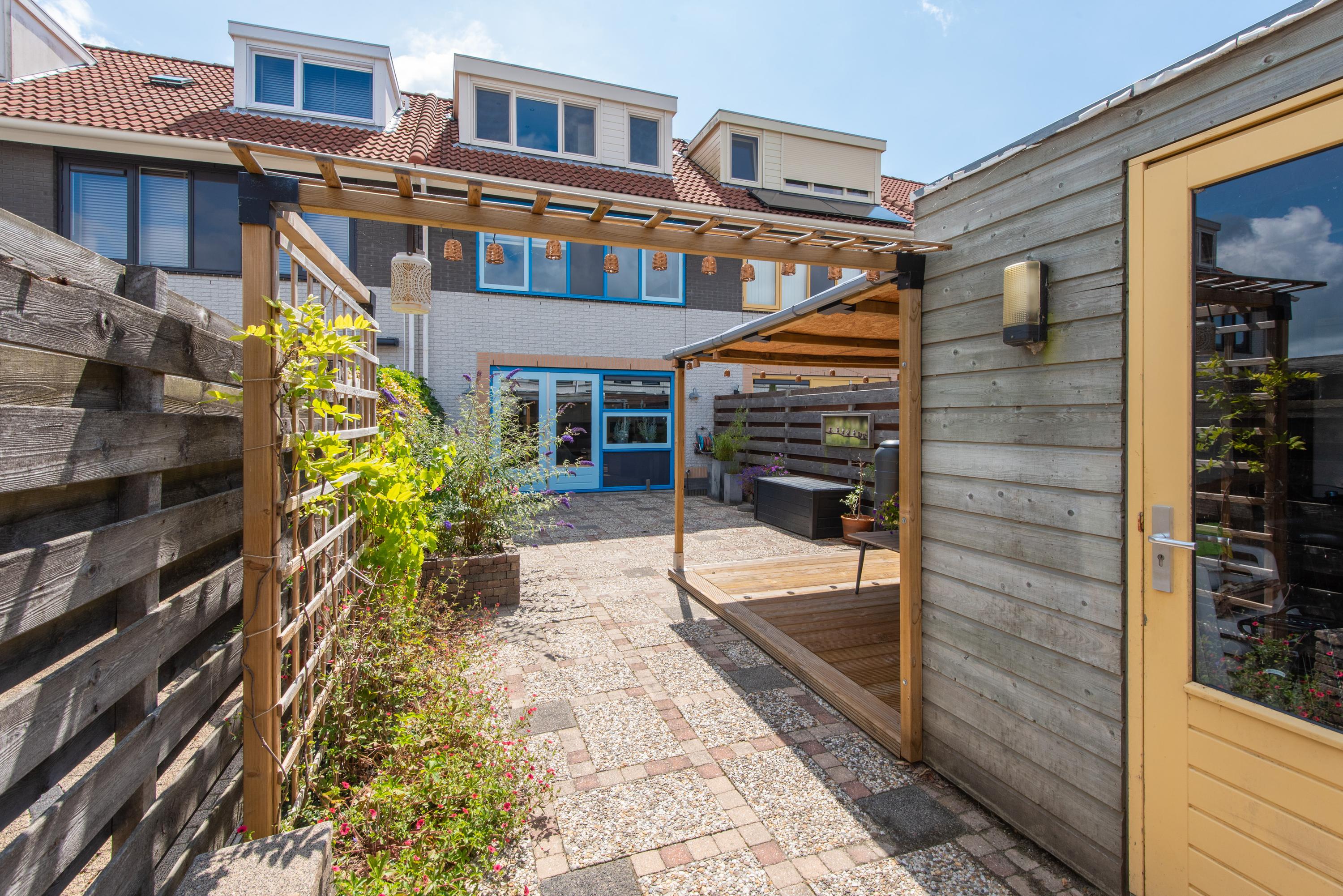De achtertuin is onderhoudsvriendelijk aangelegd en ligt op het noordwesten, wat betekent dat je hier ’s middags en ’s avonds nog heerlijk van de zon kunt genieten. Achterin de tuin staat een vrijstaande houten berging met een overkapping: ideaal voor fietsen, tuingereedschap of een gezellige zitplek. Via de handige achterom kom je eenvoudig met je fiets in en uit.