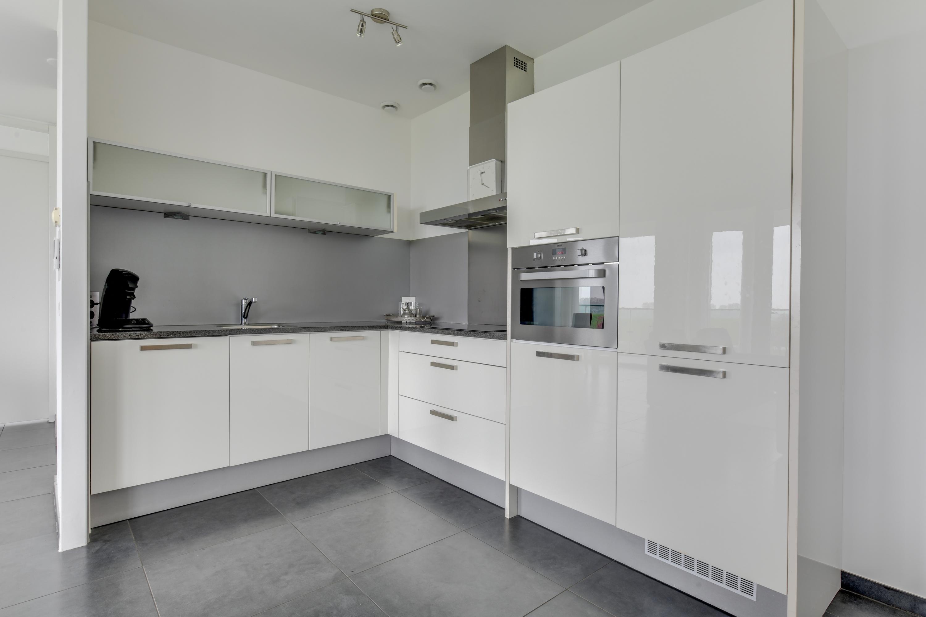 De woonkamer is een absolute eyecatcher: extra ruim door het samenvoegen met de tweede slaapkamer, voorzien van grote raampartijen die zorgen voor een zee aan lichtinval. Er is genoeg plek voor een royale zithoek én een grote eettafel. De open keuken is strak en modern en uitgerust met onder andere een inductiekookplaat, combi-oven, vaatwasser, koelkast en vriezer.