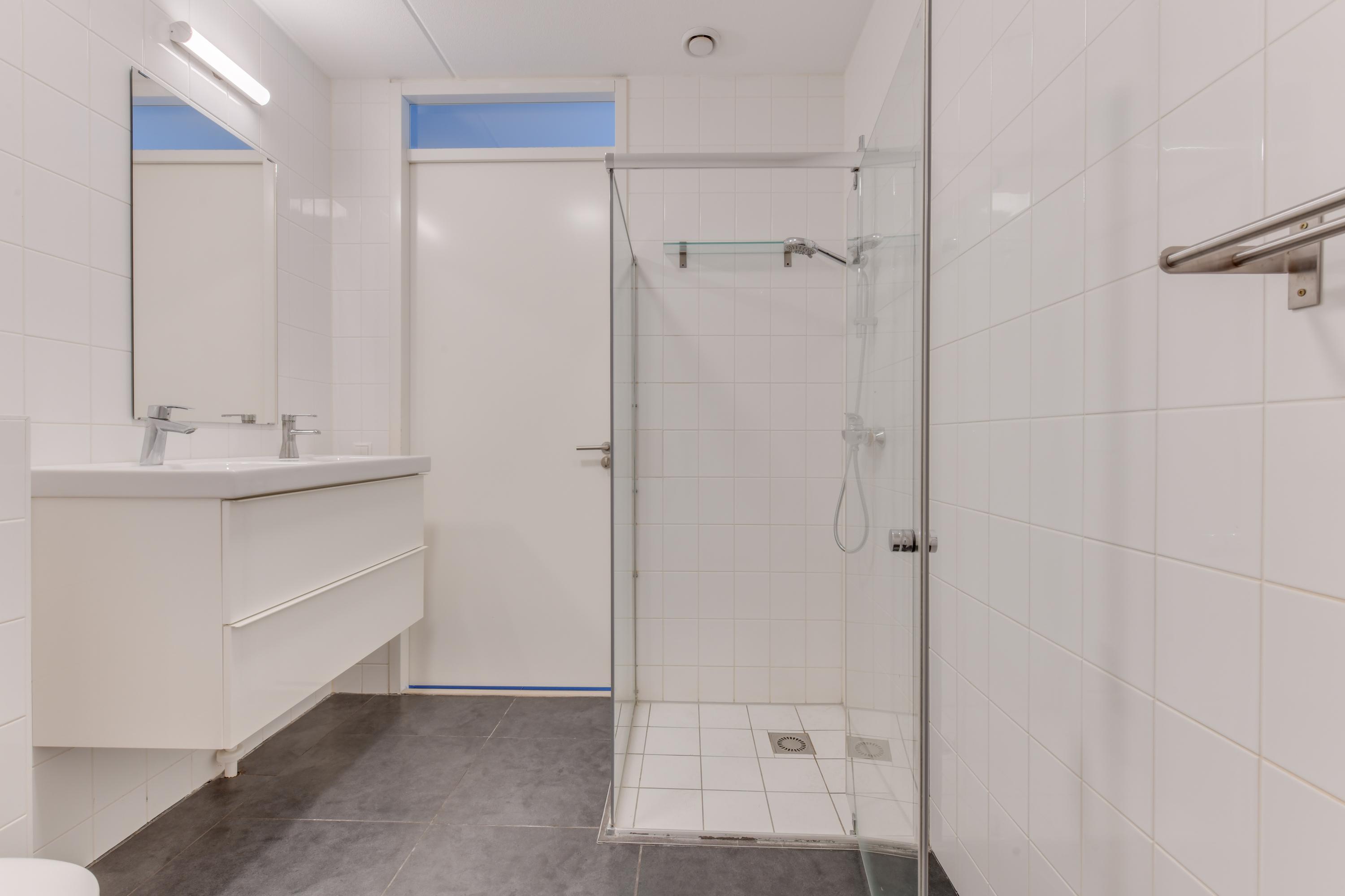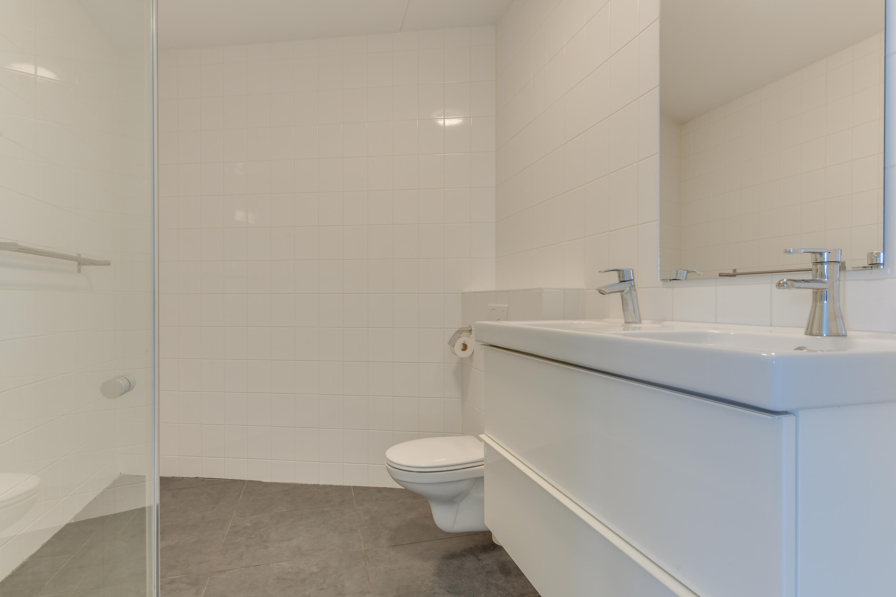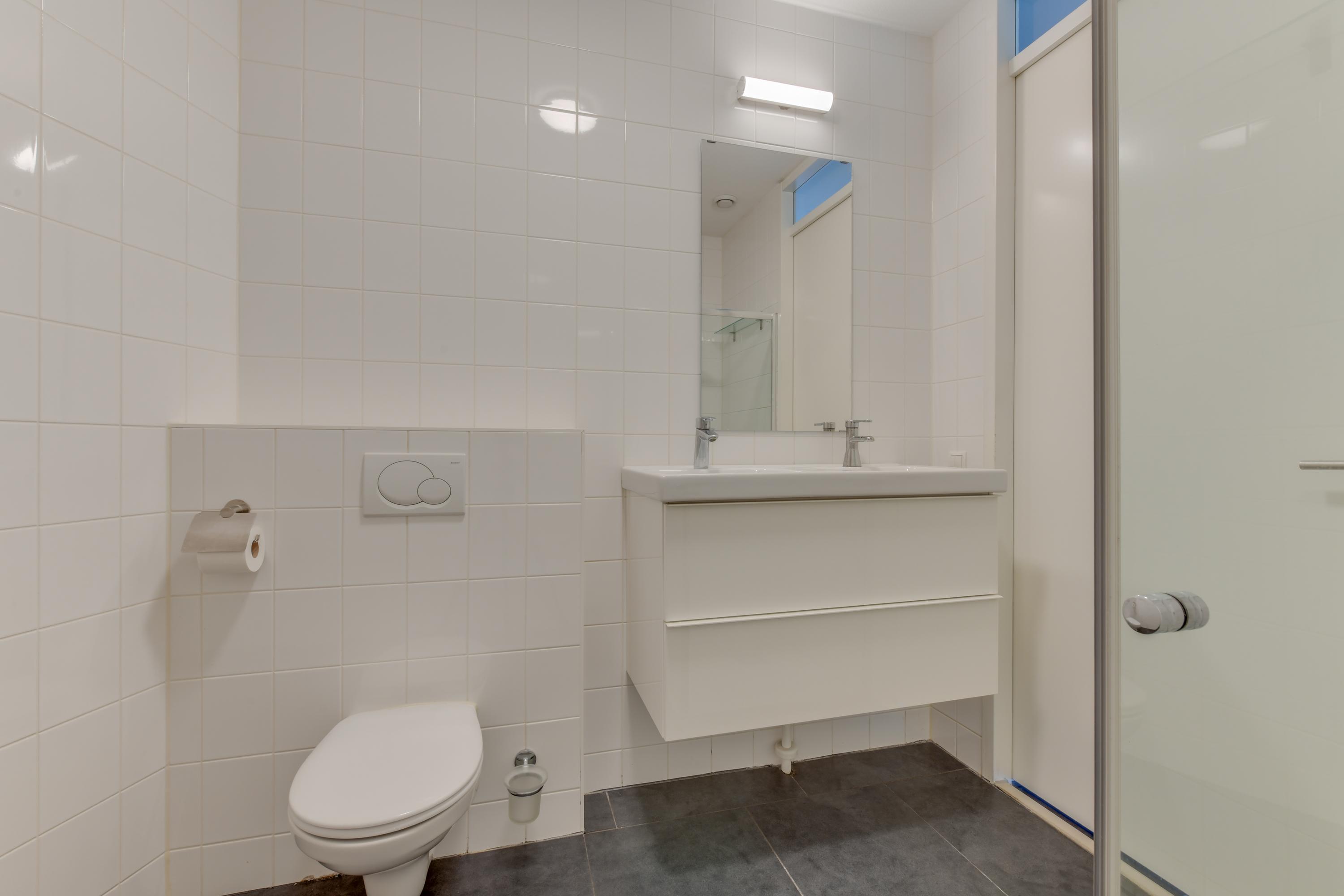 De slaapkamer is ruim van opzet en bevindt zich aan de rustige kant van het appartement. De badkamer is verzorgd en beschikt over een inloopdouche, wastafelmeubel en een tweede toilet.