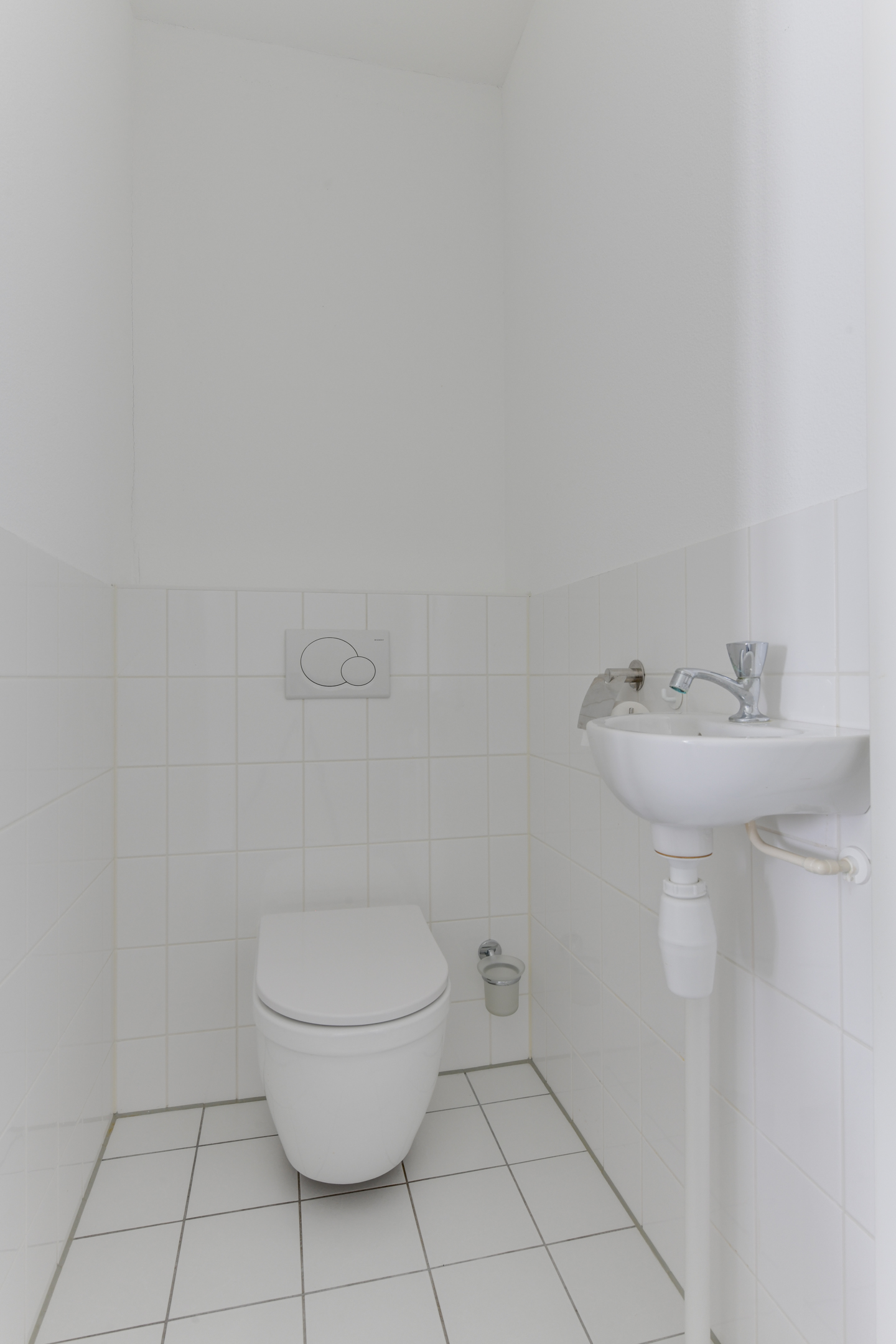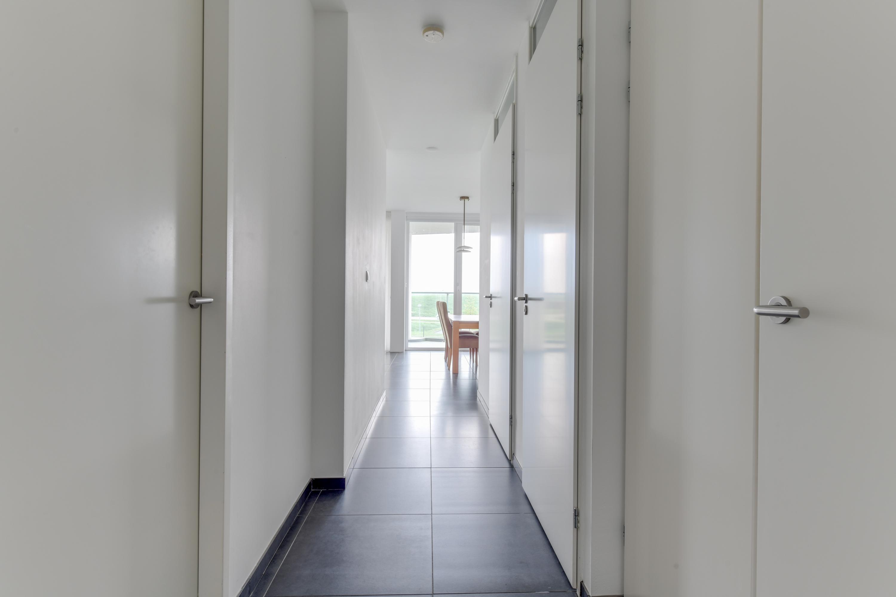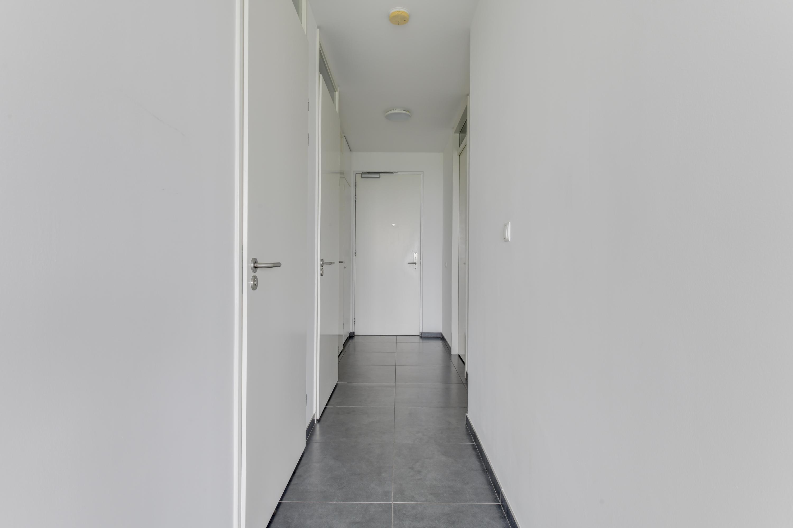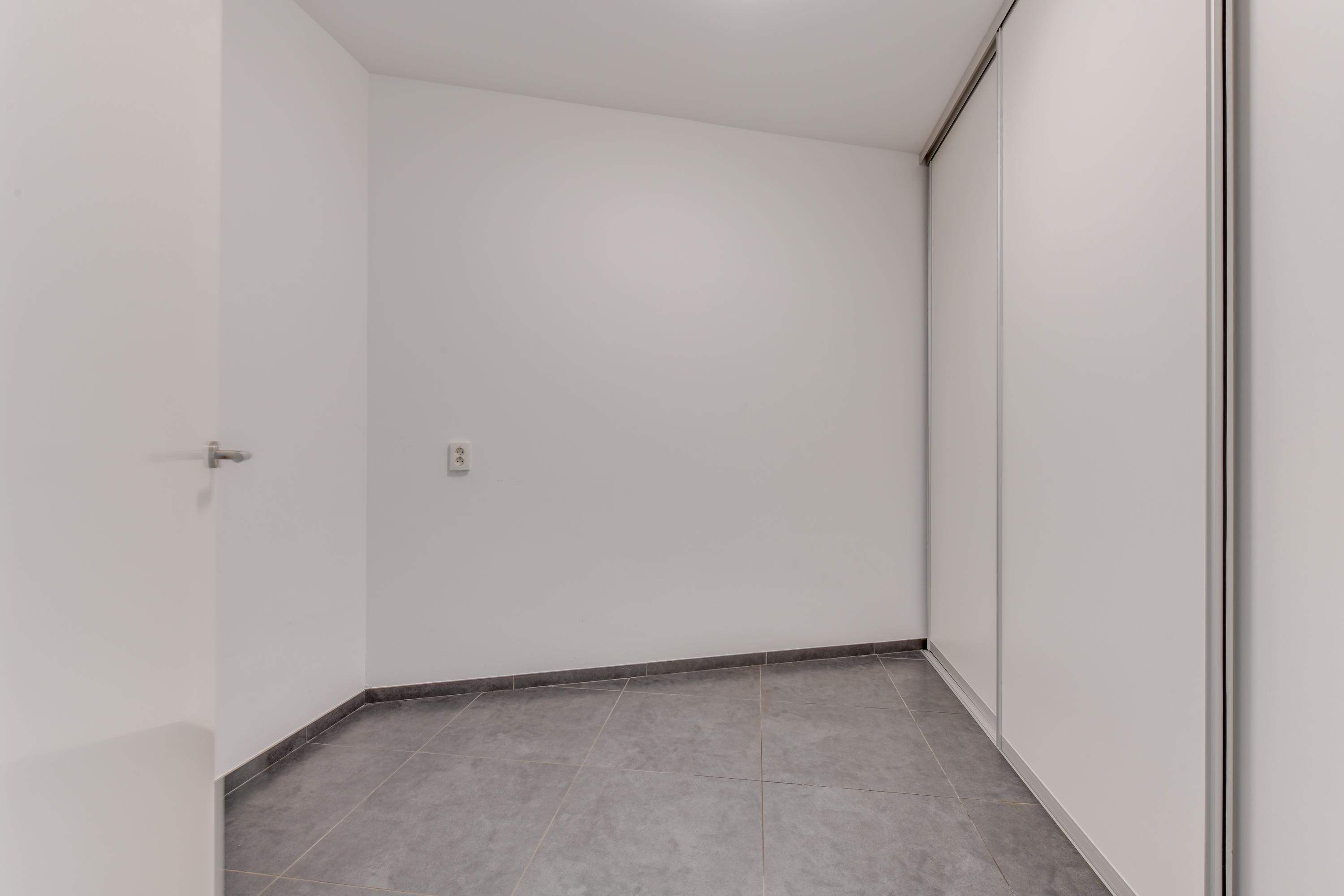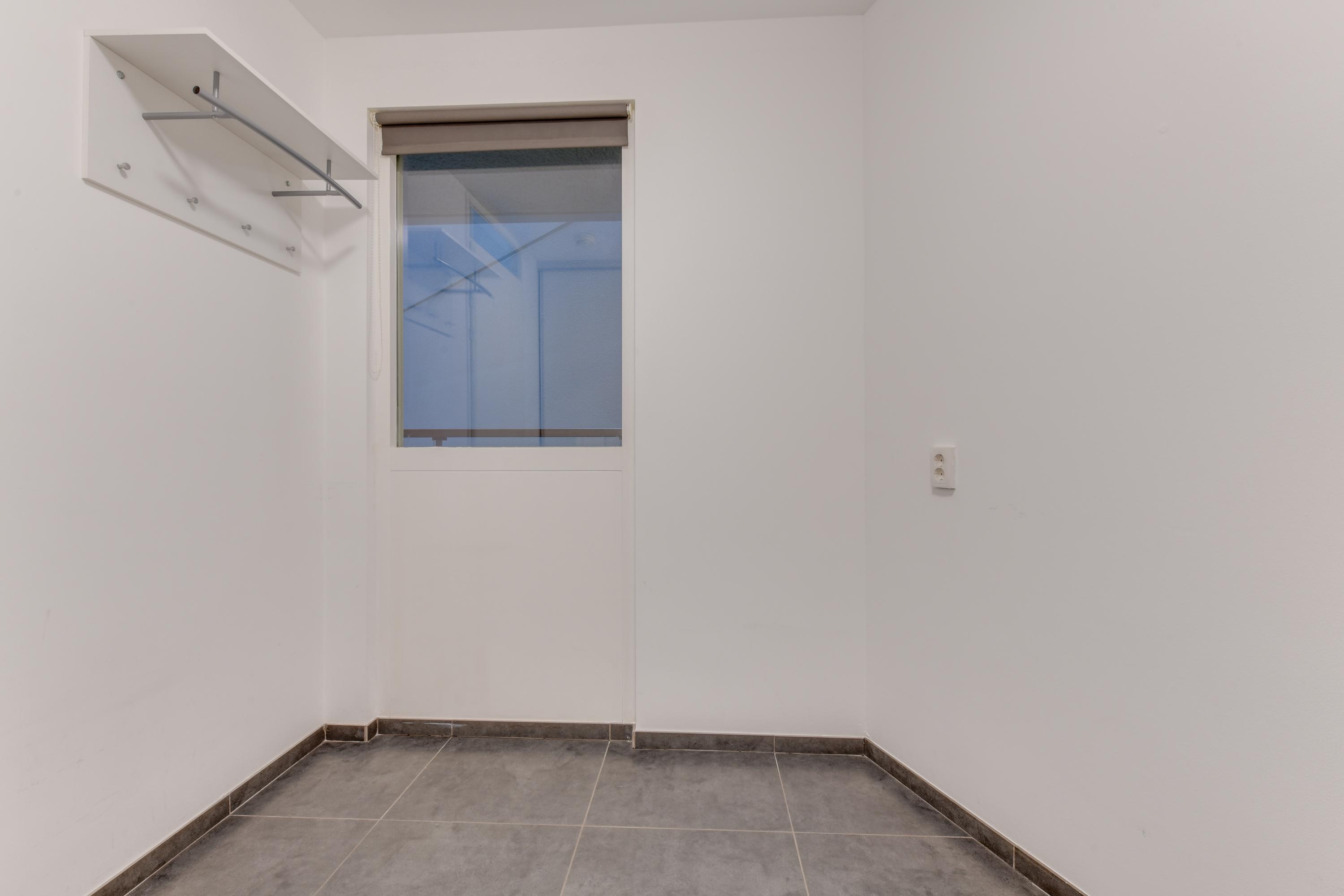 Je betreedt het appartement via de centrale entree van het gebouw, waar zich ook de lift bevindt. Op de 1e verdieping kom je binnen in een nette hal die toegang geeft tot het separate toilet, de technische ruimte met warmtepomp en aansluitingen voor de wasmachine plus een aparte berging/slaapkamer.