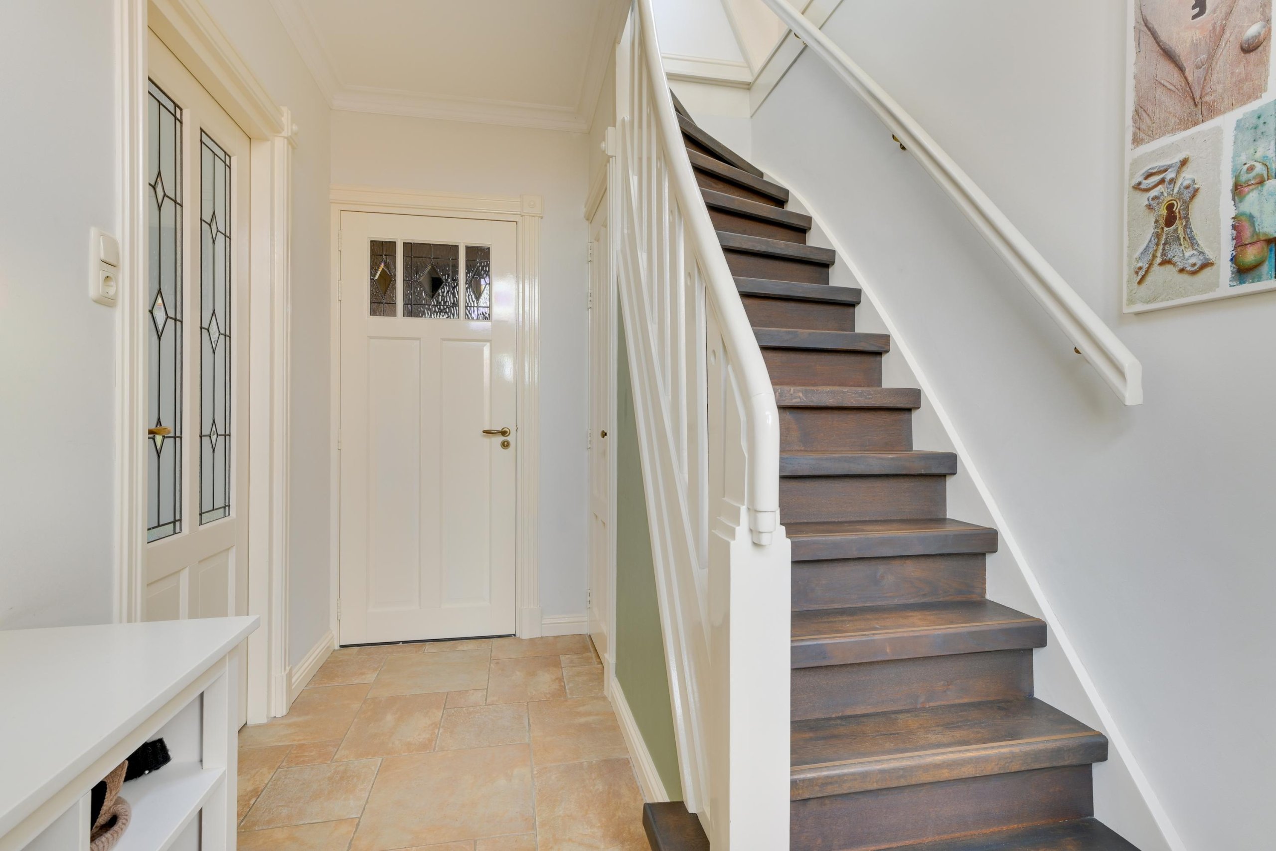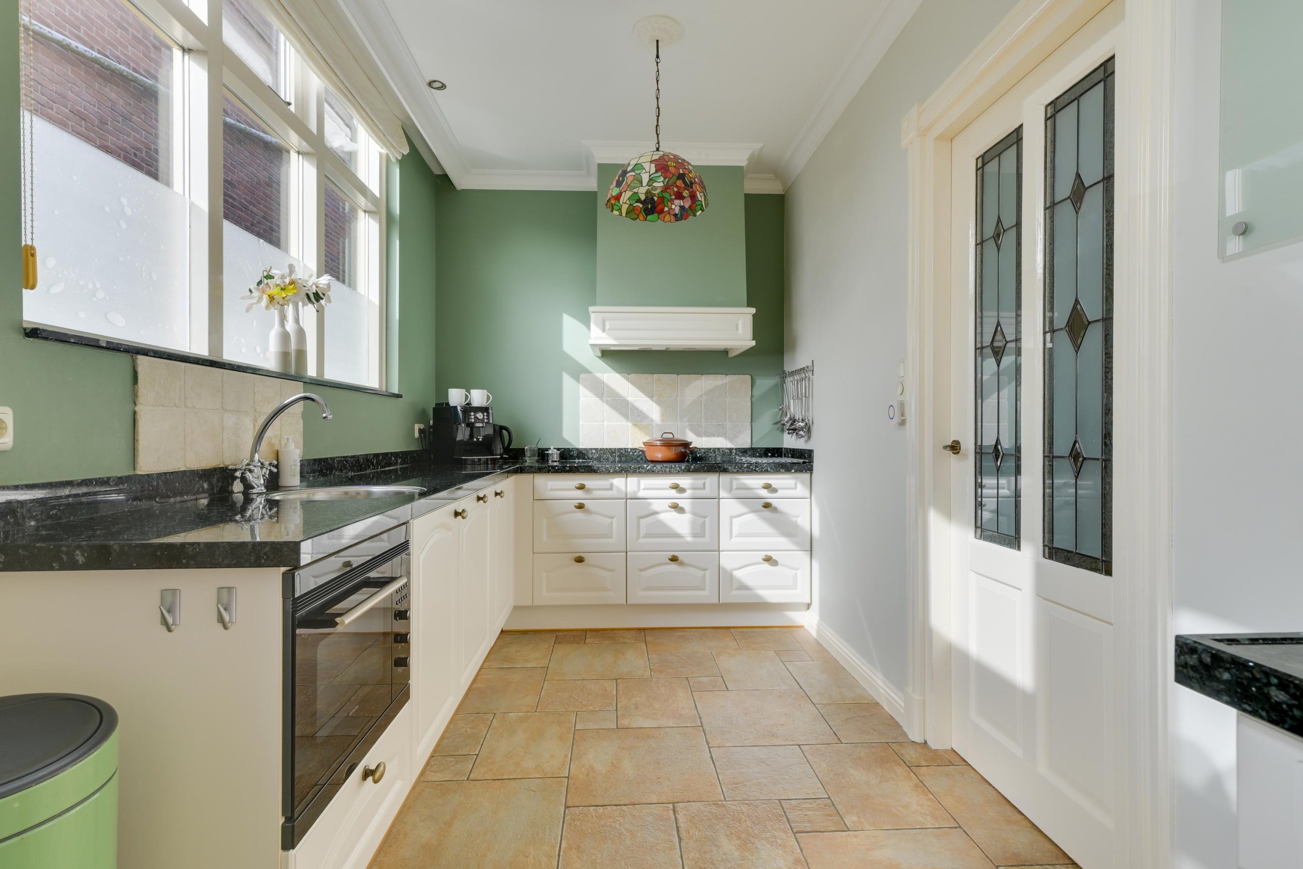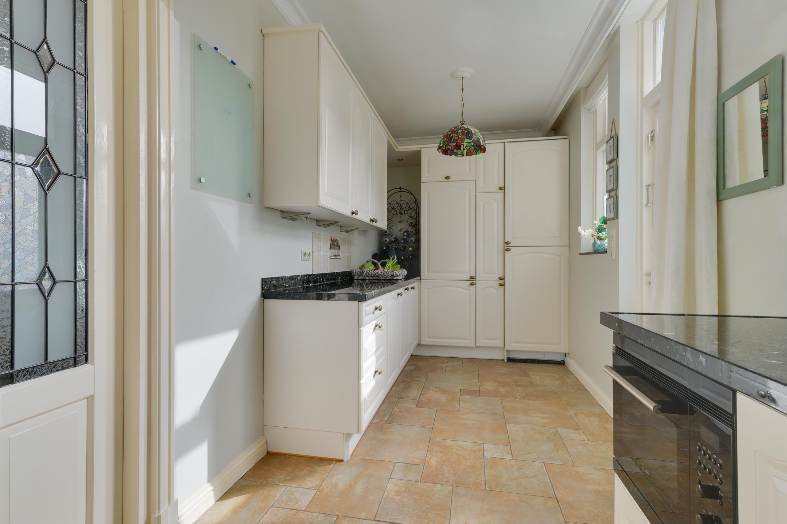 Via de fraaie voordeur met glas-in-loodramen komen we binnen in een royale hal. Hier bevinden zich de trapopgang, de meterkast, een garderobekast en een ruime toiletruimte met hangtoilet en wastafel. Vanuit de hal is er toegang tot de voorkamer. De voorkamer ademt sfeer dankzij authentieke details zoals de erker met glas-in-loodramen, fraaie hardhouten deuren en de karakteristieke en-suite deuren met glas-in-lood naar de achterkamer. De strak gestucte wanden en plafonds met sierlijsten en ornamenten zorgen voor een stijlvolle uitstraling en een echt wauw-effect. Via de en-suite deuren bereiken we de achterkamer, een ruime en lichte leefruimte met eveneens strak afgewerkte wanden en plafonds. De kamer beschikt over prachtige hardhouten tuindeuren naar de tuin en een doorgang naar de keuken.De keuken heeft een landelijk moderne uitstraling en is van alle gemakken voorzien. De keuken bestaat uit twee delen. Het eerste deel is opgesteld in een L-vorm en beschikt over een inductie kookplaat met afzuigkap, een gootsteen, een zwart granieten aanrechtblad, een vaatwasser en veel bergruimte. Het tweede deel, eveneens in een L-opstelling, biedt plaats aan de koel-vriescombinatie, de wasmachineaansluiting en extra kastruimte, aangevuld met een ruim granieten werkblad. Vanuit de keuken is tevens de deur naar de steeg bereikbaar.