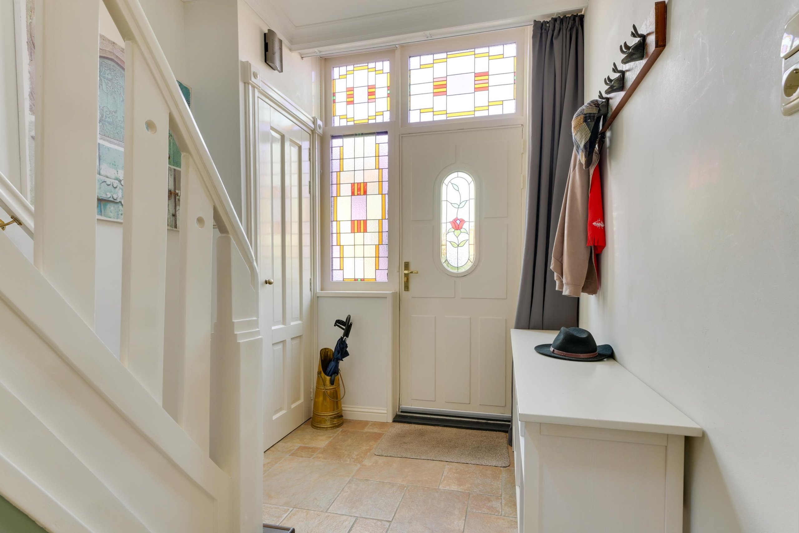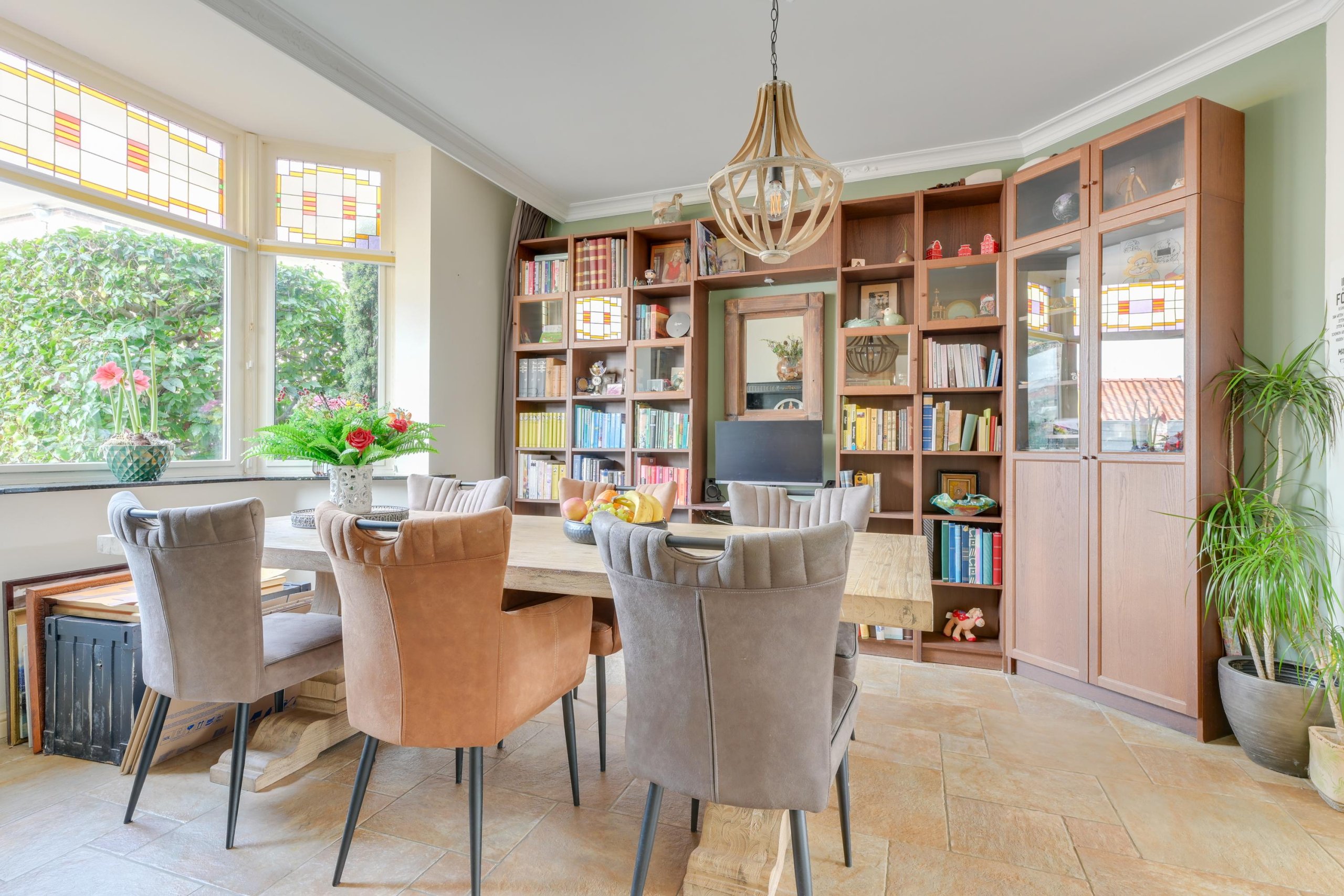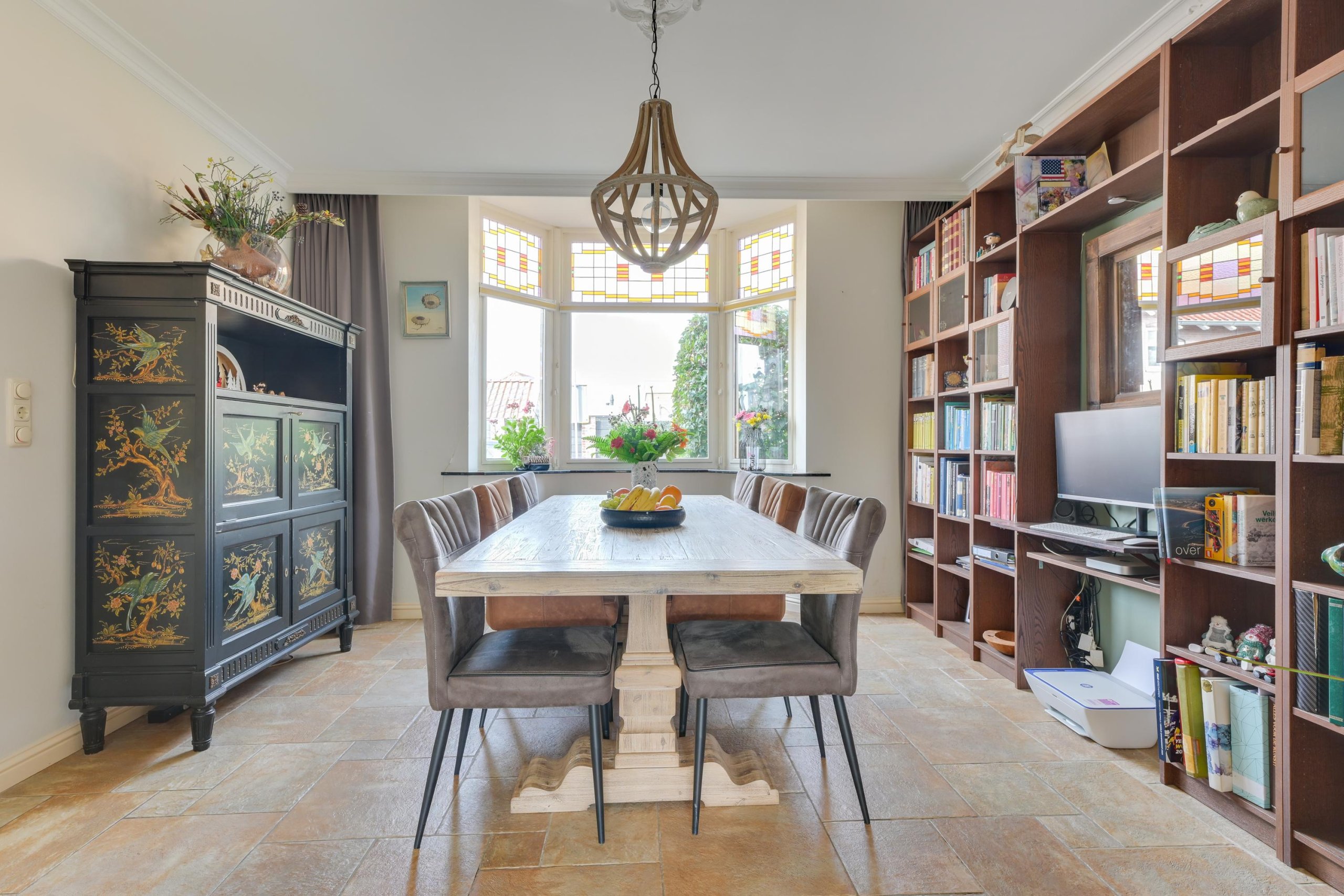 Via de fraaie voordeur met glas-in-loodramen komen we binnen in een royale hal. Hier bevinden zich de trapopgang, de meterkast, een garderobekast en een ruime toiletruimte met hangtoilet en wastafel. Vanuit de hal is er toegang tot de voorkamer. De voorkamer ademt sfeer dankzij authentieke details zoals de erker met glas-in-loodramen, fraaie hardhouten deuren en de karakteristieke en-suite deuren met glas-in-lood naar de achterkamer. De strak gestucte wanden en plafonds met sierlijsten en ornamenten zorgen voor een stijlvolle uitstraling en een echt wauw-effect. Via de en-suite deuren bereiken we de achterkamer, een ruime en lichte leefruimte met eveneens strak afgewerkte wanden en plafonds. De kamer beschikt over prachtige hardhouten tuindeuren naar de tuin en een doorgang naar de keuken.De keuken heeft een landelijk moderne uitstraling en is van alle gemakken voorzien. De keuken bestaat uit twee delen. Het eerste deel is opgesteld in een L-vorm en beschikt over een inductie kookplaat met afzuigkap, een gootsteen, een zwart granieten aanrechtblad, een vaatwasser en veel bergruimte. Het tweede deel, eveneens in een L-opstelling, biedt plaats aan de koel-vriescombinatie, de wasmachineaansluiting en extra kastruimte, aangevuld met een ruim granieten werkblad. Vanuit de keuken is tevens de deur naar de steeg bereikbaar.