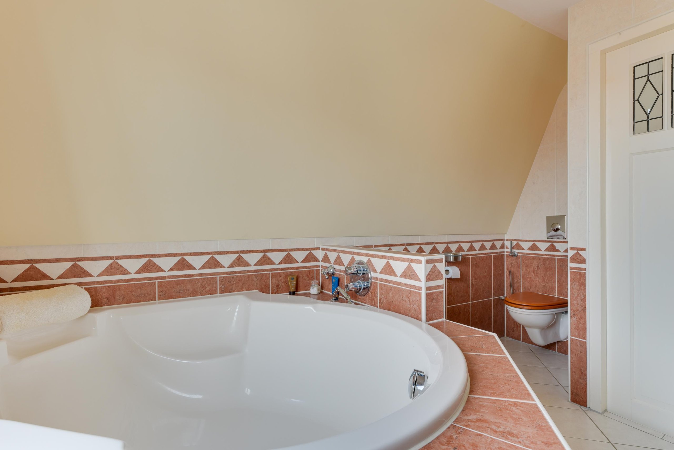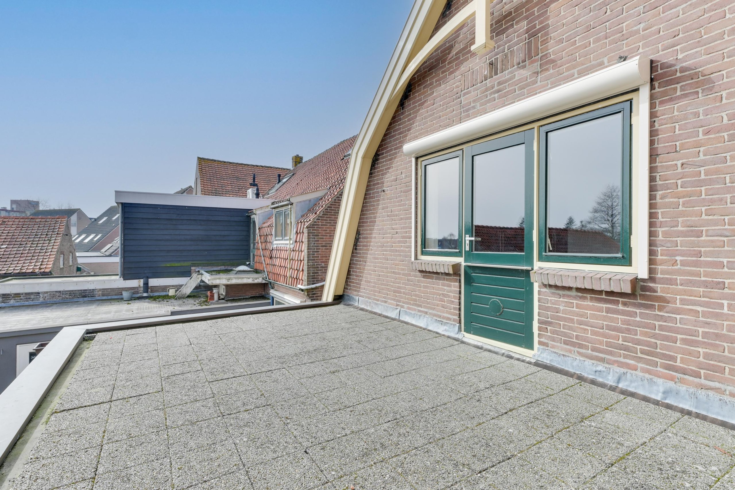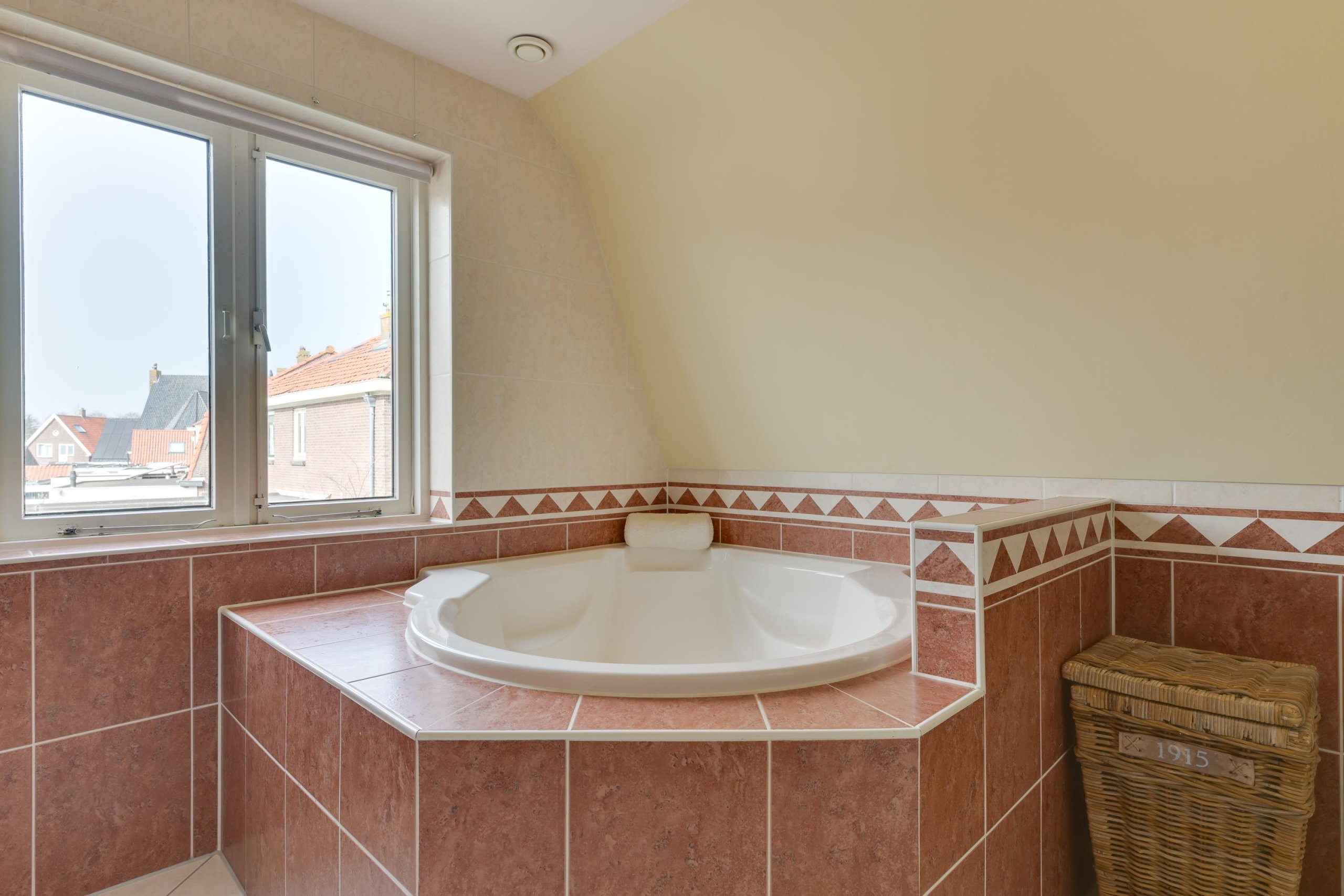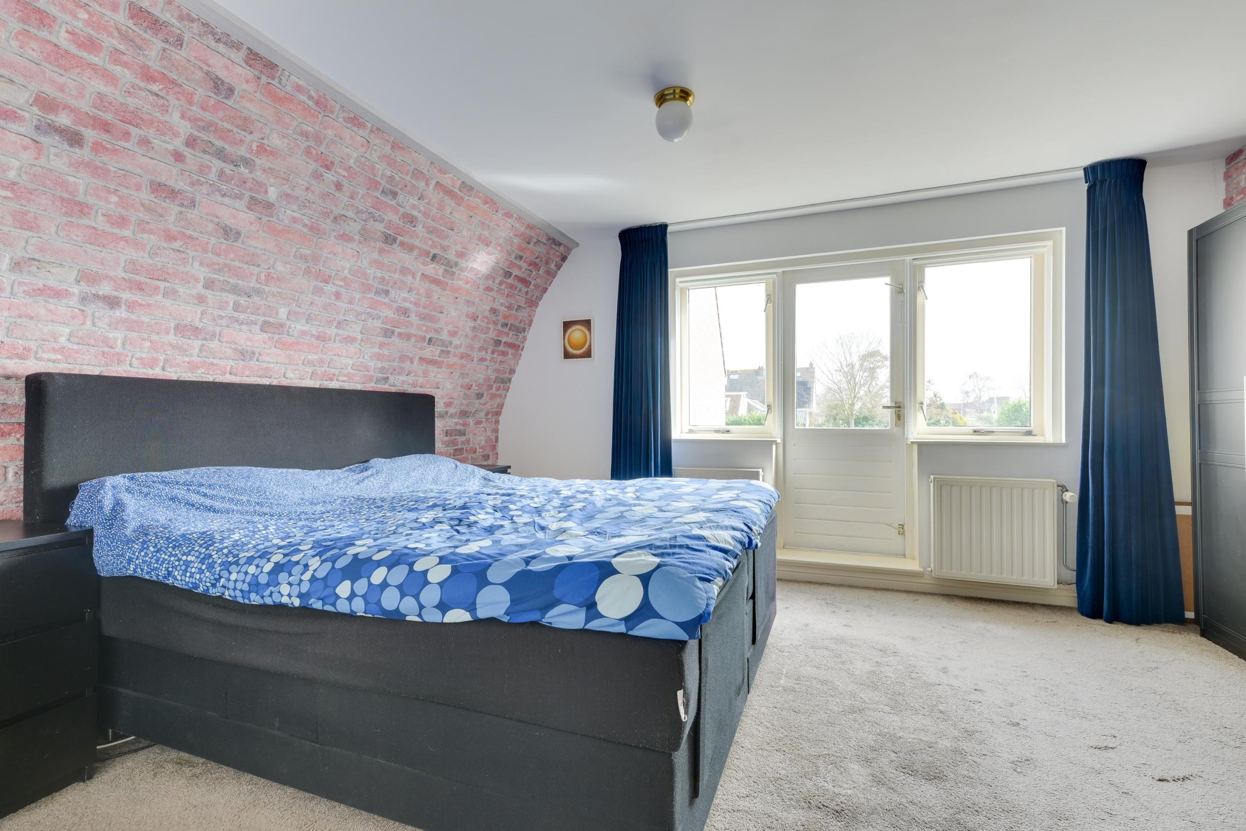 Via de trap bereiken we de overloop, waar door de geplaatste dakkapel een prettige lichtinval is ontstaan. Aan de linkerzijde bevindt zich een slaapkamer aan de voorzijde van de woning. Daarnaast ligt een royale badkamer, uitgerust met een luxe rond bad, een douchehoek, een wastafel en een hangtoilet. De badkamer heeft een moderne en luxe uitstraling dankzij het strak gestucte plafond, de inbouwspots en de verzorgde afwerking. Tegenover de badkamer bevindt zich de master bedroom. Deze kamer is bijzonder ruim (voorheen twee slaapkamers) en heeft directe toegang tot het dakterras. De slaapkamer beschikt over een grote kastenwand. Vanaf hier is er een fraai uitzicht over de tuin en het achtergelegen groen en water.