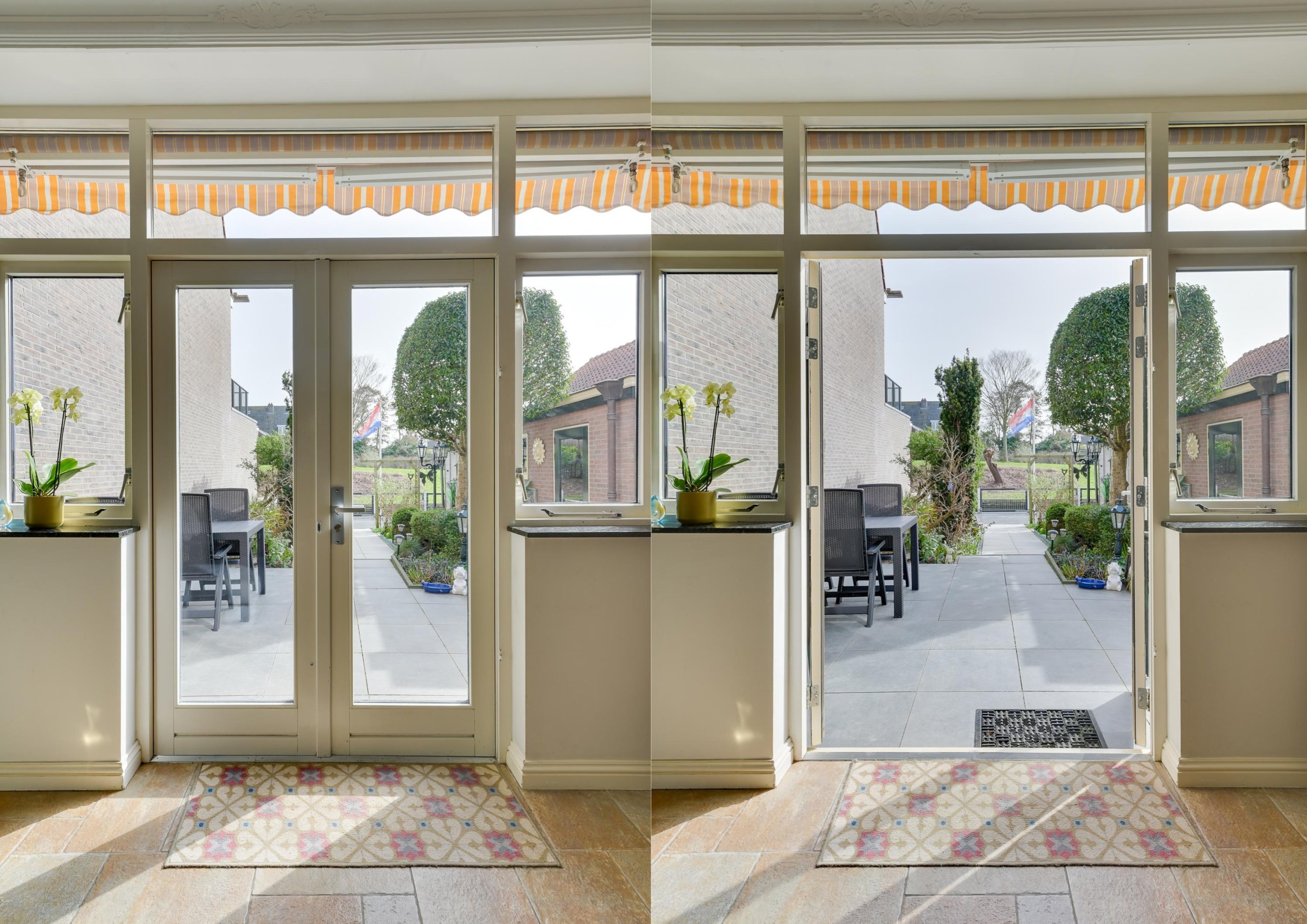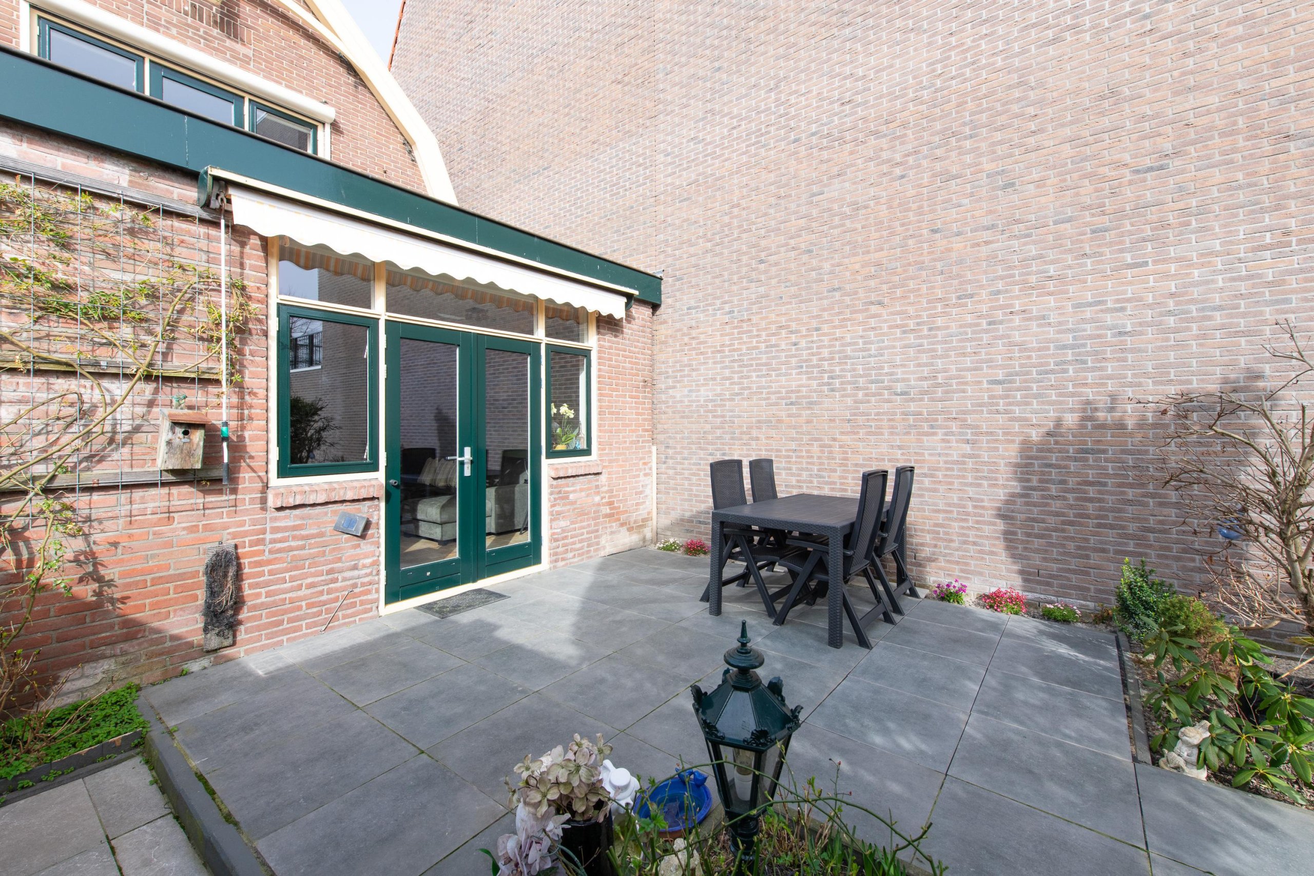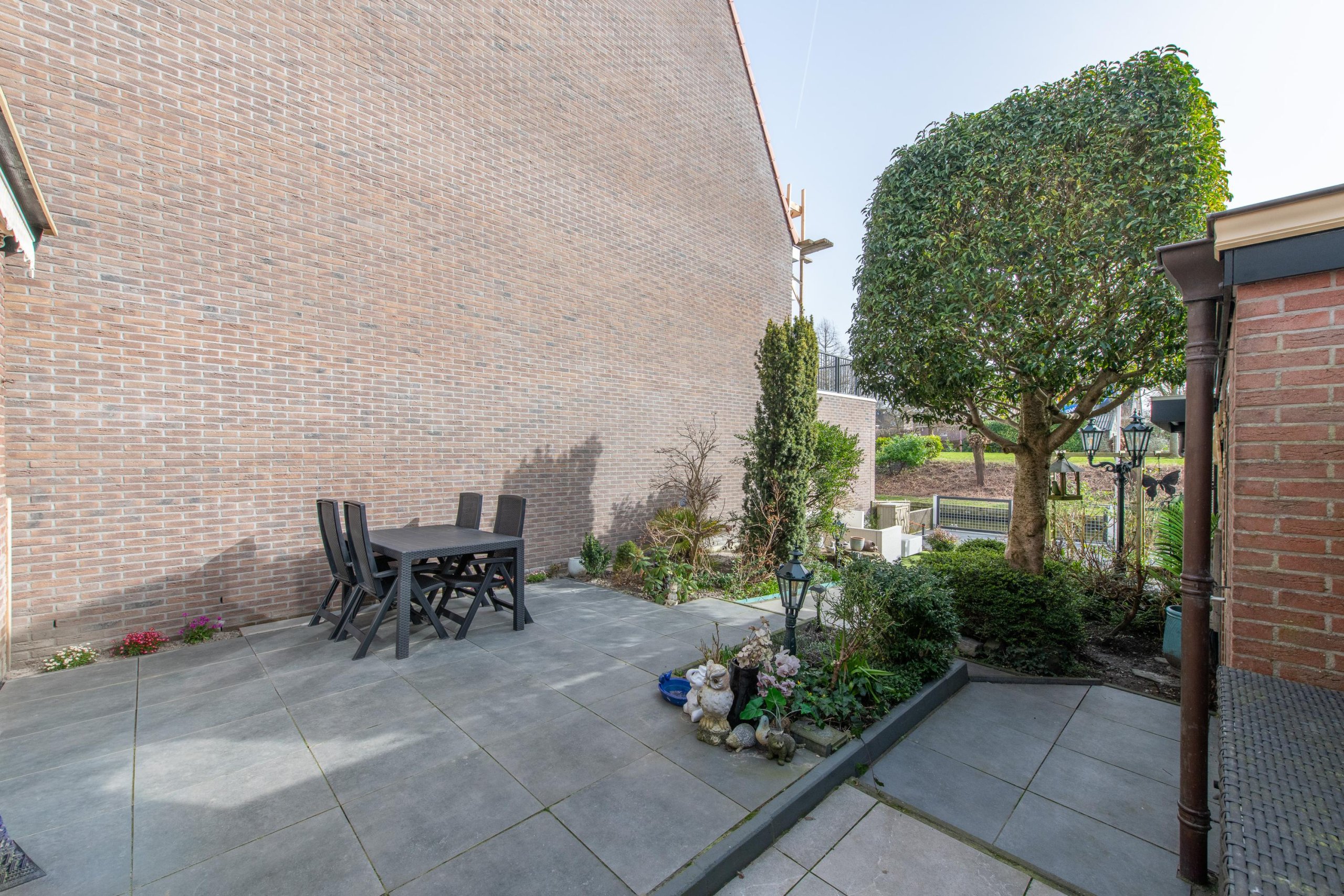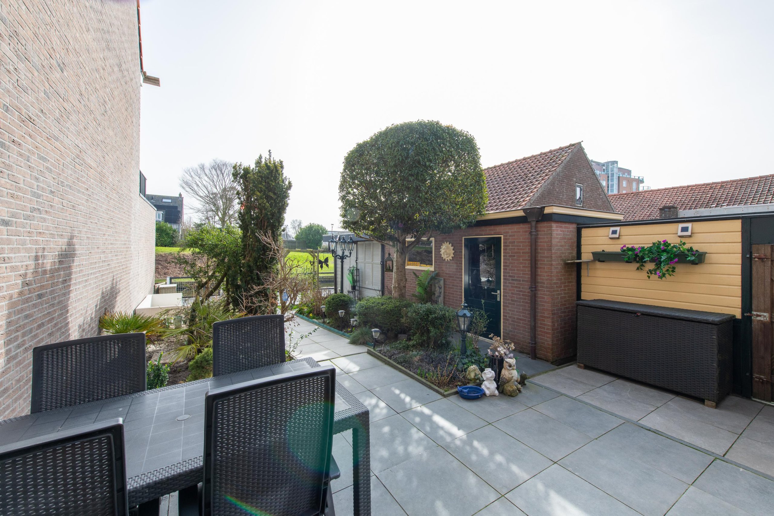 De achtertuin is diep, ligt op het oosten en grenst aan doorgaand vaarwater. Hier kunt u in alle rust genieten van de groene omgeving en het uitzicht op gemeentegroen. De tuin is fraai aangelegd, inclusief drainage, en beschikt over meerdere terrassen. Aan de achtergevel is een grote zonwering bevestigd voor wat schaduw tijdens warme dagen.