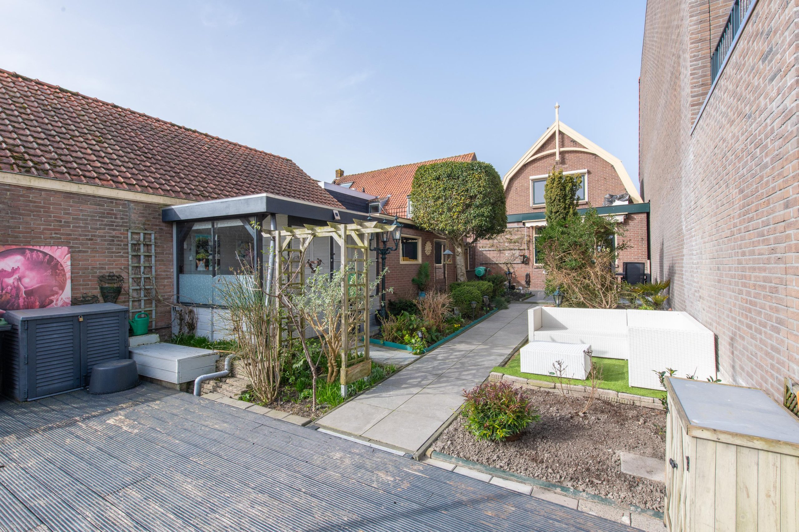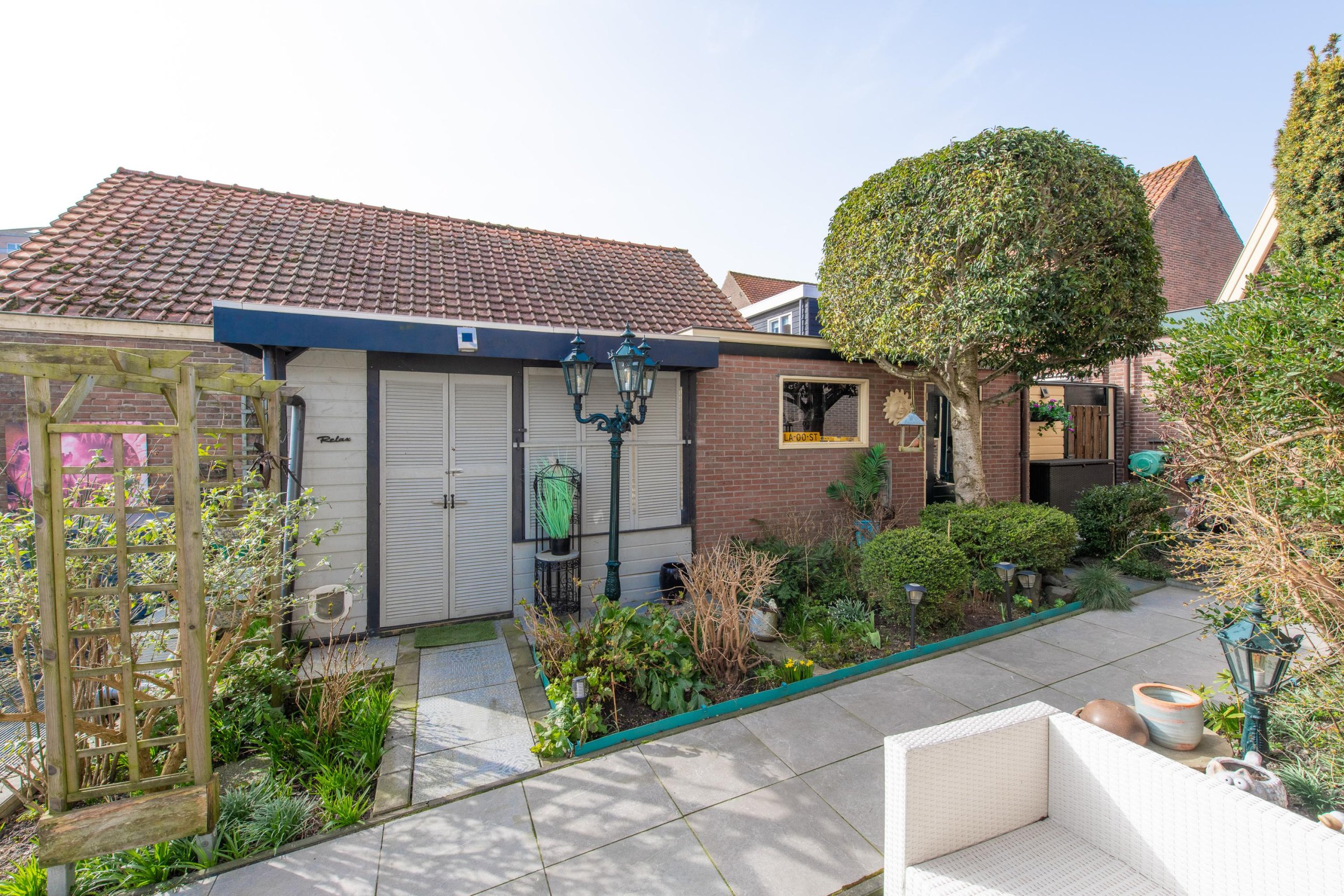 Achter in de tuin staat een stenen schuur, gebouwd in dezelfde stijl als de woning. De schuur is voorzien van een karakteristieke regenpijp met vergaarbak en biedt voldoende ruimte voor bijvoorbeeld een motor of meerdere fietsen. Naast deze berging is er een gezellige tuinkamer gerealiseerd.