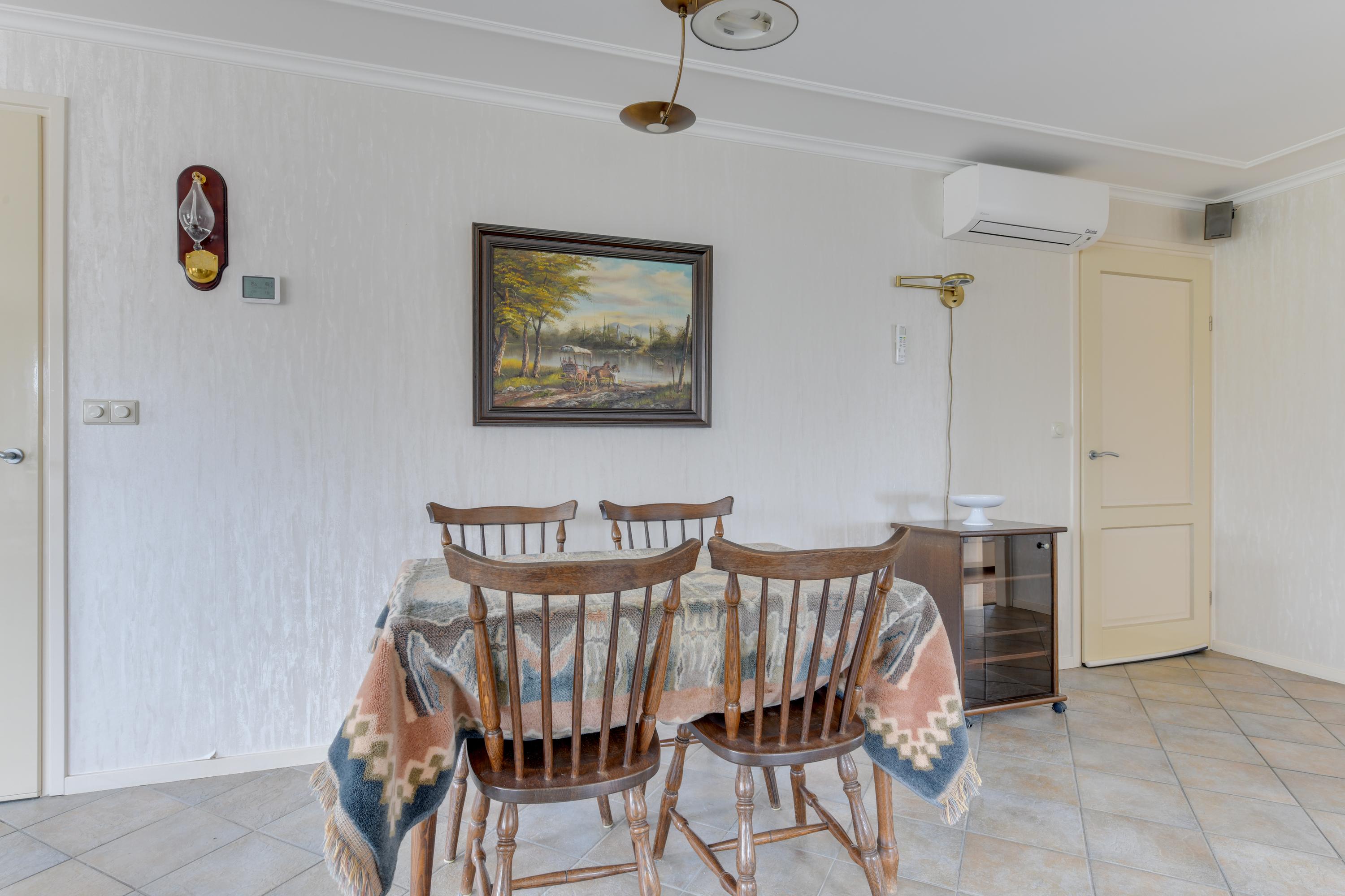 Je komt binnen in een ruime hal met meterkast, toiletruimte, toegang tot de woonkamer en de trap naar de eerste verdieping. De lichte woonkamer is aan de straatzijde gelegen en beschikt over een sfeervolle erker, een plavuizenvloer met vloerverwarming, een gashaard en airconditioning. Aangrenzend bevindt zich de keuken, uitgevoerd in een hoekopstelling en voorzien van diverse inbouwapparatuur, zoals een inductiekookplaat, afzuigkap, vaatwasser en magnetron.
