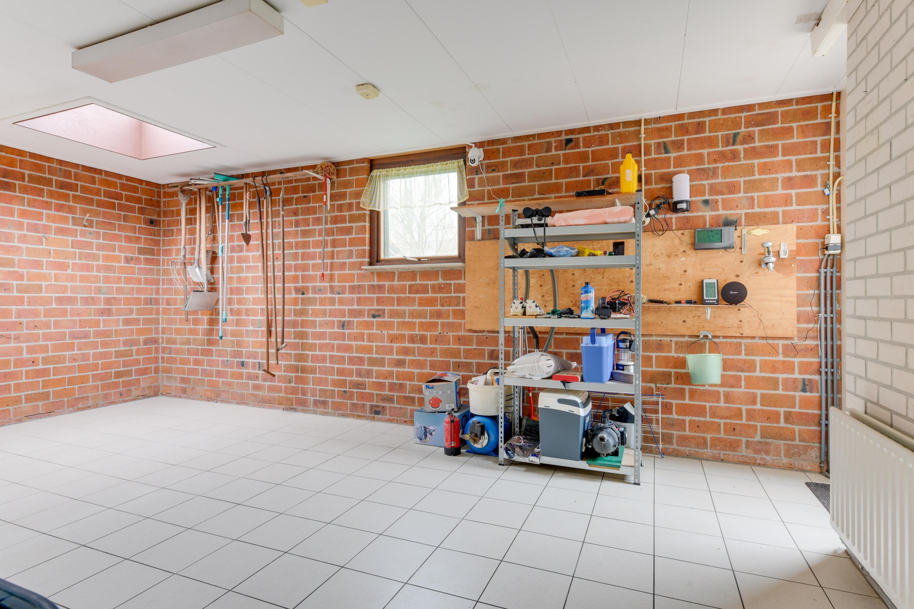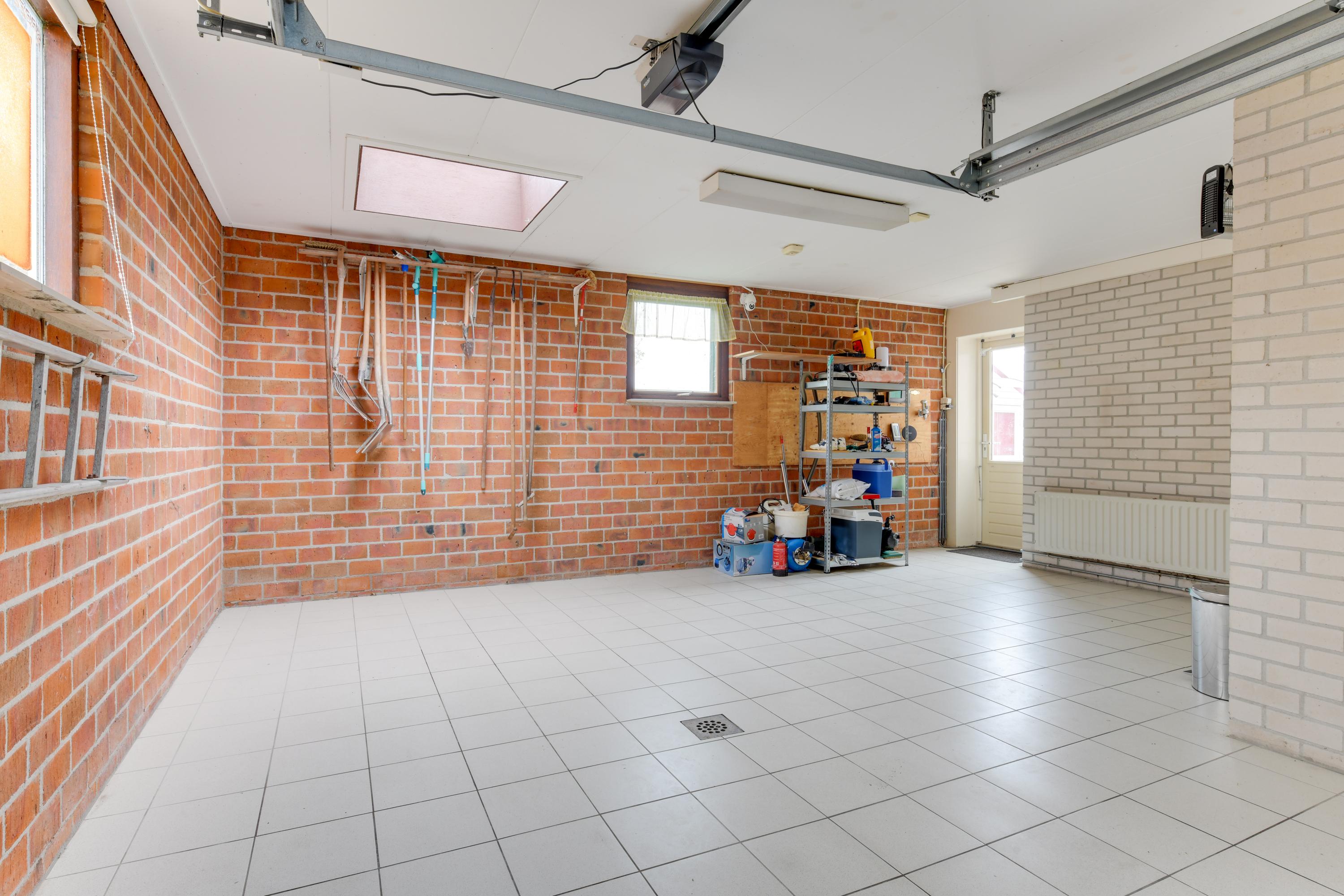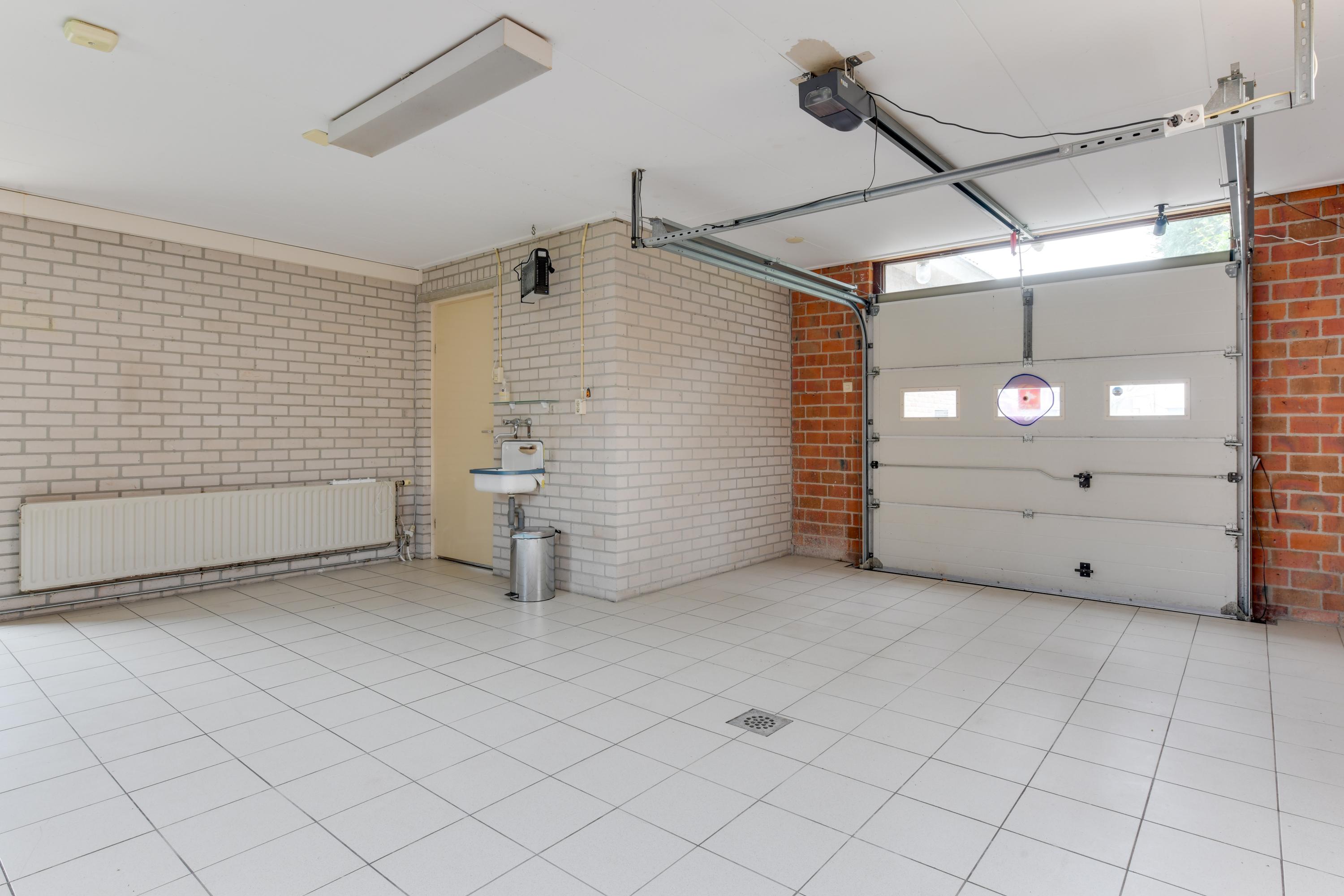 De bijkeuken biedt toegang tot de inpandige garage (ca. 40m2), die is uitgerust met een elektrische garagedeur, plavuizenvloer (deels met vloerverwarming), een lichtkoepel, verwarming en een gootsteen.