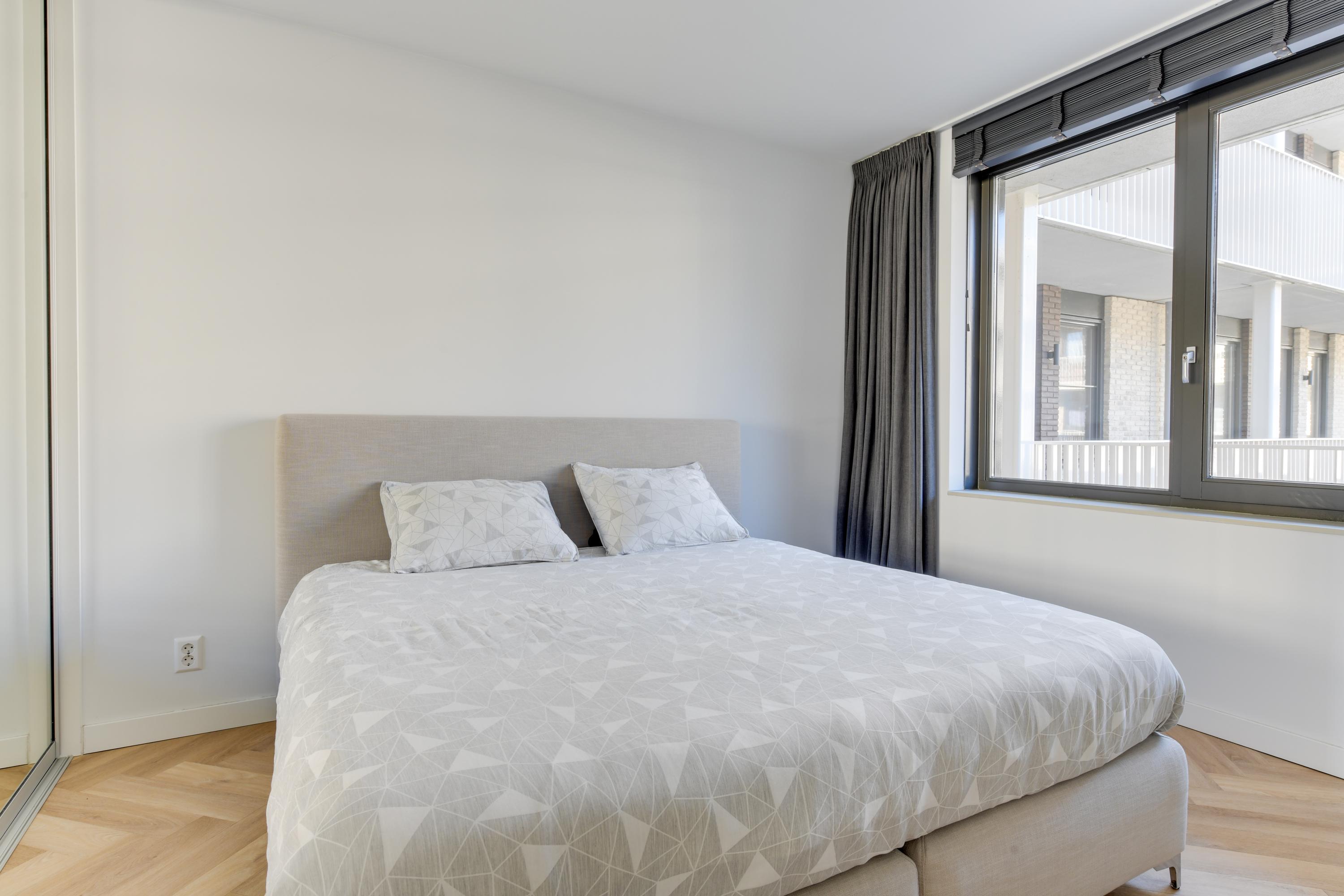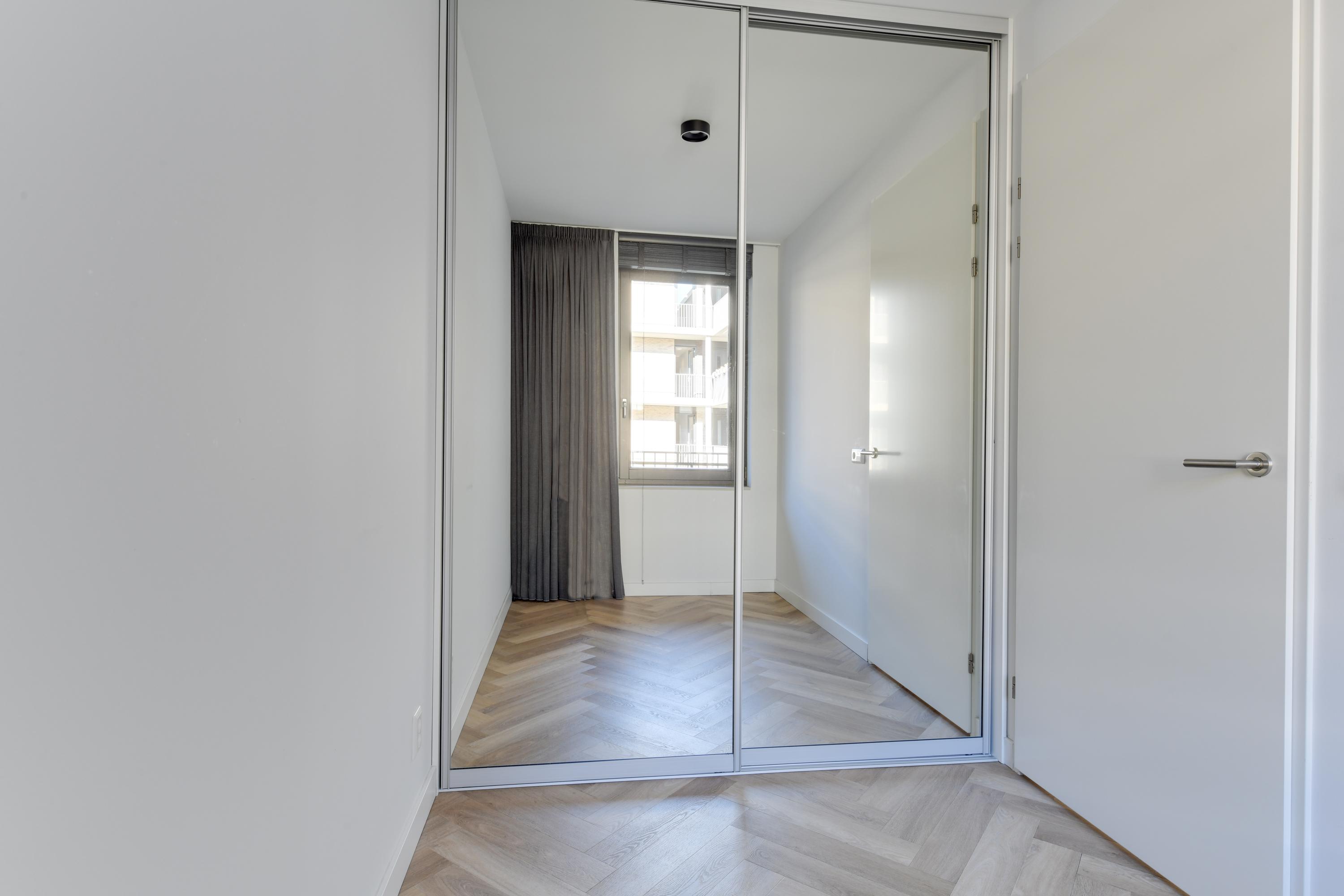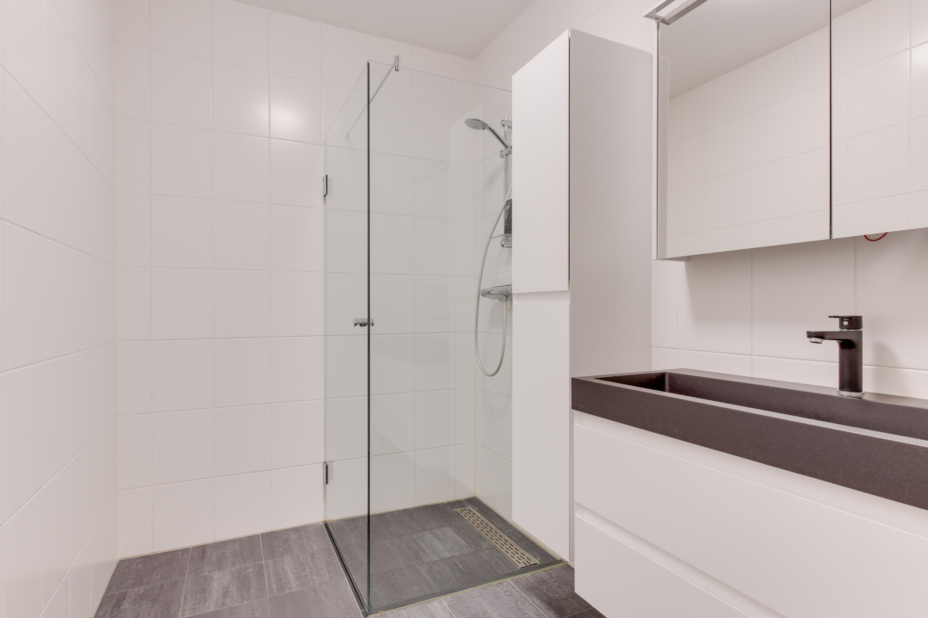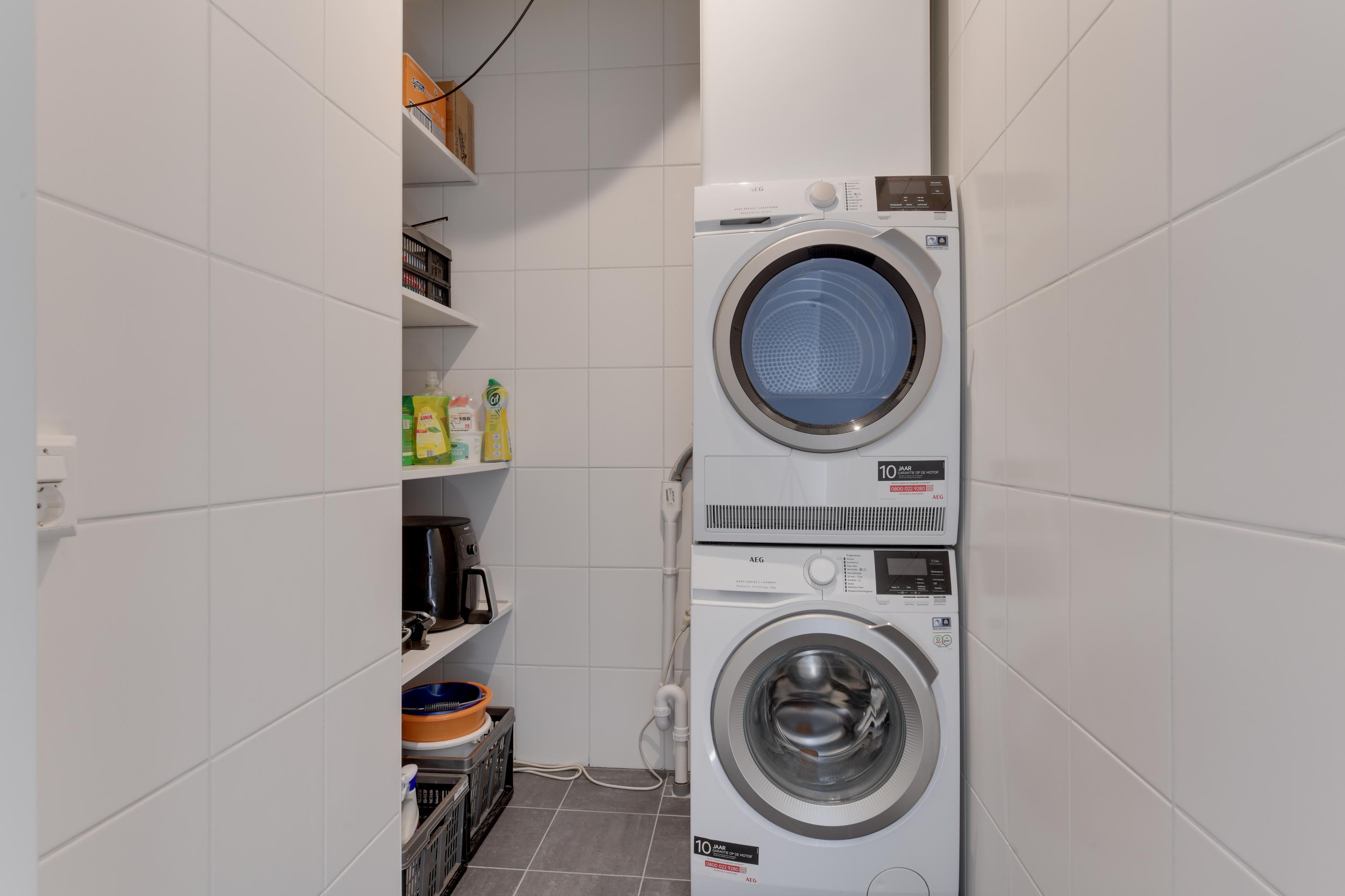 Indeling: via de lift of trap bereik je de tweede etage. Een maal binnen loop je via de hal naar alle vertrekken toe. Er zijn twee ruime slaapkamers aanwezig beiden met een mooie vaste kast. Vervolgens tref je het moderne toilet aan, de berging annex wasruimte met de opstelling van de wasmachine en droger maar ook opbergruimte en tot slot de ruime badkamer met inloopdouche en wastafel. De badkamer is vanuit de bouw een stukje vergroot. Aan het einde van de hal bevindt zich de woonkamer welke door de grote raampartijen volop daglicht ontvangt. De wanden en plafonds van de woonkamer zijn, net zoals de rest van het appartement, allemaal gestuct en strak afgewerkt. Via de woonkamer is het balkon bereikbaar waar je rustig van de zon kunt genieten en een fraai uitzicht over de omgeving hebt. De keuken staat in open verbinding met de woonkamer en is voorzien van allerlei inbouwapparatuur zoals een vaatwasser, afzuigkap, inductie kookplaat, koelkast en combimagnetron.