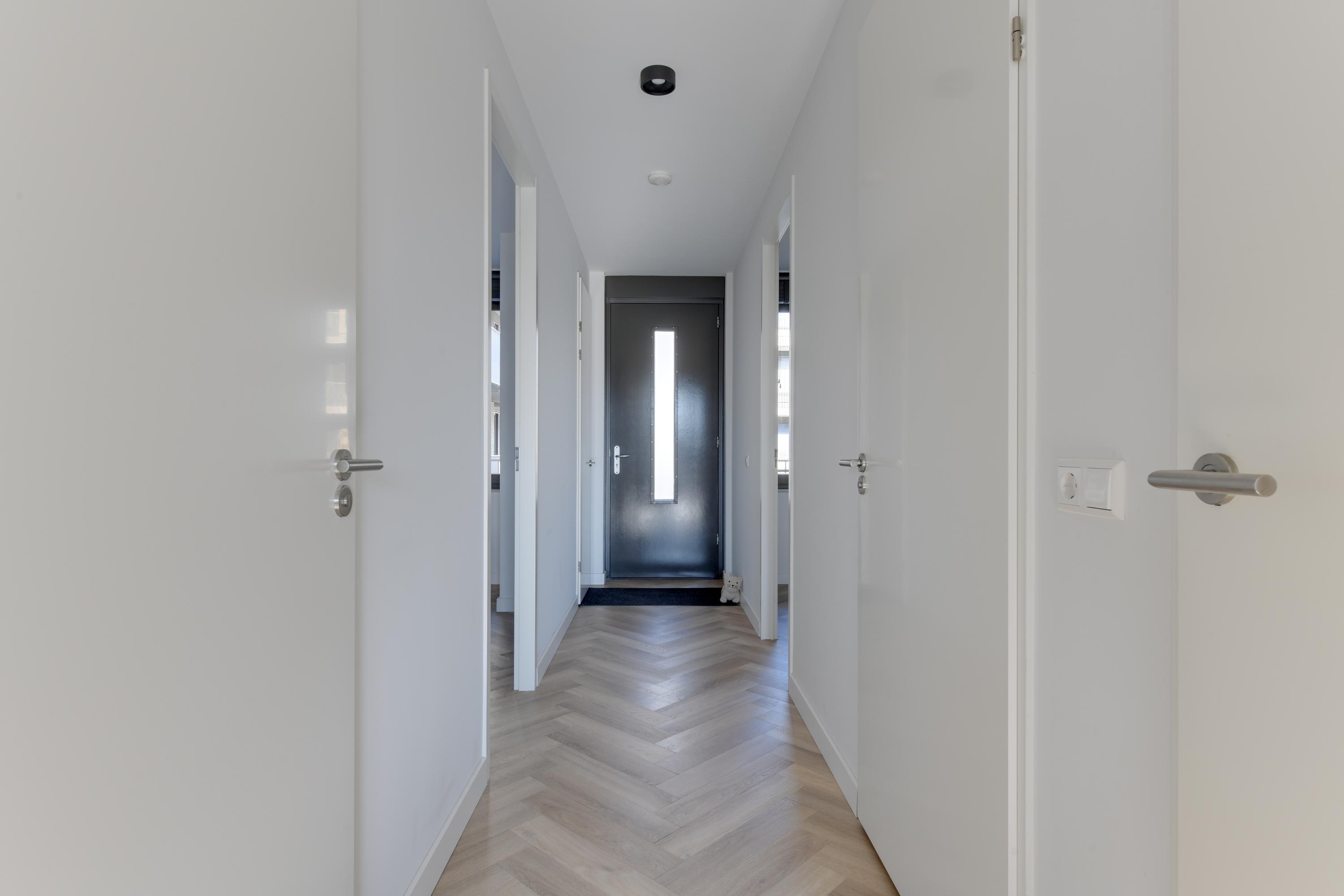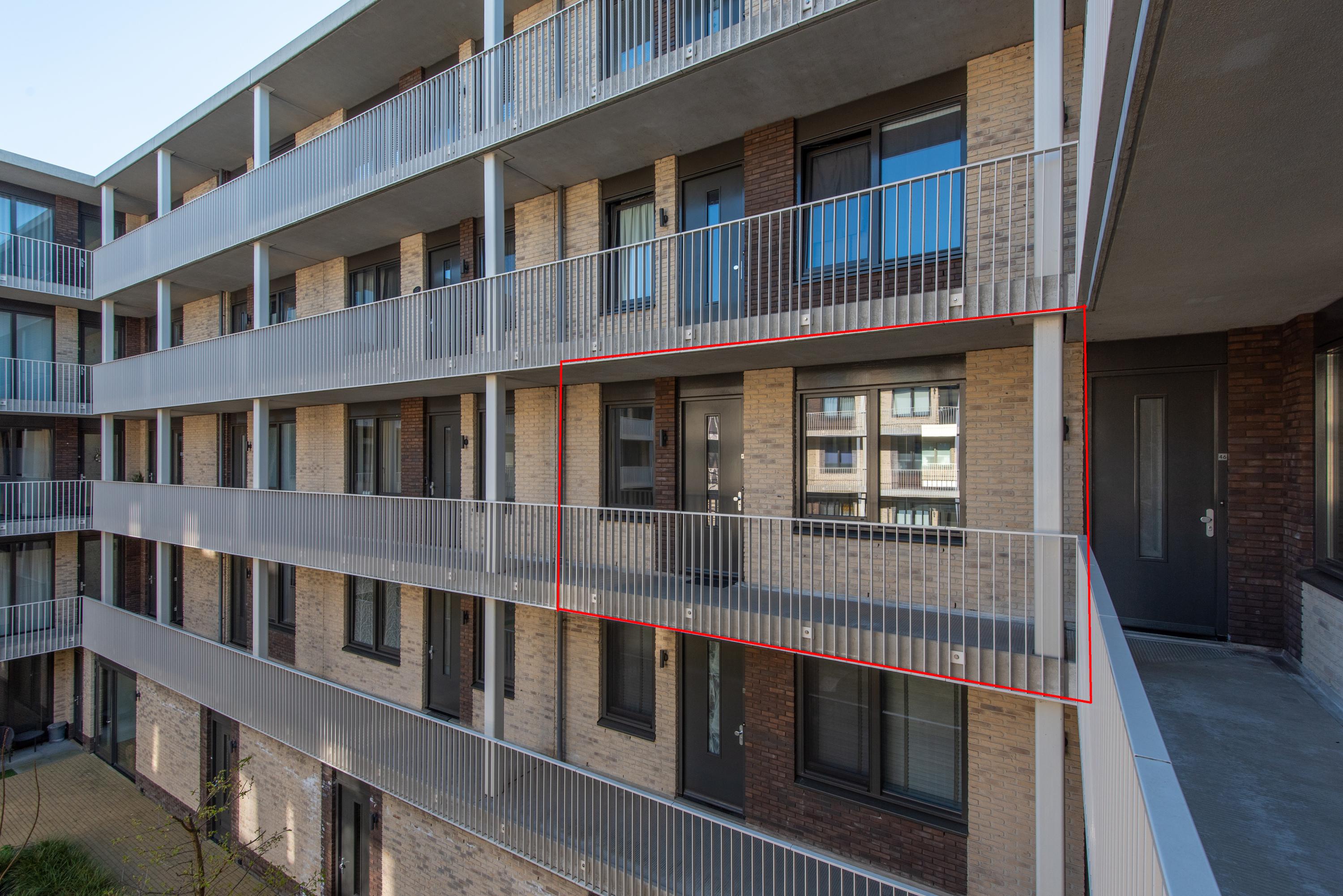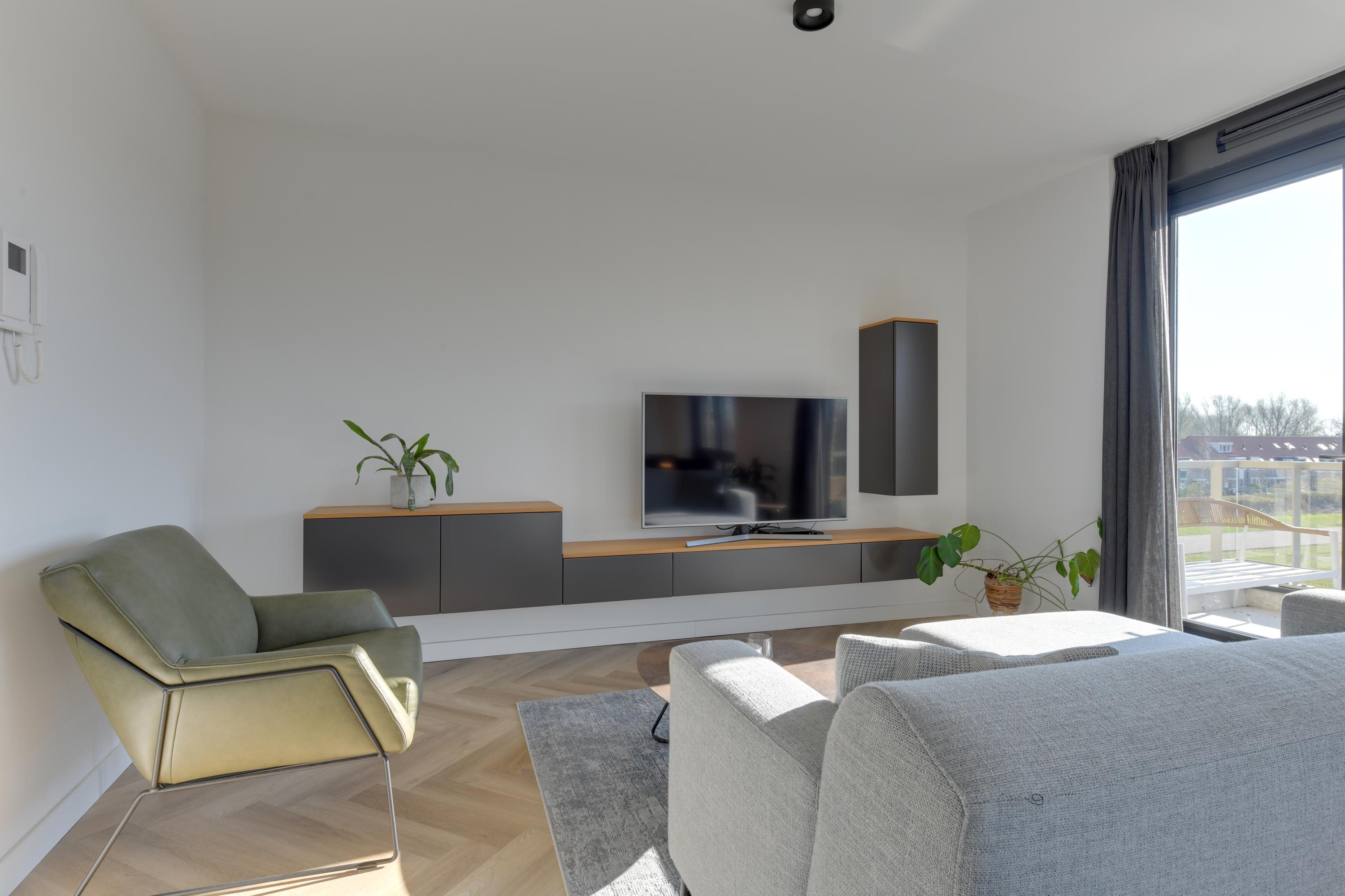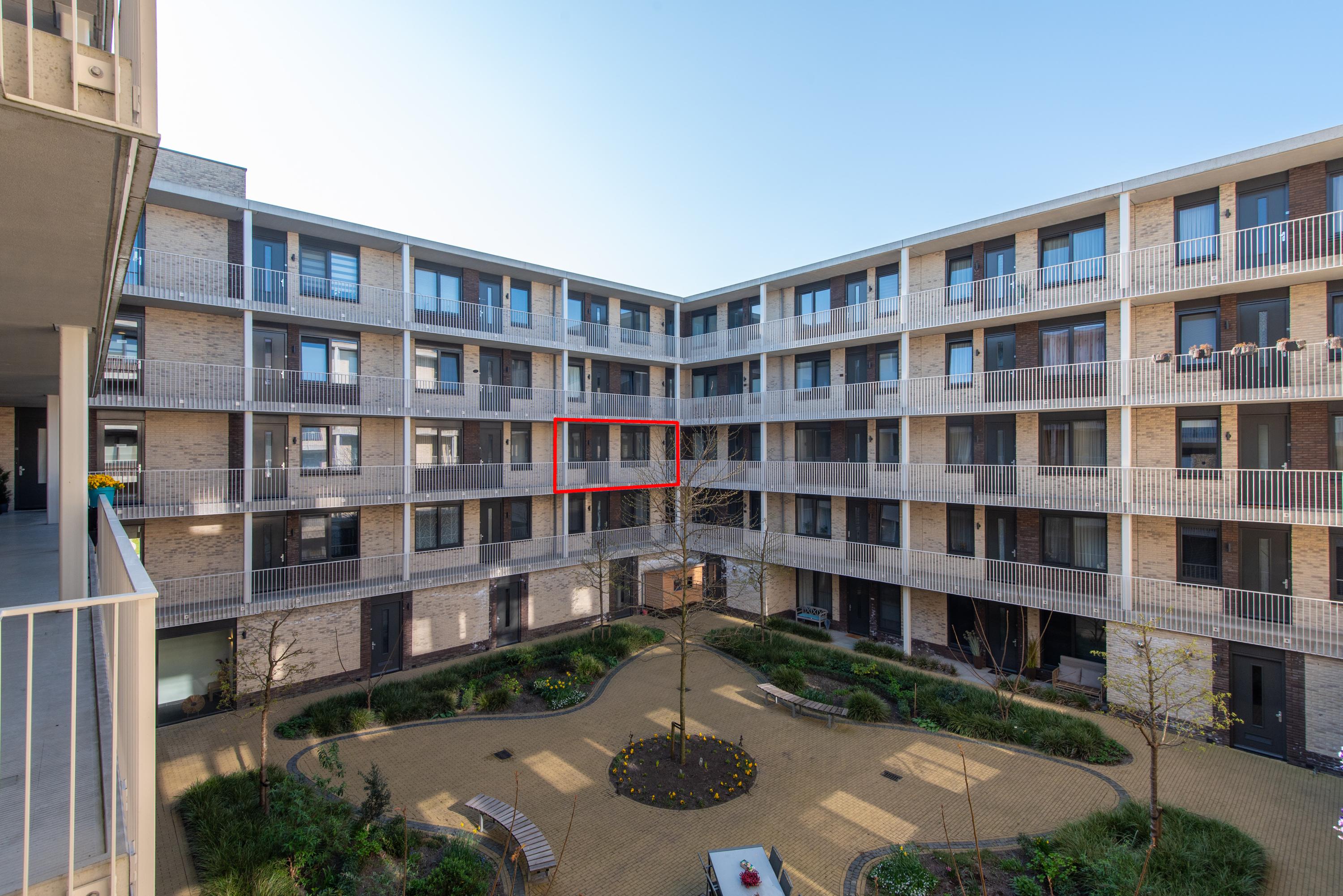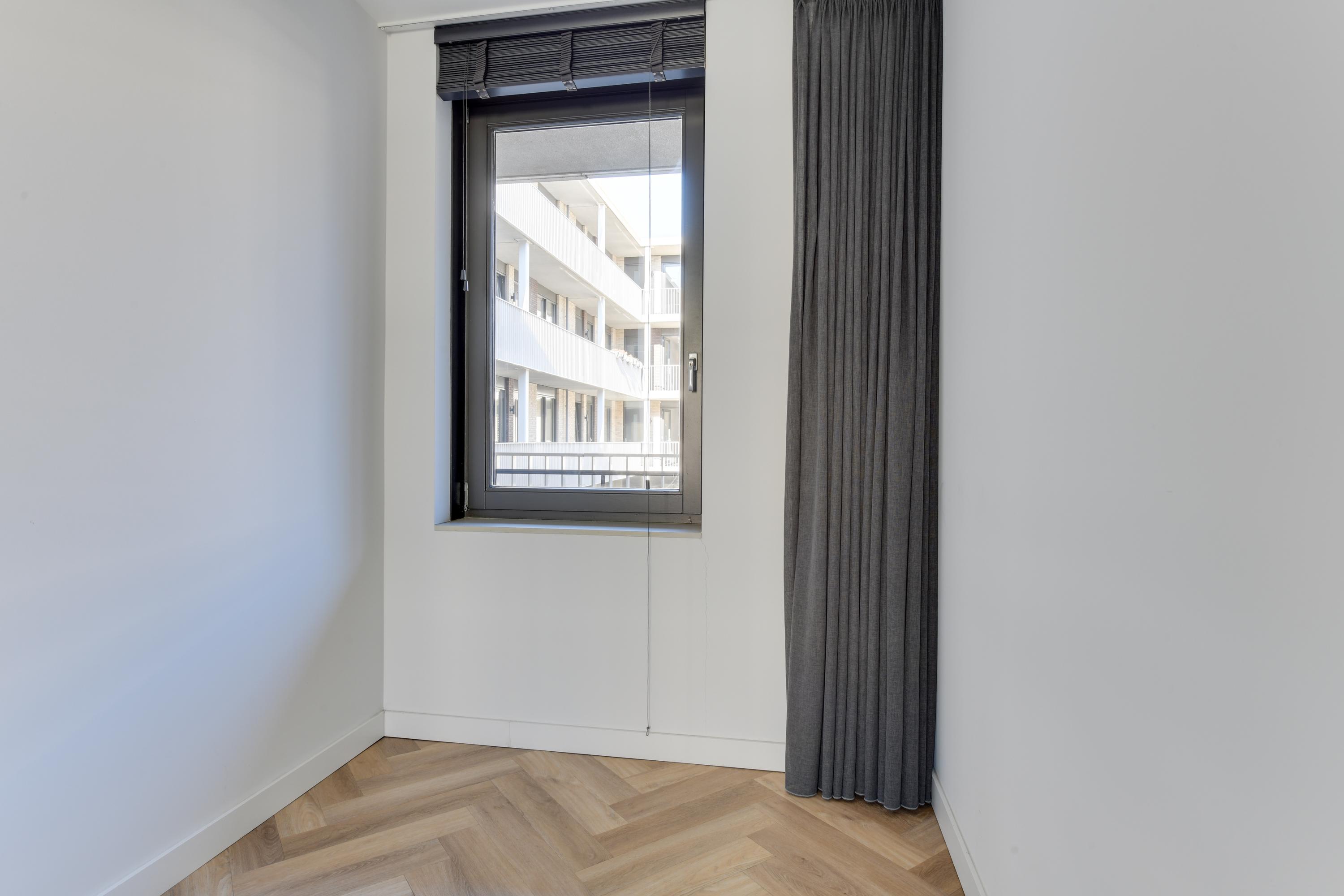 Indeling: via de lift of trap bereik je de tweede etage. Een maal binnen loop je via de hal naar alle vertrekken toe. Er zijn twee ruime slaapkamers aanwezig beiden met een mooie vaste kast. Vervolgens tref je het moderne toilet aan, de berging annex wasruimte met de opstelling van de wasmachine en droger maar ook opbergruimte en tot slot de ruime badkamer met inloopdouche en wastafel. De badkamer is vanuit de bouw een stukje vergroot. Aan het einde van de hal bevindt zich de woonkamer welke door de grote raampartijen volop daglicht ontvangt. De wanden en plafonds van de woonkamer zijn, net zoals de rest van het appartement, allemaal gestuct en strak afgewerkt. Via de woonkamer is het balkon bereikbaar waar je rustig van de zon kunt genieten en een fraai uitzicht over de omgeving hebt. De keuken staat in open verbinding met de woonkamer en is voorzien van allerlei inbouwapparatuur zoals een vaatwasser, afzuigkap, inductie kookplaat, koelkast en combimagnetron.