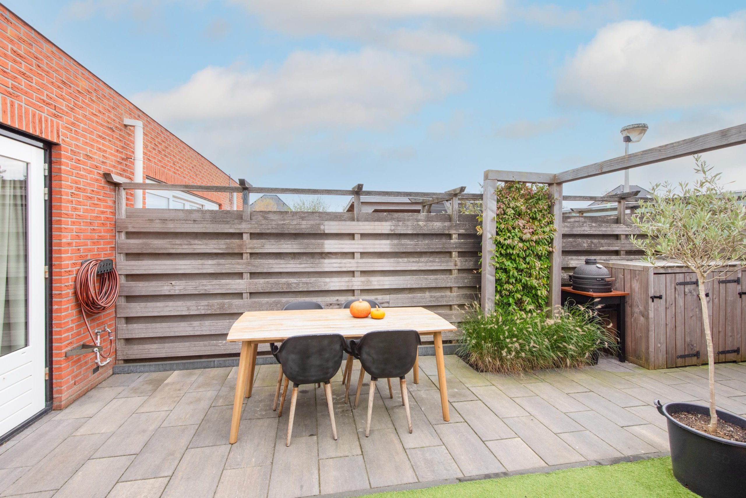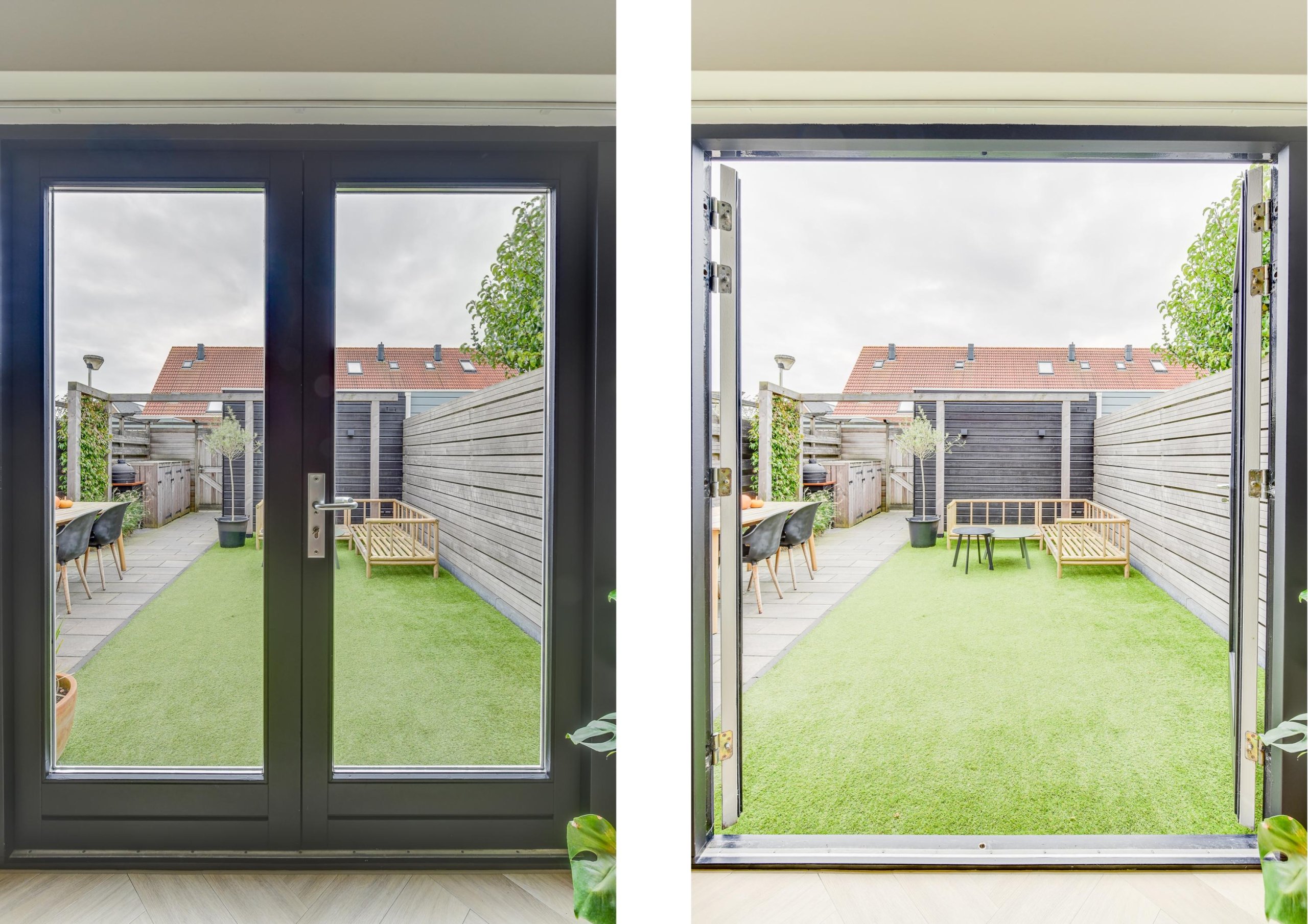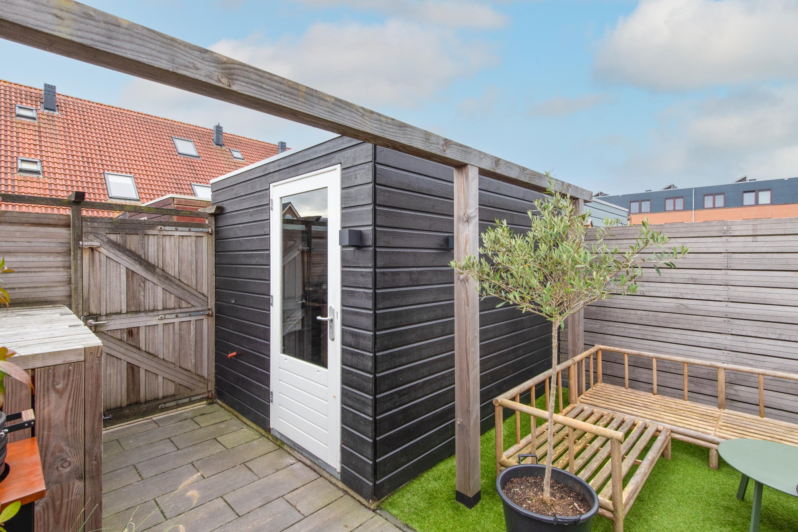 De zonnige achtertuin ligt op het zuiden en is keurig aangelegd. Je kunt hier de hele dag door van de zon genieten. De tuin is voorzien van een berging en een achterom.