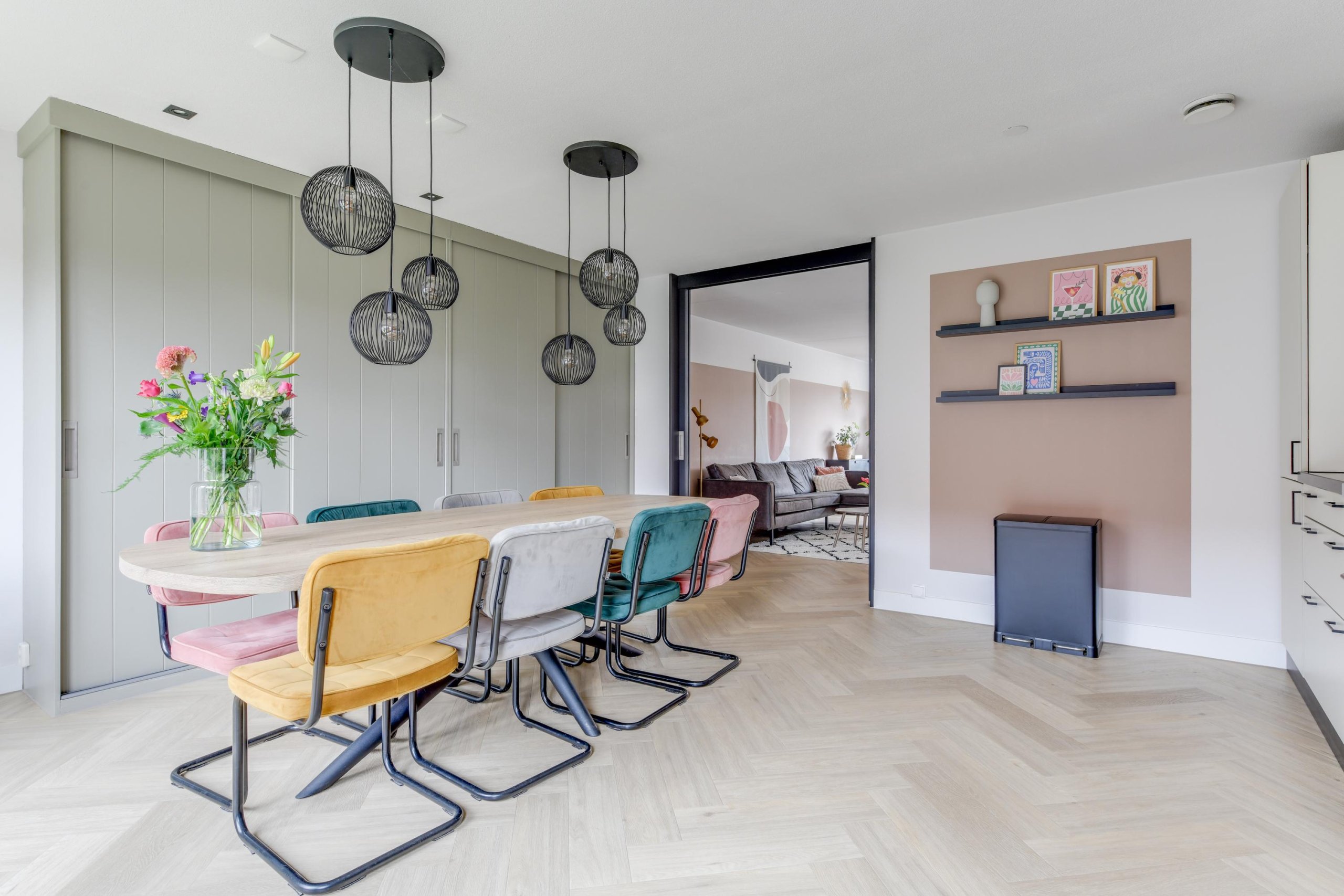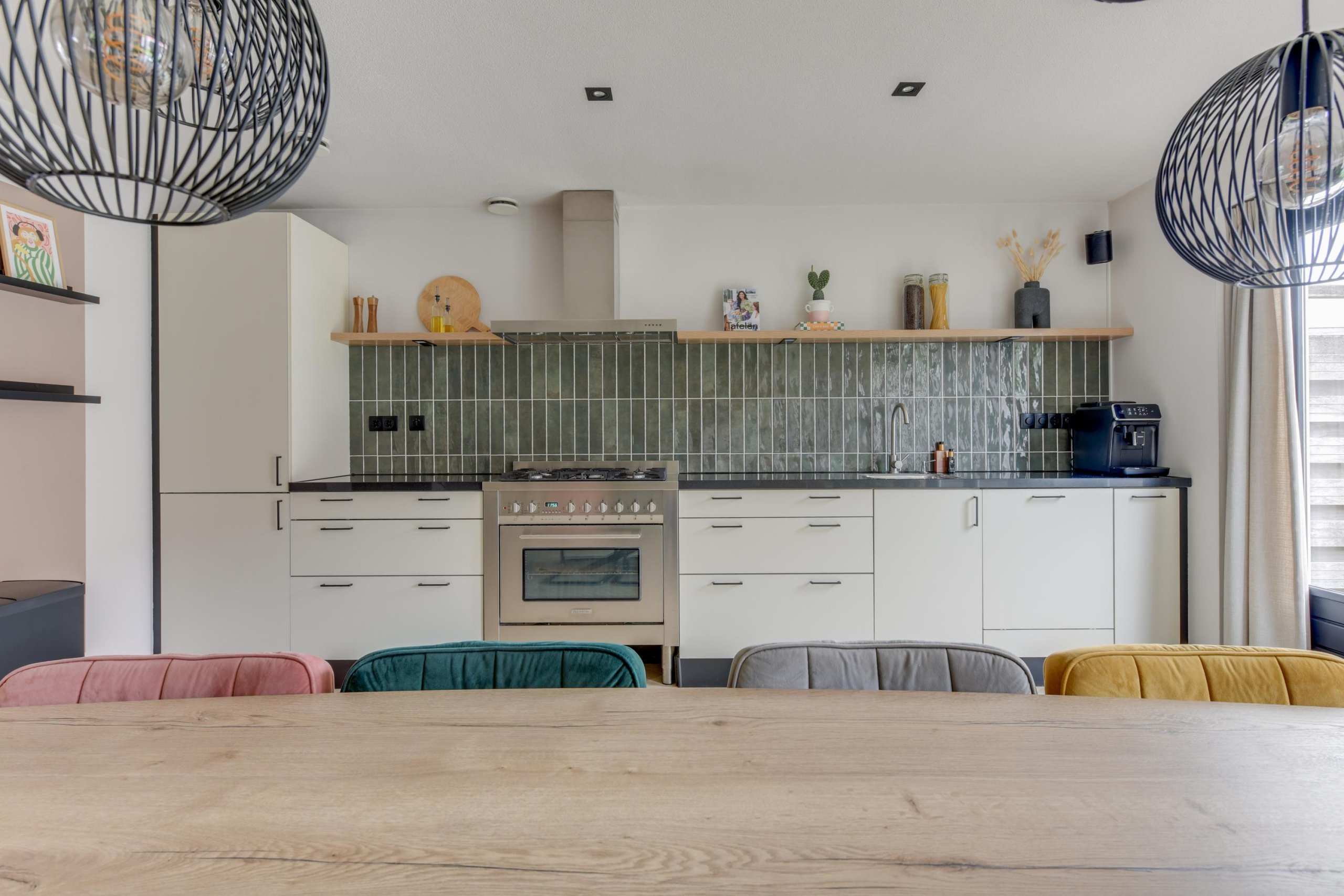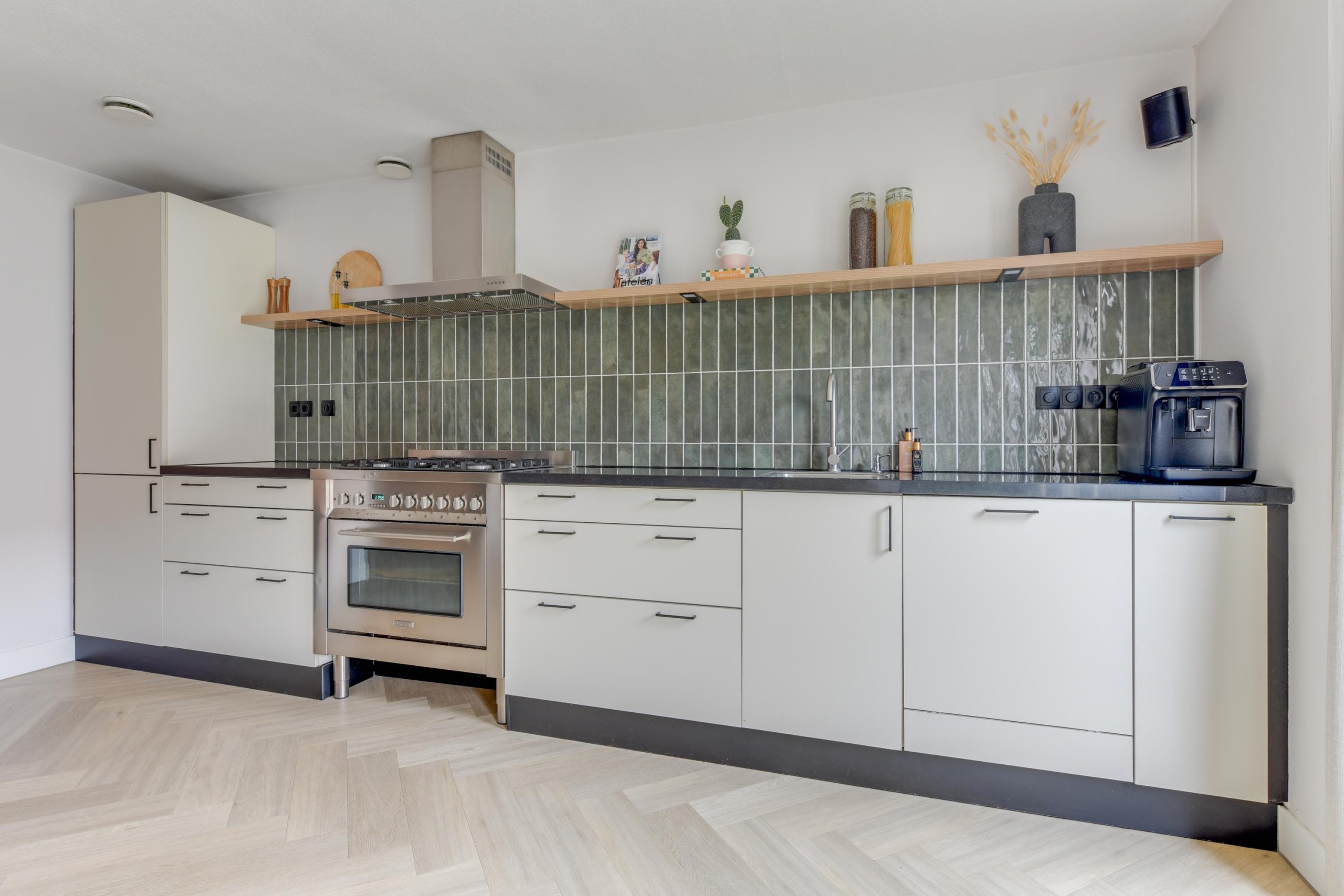 Via de hal met meterkast bereik je de sfeervolle woonkamer. De visgraat pvc vloer en paneeldeuren zorgen direct voor een luxe uitstraling. In de woonkamer bevindt zich een praktische trapkast, ideaal voor extra opbergruimte. Vanuit de woonkamer kom je in de tussenhal met het toilet en de trapopgang naar de eerste verdieping. Via de ensuite deuren bereik je de ruime woonkeuken. De keuken is modern ingericht en voorzien van diverse inbouwapparatuur. De grote inbouwkast biedt verrassend veel bergruimte in de keuken. Dankzij de grote raampartij met dubbele deuren naar de tuin is het hier heerlijk licht en ruimtelijk.