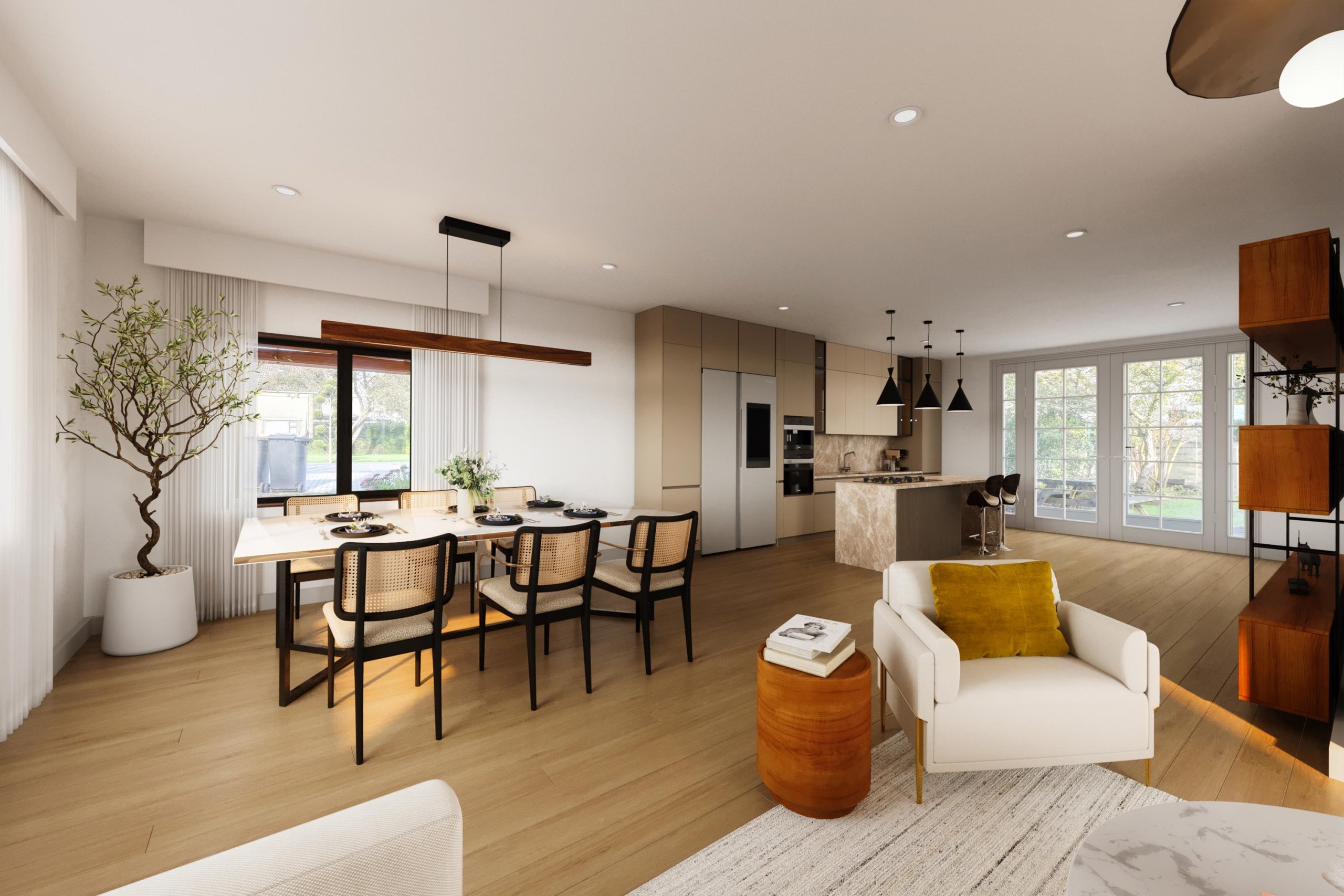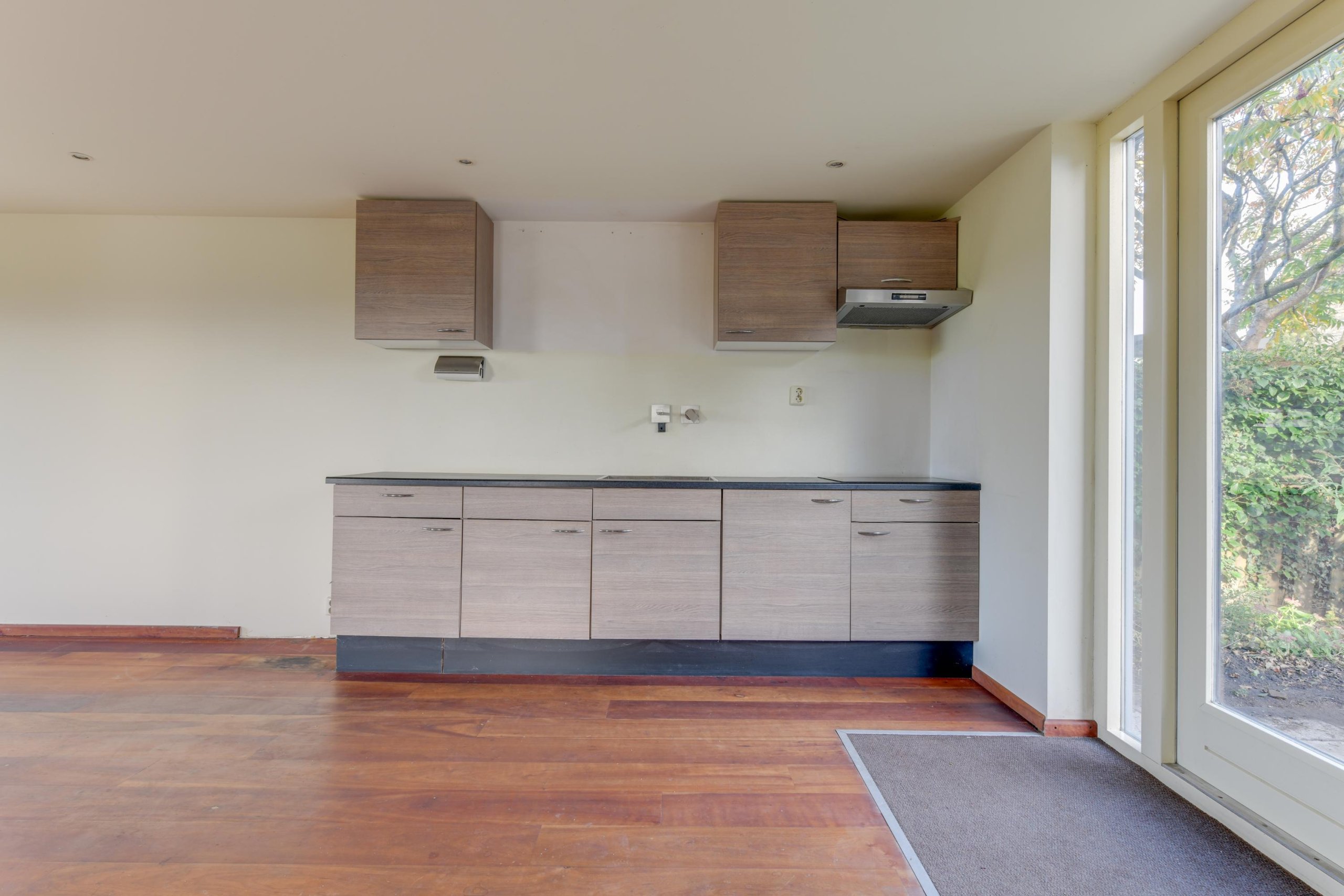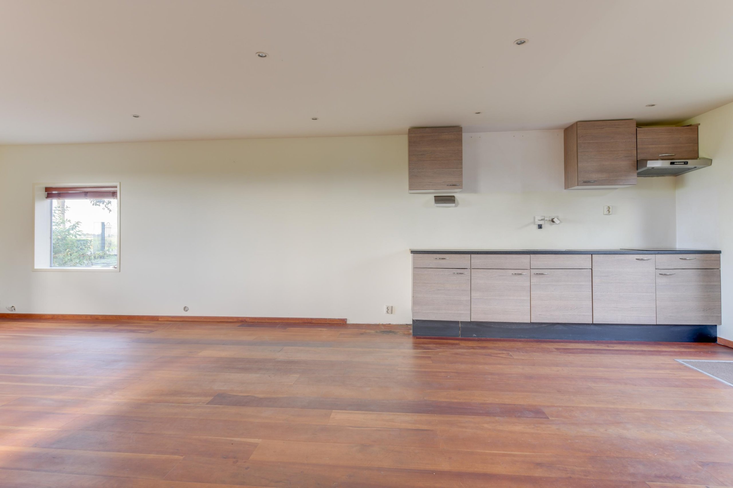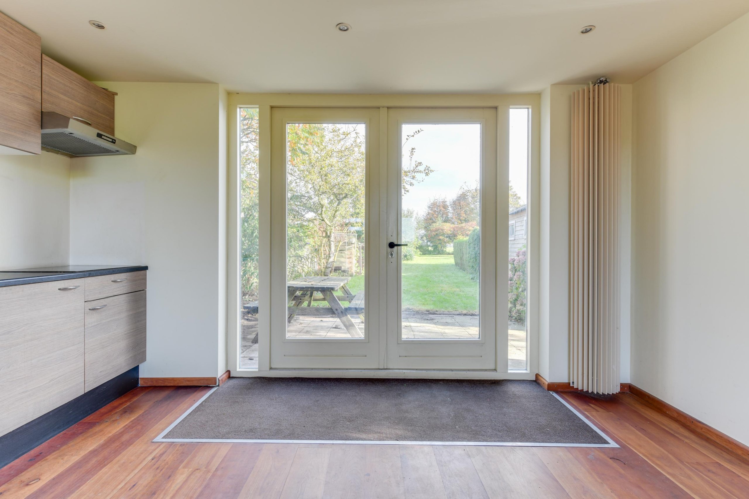 Begane grond; Via de voortuin, waar je op eigen terrein kunt parkeren, kom je via de zijentree de woning binnen. Vanuit de hal loop je de woonkamer in en sta je direct in de open keuken. Vanuit de keuken door middel van openslaande deuren toegang tot de zeer ruime achtertuin. Verder een hal met toiletruimte en bergruimte met opstelling witgoedaansluiting.